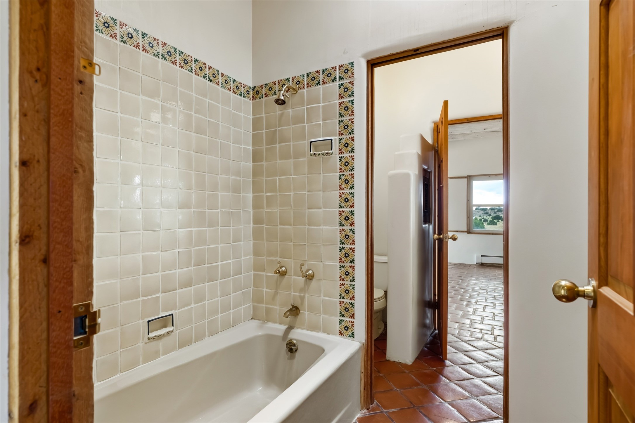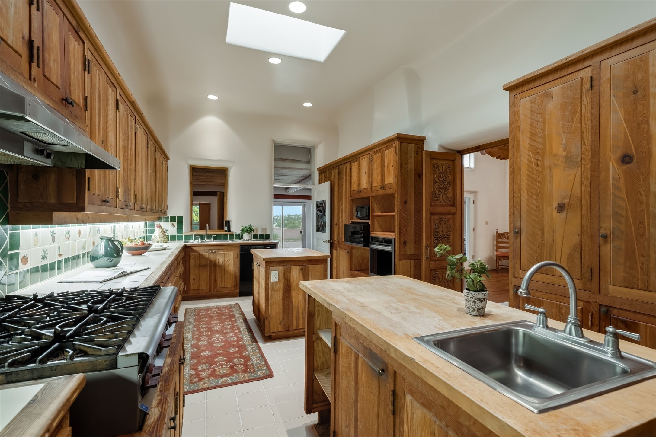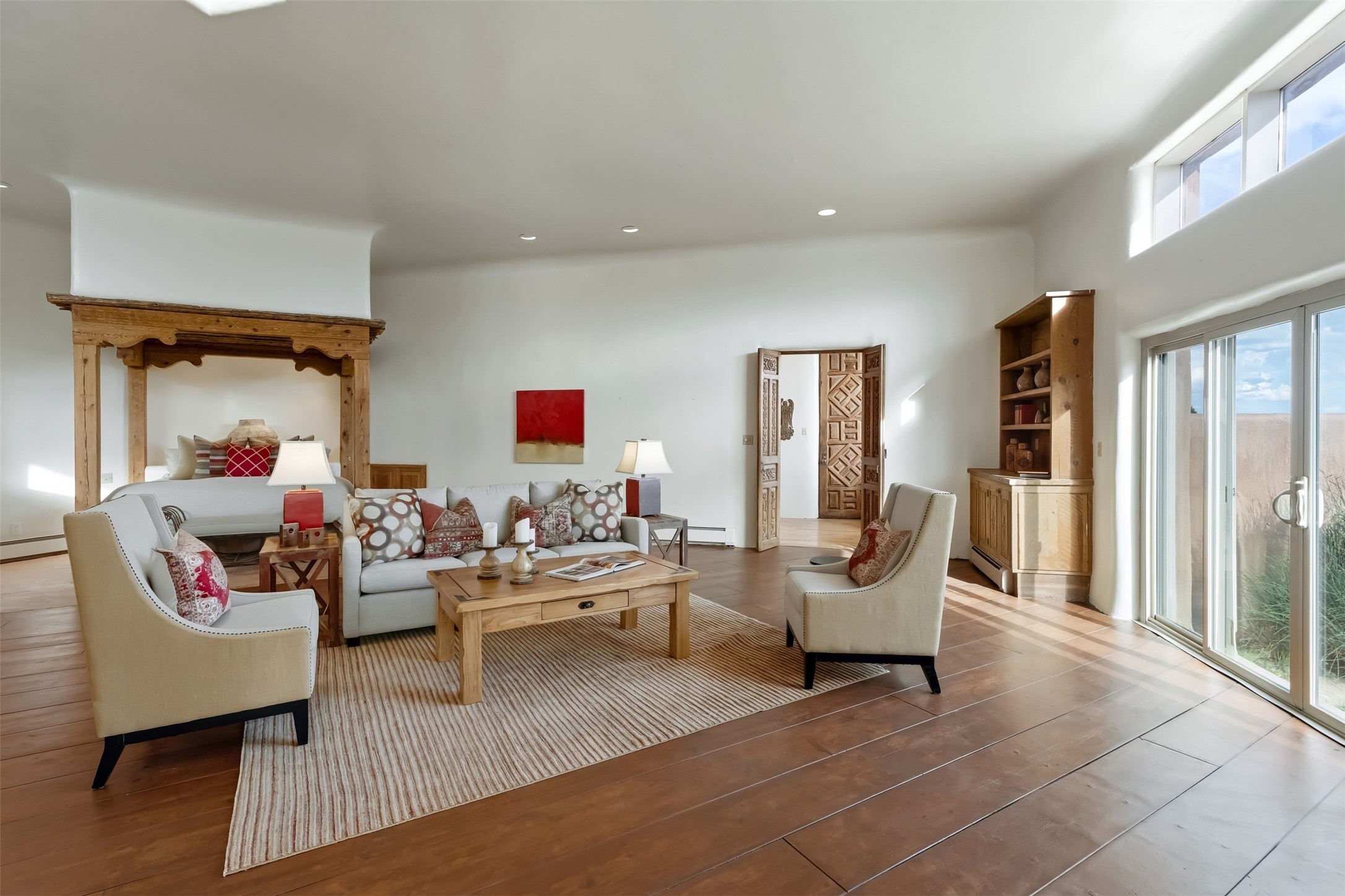 In the quaint village of Galisteo lies this gracious and majestic home with adjoining 5 acre lot, for a total of 10 acres, known as 'Hacienda del Sol." One hundred years ago was the site of the Old Galisteo School House. The original 1886 bell and corner stone 1938 were placed within the walls of this present day home. Built atop of a gentle hill with stunning views of the Galisteo Basin, Sangre de Cristos and Jemez Mountains along with huge white puffy cloud formations in a brilliant blue sky greet you everyday. Large rooms with cathedral ceilings flooded with light, sculptured fireplaces, oak and pine floors with 10 foot elegantly carved doors delight the eye upon entering. Screened in, is a lovely outdoor patio with vast, distant views. A gallery hallway runs the length of the house craving art, paintings, photographs, memorabilia. A chef's kitchen with a six burner stove, center islands, prep sinks has everything one would want. An elegant dining room with arched walls, subtle lighting, and carved cabinets allow for many guests or small intimate settings. Three Bedroom suites each with fireplaces and luscious bathrooms are perfectly placed for privacy. An attached "casita" with kitchen and bath is off one of the wings of the home. Outside, there is a circular, walled patio area for summer gatherings and moon lit nights. Included in this fabulous property is a blue gate opening up to an adjoining 5 acre parcel of vacant land accessed off of Camino San Cristobal used for pleasure or as additional acreage for another home, studio, horses, and imagination. Dream on...