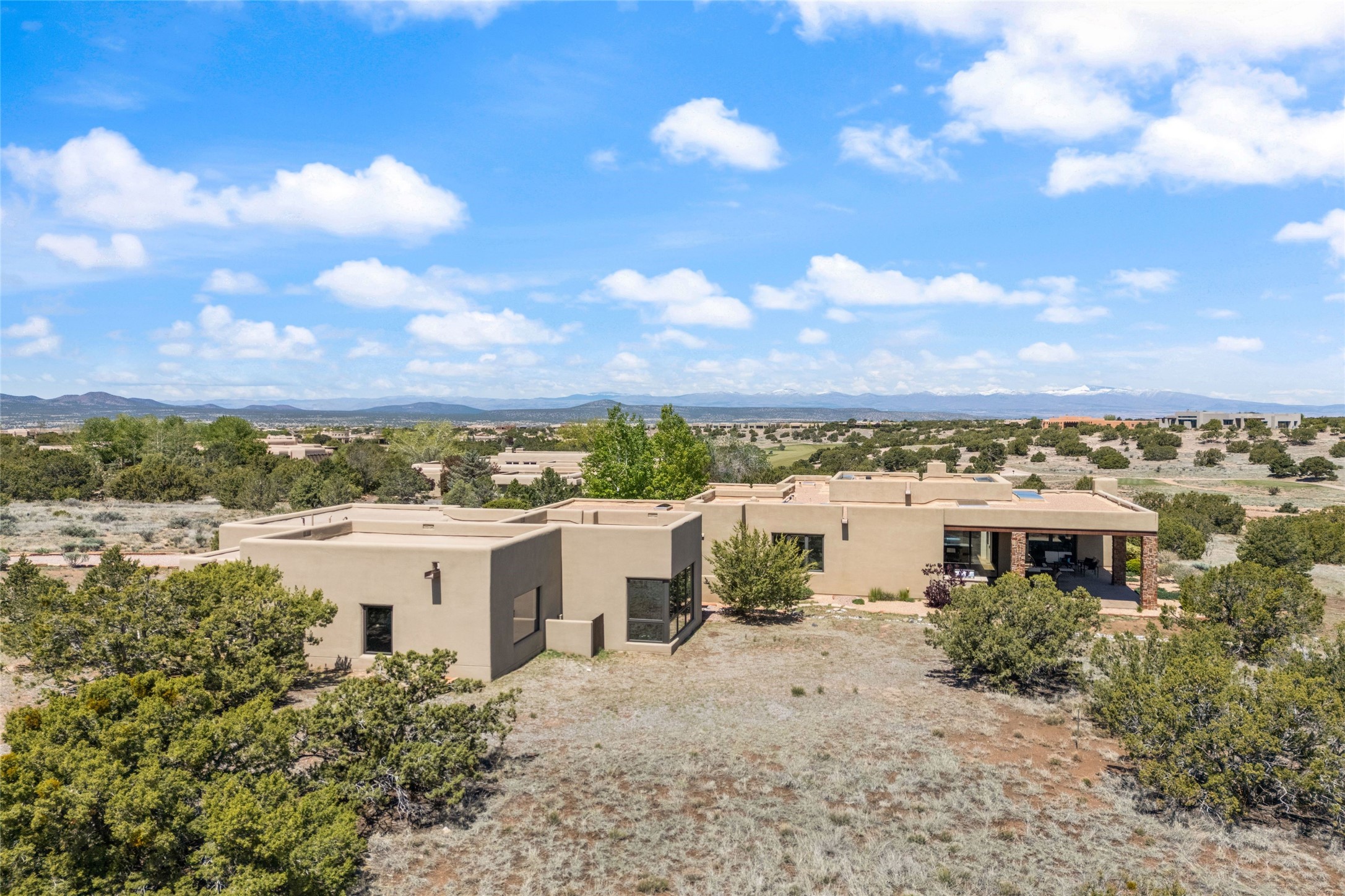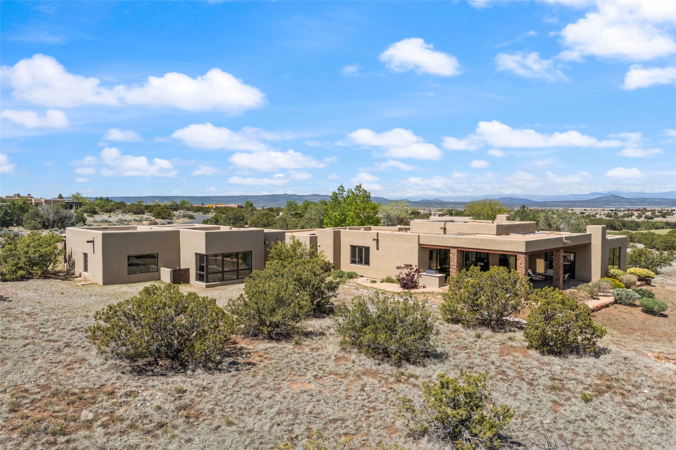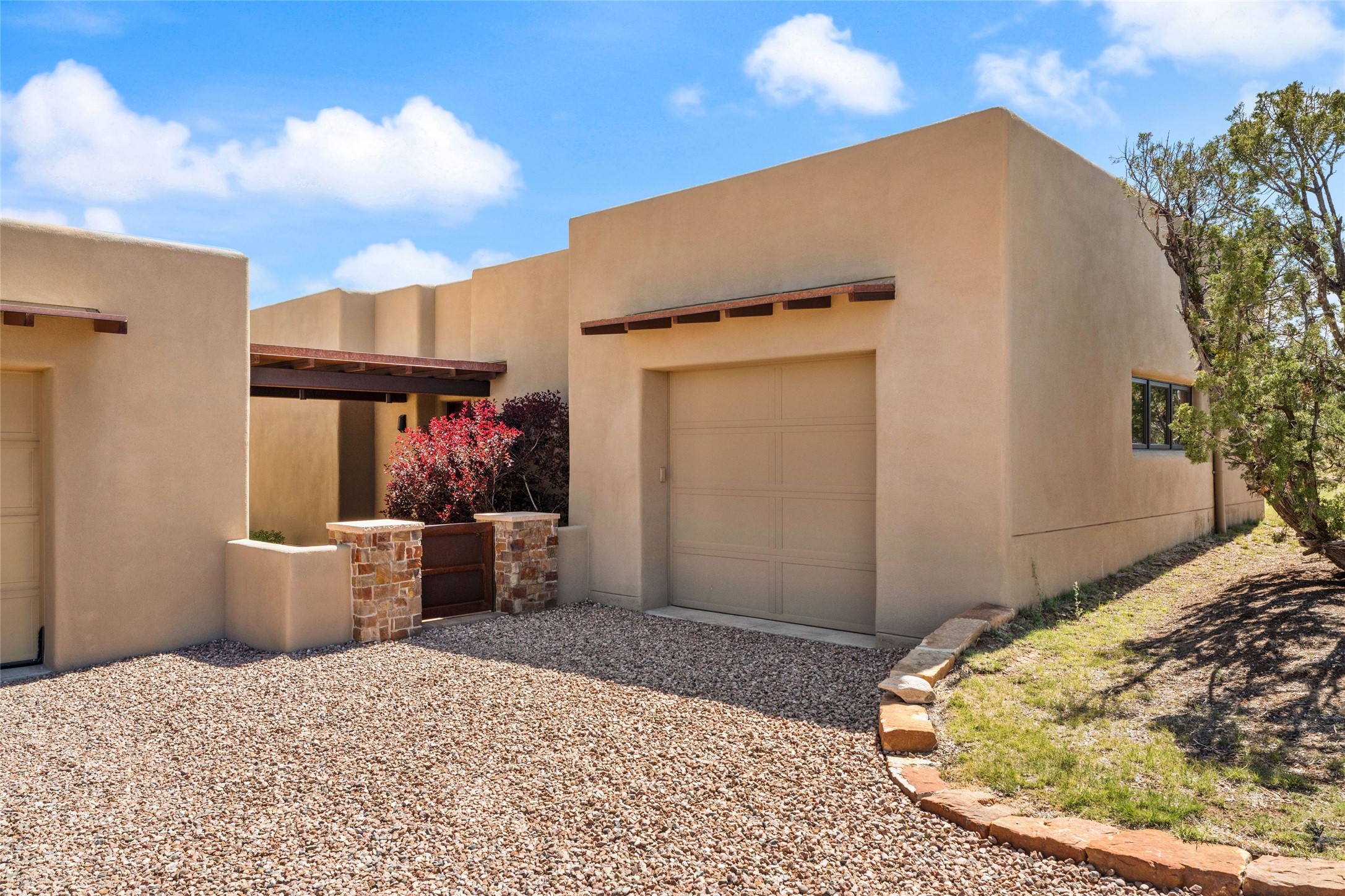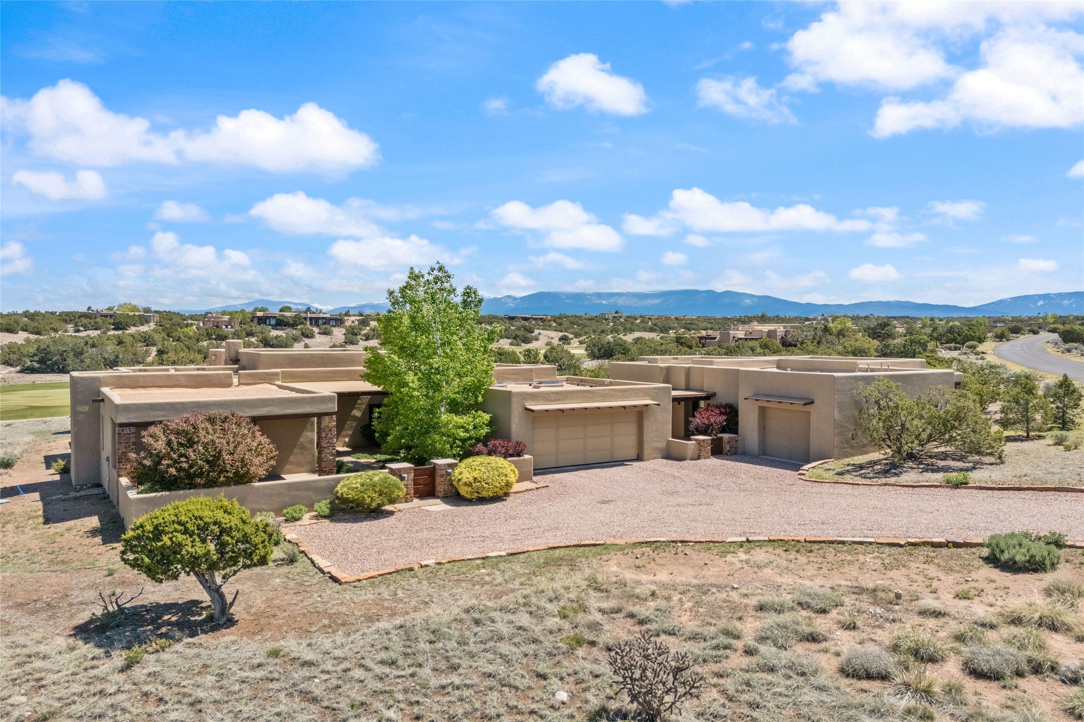 Exquisite 3-bedroom, 3.5-bath home with a detached guest house, situated on 1.45 acres overlooking the Sunrise Golf Course. This Las Campanas Estates III. property with its breathtaking distant mountain views, offering a connection to the natural beauty of the Southwest. This single-level residence, built by Tierra Concepts in 2015, features no interior steps. The light-filled living room seamlessly flows into a separate dining room and gourmet kitchen appointed with quartered walnut cabinets, a BlueStar range, Bosch dishwasher, Subzero refrigerator, and a spacious center island with a prep sink. Retreat to the primary bedroom, equipped with a gas fireplace for added warmth during cooler months and two expansive walk-in closets that provide ample storage. The guest bedroom includes a private bath and direct access to an outdoor courtyard. Additionally, an office/studio space caters to all your productivity and creative needs. The 1,186 sq. ft. guest house, added in 2020 enhances this property's appeal. It features a welcoming living room complete with a sink and mini-fridge. With one bedroom, a bath, and a one-car garage; this space is both functional and versatile. Las Campanas embodies the ultimate expression of Santa Fe living. With a separate membership to the Club at Las Campanas, available upon approval, you can enjoy exclusive access to top-tier amenities, including two Jack Nicklaus Signature Golf Courses.