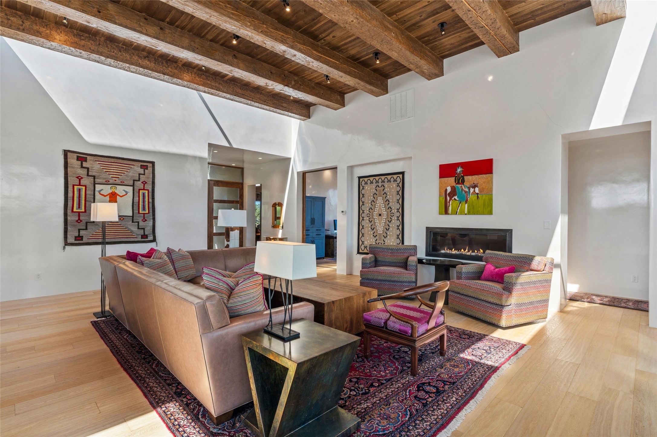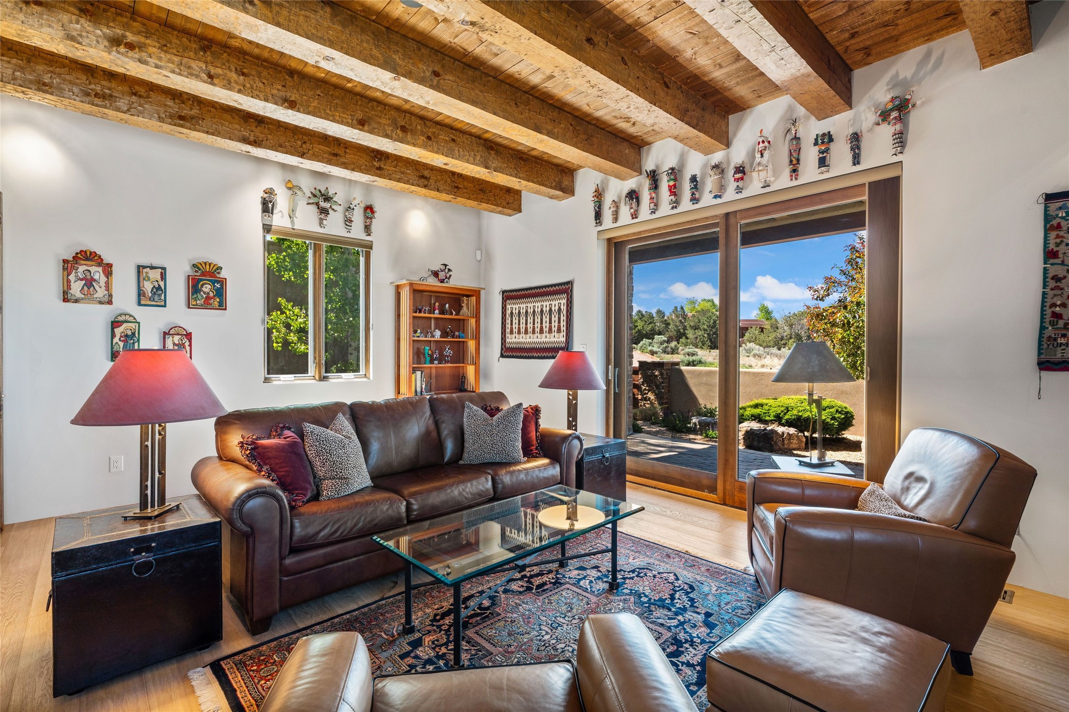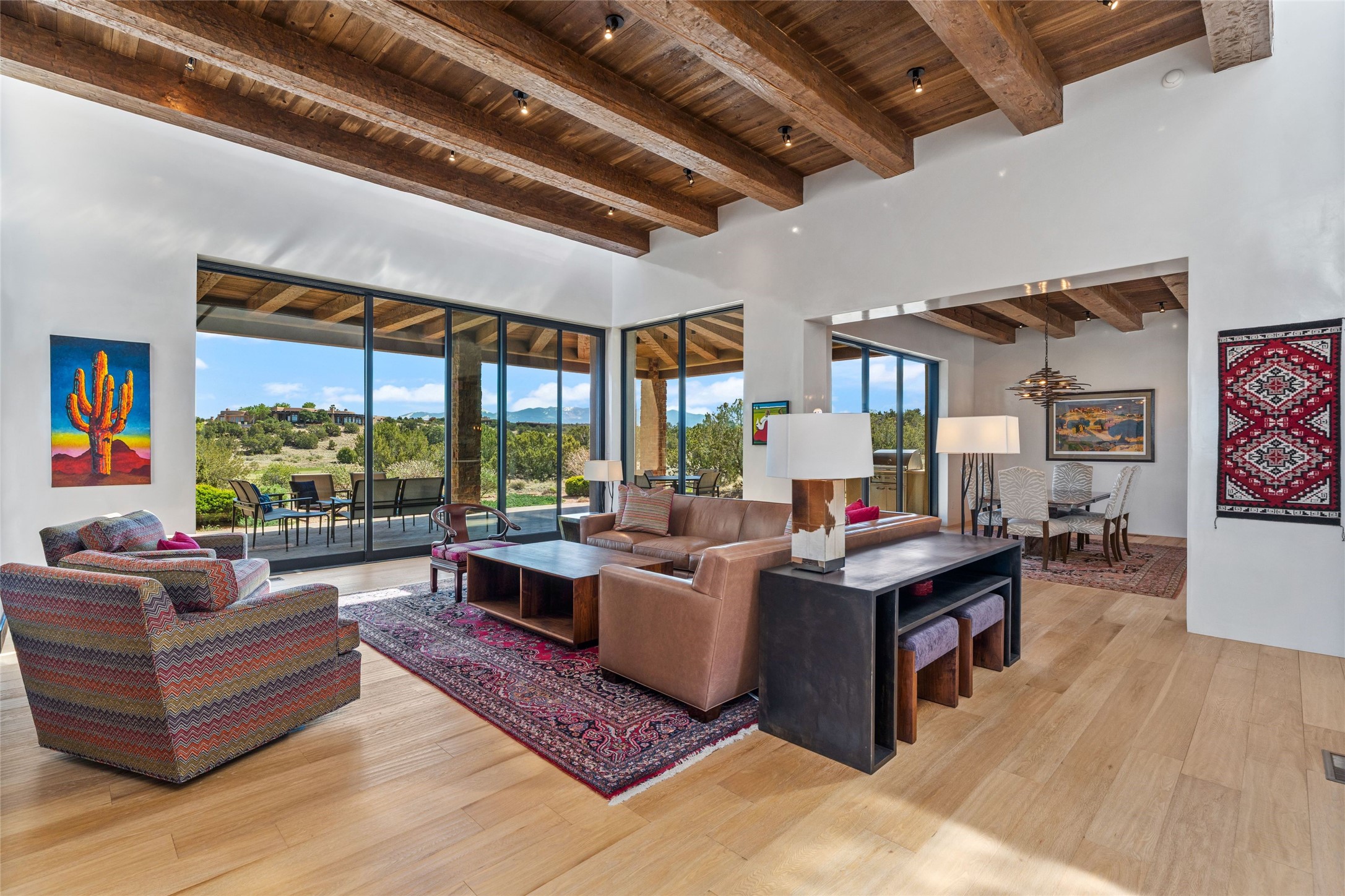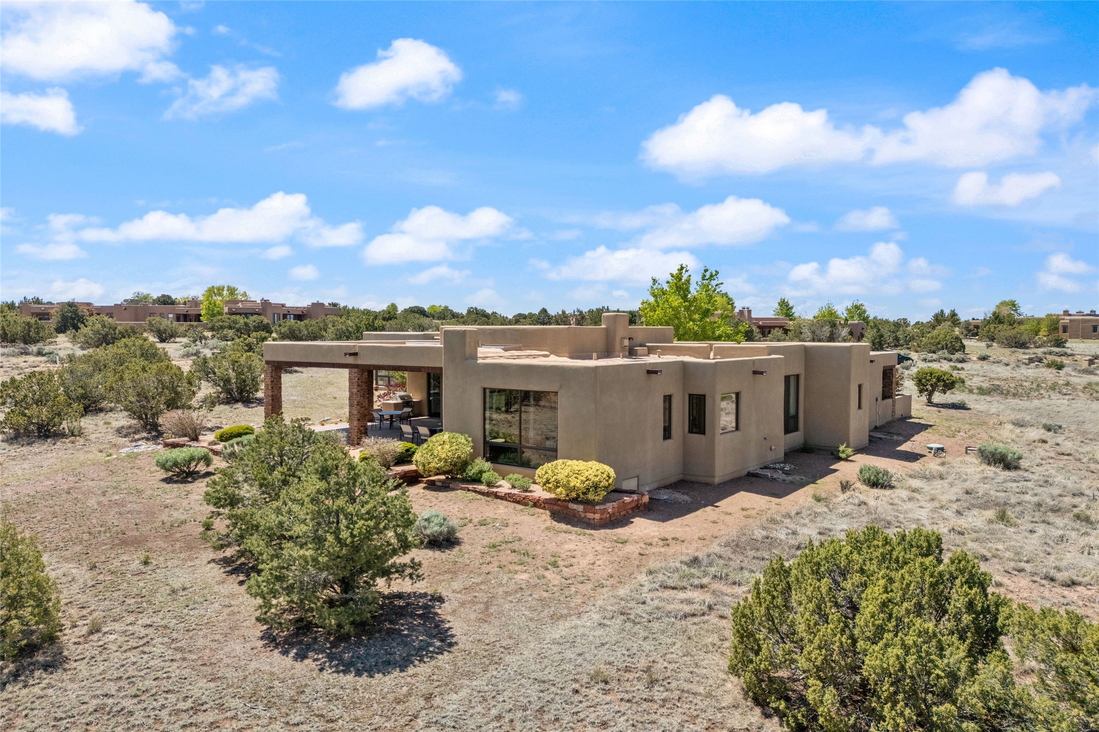 Exquisite 3-bedroom, 3.5-bath home with a detached guest house, situated on 1.45 acres overlooking the Sunrise Golf Course. This Las Campanas Estates III. property with its breathtaking distant mountain views, offering a connection to the natural beauty of the Southwest. This single-level residence, built by Tierra Concepts in 2015, features no interior steps. The light-filled living room seamlessly flows into a separate dining room and gourmet kitchen appointed with quartered walnut cabinets, a BlueStar range, Bosch dishwasher, Subzero refrigerator, and a spacious center island with a prep sink. Retreat to the primary bedroom, equipped with a gas fireplace for added warmth during cooler months and two expansive walk-in closets that provide ample storage. The guest bedroom includes a private bath and direct access to an outdoor courtyard. Additionally, an office/studio space caters to all your productivity and creative needs. The 1,186 sq. ft. guest house, added in 2020 enhances this property's appeal. It features a welcoming living room complete with a sink and mini-fridge. With one bedroom, a bath, and a one-car garage; this space is both functional and versatile. Las Campanas embodies the ultimate expression of Santa Fe living. With a separate membership to the Club at Las Campanas, available upon approval, you can enjoy exclusive access to top-tier amenities, including two Jack Nicklaus Signature Golf Courses.