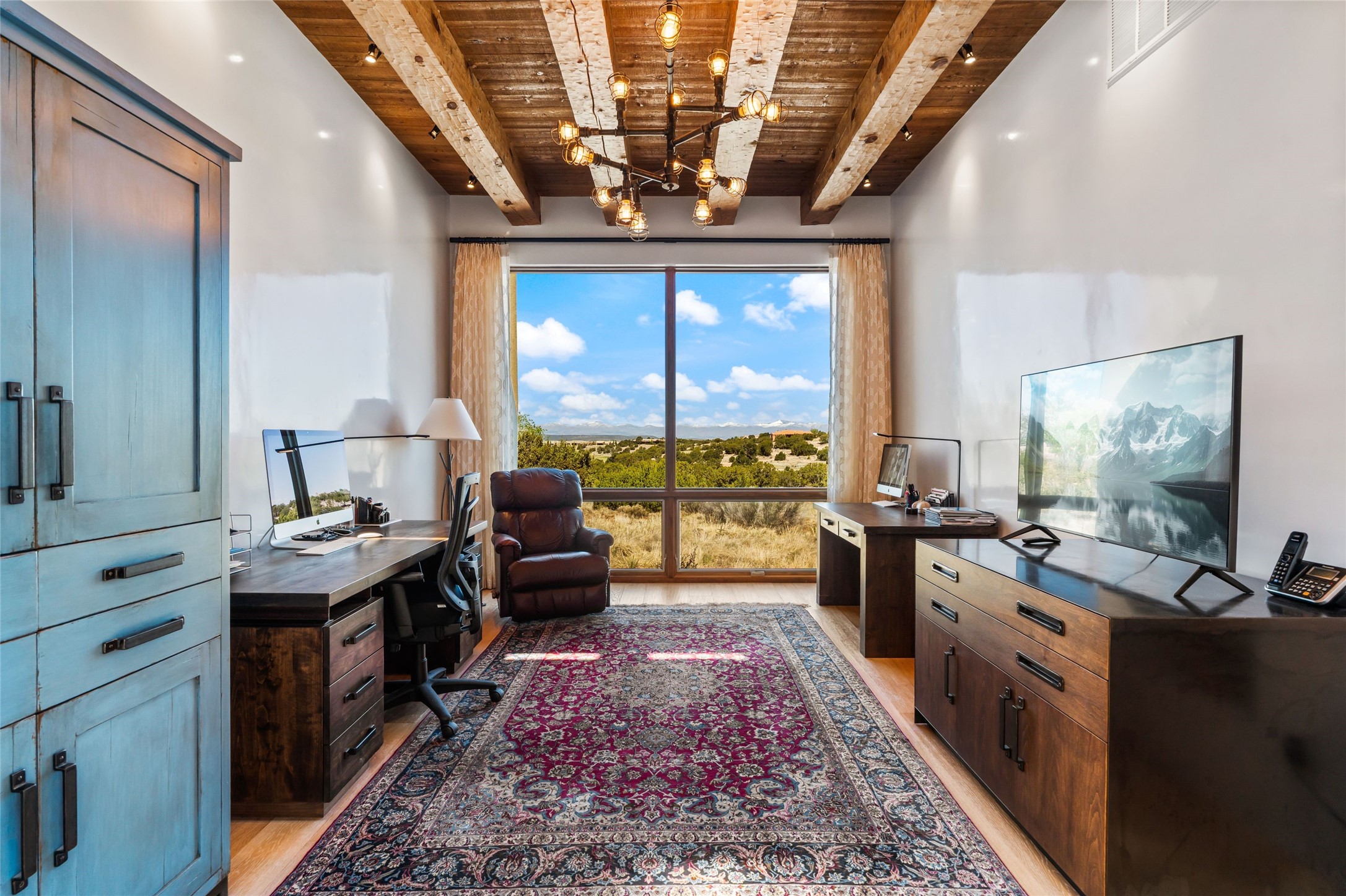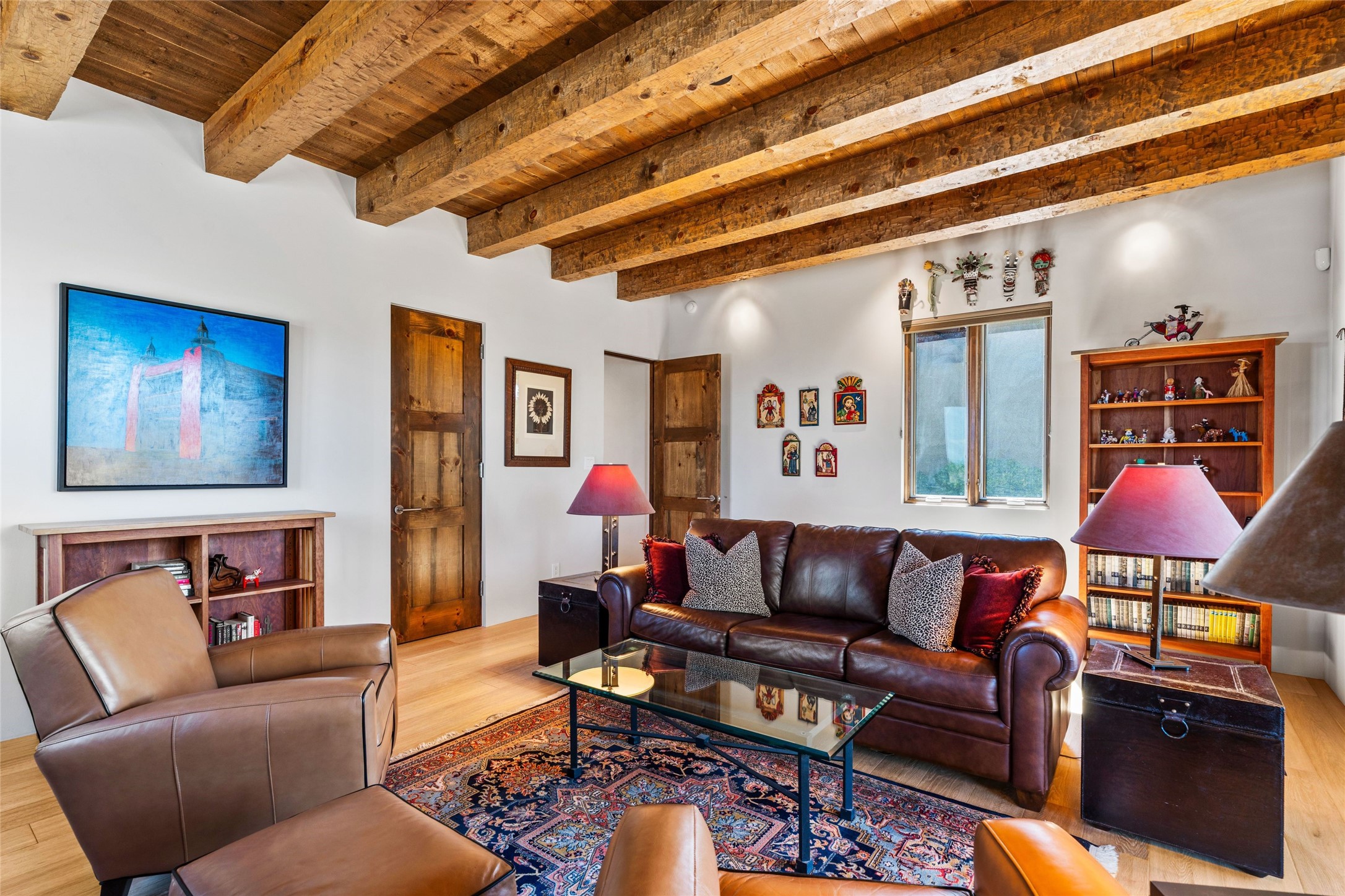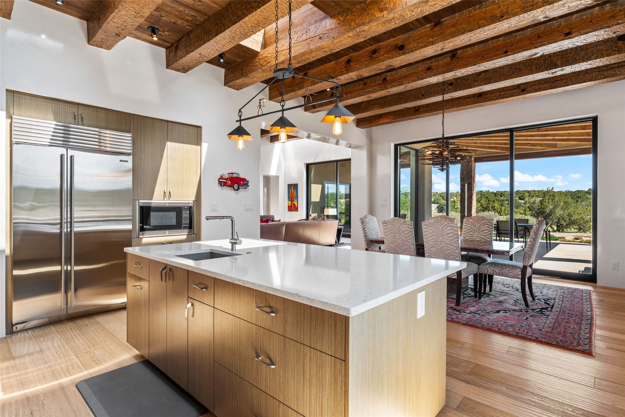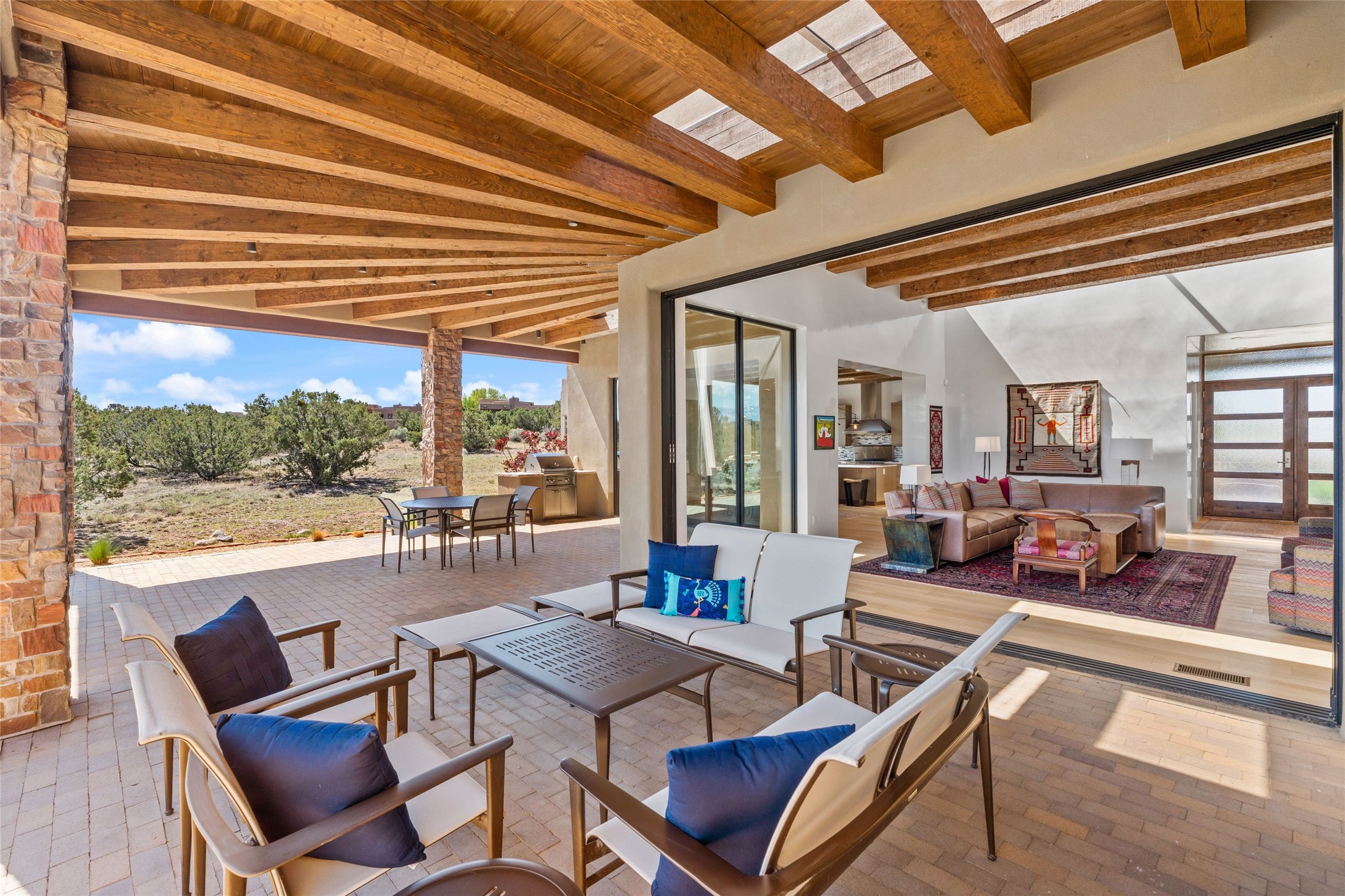 Exquisite 3-bedroom, 3.5-bath home with a detached guest house, situated on 1.45 acres overlooking the Sunrise Golf Course. This Las Campanas Estates III. property with its breathtaking distant mountain views, offering a connection to the natural beauty of the Southwest. This single-level residence, built by Tierra Concepts in 2015, features no interior steps. The light-filled living room seamlessly flows into a separate dining room and gourmet kitchen appointed with quartered walnut cabinets, a BlueStar range, Bosch dishwasher, Subzero refrigerator, and a spacious center island with a prep sink. Retreat to the primary bedroom, equipped with a gas fireplace for added warmth during cooler months and two expansive walk-in closets that provide ample storage. The guest bedroom includes a private bath and direct access to an outdoor courtyard. Additionally, an office/studio space caters to all your productivity and creative needs. The 1,186 sq. ft. guest house, added in 2020 enhances this property's appeal. It features a welcoming living room complete with a sink and mini-fridge. With one bedroom, a bath, and a one-car garage; this space is both functional and versatile. Las Campanas embodies the ultimate expression of Santa Fe living. With a separate membership to the Club at Las Campanas, available upon approval, you can enjoy exclusive access to top-tier amenities, including two Jack Nicklaus Signature Golf Courses.