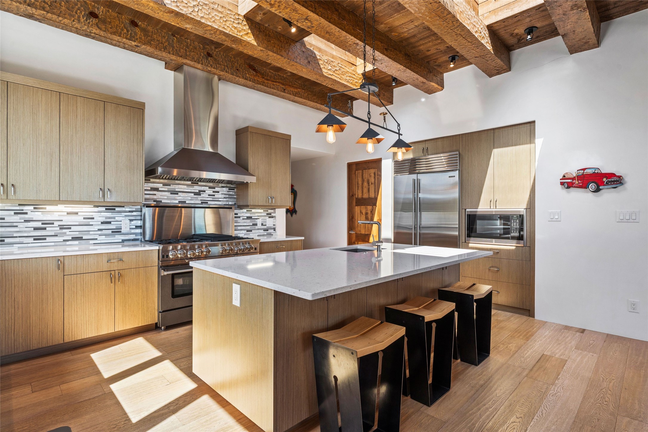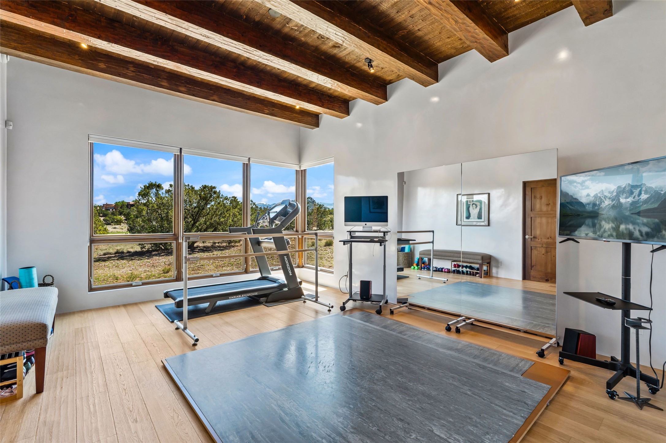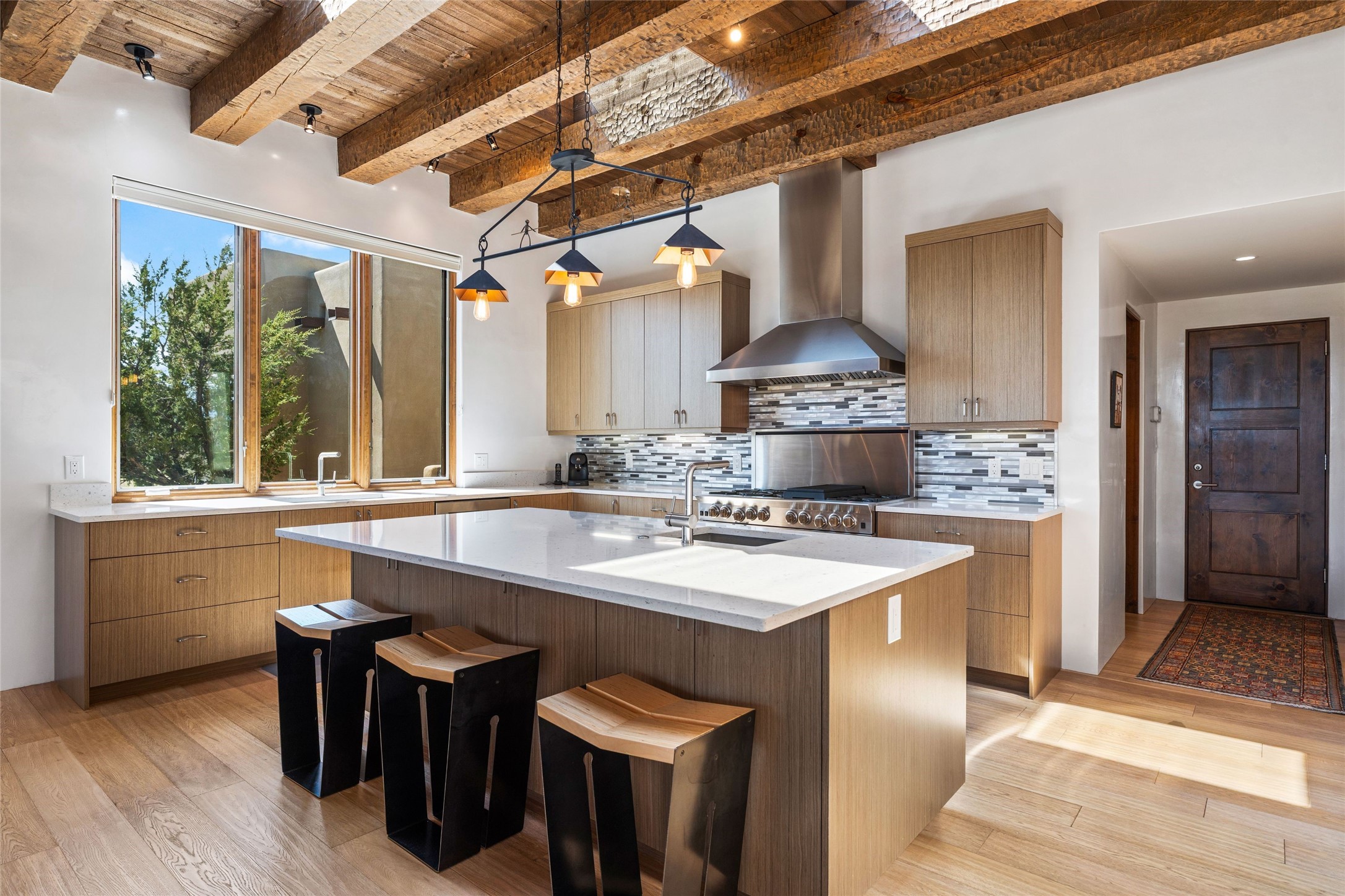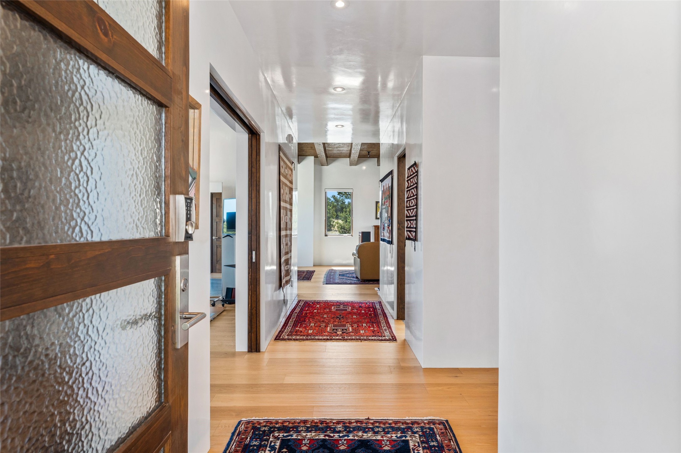 Exquisite 3-bedroom, 3.5-bath home with a detached guest house, situated on 1.45 acres overlooking the Sunrise Golf Course. This Las Campanas Estates III. property with its breathtaking distant mountain views, offering a connection to the natural beauty of the Southwest. This single-level residence, built by Tierra Concepts in 2015, features no interior steps. The light-filled living room seamlessly flows into a separate dining room and gourmet kitchen appointed with quartered walnut cabinets, a BlueStar range, Bosch dishwasher, Subzero refrigerator, and a spacious center island with a prep sink. Retreat to the primary bedroom, equipped with a gas fireplace for added warmth during cooler months and two expansive walk-in closets that provide ample storage. The guest bedroom includes a private bath and direct access to an outdoor courtyard. Additionally, an office/studio space caters to all your productivity and creative needs. The 1,186 sq. ft. guest house, added in 2020 enhances this property's appeal. It features a welcoming living room complete with a sink and mini-fridge. With one bedroom, a bath, and a one-car garage; this space is both functional and versatile. Las Campanas embodies the ultimate expression of Santa Fe living. With a separate membership to the Club at Las Campanas, available upon approval, you can enjoy exclusive access to top-tier amenities, including two Jack Nicklaus Signature Golf Courses.