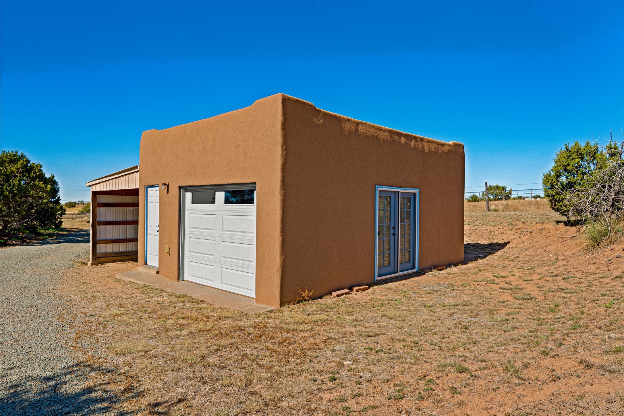 A rare horse property. This Santa Fe-style country home offers an exceptional location directly across from Eldorado, providing convenient access to local community amenities. The property benefits from Eldorado water and natural gas, and its proximity to the highway ensures easy access to town.The home features a split floor plan and an open-concept living, dining, and kitchen area, perfect for comfortable living and entertaining, all while offering beautiful southerly mountain views.The oversized garage is a real plus with plenty of storage and shelving. Walk thru laundry room. Enclosed, heated sunroom. For equestrian enthusiasts, this property is truly turn-key featuring a 2,400 sq ft, center-aisle, block and metal barn with four stalls, each equipped with attached piped paddocks, crusher fine footing, and automatic heated waterers. The barn also includes a dedicated tack room, a hot water wash rack, hay storage, and a feed room complete with a sink and toilet. Additional amenities include a piped rail sand arena and four turnouts with run-in sheds. Beyond the equestrian facilities, the property also has a detached, 432 sq ft, unheated workshop/studio with a carport and extra storage. No HOA.