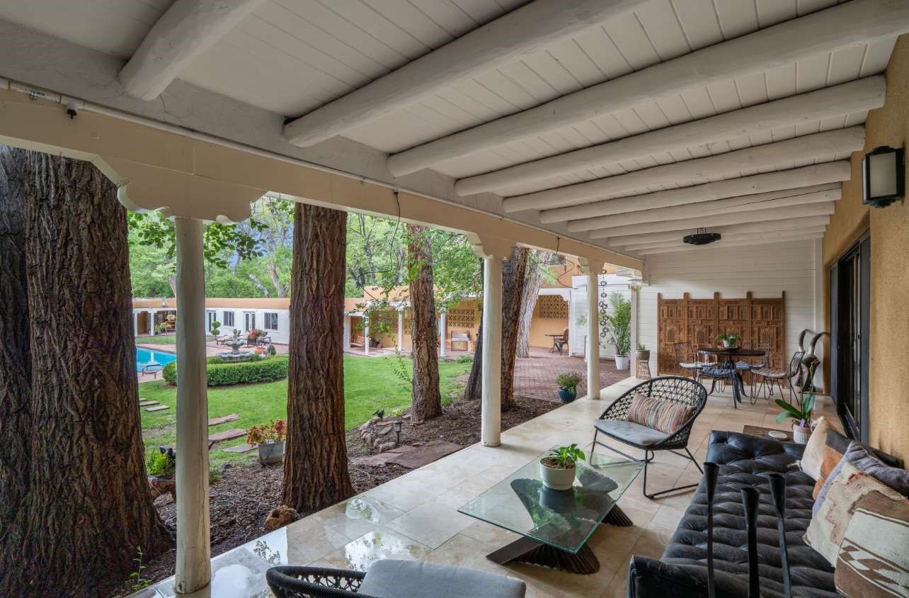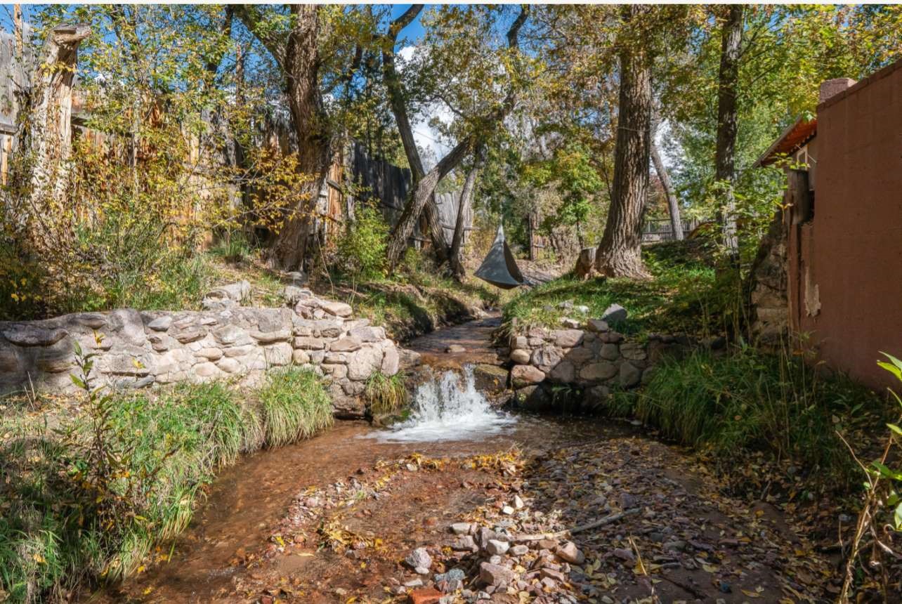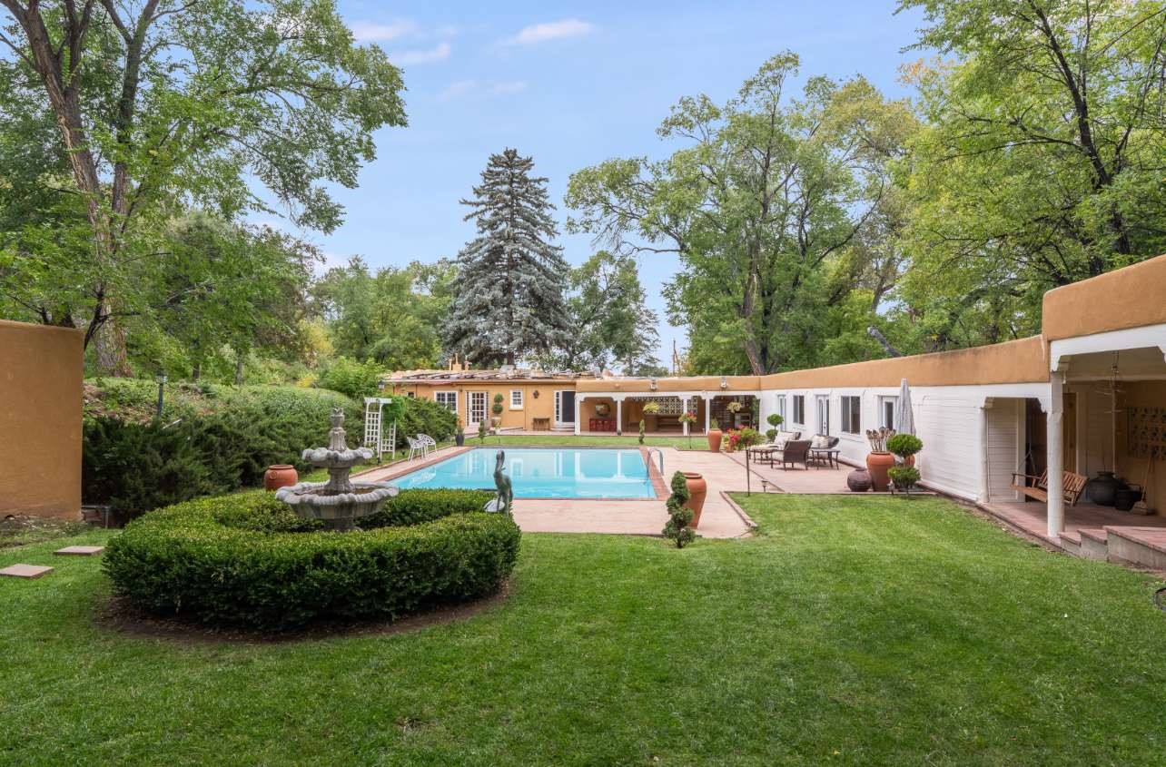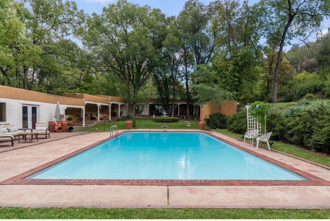 Truly a Rare Find...on the Tesuque River Private on a dead end road with separate asaquia with water rights and a well. 4 acres and authentic adobe charming home with Vega higher ceilings and another seperate home completly remodeled and move in ready. Large heated swimming pool and art studio. Feels remote but is just approx 4.5 miles miles from the historical square in Santa Fe.
