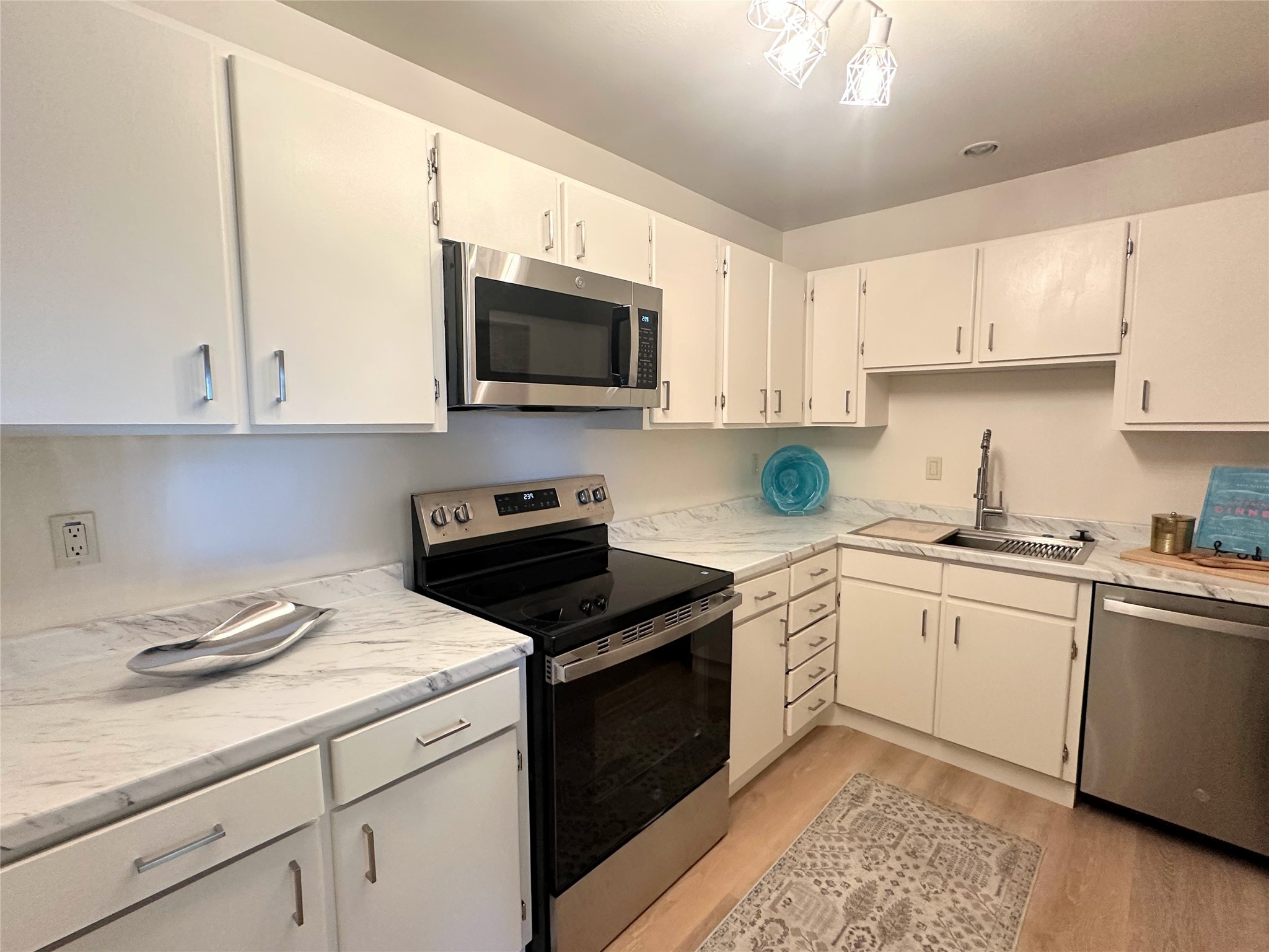Welcome to the desirable Los Arroyos Compound. Comfort and style come together in this beautifully renovated upstairs condo, on the arroyo side at 151 Calle Ojo Feliz, Unit W. This move-in ready 2-bedroom, 1-bath home blends contemporary style with everyday convenience, ideal for a busy lifestyle, weekend getaway, or investment property.Thoughtfully updated, the condo features new vinyl plank flooring, a stylish modern kitchen with all-new stainless-steel appliances, new hardware on kitchen cabinetry, new lighting, updated countertops, a deep workstation sink, and new fixtures. The bathroom has also been upgraded with a new vanity, fixtures, contemporary lighting, and tile flooring.The open concept living and dining area offers a bright, airy feel with good separation between the bedrooms. A private balcony nestled among the trees on the arroyo side provides a peaceful, nature-filled setting, perfect for relaxing in a quiet, green environment.Enjoy the benefits of a centrally located community set on approximately 18 acres, featuring native landscaping, all designed to create a serene atmosphere with walking trails. Ideally situated near schools, shopping destinations, medical facilities, and Downtown Santa Fe.Community amenities include: an indoor heated year-round pool, sauna, weight room, hospitality room, tennis and basketball courts, and walking trails. One reserved off-street parking space, with additional guest parking available.Condo fee: $377/monthly, includes baseboard hot water heat, water, sewer, refuse, building and grounds maintenance, and insurance.