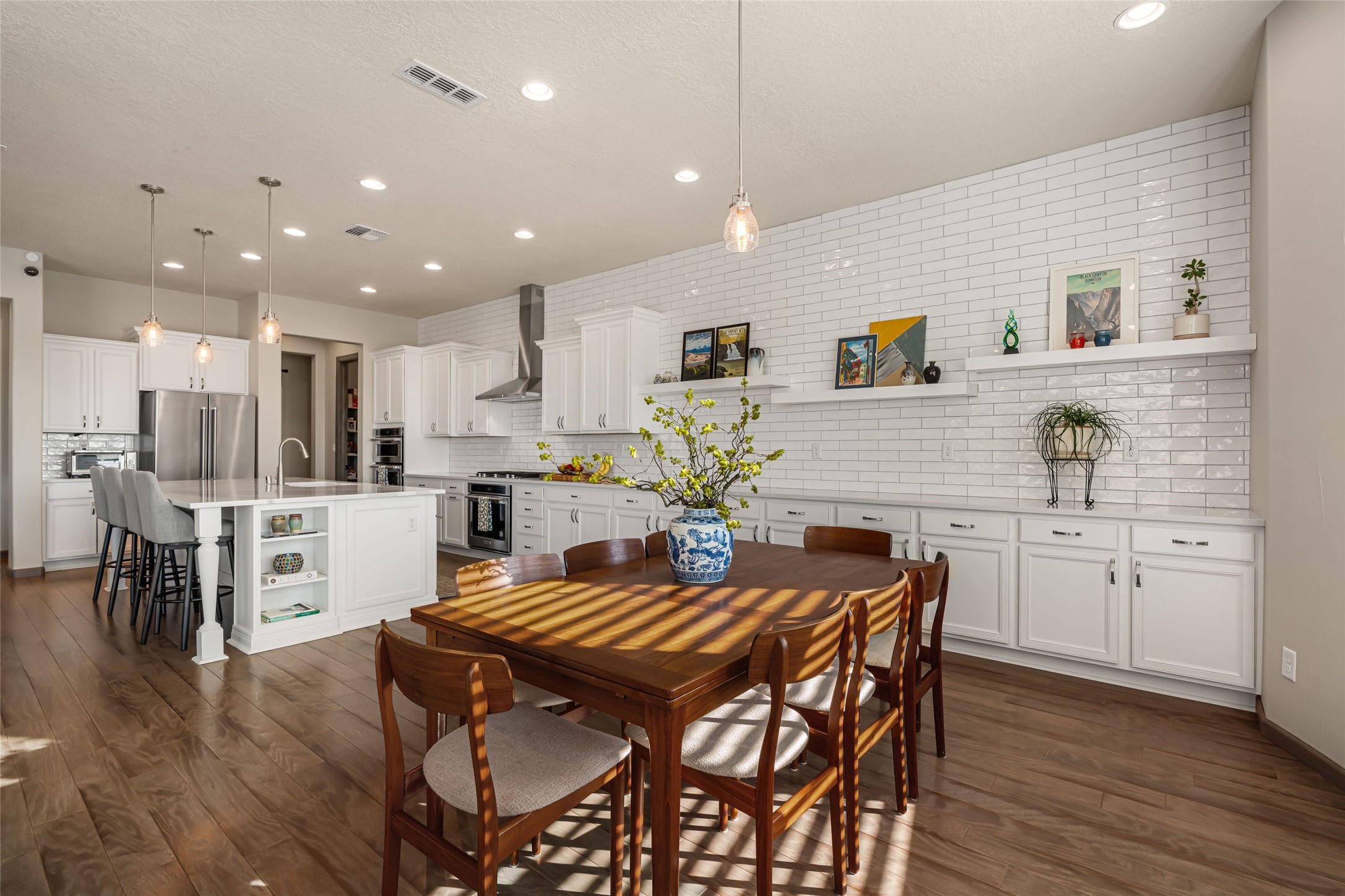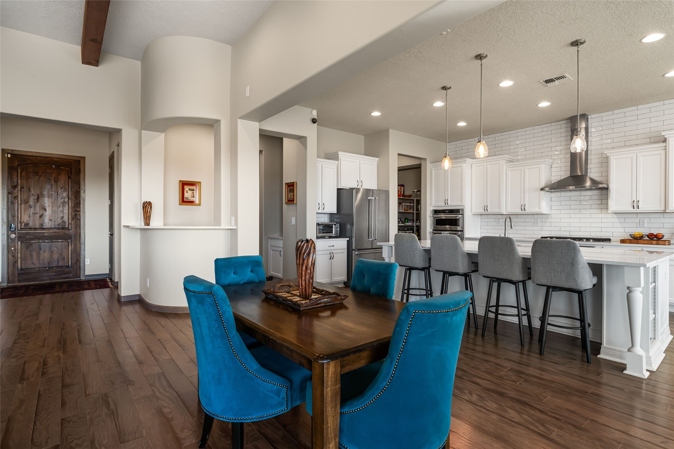 Set in Las Terrazas at Las Campanas, this beautifully maintained home enjoys expansive Jemez Mountain views and an easy indoor-outdoor connection. Light-filled living and dining spaces open to a deep portal with a kiva fireplace, ideal for sunset gatherings. The kitchen centers on a generous island with caf seating and a butler's pantry. Three ensuite bedrooms, an office or media room and thoughtful details such as quartz counters, hardwood floors, crown molding and a smarthome system combine comfort with quality. Landscaped with drip irrigation and certified Silver by Build Green NM. Club at Las Campanas memberships optional.