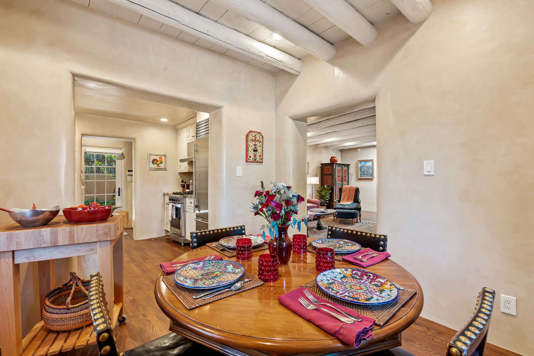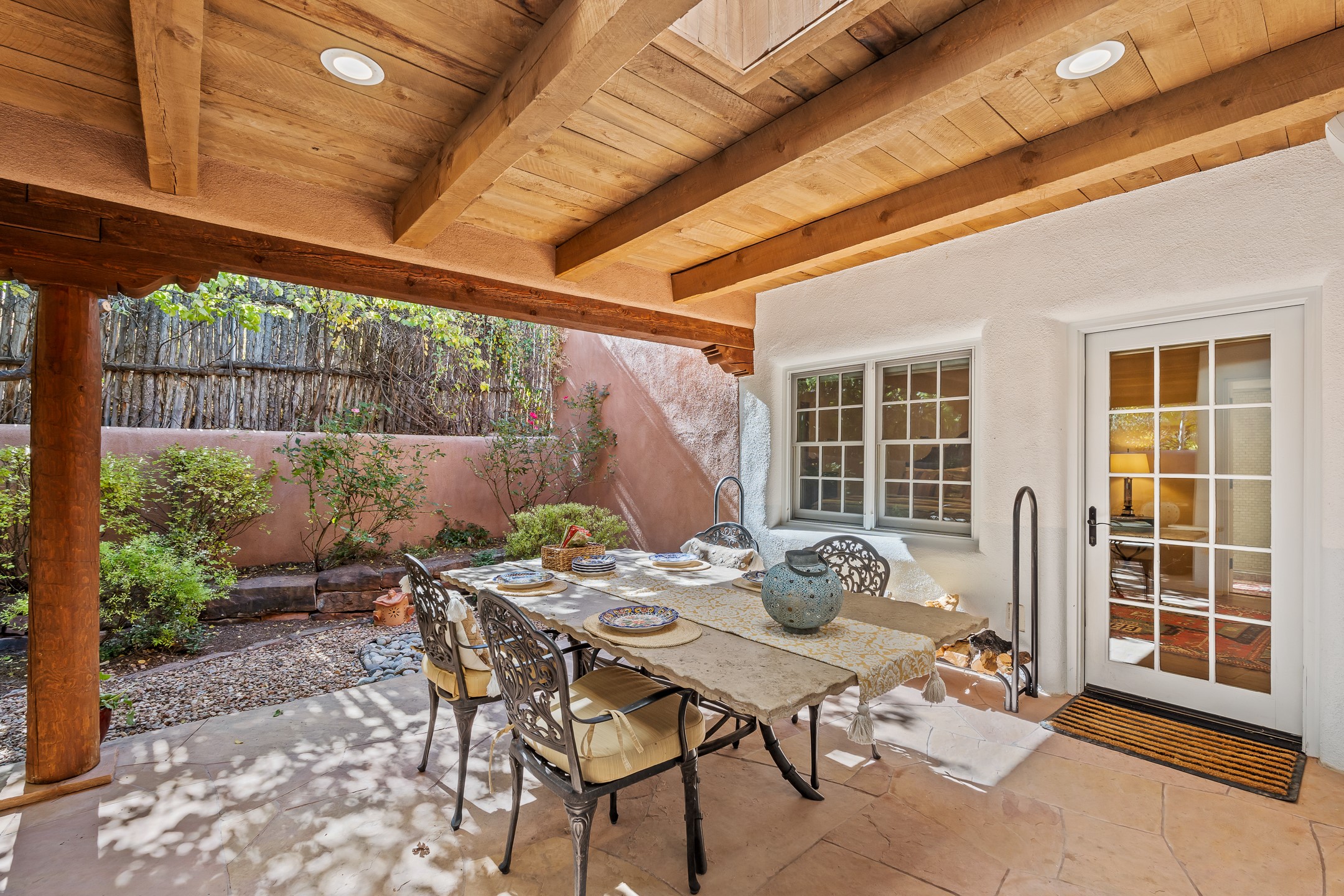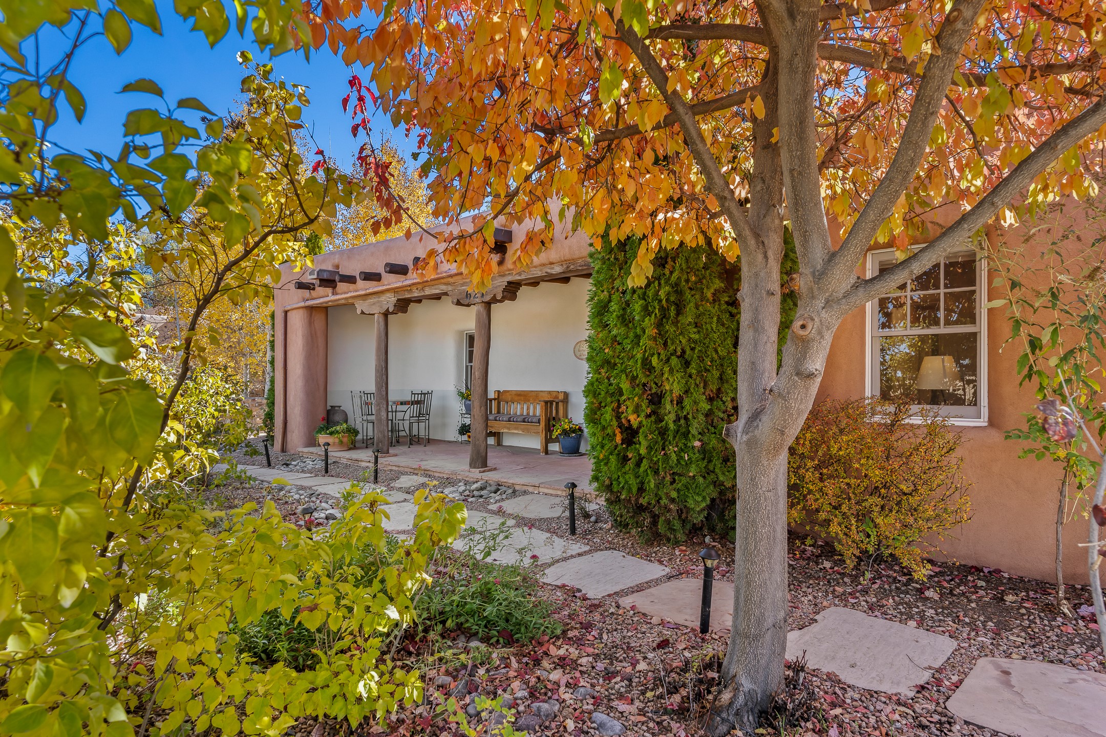 Classic Eastside adobe pied--terre that exemplifies the timeless beauty and investment value of Santa Fe real estate. Set down a quiet private lane off Garcia Street, the home offers an ideal combination of historic Pueblo-style architecture, privacy, and exceptional short-term rental performance. Built in 1937, the home features thick adobe walls, exposed vigas, plaster ceilings, and hardwood floors, creating a warm and authentic interior. The living room centers around a traditional kiva fireplace, with an open flow to the dining area and updated kitchen. Two shaded portals provide elegant outdoor living, while the primary suite opens to a private patio with hot tub. The property is surrounded by drought-tolerant, low-maintenance landscaping, creating a serene environment that enhances both livability and curb appeal. In addition to +/-1,500 square feet of heated living space, a 413-square-foot basement offers rare and valuable storage. Notably, 627 Garcia has an impressive rental history, generating net rental income of approximately $100,000 in 2023, $93,000 in 2024, and $65,000 year-to-date in 2025 (as of October). This proven performance makes the home a turnkey opportunity for buyers seeking a lifestyle investment. Located just minutes from Canyon Road, Museum Hill, and the historic Plaza, this property is perfectly positioned to enjoy the very best of Santa Fe's culture, art, and natural beauty.
