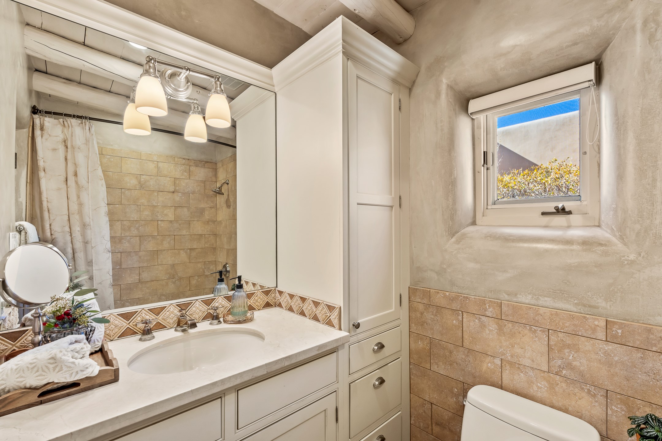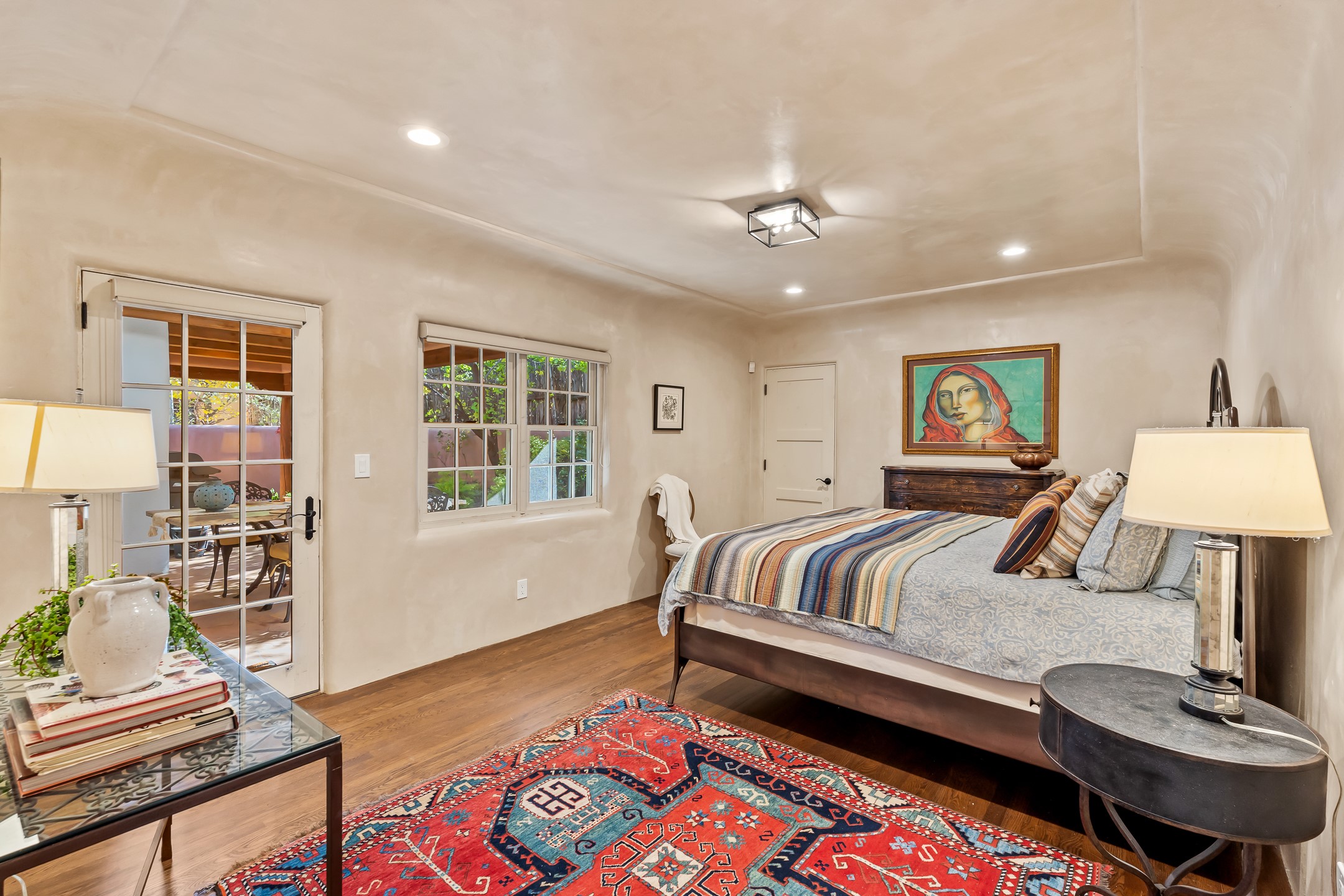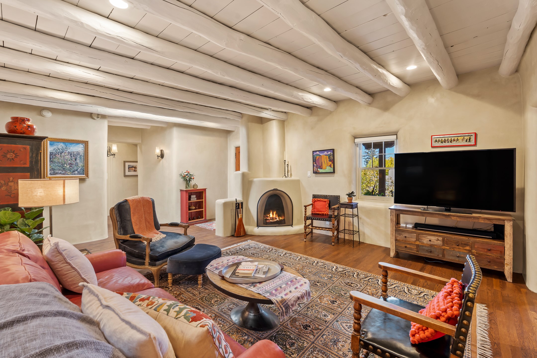 Classic Eastside adobe pied--terre that exemplifies the timeless beauty and investment value of Santa Fe real estate. Set down a quiet private lane off Garcia Street, the home offers an ideal combination of historic Pueblo-style architecture, privacy, and exceptional short-term rental performance. Built in 1937, the home features thick adobe walls, exposed vigas, plaster ceilings, and hardwood floors, creating a warm and authentic interior. The living room centers around a traditional kiva fireplace, with an open flow to the dining area and updated kitchen. Two shaded portals provide elegant outdoor living, while the primary suite opens to a private patio with hot tub. The property is surrounded by drought-tolerant, low-maintenance landscaping, creating a serene environment that enhances both livability and curb appeal. In addition to +/-1,500 square feet of heated living space, a 413-square-foot basement offers rare and valuable storage. Notably, 627 Garcia has an impressive rental history, generating net rental income of approximately $100,000 in 2023, $93,000 in 2024, and $65,000 year-to-date in 2025 (as of October). This proven performance makes the home a turnkey opportunity for buyers seeking a lifestyle investment. Located just minutes from Canyon Road, Museum Hill, and the historic Plaza, this property is perfectly positioned to enjoy the very best of Santa Fe's culture, art, and natural beauty.