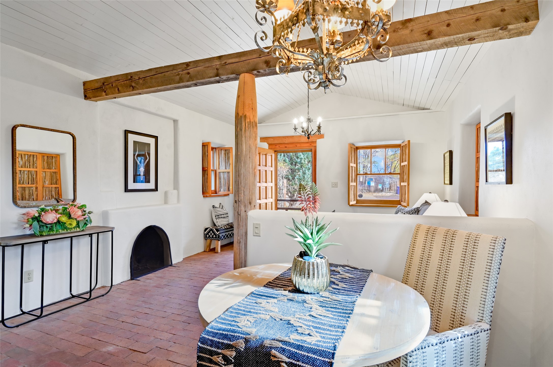 Discover the perfect gated downtown pied--terre--an ideal getaway second home or an effortless lock-and-leave casita for full-time living in Santa Fe. This charming residence features classic Santa Fe character throughout, including brick floors, hand-crafted wood shutters made with latillas, and timeless post-and-beam accents. High ceilings enhance the sense of space, while radiant heat keeps the home cozy and warm. Enjoy privacy, convenience, comfort, and the benefit of new appliances in a beautifully maintained, inviting retreat.