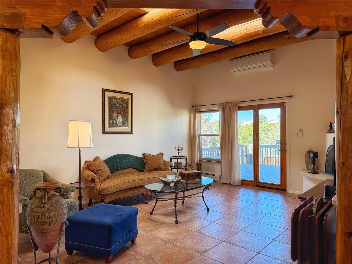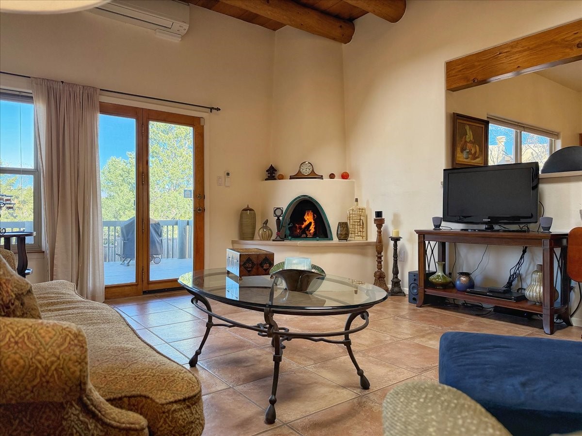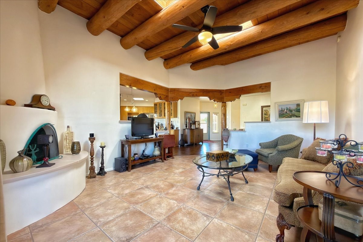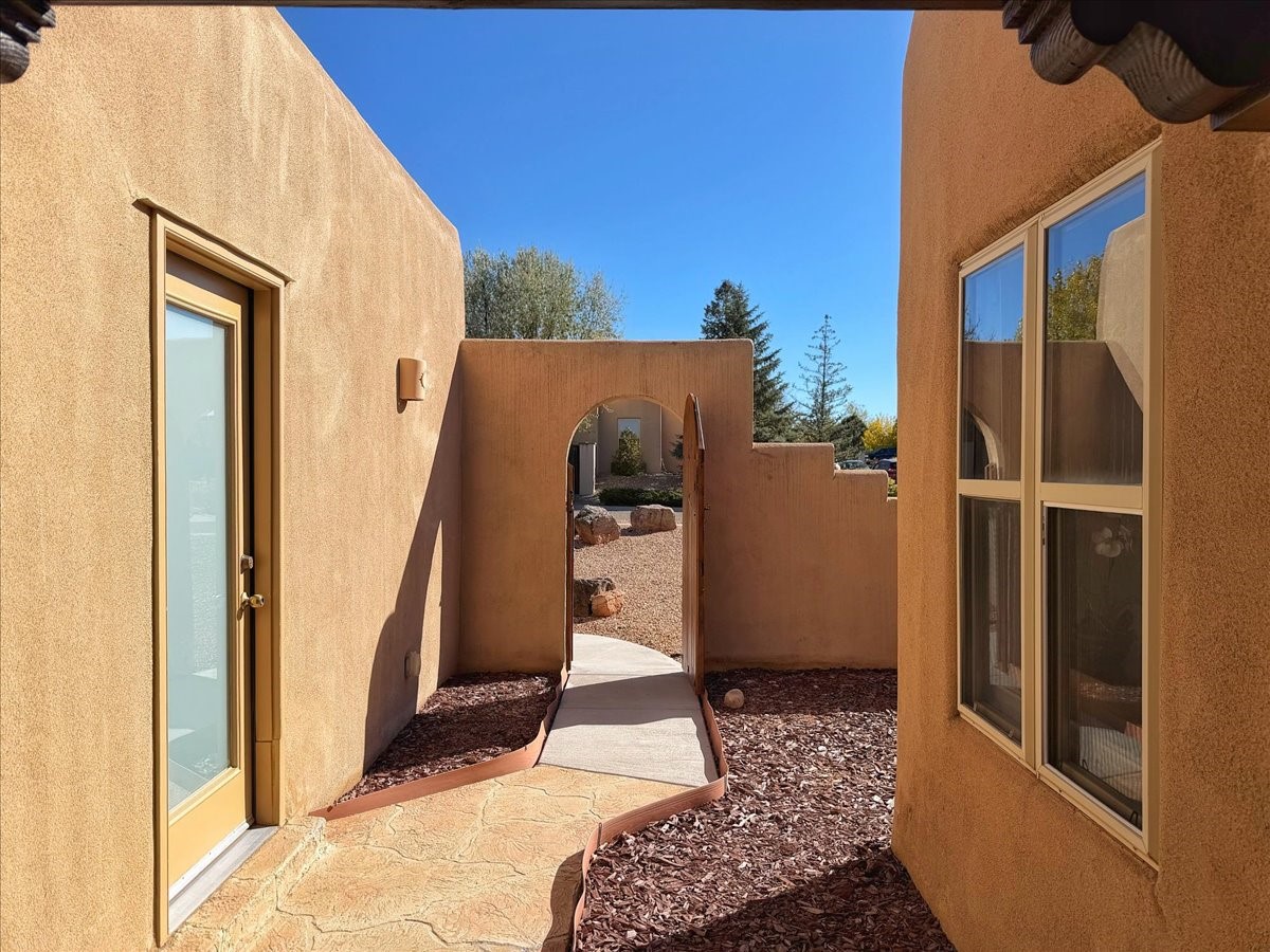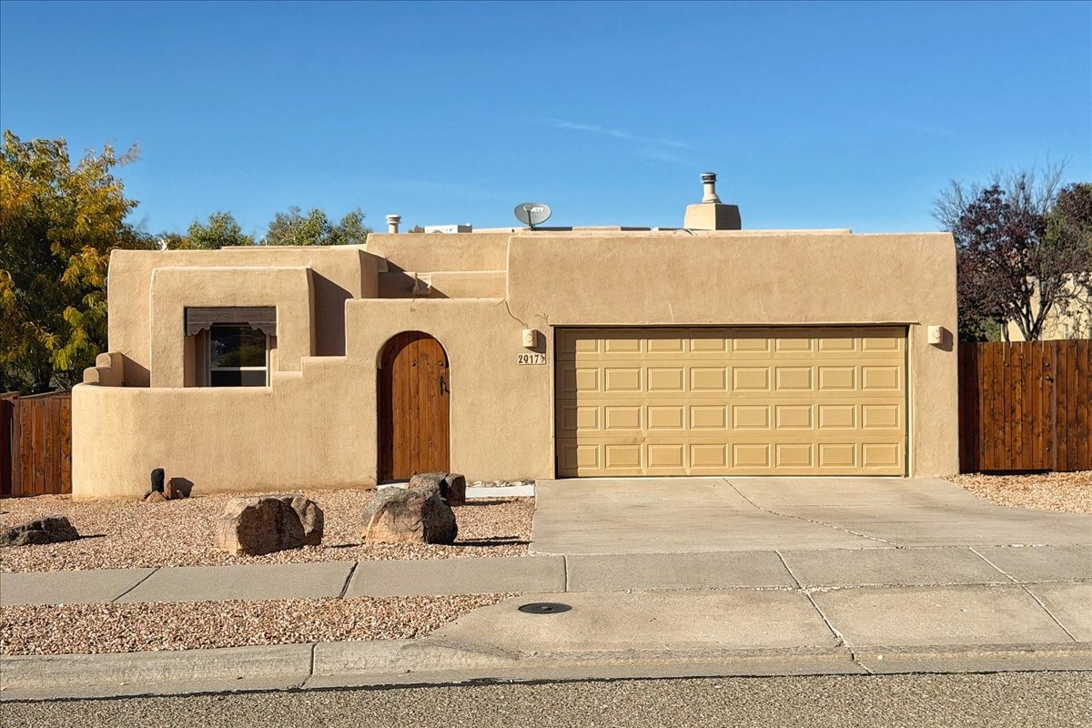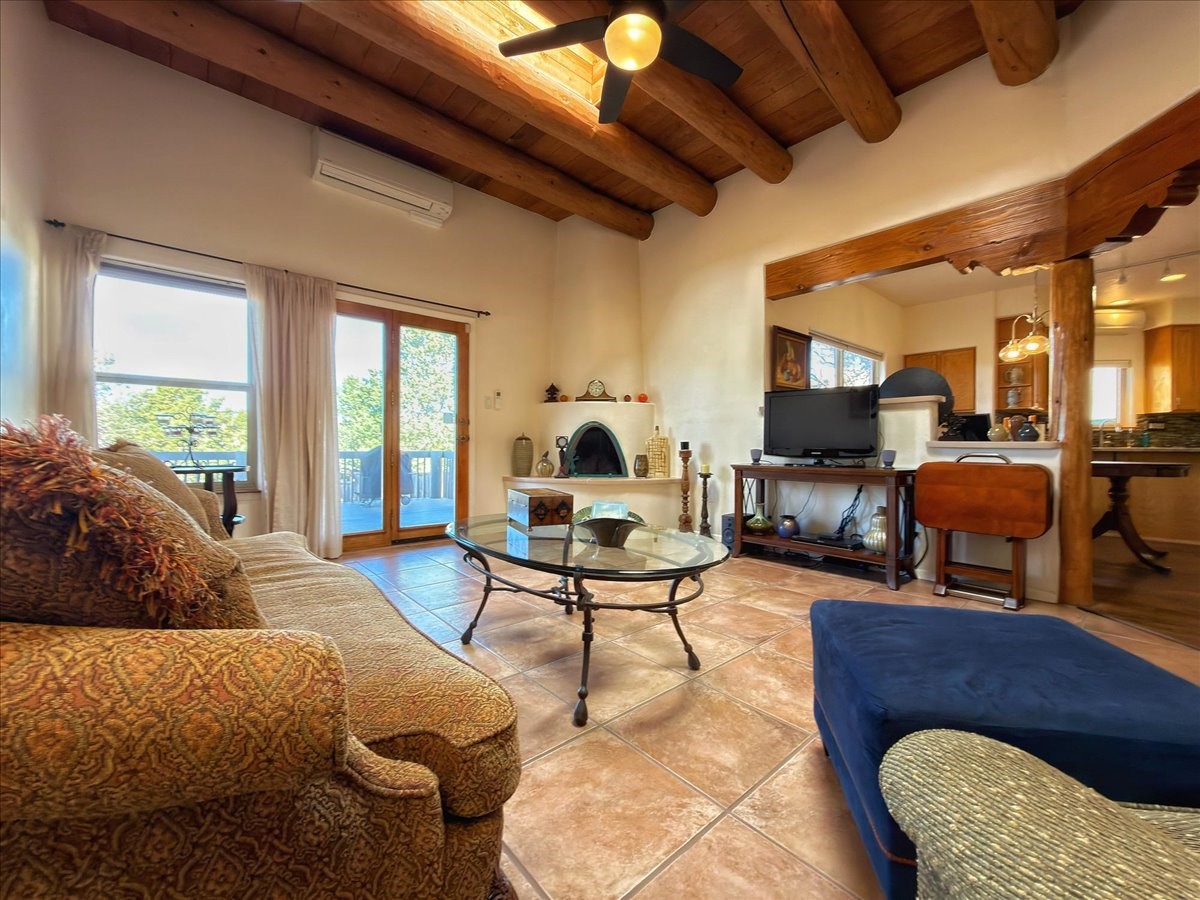 Nestled in the desirable Pueblos del Sol subdivision, this beautifully maintained split-level Pueblo-style home blends traditional Santa Fe charm with modern comfort. Featuring 3 bedrooms, 3 baths, a flex room, and generous living spaces, the home welcomes you with classic vigas, wood doors, and a warm, light-filled interior that captures the spirit of the Southwest.The main level offers a spacious living area with a kiva-style fireplace, an inviting dining space, and an updated kitchen featuring granite counters, stainless steel appliances, and gas cooking. The primary bedroom suite is conveniently located on this level, offering privacy, an en suite bath, and easy access to the main living areas.Downstairs, the split-level design reveals two additional bedrooms, a full bath, and a flex room perfect for a home office, studio, or media space. Every detail reflects thoughtful care and updates, including mini-split heating and cooling systems for year-round comfort, a water softener/reverse osmosis system, and a radon mitigation system for peace of mind.Step outside to enjoy the best of Santa Fe living. A new wood deck extends your living space outdoors--ideal for relaxing or entertaining--overlooking a beautifully xeriscaped yard designed for low maintenance and natural beauty. From your backyard gate, access scenic walking trails and open space that define the Pueblos del Sol lifestyle.Additional features include an oversized two-car garage, excellent storage throughout, granite countertops, and a well-maintained roof. This home's blend of timeless style, modern updates, and thoughtful layout make it a standout in one of Santa Fe's most sought-after neighborhoods.Located close to schools, shopping, and dining, yet surrounded by trails and open skies, 2917 Pueblo Halona offers the perfect balance of convenience, comfort, and authentic Santa Fe character.