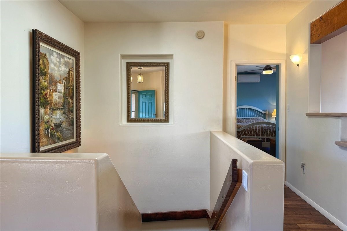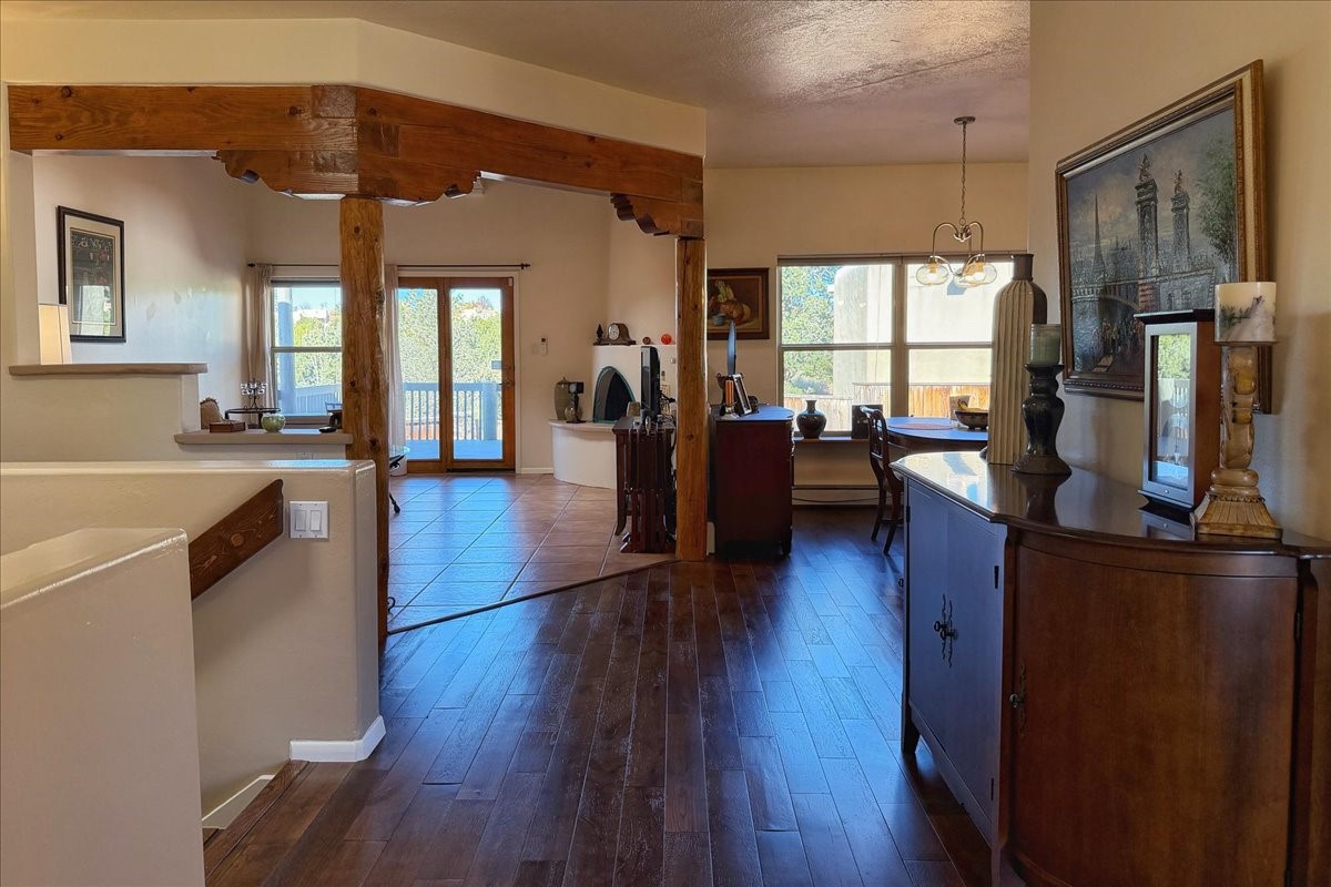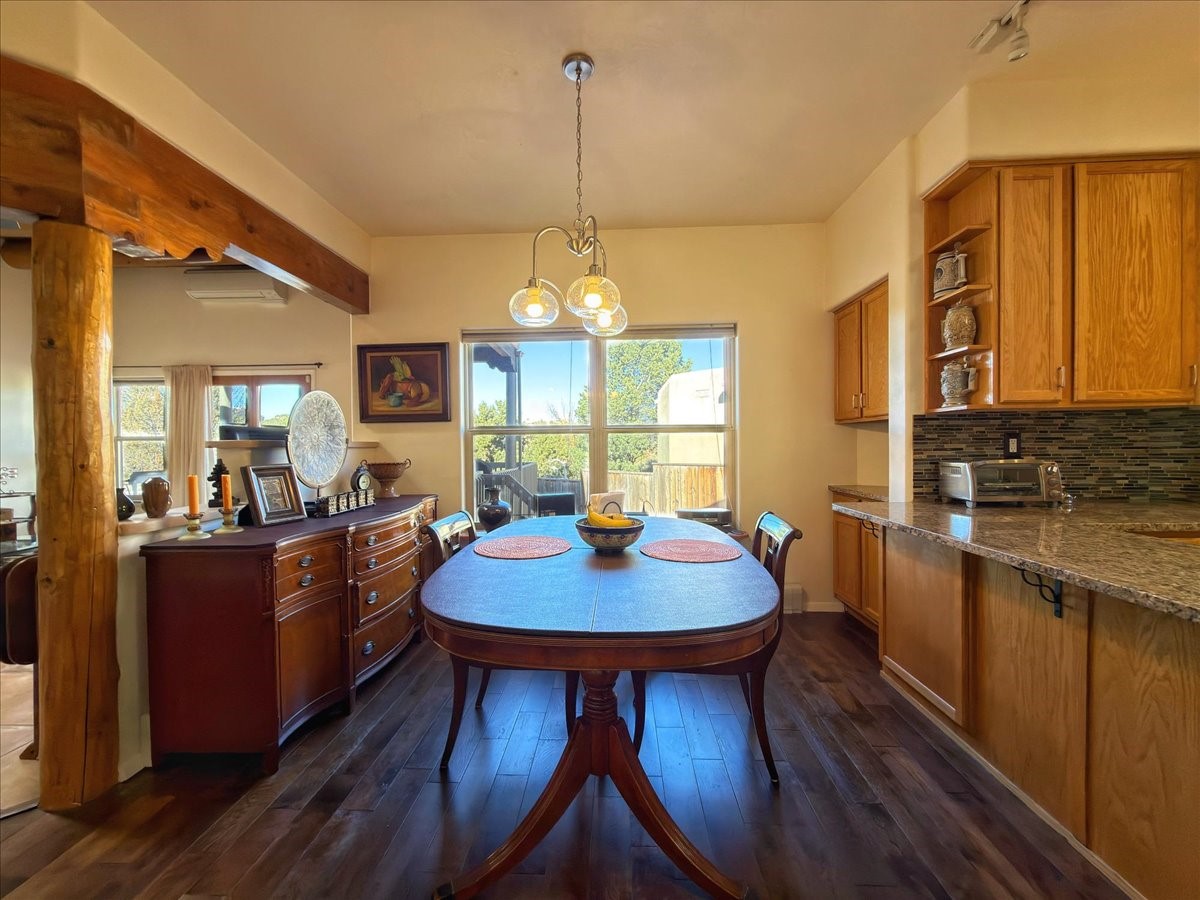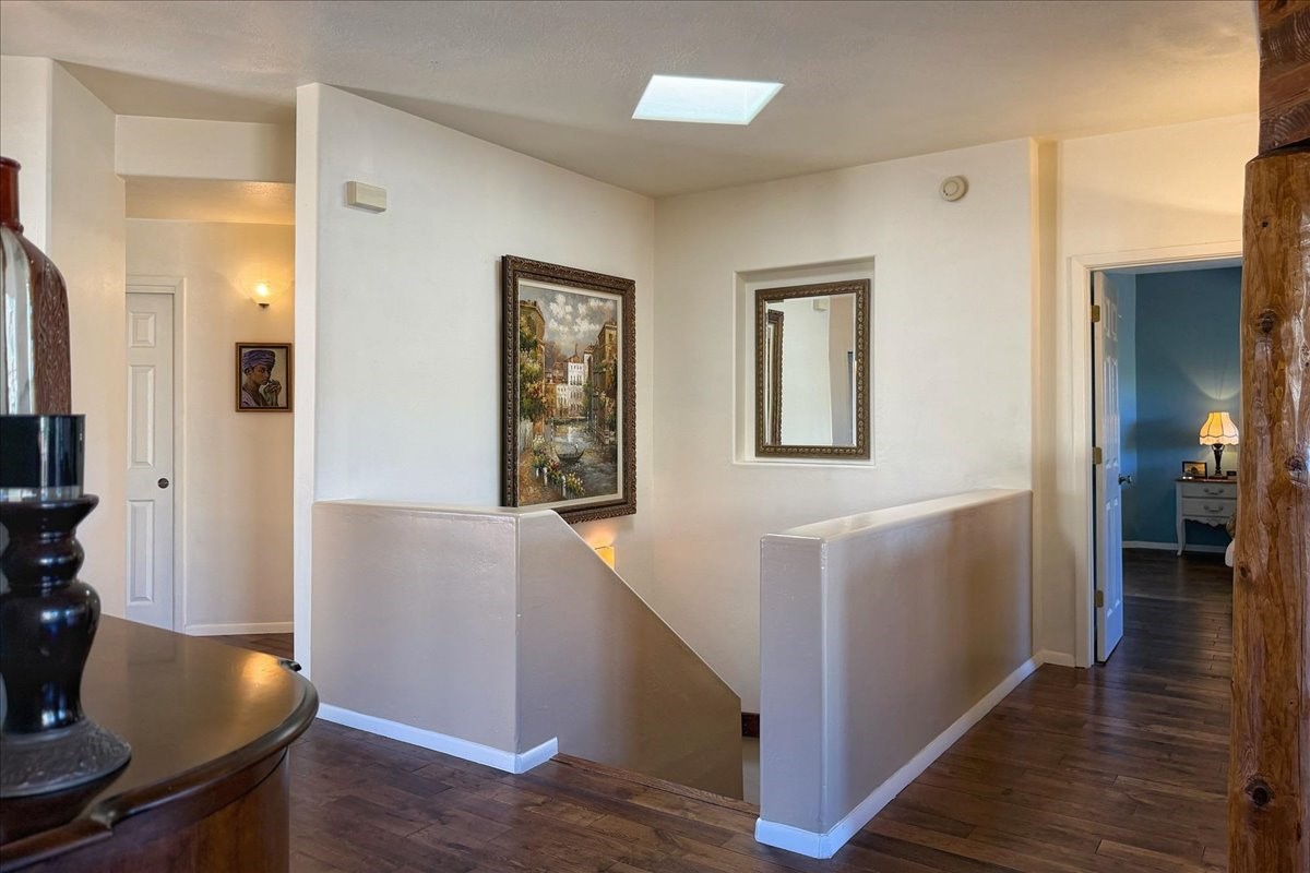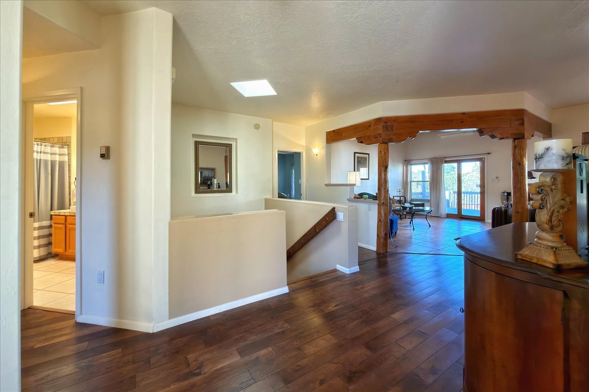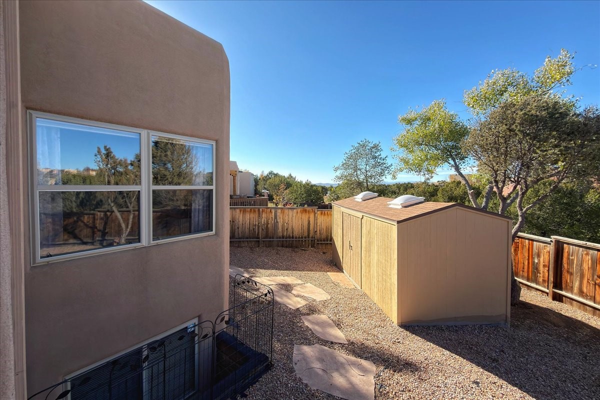 Nestled in the desirable Pueblos del Sol subdivision, this beautifully maintained split-level Pueblo-style home blends traditional Santa Fe charm with modern comfort. Featuring 3 bedrooms, 3 baths, a flex room, and generous living spaces, the home welcomes you with classic vigas, wood doors, and a warm, light-filled interior that captures the spirit of the Southwest.The main level offers a spacious living area with a kiva-style fireplace, an inviting dining space, and an updated kitchen featuring granite counters, stainless steel appliances, and gas cooking. The primary bedroom suite is conveniently located on this level, offering privacy, an en suite bath, and easy access to the main living areas.Downstairs, the split-level design reveals two additional bedrooms, a full bath, and a flex room perfect for a home office, studio, or media space. Every detail reflects thoughtful care and updates, including mini-split heating and cooling systems for year-round comfort, a water softener/reverse osmosis system, and a radon mitigation system for peace of mind.Step outside to enjoy the best of Santa Fe living. A new wood deck extends your living space outdoors--ideal for relaxing or entertaining--overlooking a beautifully xeriscaped yard designed for low maintenance and natural beauty. From your backyard gate, access scenic walking trails and open space that define the Pueblos del Sol lifestyle.Additional features include an oversized two-car garage, excellent storage throughout, granite countertops, and a well-maintained roof. This home's blend of timeless style, modern updates, and thoughtful layout make it a standout in one of Santa Fe's most sought-after neighborhoods.Located close to schools, shopping, and dining, yet surrounded by trails and open skies, 2917 Pueblo Halona offers the perfect balance of convenience, comfort, and authentic Santa Fe character.