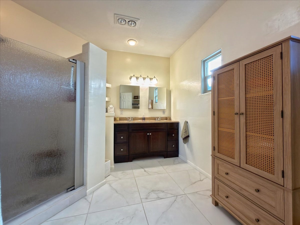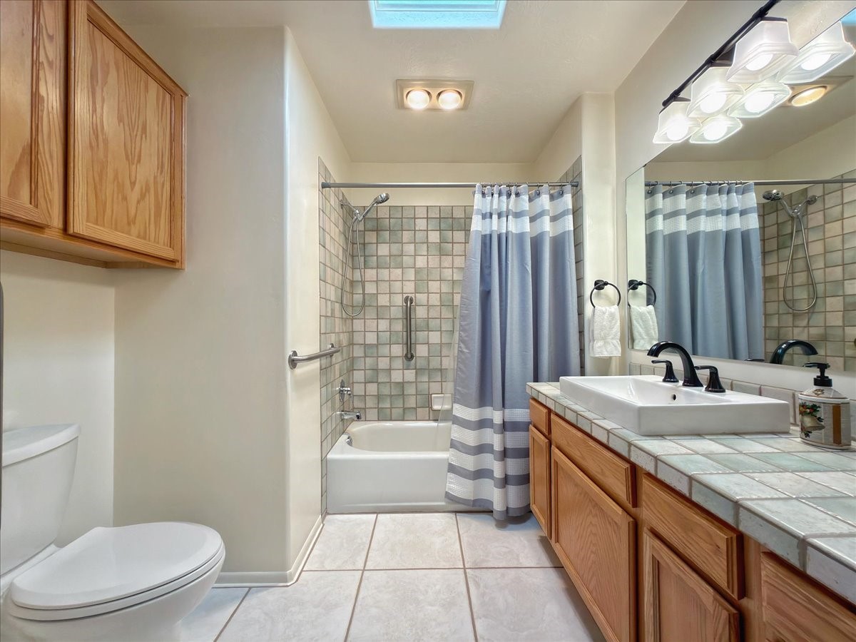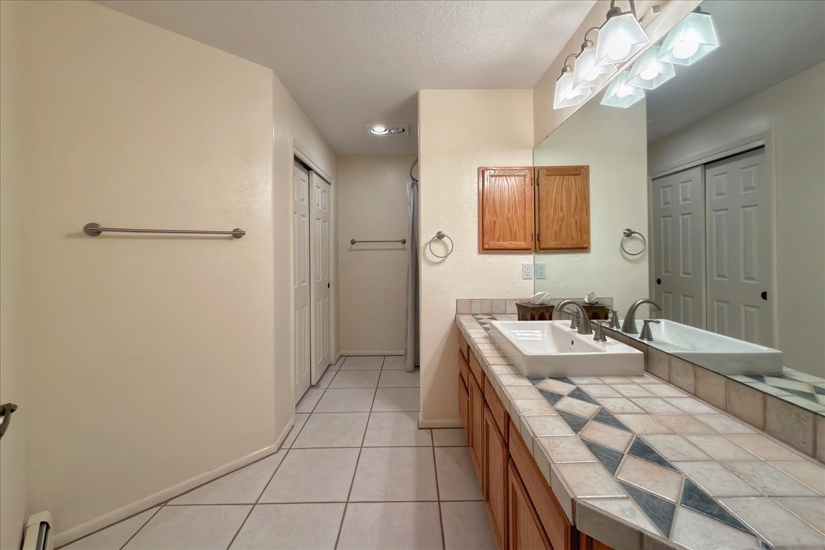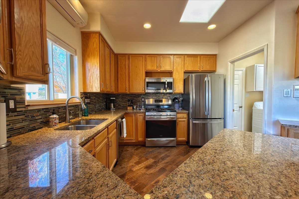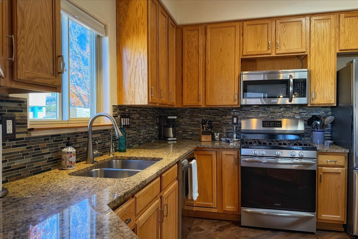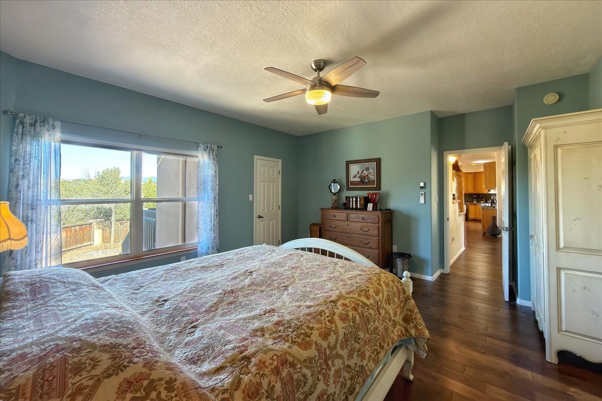 Nestled in the desirable Pueblos del Sol subdivision, this beautifully maintained split-level Pueblo-style home blends traditional Santa Fe charm with modern comfort. Featuring 3 bedrooms, 3 baths, a flex room, and generous living spaces, the home welcomes you with classic vigas, wood doors, and a warm, light-filled interior that captures the spirit of the Southwest.The main level offers a spacious living area with a kiva-style fireplace, an inviting dining space, and an updated kitchen featuring granite counters, stainless steel appliances, and gas cooking. The primary bedroom suite is conveniently located on this level, offering privacy, an en suite bath, and easy access to the main living areas.Downstairs, the split-level design reveals two additional bedrooms, a full bath, and a flex room perfect for a home office, studio, or media space. Every detail reflects thoughtful care and updates, including mini-split heating and cooling systems for year-round comfort, a water softener/reverse osmosis system, and a radon mitigation system for peace of mind.Step outside to enjoy the best of Santa Fe living. A new wood deck extends your living space outdoors--ideal for relaxing or entertaining--overlooking a beautifully xeriscaped yard designed for low maintenance and natural beauty. From your backyard gate, access scenic walking trails and open space that define the Pueblos del Sol lifestyle.Additional features include an oversized two-car garage, excellent storage throughout, granite countertops, and a well-maintained roof. This home's blend of timeless style, modern updates, and thoughtful layout make it a standout in one of Santa Fe's most sought-after neighborhoods.Located close to schools, shopping, and dining, yet surrounded by trails and open skies, 2917 Pueblo Halona offers the perfect balance of convenience, comfort, and authentic Santa Fe character.