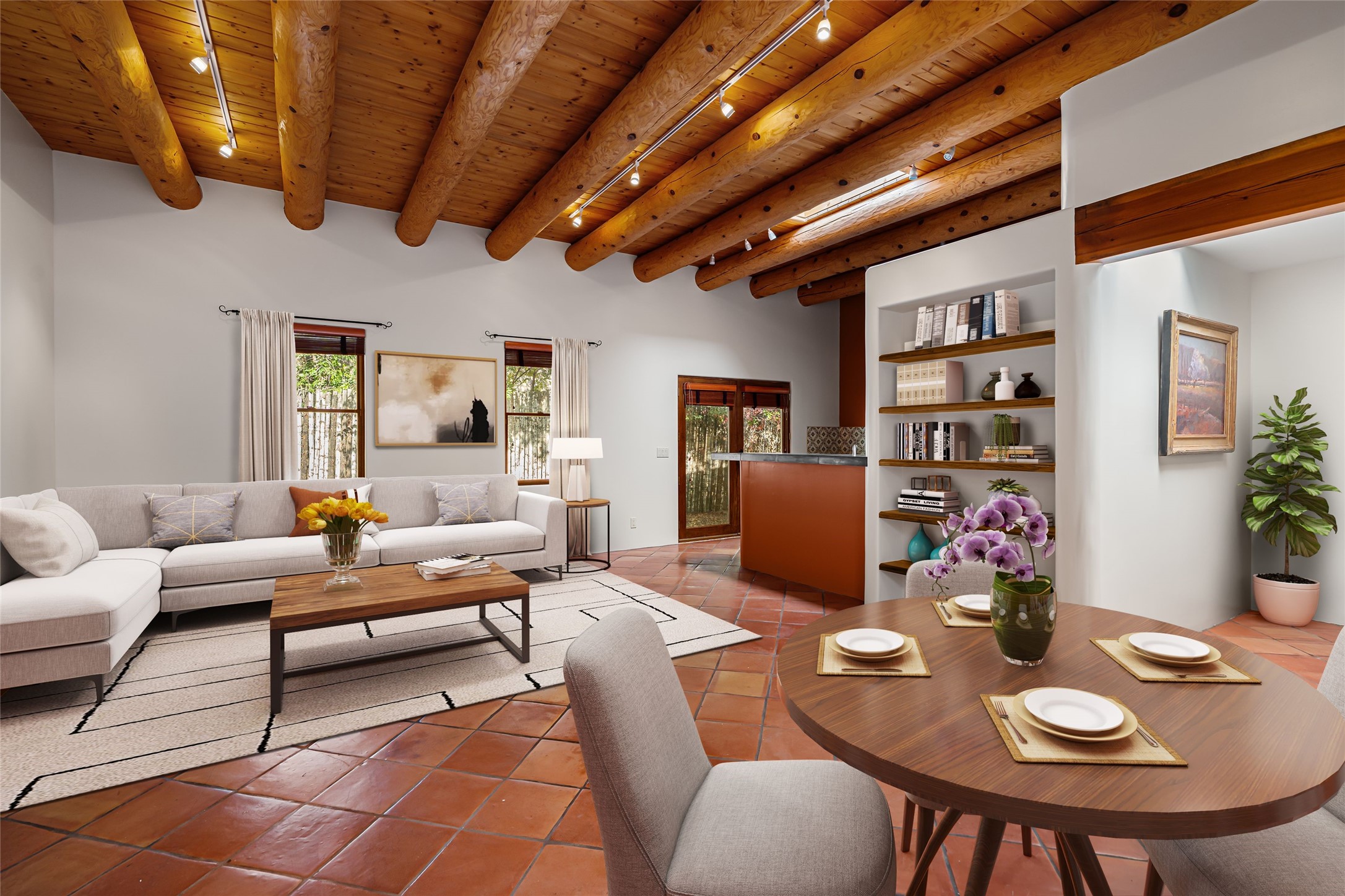 Designed and crafted in 2006 by an award-winning builder, this distinctive pueblo-style home captures the essence of Santa Fe living with quality craftsmanship, architectural charm and a serene sense of privacy. Ideally situated in a highly walkable neighborhood near Harvey Cornell Rose Park and approximately one mile from the historic Santa Fe Plaza, the property offers effortless access to restaurants, shopping and business amenities while remaining a peaceful retreat from city life. Although classified as a condominium, this residence lives like a single family home. The property is completely walled and fenced, featuring gated access and walkways surrounding the home, creating a tranquil and secure sanctuary within the heart of the city. The single-level floor plan (approx. 1489 sq.ft.) provides comfortable step-free living with three bedrooms and two full baths. Natural light fills the interior through multiple skylights, enhancing the spacious ambiance created by 11-foot ceilings with traditional vigas. The generous kitchen offers abundant cabinetry and a warm, inviting atmosphere for cooking and entertaining. Thoughtful design details include tasteful tilework in the kitchen and baths, tile flooring throughout and consistent in-floor gas radiant heating. A wood-burning kiva fireplace anchors the living area, providing cozy charm on cool Santa Fe evenings. Further upgrades include a newer roof and skylights (2025), newer Lochinvar water heater and LG laundry equipment. Ample storage space and three assigned parking spaces add to the property's convenience. The home offers a rare combination of privacy, comfort and proximity-nestled in a desirable, centrally located neighborhood that embodies the best of Santa Fe's architectural style and cultural vibrancy. Whether as a primary residence or a serene second home, this property represents a unique opportunity to enjoy refined Southwestern living in an exceptional setting.
