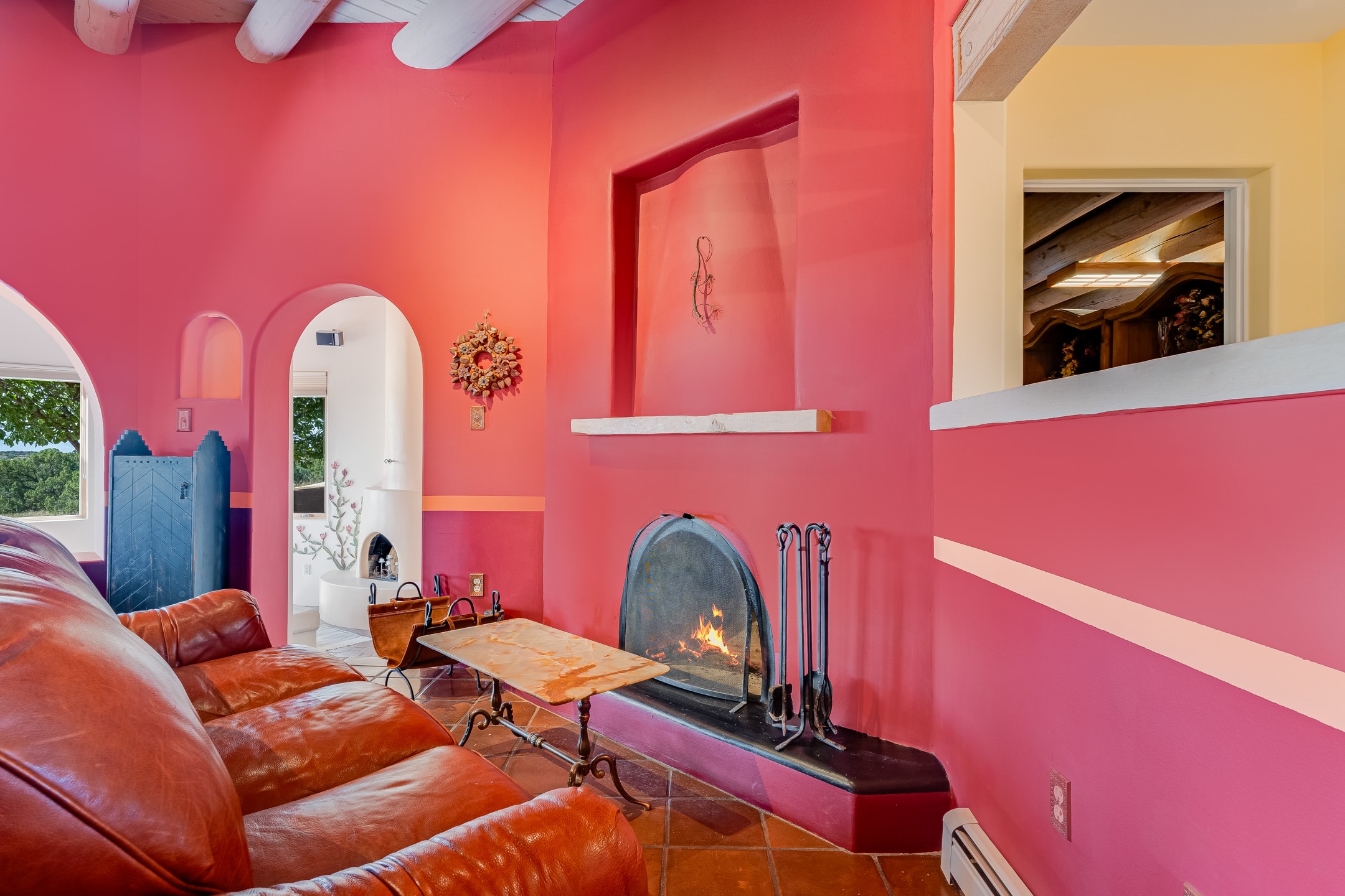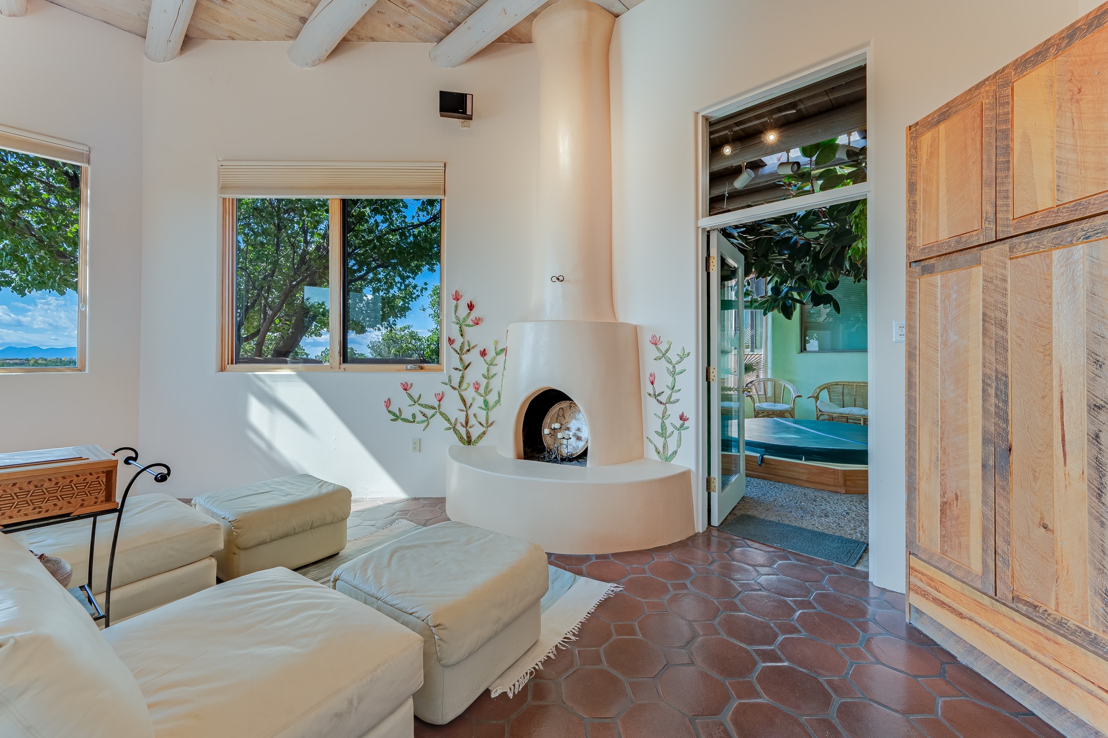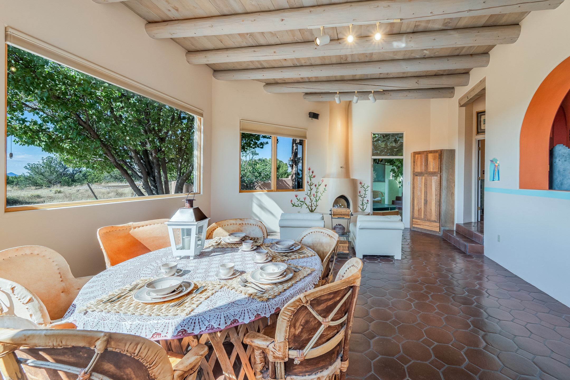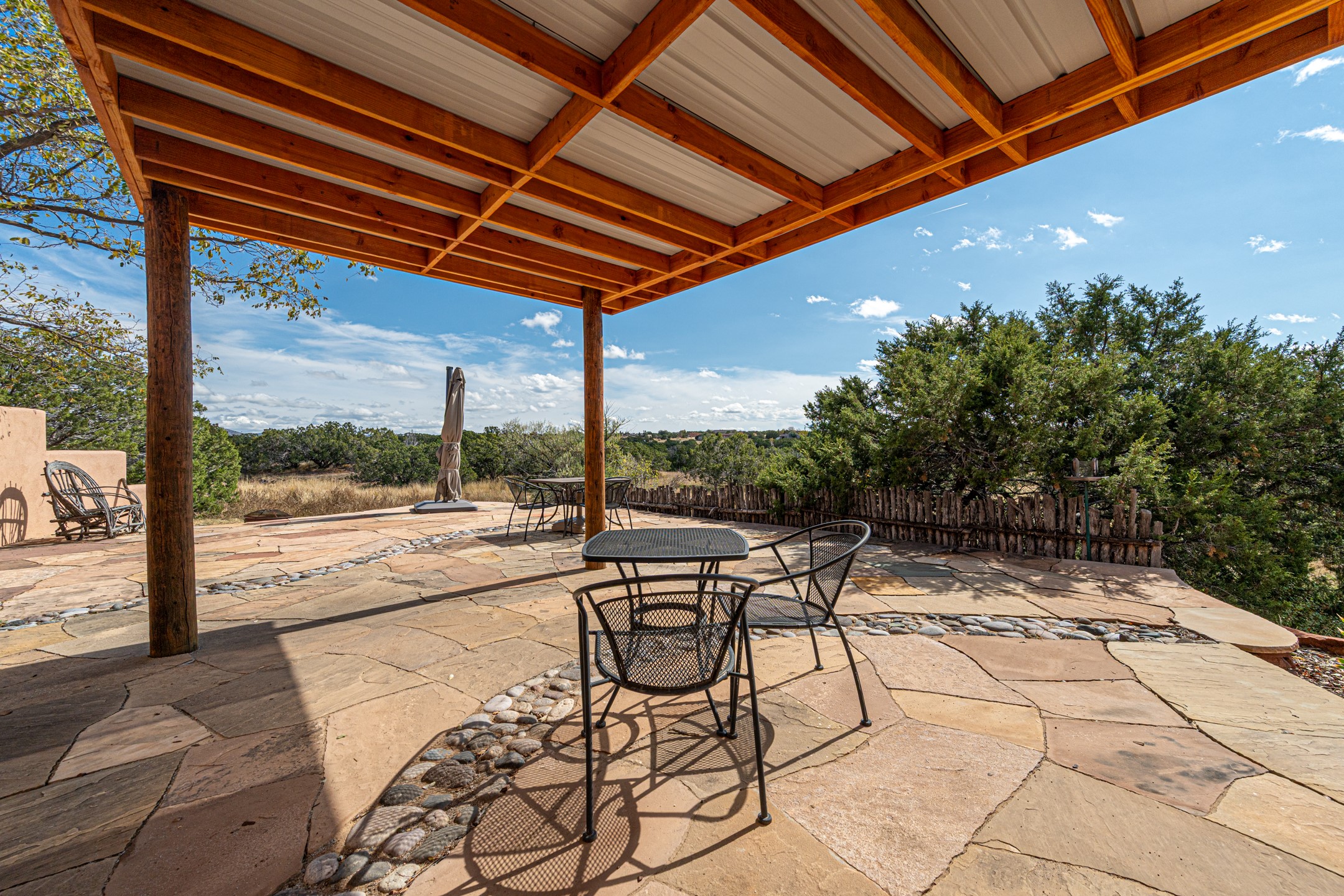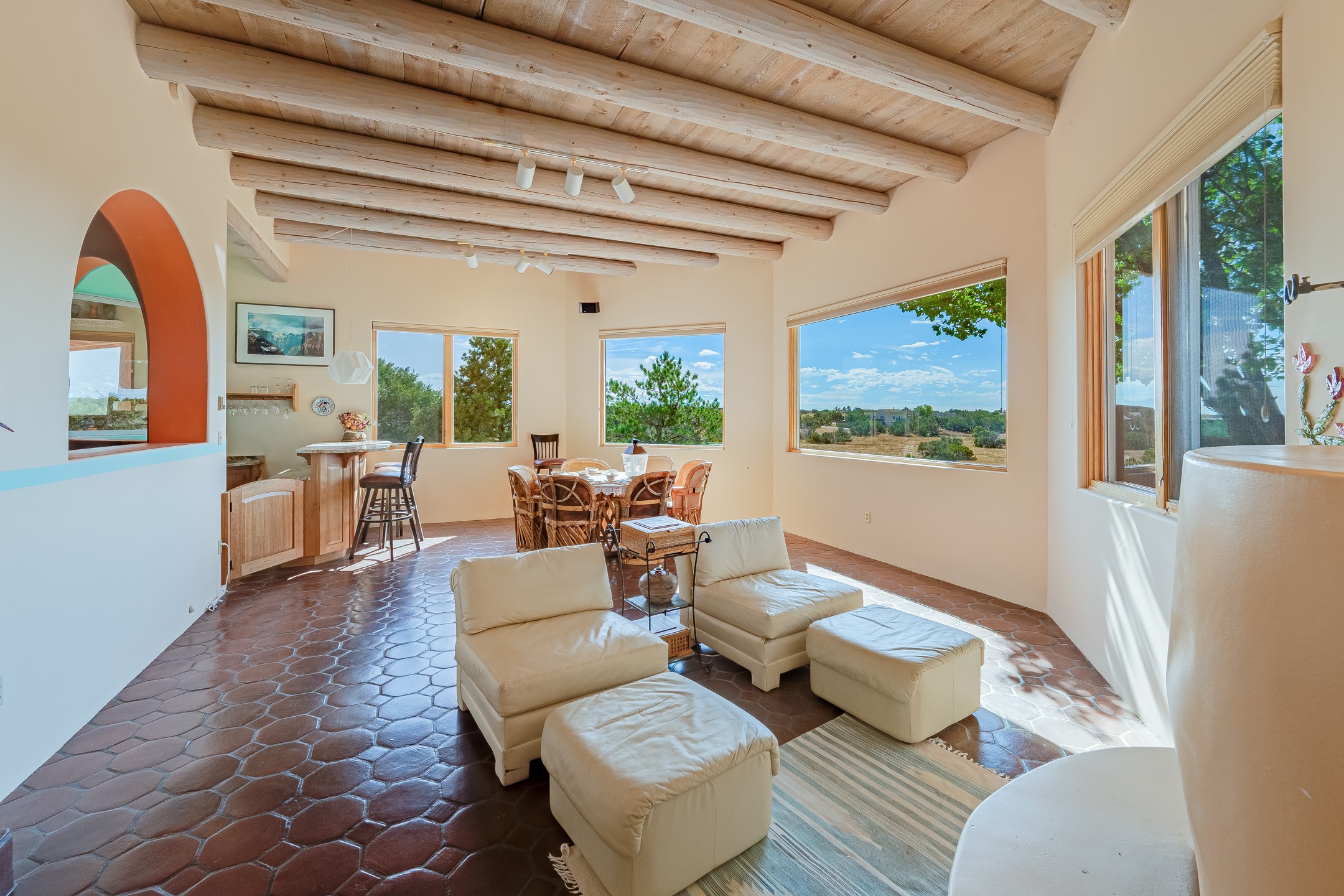 Resting on nearly 4.75 acres, a rarity in Eldorado lives this hacienda style home with all the Santa Fe touches, Saltillo and Talavera tile, Vigas, Nichos, Kiva fireplaces, Arched Doorways, artful color palate, and more! Expansive views out almost every window are breathtaking! The openness of the Great Room complete with wet-bar is made for entertaining. The guest wing offers two bedrooms plus an office The primary bedroom is well separated in its own wing and offers an attached office or bonus room that could work as a fourth bedroom. A dressing room is adjacent to the primary bath. The dining room opens to a spacious covered flagstone patio with spectacular views of the Sandia Mountains and is the perfect place to take in the view at days end or while sipping morning coffee. The garden room with hot tub adds a pampering touch. With HOA approval, the lot is large enough to keep horses! Eldorado offers K-8 school, summertime pool, tennis and pickleball courts, Community Center, dog park, miles of hiking and biking trails, wilderness, shopping, dining, library, Senior Center, in a private country setting yet is less than 30 minutes to The Santa Fe Plaza!