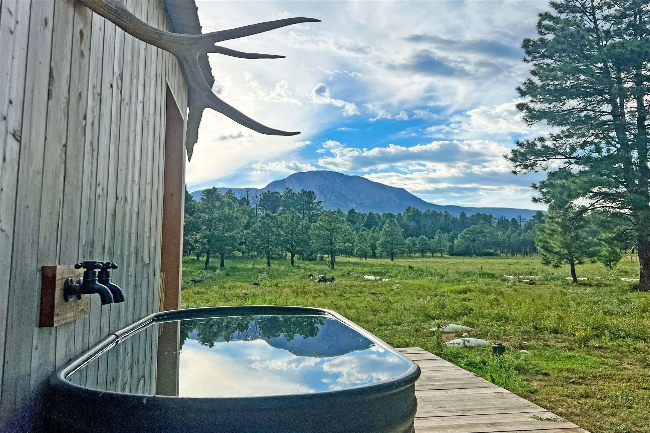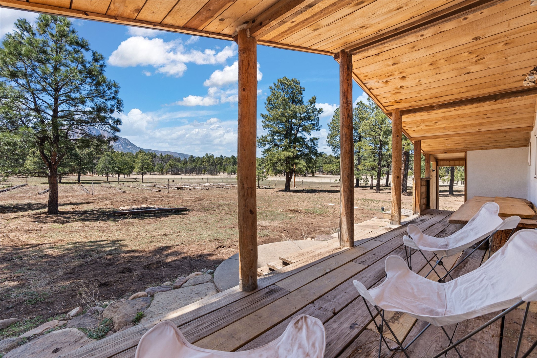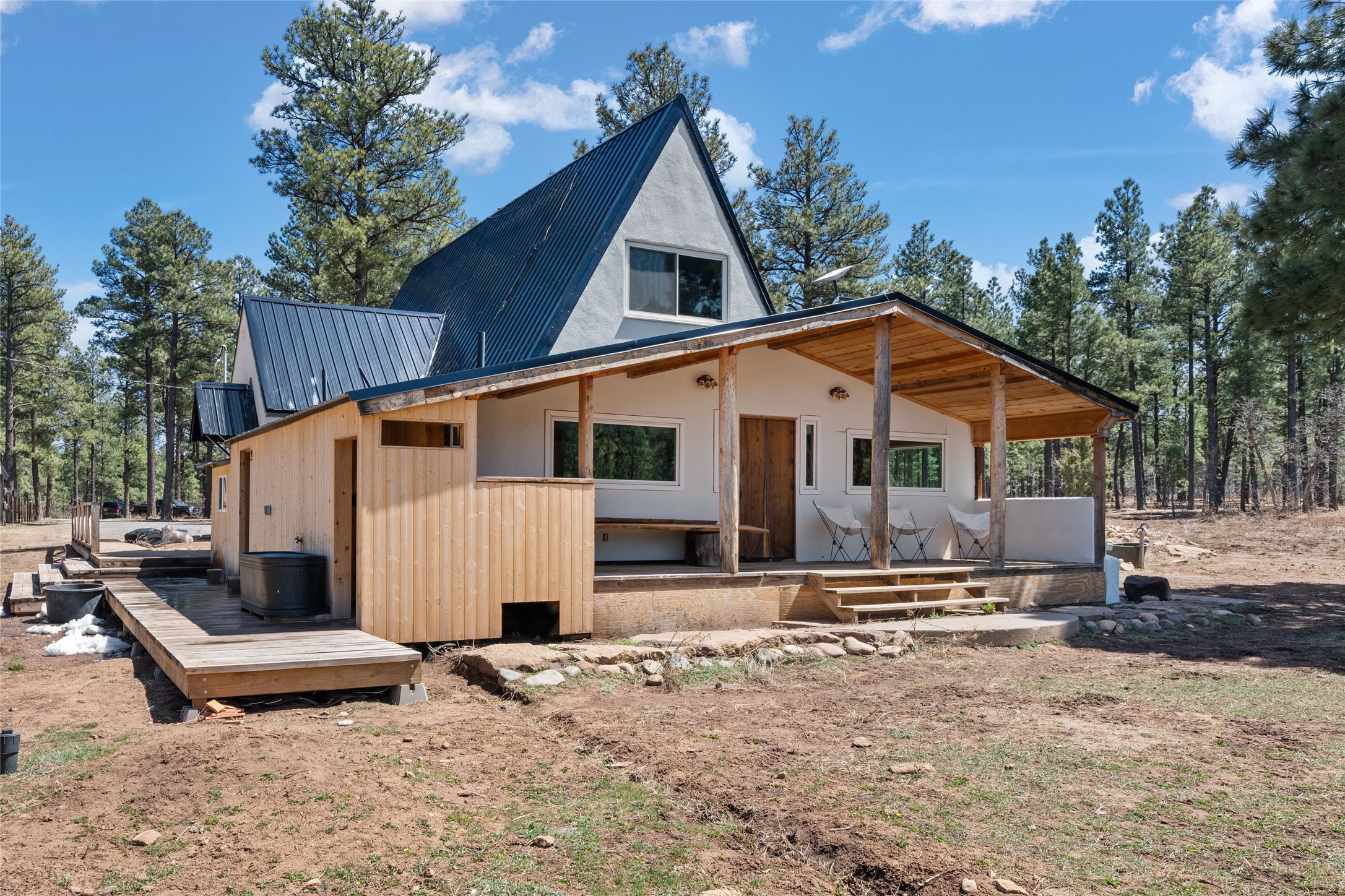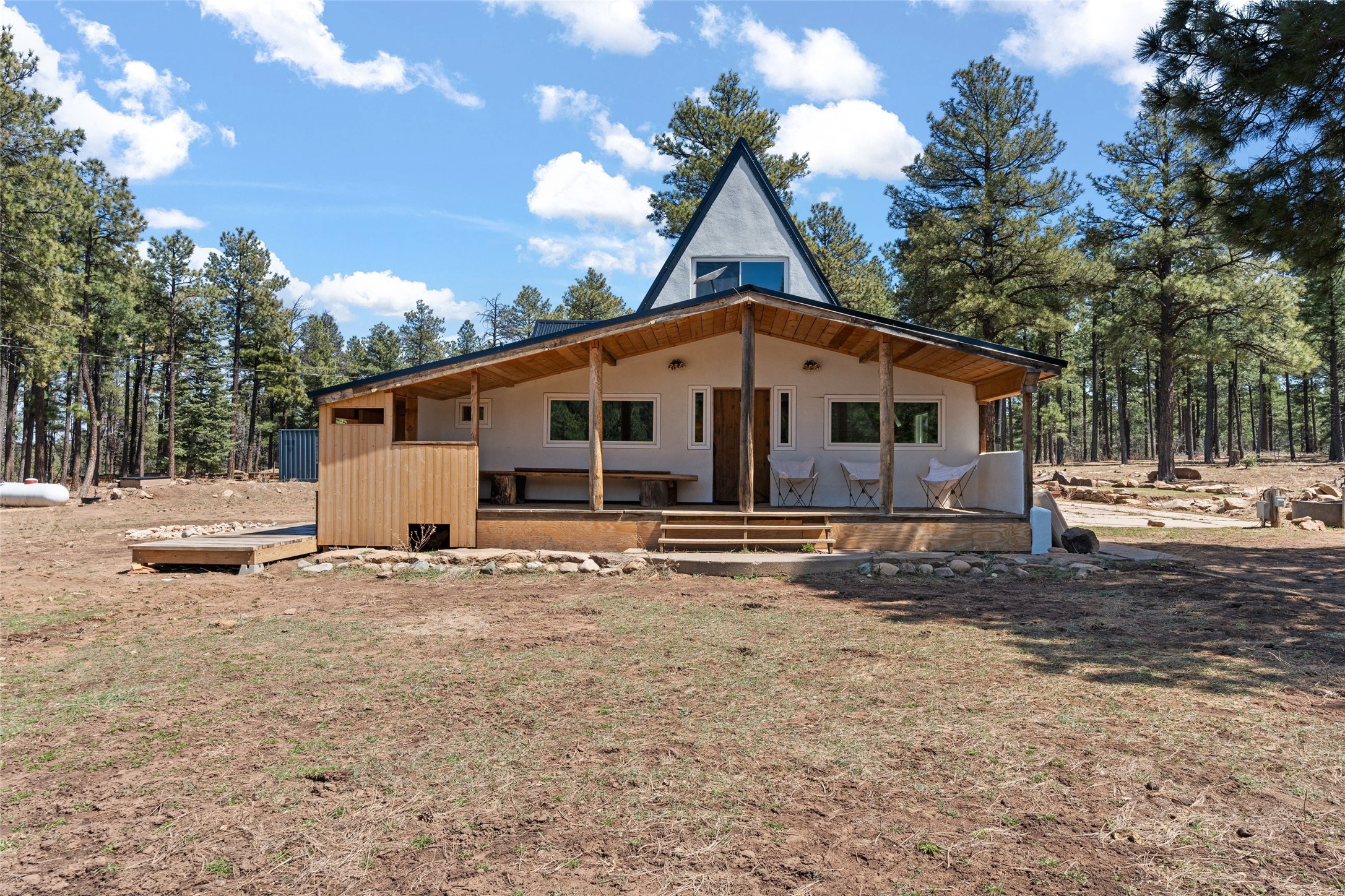 Secluded Mountain Retreat with Modern Upgrades.Behind a gated entrance, this 11.86-acre mountain retreat near Las Vegas, NM, and Storrie Lake offers privacy, sustainability, and stunning views of Hermits Peak. Originally a faminly hunting compound, the beautifully remodeled A-fram home features 3 bedrooms, 1.5 baths, an open-concept living area with a pellet stove, and a kitchen with movable workbench-style counters and an induction cooktop.Upgrades include lifetime warranty windows, a battery-ready 19-panel solar system, new laminte flooring, and enhanced insulation. The fully fenced property is ideal for homesteading or horses, with a hay barn, electric solar horse paddock, and trailer turnarounds. Enjoy two ponds, two wells, a 1/2 acre garden, and compost bins. Outdoor spaces shine with a wrap-around deck, hot shower, and cold plunge pool.Additional features: 500-gallon propane tank, RV hookups, three freezers, two refrigerators, and major fire mitigation. Don't miss this rare blend of mountain seclusion and modern comfort!