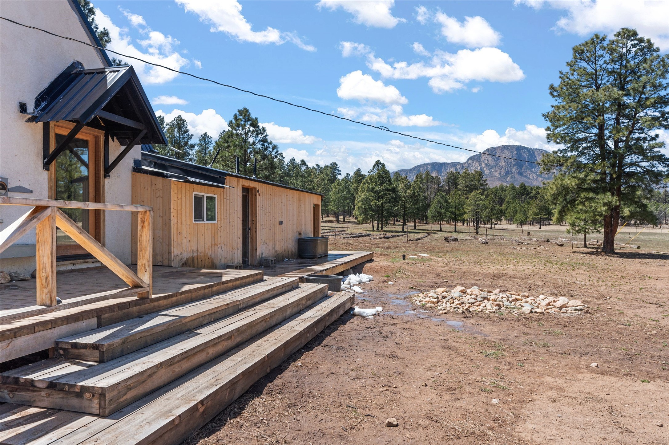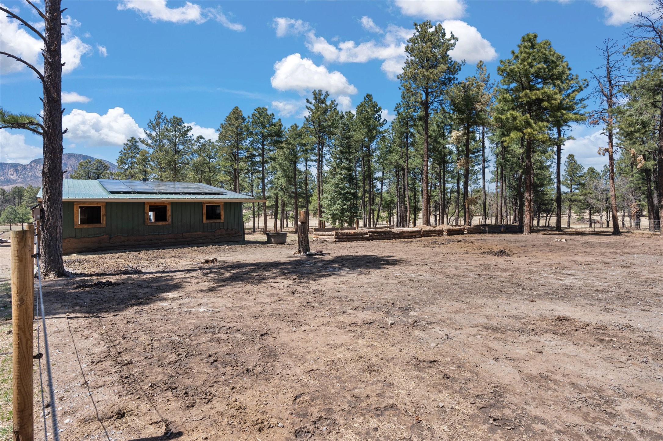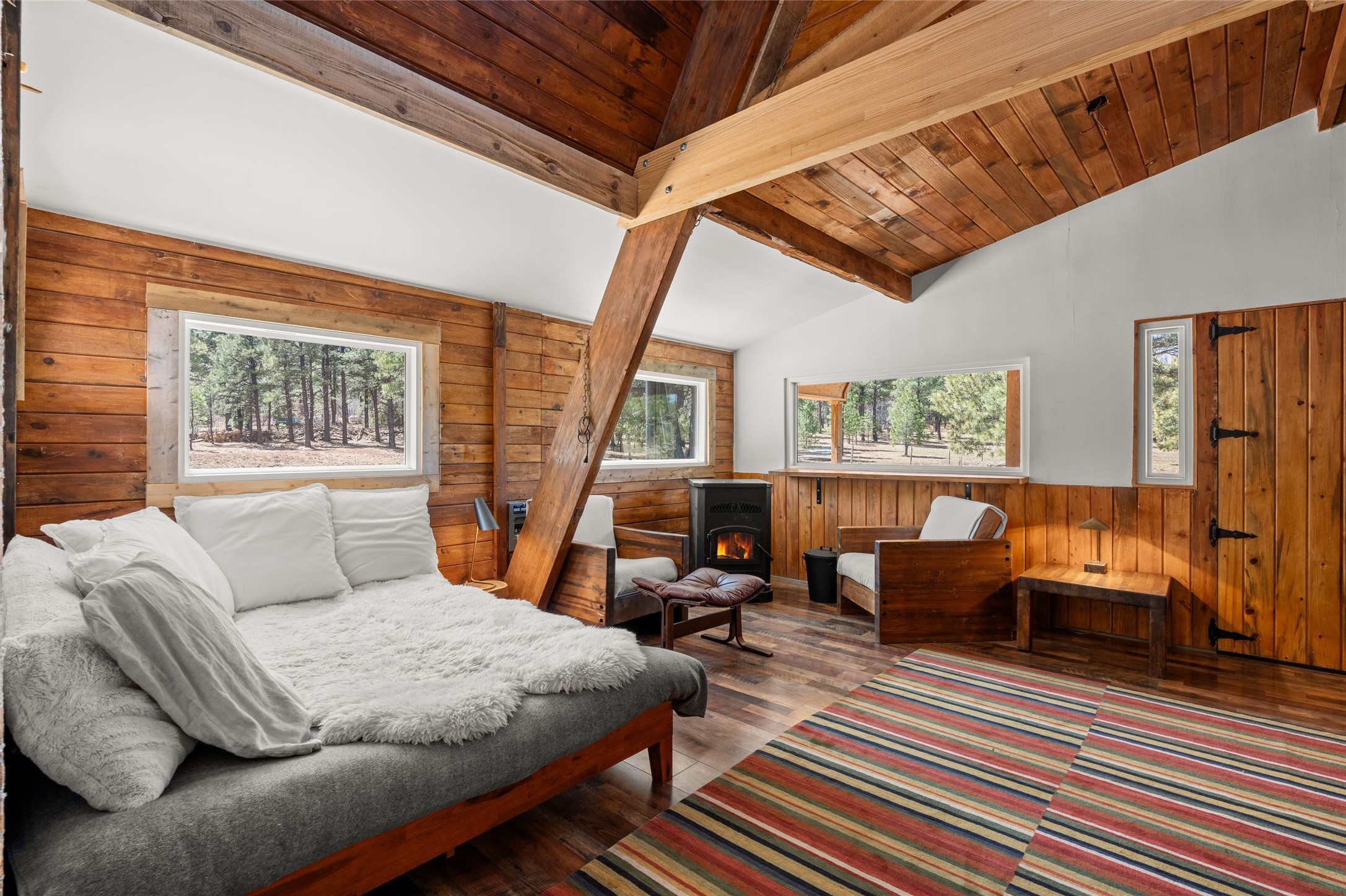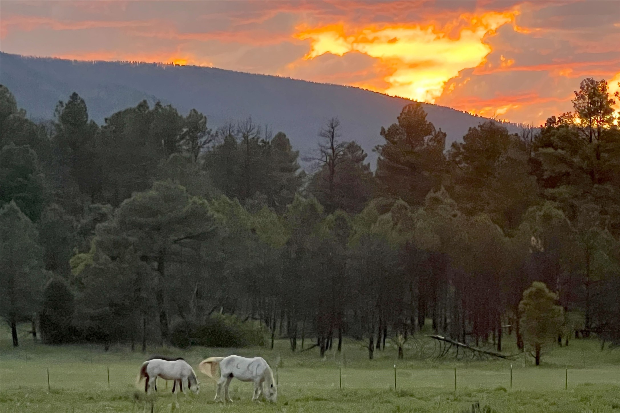 Secluded Mountain Retreat with Modern Upgrades.Behind a gated entrance, this 11.86-acre mountain retreat near Las Vegas, NM, and Storrie Lake offers privacy, sustainability, and stunning views of Hermits Peak. Originally a faminly hunting compound, the beautifully remodeled A-fram home features 3 bedrooms, 1.5 baths, an open-concept living area with a pellet stove, and a kitchen with movable workbench-style counters and an induction cooktop.Upgrades include lifetime warranty windows, a battery-ready 19-panel solar system, new laminte flooring, and enhanced insulation. The fully fenced property is ideal for homesteading or horses, with a hay barn, electric solar horse paddock, and trailer turnarounds. Enjoy two ponds, two wells, a 1/2 acre garden, and compost bins. Outdoor spaces shine with a wrap-around deck, hot shower, and cold plunge pool.Additional features: 500-gallon propane tank, RV hookups, three freezers, two refrigerators, and major fire mitigation. Don't miss this rare blend of mountain seclusion and modern comfort!