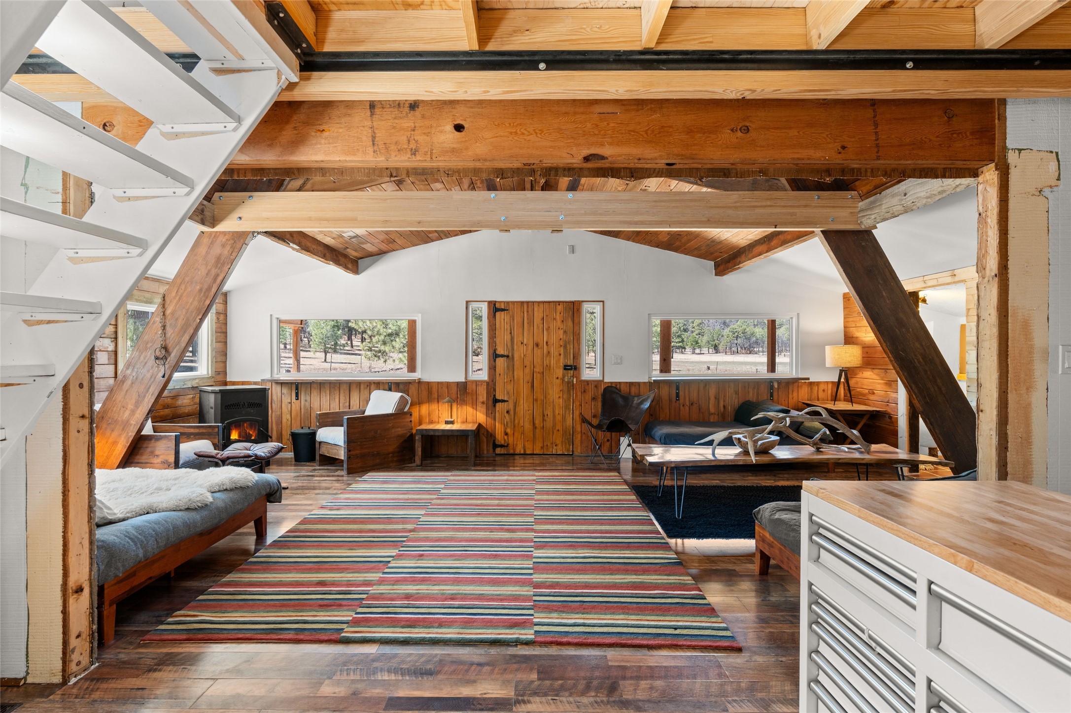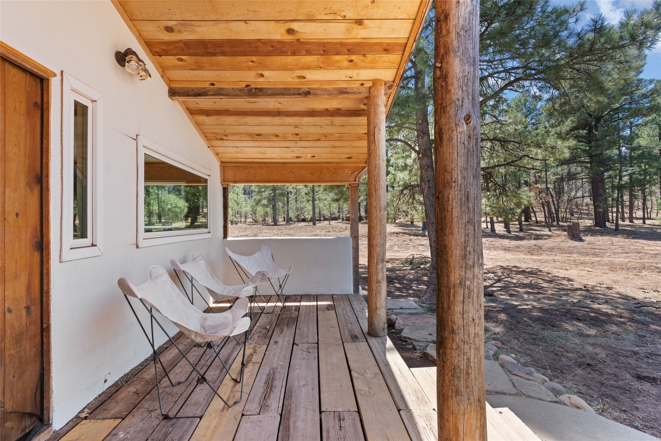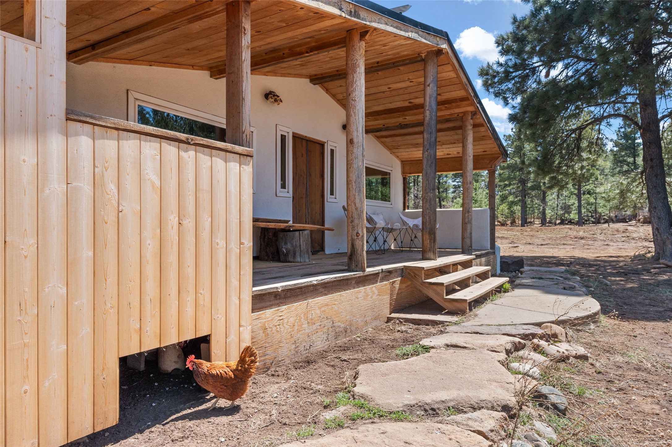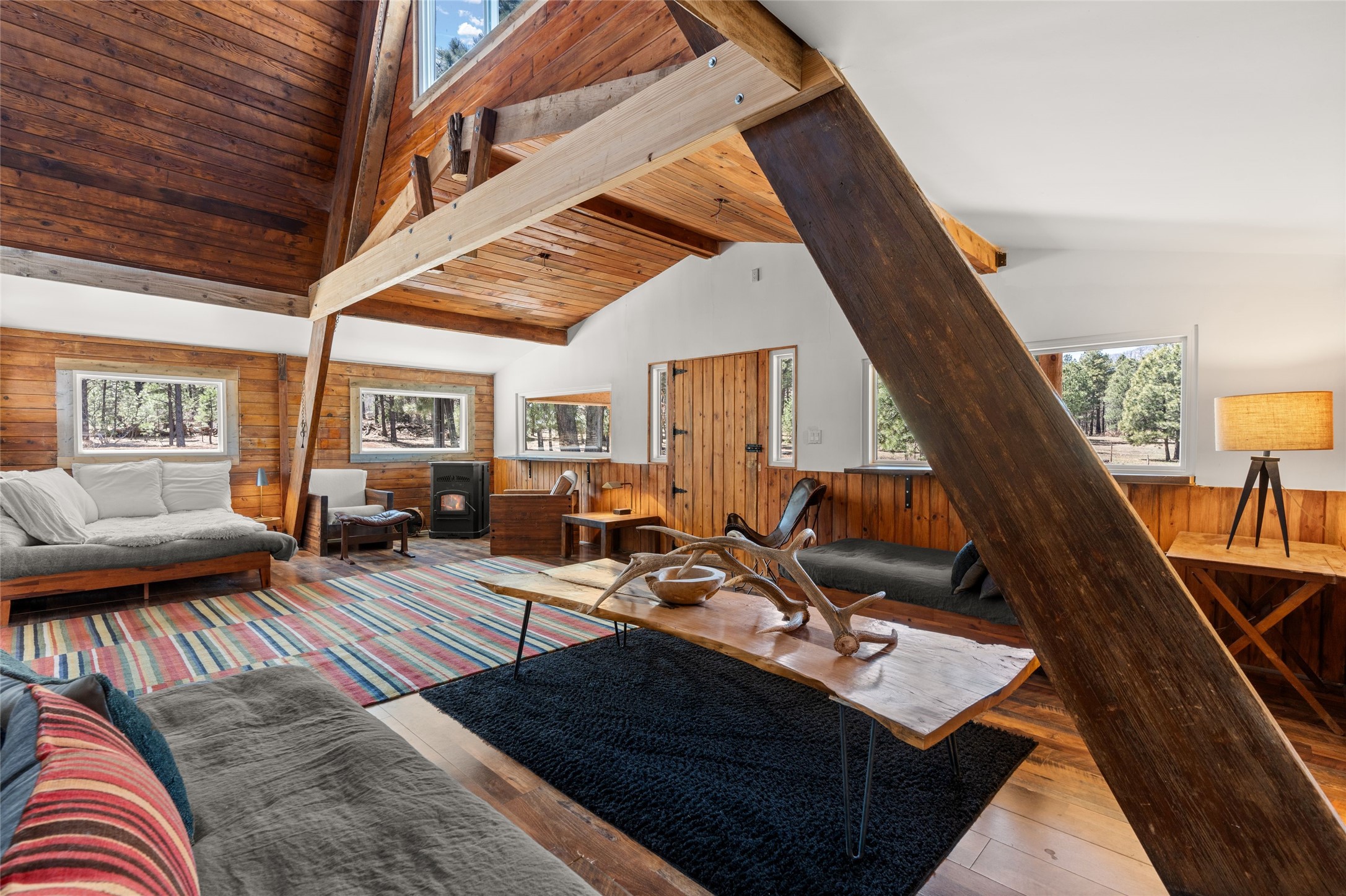 Secluded Mountain Retreat with Modern Upgrades.Behind a gated entrance, this 11.86-acre mountain retreat near Las Vegas, NM, and Storrie Lake offers privacy, sustainability, and stunning views of Hermits Peak. Originally a faminly hunting compound, the beautifully remodeled A-fram home features 3 bedrooms, 1.5 baths, an open-concept living area with a pellet stove, and a kitchen with movable workbench-style counters and an induction cooktop.Upgrades include lifetime warranty windows, a battery-ready 19-panel solar system, new laminte flooring, and enhanced insulation. The fully fenced property is ideal for homesteading or horses, with a hay barn, electric solar horse paddock, and trailer turnarounds. Enjoy two ponds, two wells, a 1/2 acre garden, and compost bins. Outdoor spaces shine with a wrap-around deck, hot shower, and cold plunge pool.Additional features: 500-gallon propane tank, RV hookups, three freezers, two refrigerators, and major fire mitigation. Don't miss this rare blend of mountain seclusion and modern comfort!