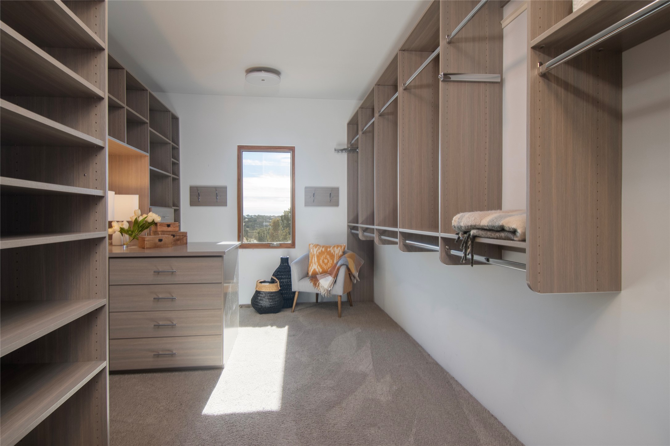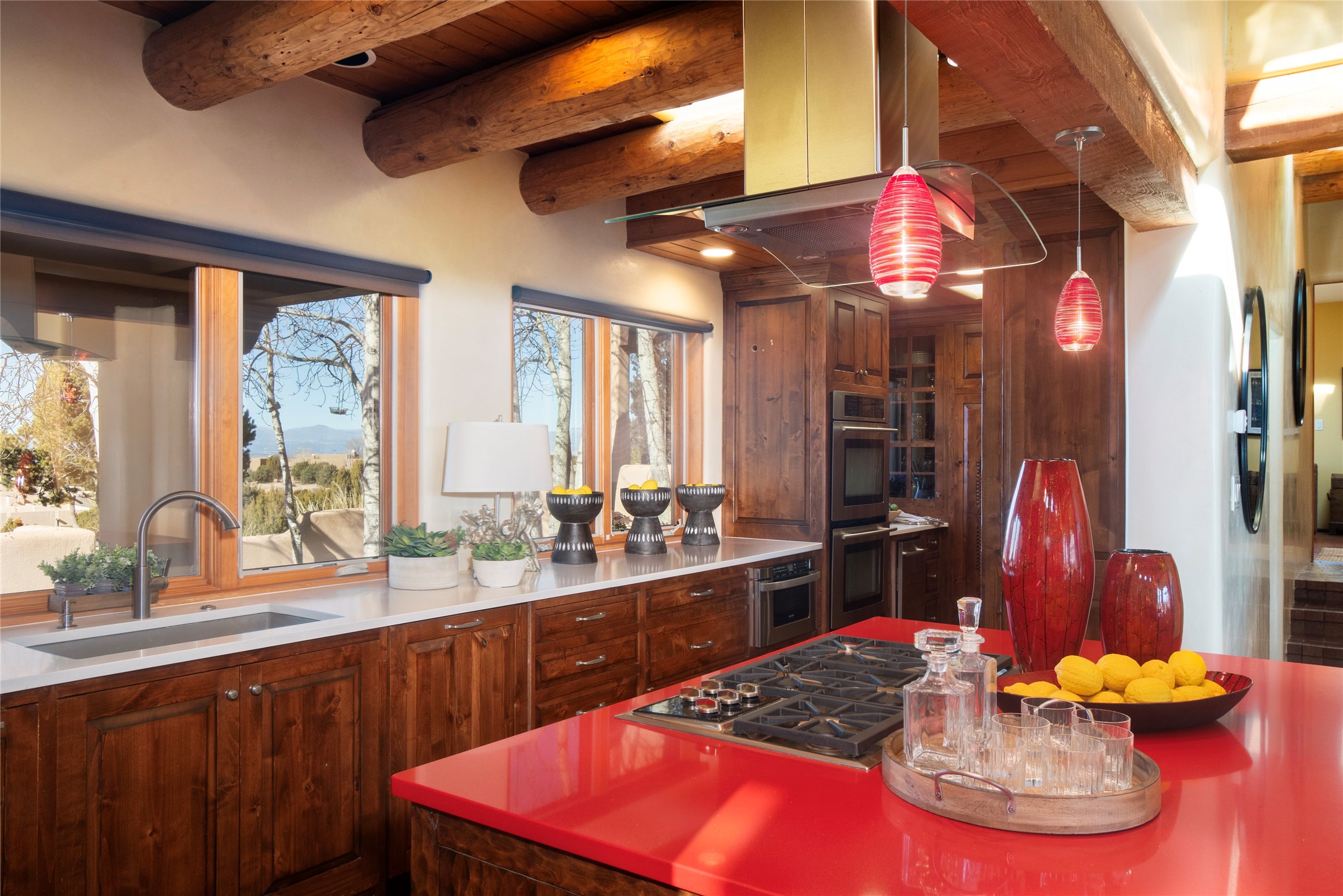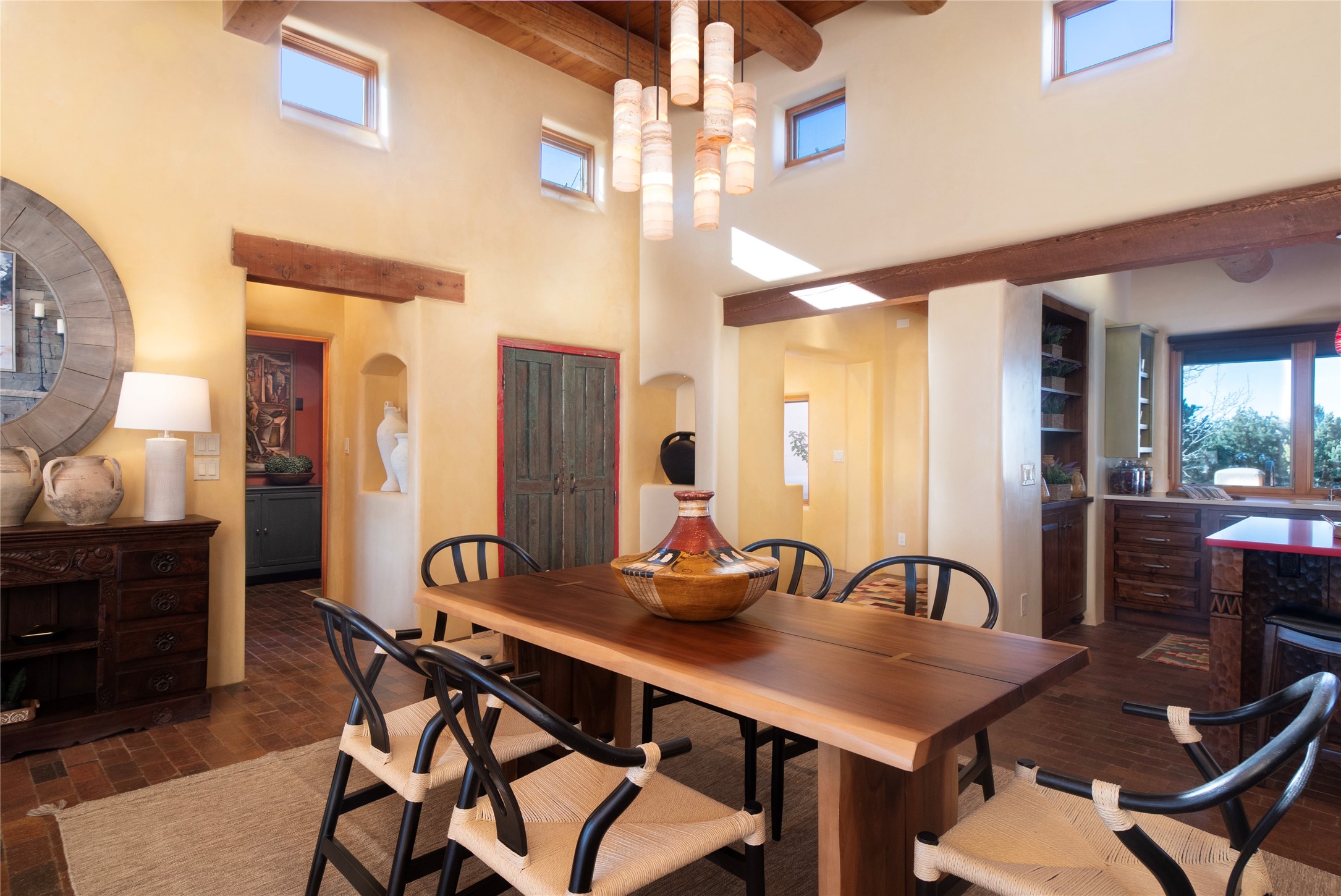Exceptional pueblo-style home offering picturesque mountain views from a 5.01-acre setting. This beautifully crafted 3,179 sq ft residence features 3 bedrooms (possibly 4 with the studio/den room) and 3 baths, showcases Southwestern architecture with hand-troweled plaster walls, exposed vigas and beams, stone accents, and warm wood detailing throughout. The light-filled great room boasts soaring ceilings and expansive windows that frame the surrounding landscape and open to inviting portals, creating seamless indoor-outdoor living ideal for entertaining or quiet relaxation. A welcoming entry courtyard sets a tranquil tone, while gracious living and dining spaces provide comfort and flexibility. Mature native landscaping blends effortlessly with the natural terrain, offering privacy and a strong connection to the land. Perfectly positioned to enjoy Santa Fe's renowned skies, mountain views, and architectural heritage, this delightful property delivers timeless style, serenity, and a true sense of place to call home.