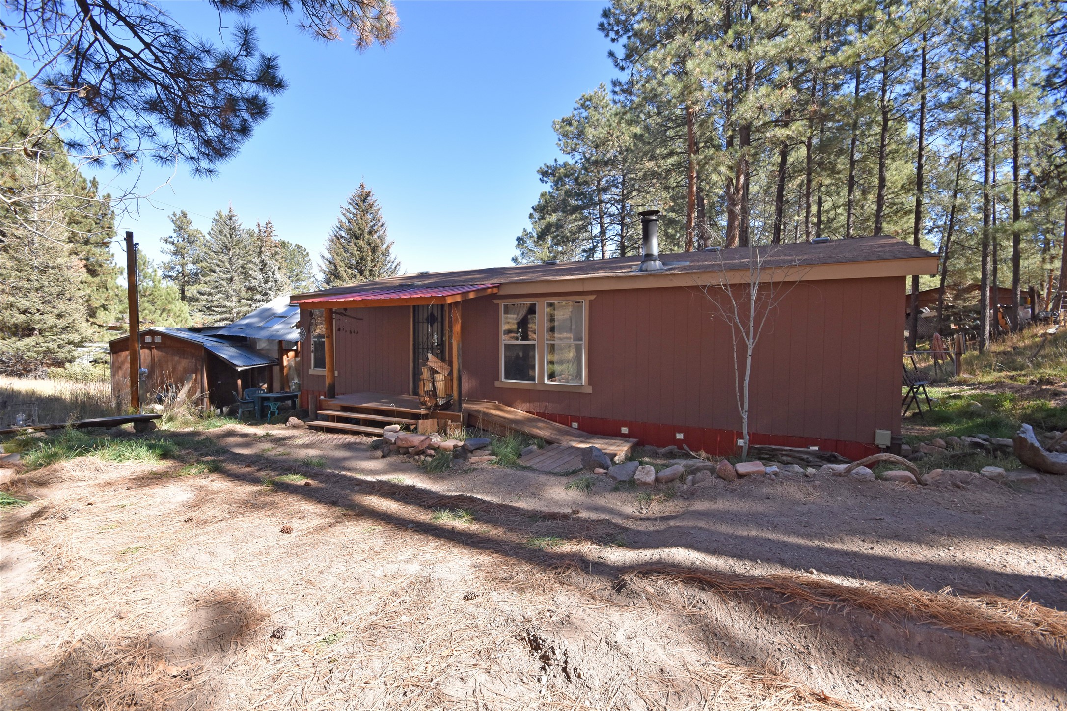 Fabulous Views, Easy Access, & a Great Location! Nestled in the tight-knit community of La Cueva, this charming & affordable home sits on a 0.5-acre lot surrounded by pine trees & nature. Enjoy community water through Hidden Valley Estates MDWCA. The spacious layout features a split floor plan with the master bedroom on one side & two additional bedrooms on the other. Two full baths, including one with a garden tub. The open concept living area has an efficient woodstove for cozy evenings at home, & the country kitchen provides plenty of counter space along with an attached laundry room. Enjoy fishing & hiking right out your back door! Conveniently located on a county-maintained road for year-round access and just a reasonable 40-minute commute to Los Alamos. Don't miss this one!