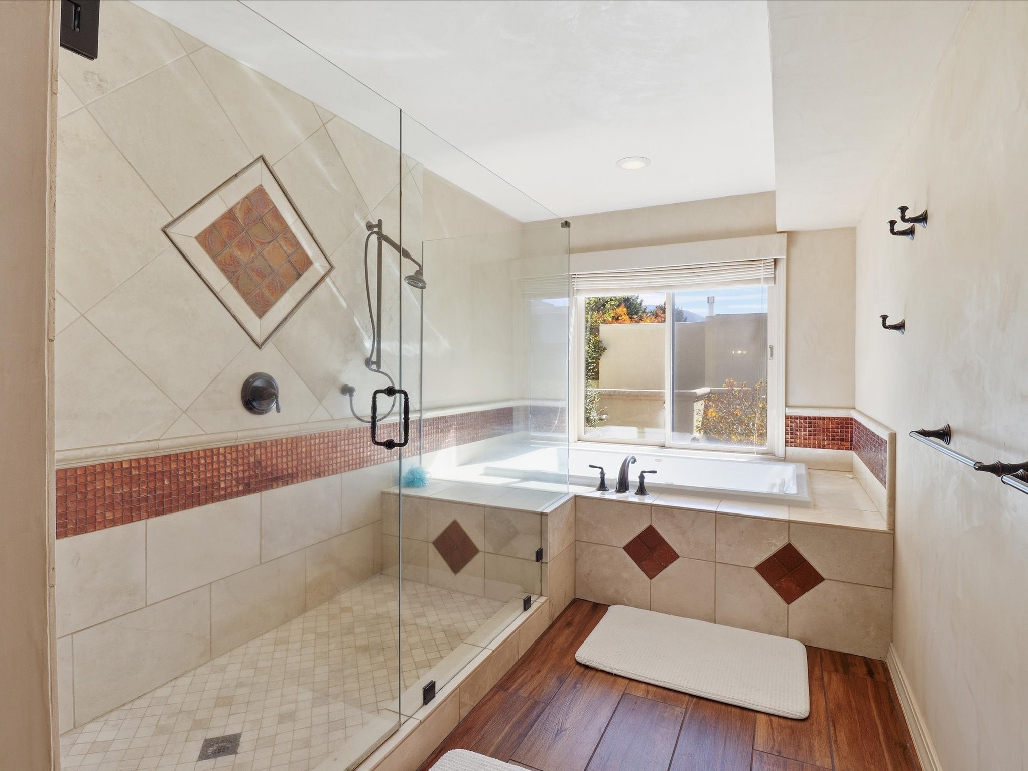 Nestled on one of Tanoan's beautiful tree lined streets, this stunning home sits nearby a cul-de-sac and within walking distance of the country club. This updated home has exquisite attention to detail, showcasing high-end finishes throughout, including Venetian plaster walls, hand-chiseled stone and hardwood floors. Upon entering the home you will appreciate the high ceilings and many windows that open to the backyard and patio, offering lots of natural light into the home. Downstairs you will find 3 generously sized bedrooms with good separation between them. Off the foyer is the formal dining room and large expansive living room with dry bar nearby. The kitchen will not disappoint, with dual ovens, granite countertops, tile backsplash and undermount lighting, plus an eat-in kitchen area. There is also a room off the back patio that is currently being used as an at home gym. The upper level is dedicated to a private primary suite, featuring a spacious bedroom, a cozy loft sitting area with balcony access, and a luxurious spa-like bath complete with a soaking tub, large shower, sauna, and generous walk-in closet. The landscaped backyard offers a beautiful lawn, multiple covered patios ideal for outdoor living and entertaining, along with a heated pool with automatic cover system. 3 car garage with EV charger, water filtration system and soft water system. Recent seller updates include replacement of a portion of the TPO roof, A/C unit, dishwasher, automated irrigation system and heated pool. Enjoy the tranquility, privacy, and security of Albuquerque's 24/7 guard-gated country club community.