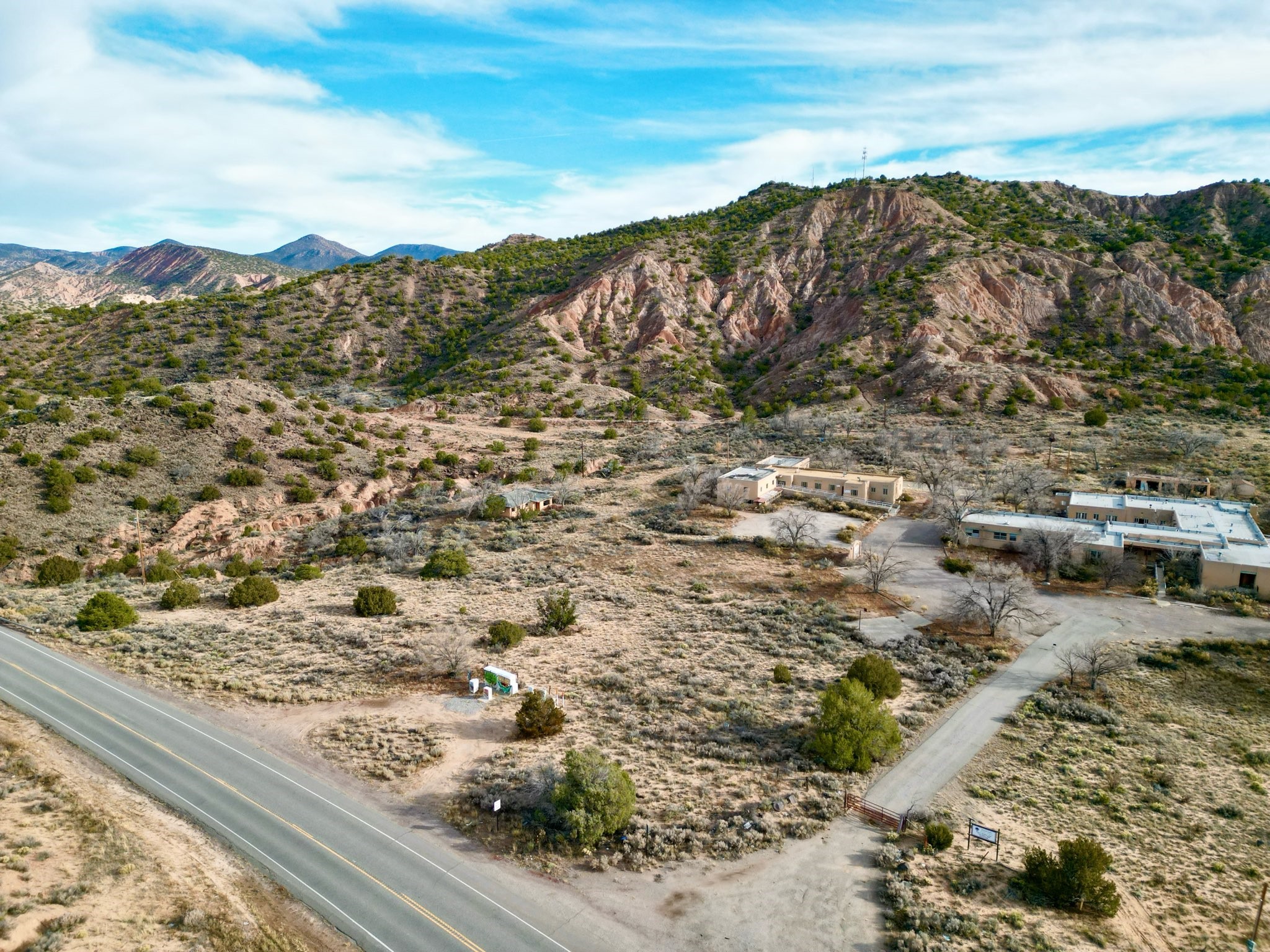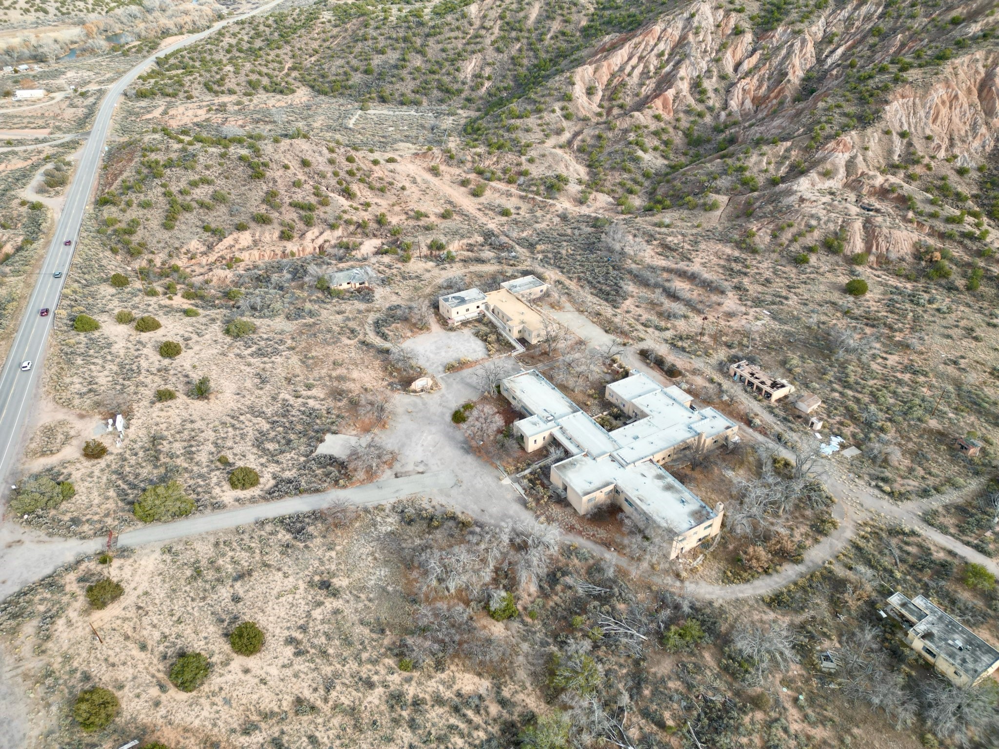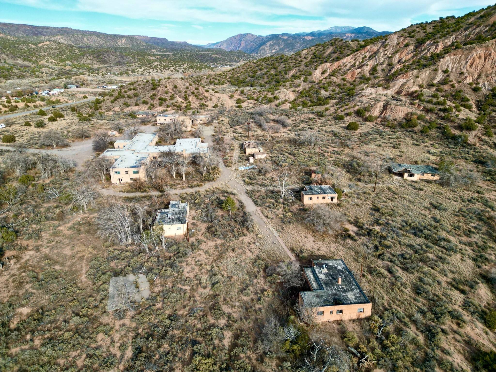 in the heart of the scenic Rio Grande Valley between Taos and Hernandez. Next to the iconic Vivac winery and just down the street from the historic Embudo Station. This section of the river valley is rich with history and culture. This property represents a rare investment opportunity on about 63 acres, featuring multiple structures with significant redevelopment potential. The site includes five detached houses, a former hospital, a clinic, and an old dental office, totaling over 35,000 sq ft of building space. All structures have been unoccupied for some time and require extensive repair or renovation, offering flexibility for residential, commercial, or mixed-use development. The five houses are scattered across the grounds, ideal for rental or live-in spaces once rehabilitated. The hospital and dental office occupy a central location with large floor plans suitable for offices, clinics, or community use. The property includes two wells, power infrastructure and a septic system, plus additional land that could be used for construction, landscaping, or parking. A hold harmless agreement is required prior to viewing. Sold As-Is.