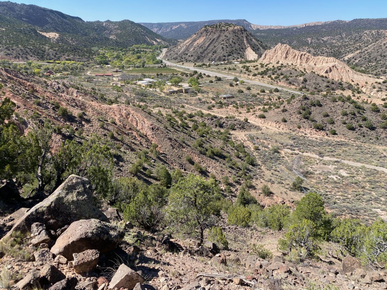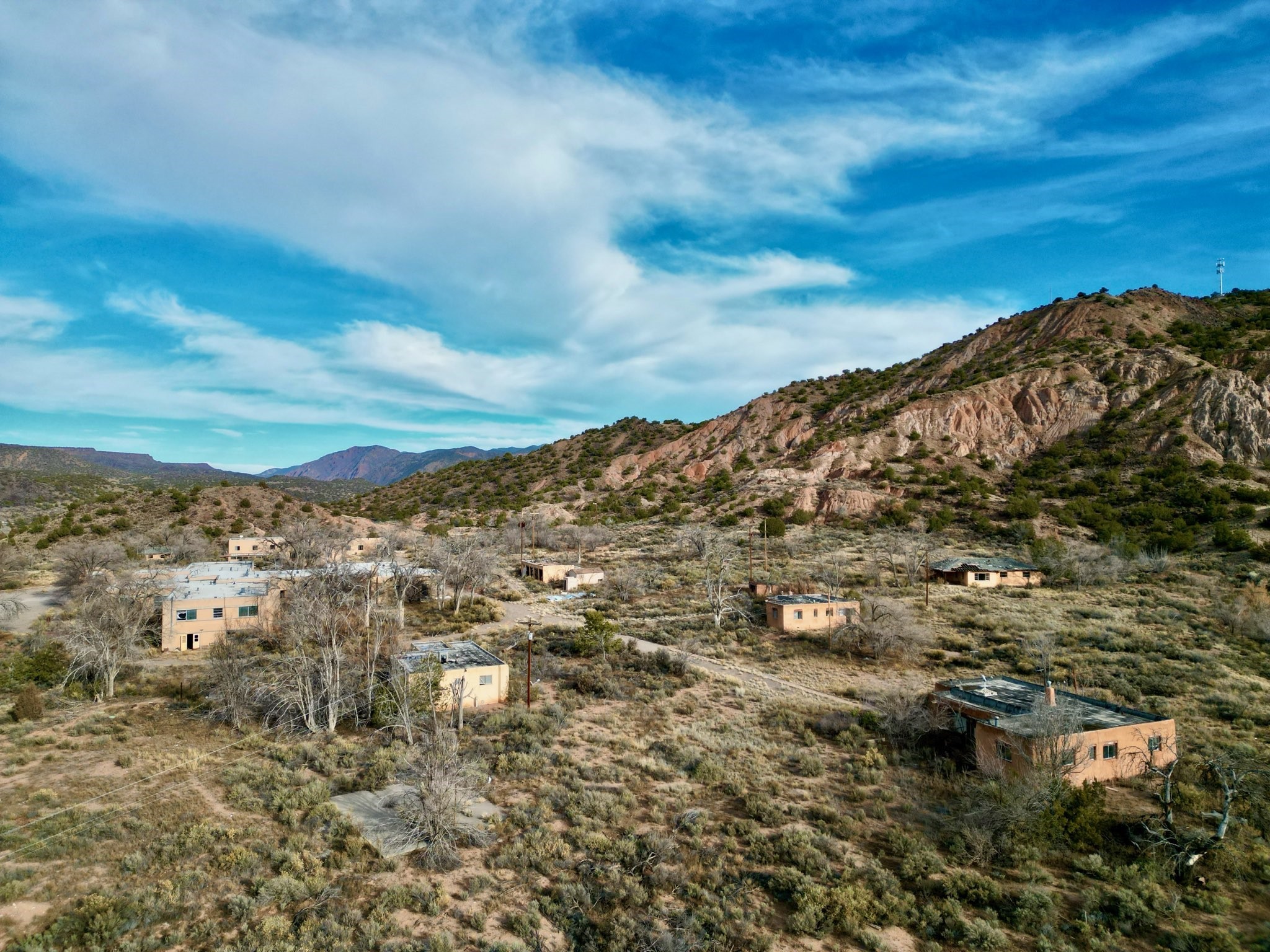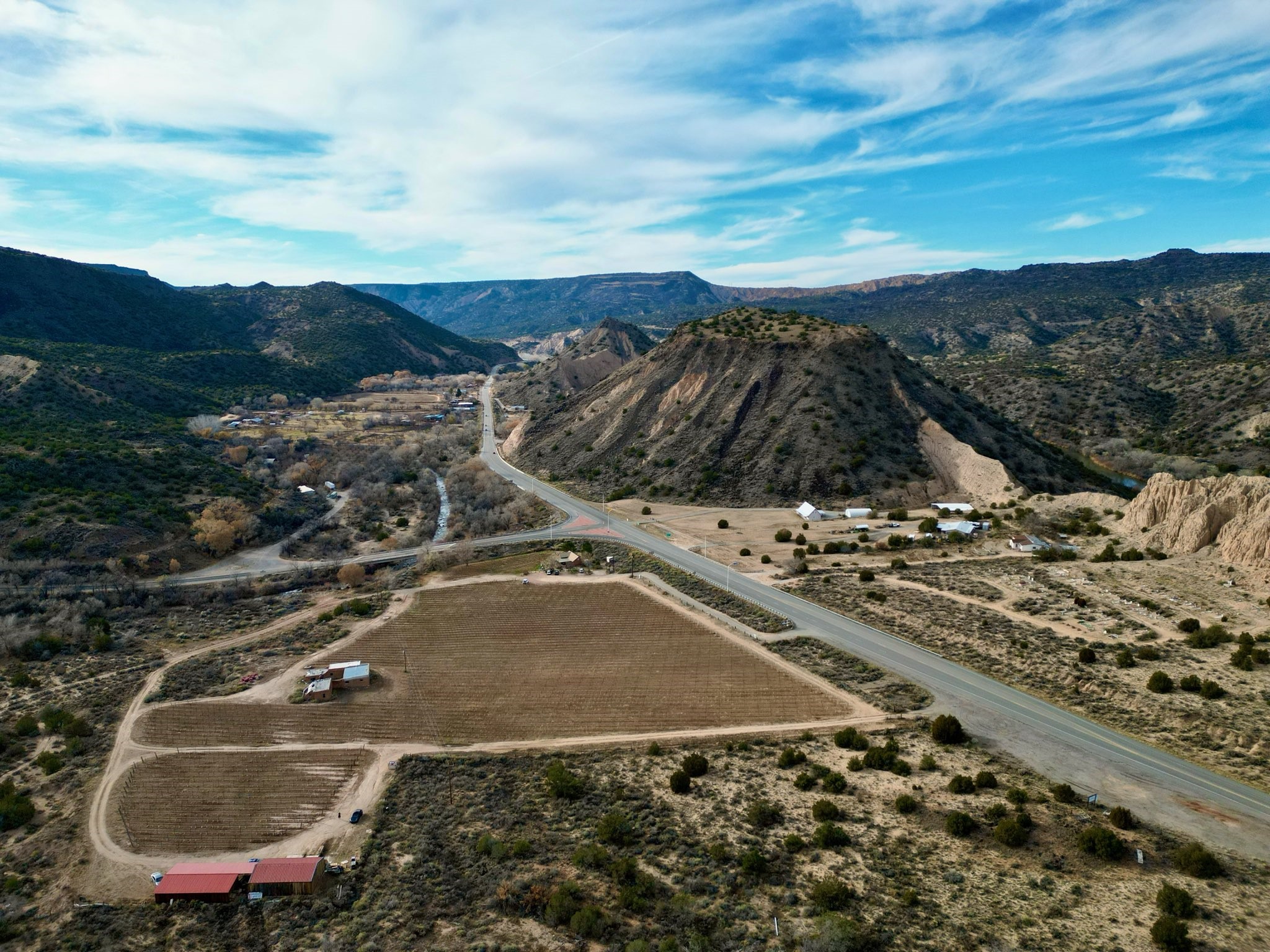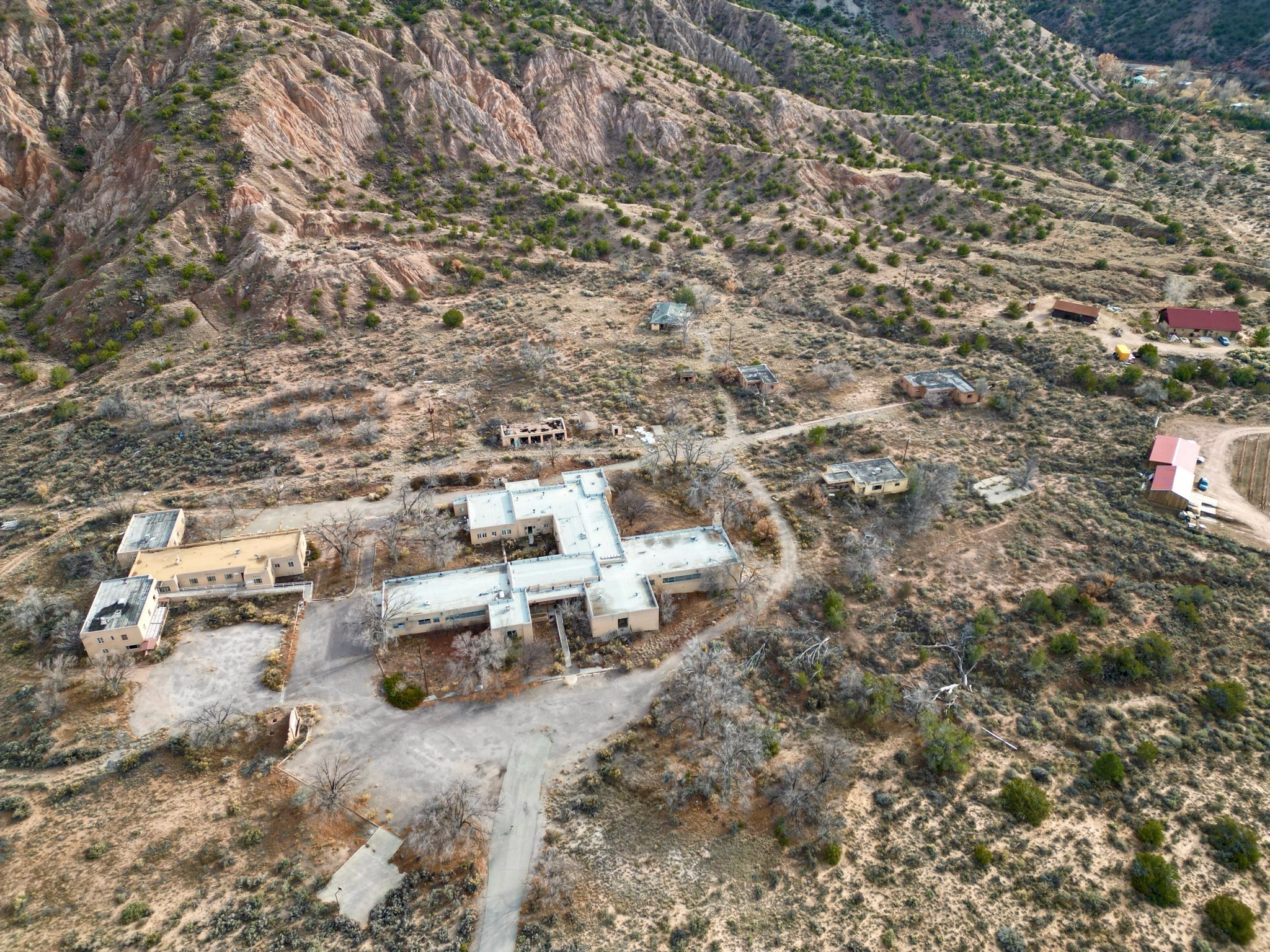 in the heart of the scenic Rio Grande Valley between Taos and Hernandez. Next to the iconic Vivac winery and just down the street from the historic Embudo Station. This section of the river valley is rich with history and culture. This property represents a rare investment opportunity on about 63 acres, featuring multiple structures with significant redevelopment potential. The site includes five detached houses, a former hospital, a clinic, and an old dental office, totaling over 35,000 sq ft of building space. All structures have been unoccupied for some time and require extensive repair or renovation, offering flexibility for residential, commercial, or mixed-use development. The five houses are scattered across the grounds, ideal for rental or live-in spaces once rehabilitated. The hospital and dental office occupy a central location with large floor plans suitable for offices, clinics, or community use. The property includes two wells, power infrastructure and a septic system, plus additional land that could be used for construction, landscaping, or parking. A hold harmless agreement is required prior to viewing. Sold As-Is.
