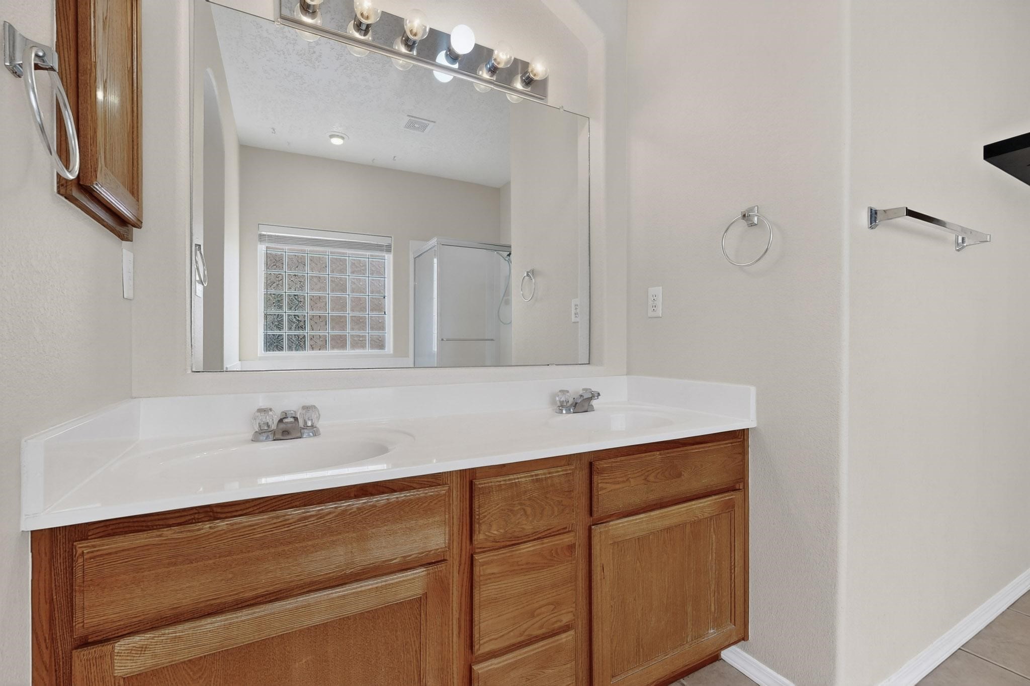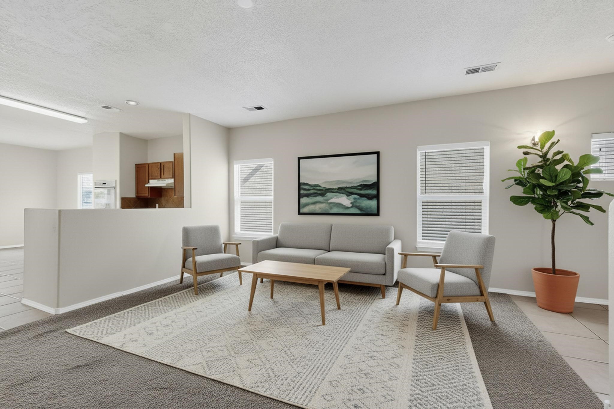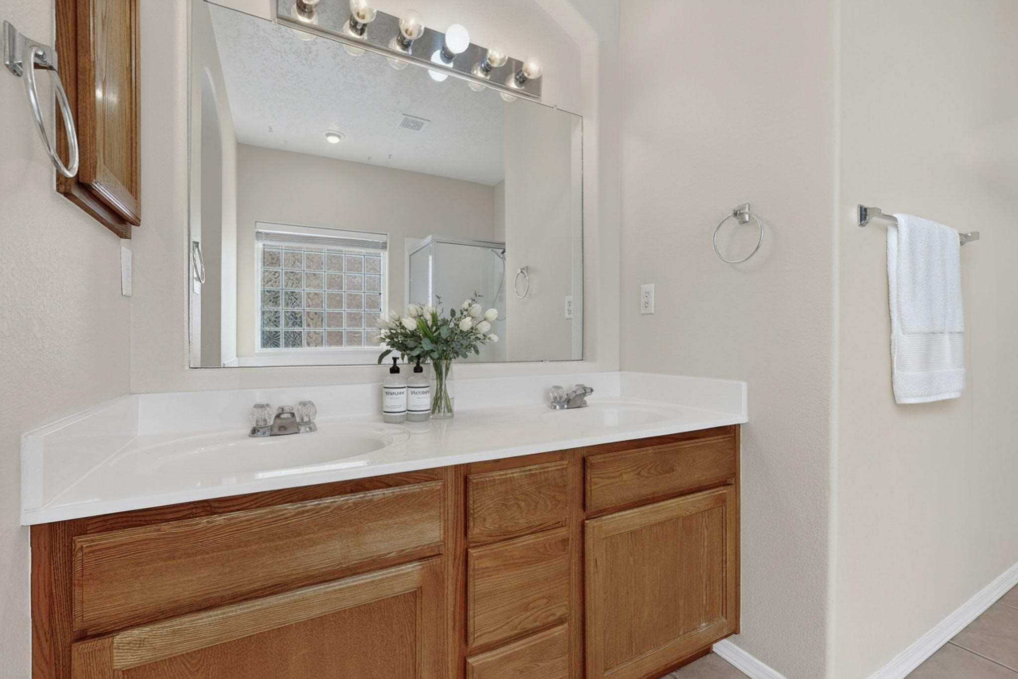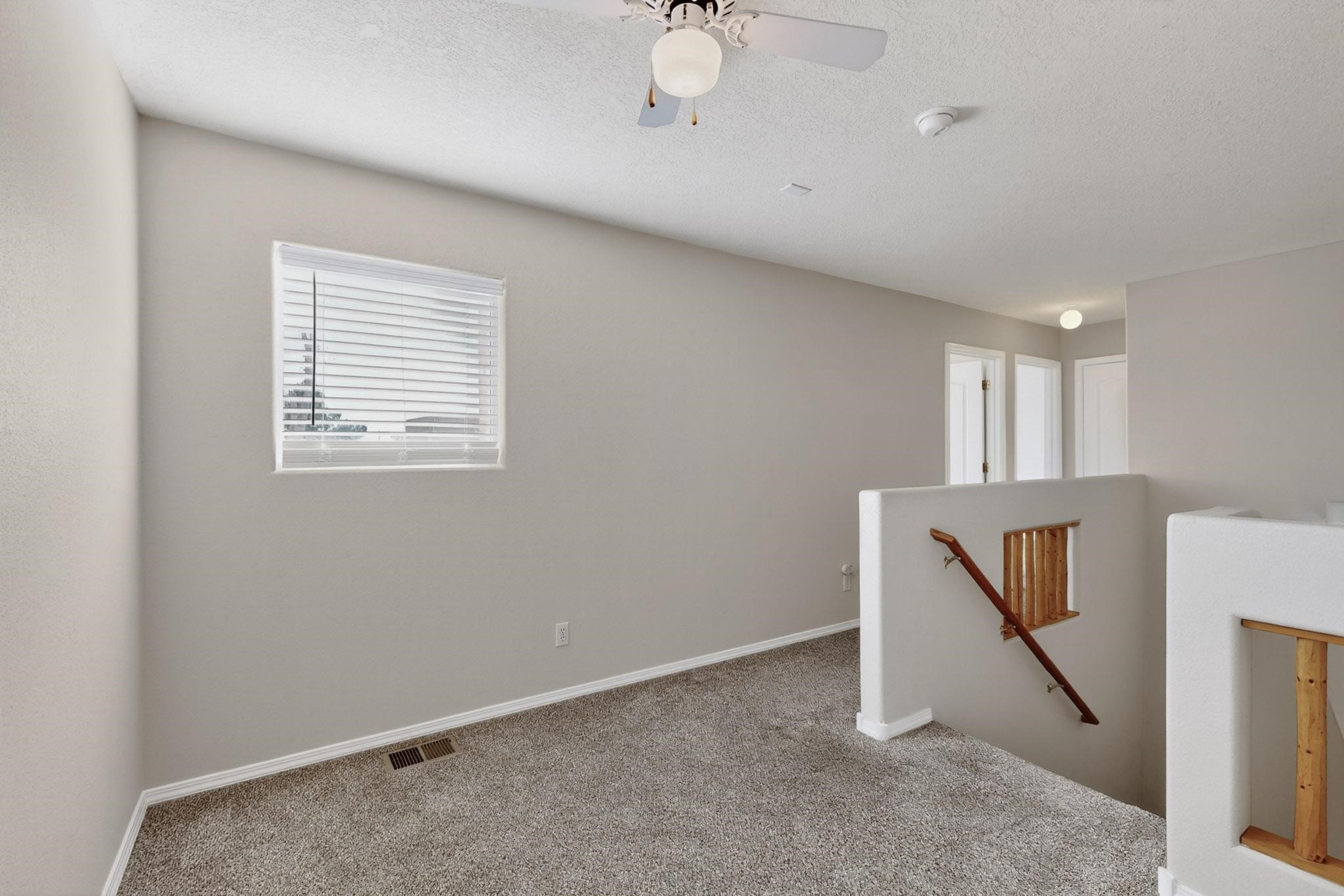 Move-in ready with No HOA in convenient close-in SE Rio Rancho location near Intel. Terrific investment with short-term (STR) or long-term rental potential. Open layout with large living room, dining area and spacious kitchen w/ generous cabinets, tile floor and built-in double ovens. Private primary suite is on the main level and features dual sinks, separate shower & soaking tub and a walk-in closet. Upstairs offers 2 additional sunny bedrooms, a full bath and a versatile loft--perfect for office, gaming or homework zone. Easy-care generous xeriscaped yard, 2-car garage and plentiful driveway parking. Neutral interior palette, great natural light, and easy access to Rio Rancho schools, shopping & dining. Great floorplan for multi-gen, roommates, work-from-home or lock-and-leave living!