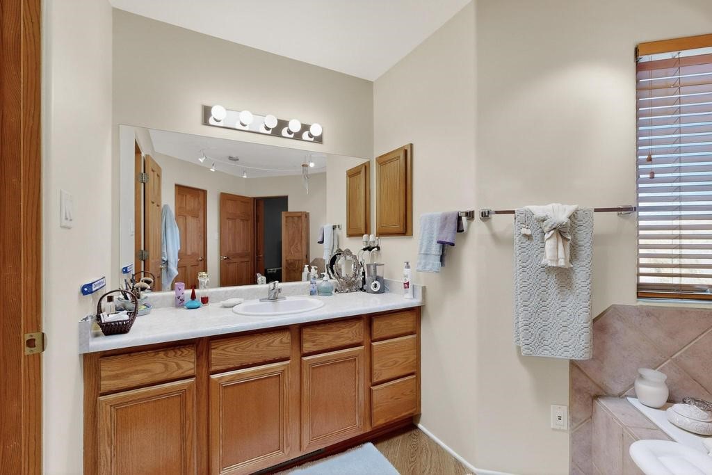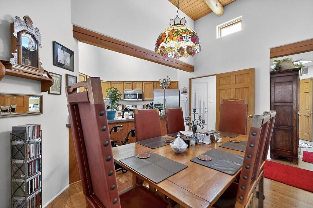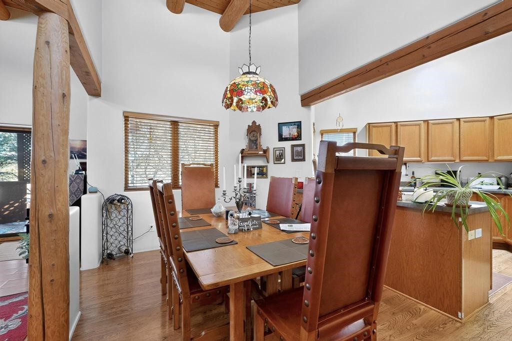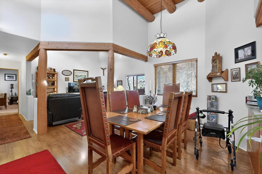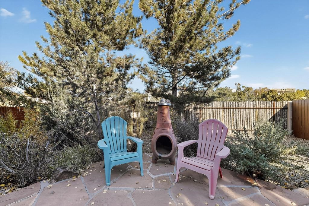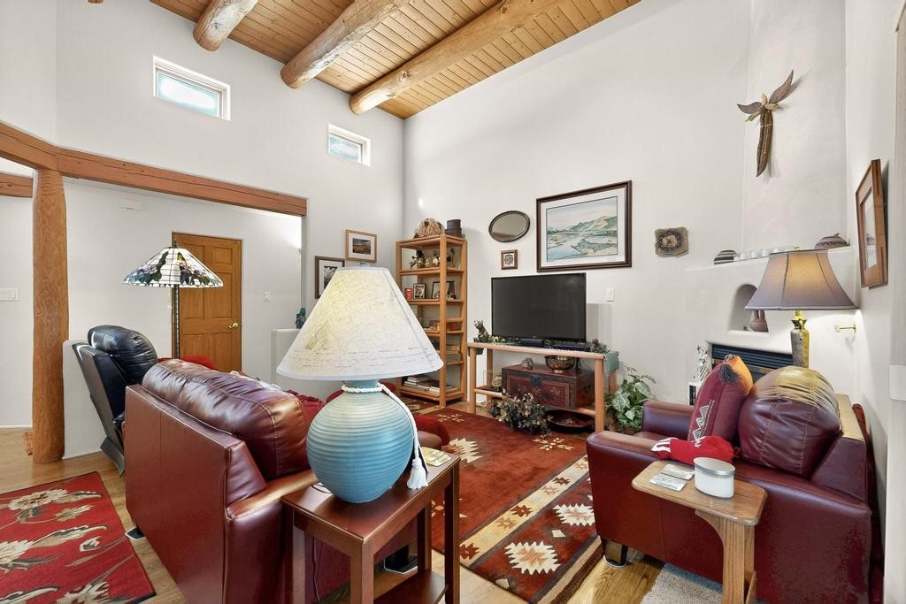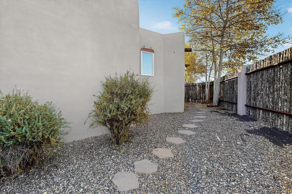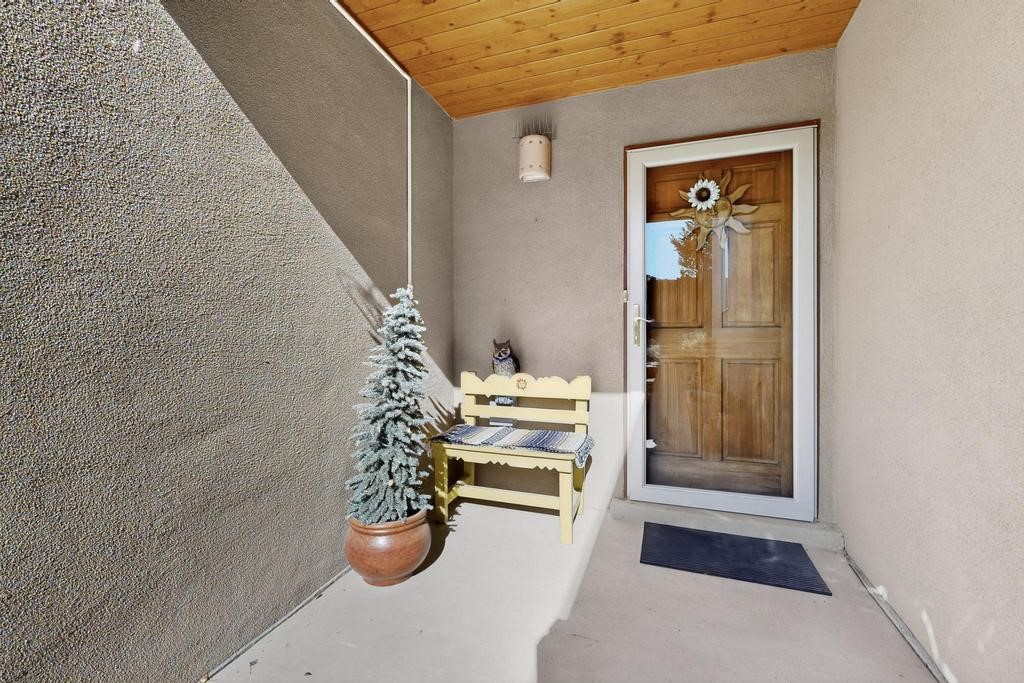 Don't miss this charming single-level home in Pueblos del Sol featuring three bedrooms and two bathrooms. This residence showcases classic Santa Fe details such as Vigas and a cozy Kiva fireplace. Lots of natural light streaming in from five skylights throughout the home. The open floor plan provides great flow and comfortable bedroom separation, while the spacious deck with a solid portal--accessible from both the living room and primary bedroom--offers the perfect place to relax and enjoy the beautiful mountain views. York Central air conditioning and a two-car garage complete this wonderful Santa Fe home. Additionally, the raised subfloor design allows for easy access to plumbing for repairs or modifications. Situated on a large, beautifully landscaped corner lot with native plants and an apricot tree, the property backs onto a greenbelt for added privacy. Recent updates include a finished garage with a new door (2016), a new TPO roof (2021), new coyote and dog-eared fencing (2021), stucco patched and stained (2025), a new hot water heater (2025), and a new sump pump (2023). We invite you to come take a look at this wonderful property.