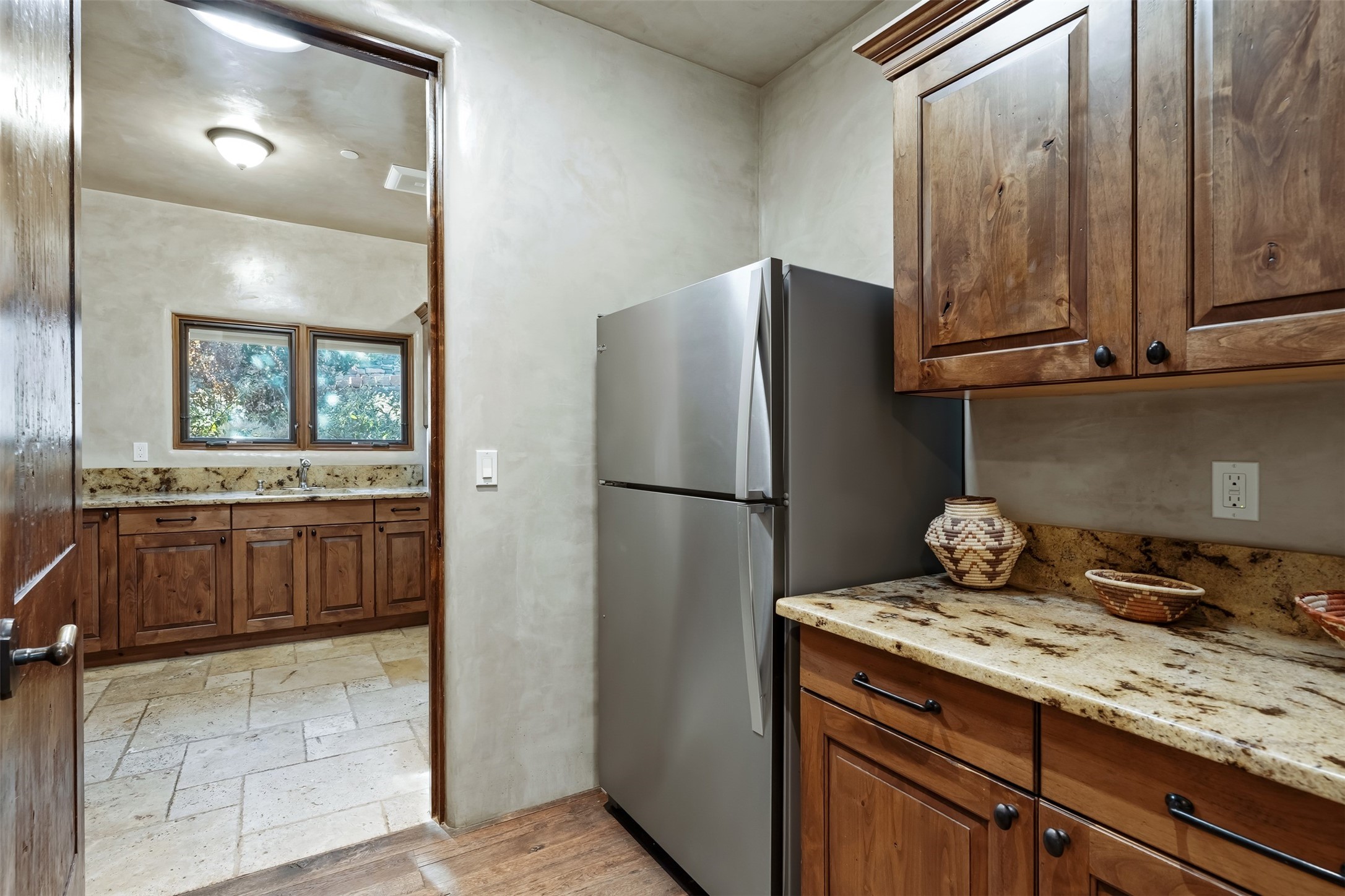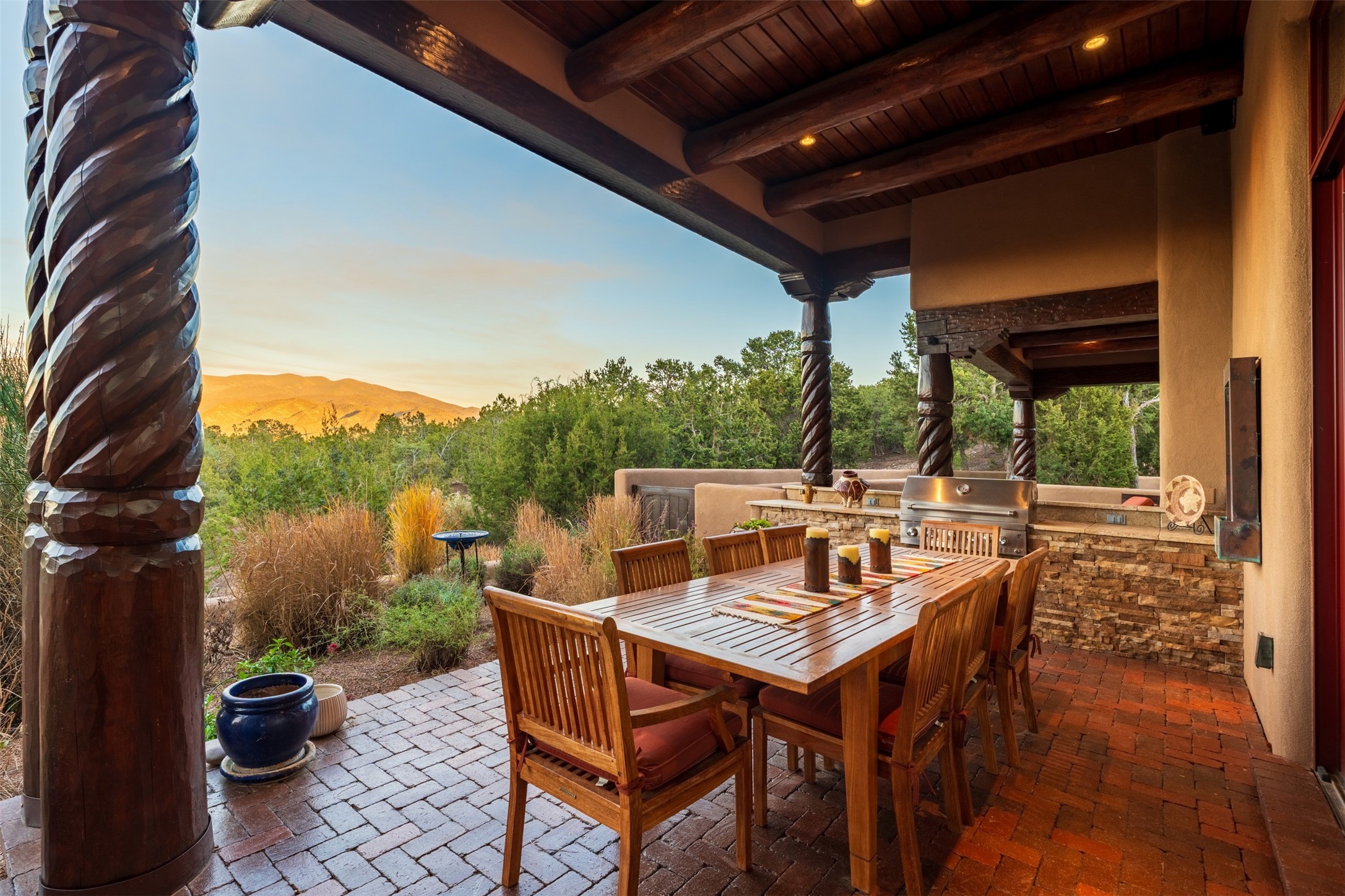 Perched on a private hillside in the prestigious Monte Sereno community, this exceptional custom home, designed by renowned architect Joe Boyden, offers a seamless blend of timeless elegance and modern Southwestern luxury. Built in 2014 and meticulously maintained, the home invites you into a world where architectural artistry meets sweeping natural beauty.From the moment you enter, you're greeted by jaw-dropping views of the Sangre de Cristo Mountains, framed by grand glass doors and expansive portals that blur the line between indoor and outdoor living. The dramatic great room, with soaring ceilings accented by massive hand-carved vigas and rich plaster walls, sets the tone for the home's artful blend of authenticity and sophistication.With 3 spacious bedrooms, a flexible office or 4th bedroom, and 4 luxurious bathrooms, the home offers both intimacy and space. The heart of the home is the gourmet kitchen, complete with two striking granite islands, high-end stainless appliances, a generous butler's pantry, and artisan cabinetry. An entertainer's dream, the kitchen flows into the great room and out to the covered patio with a kiva fireplace, perfect for al fresco dining under New Mexico's vast skies.Outside, lush native landscaping and a professionally installed drip irrigation system complement the natural terrain, while multiple outdoor living areas invite you to relax and take in the sunset, stars, and ever-changing light of the high desert.Tucked just minutes from downtown Santa Fe and the acclaimed Santa Fe Opera, this home offers the serenity of Monte Sereno living with the cultural heartbeat of the city just moments away.Experience the very best of Santa Fe--privacy, luxury, and panoramic beauty--all in one extraordinary residence.