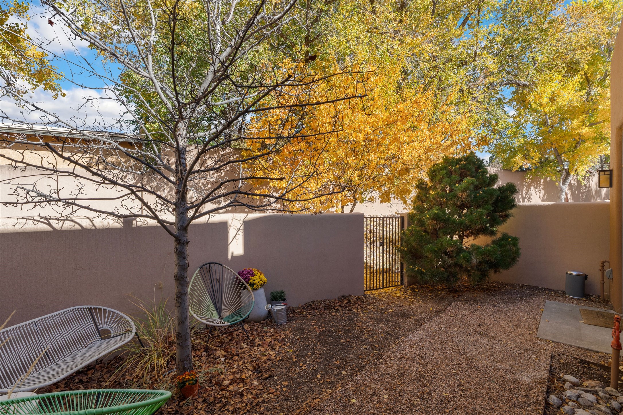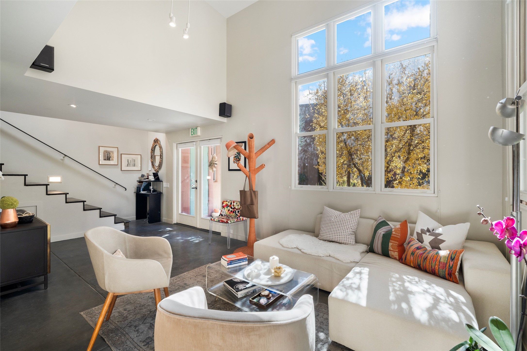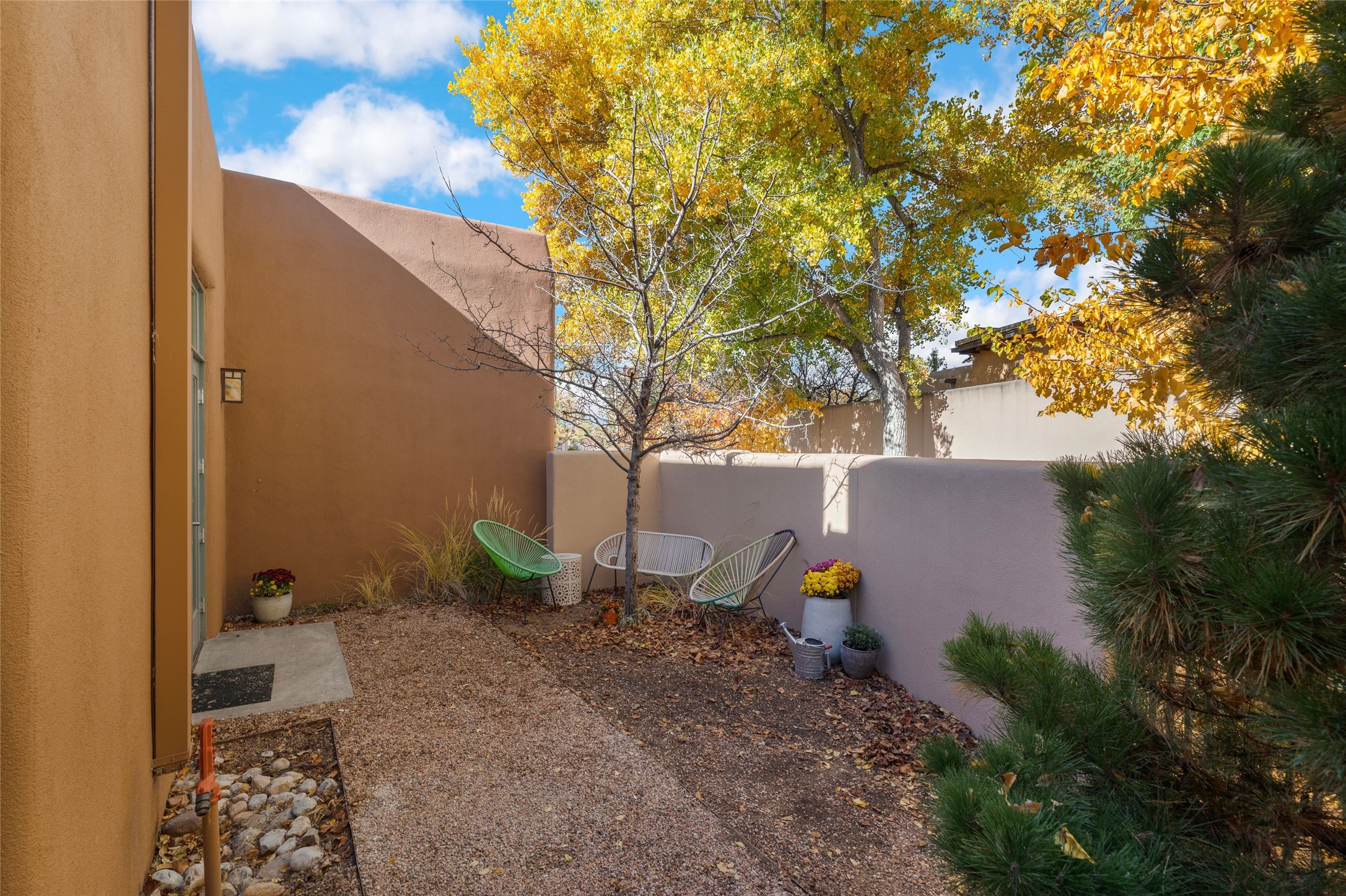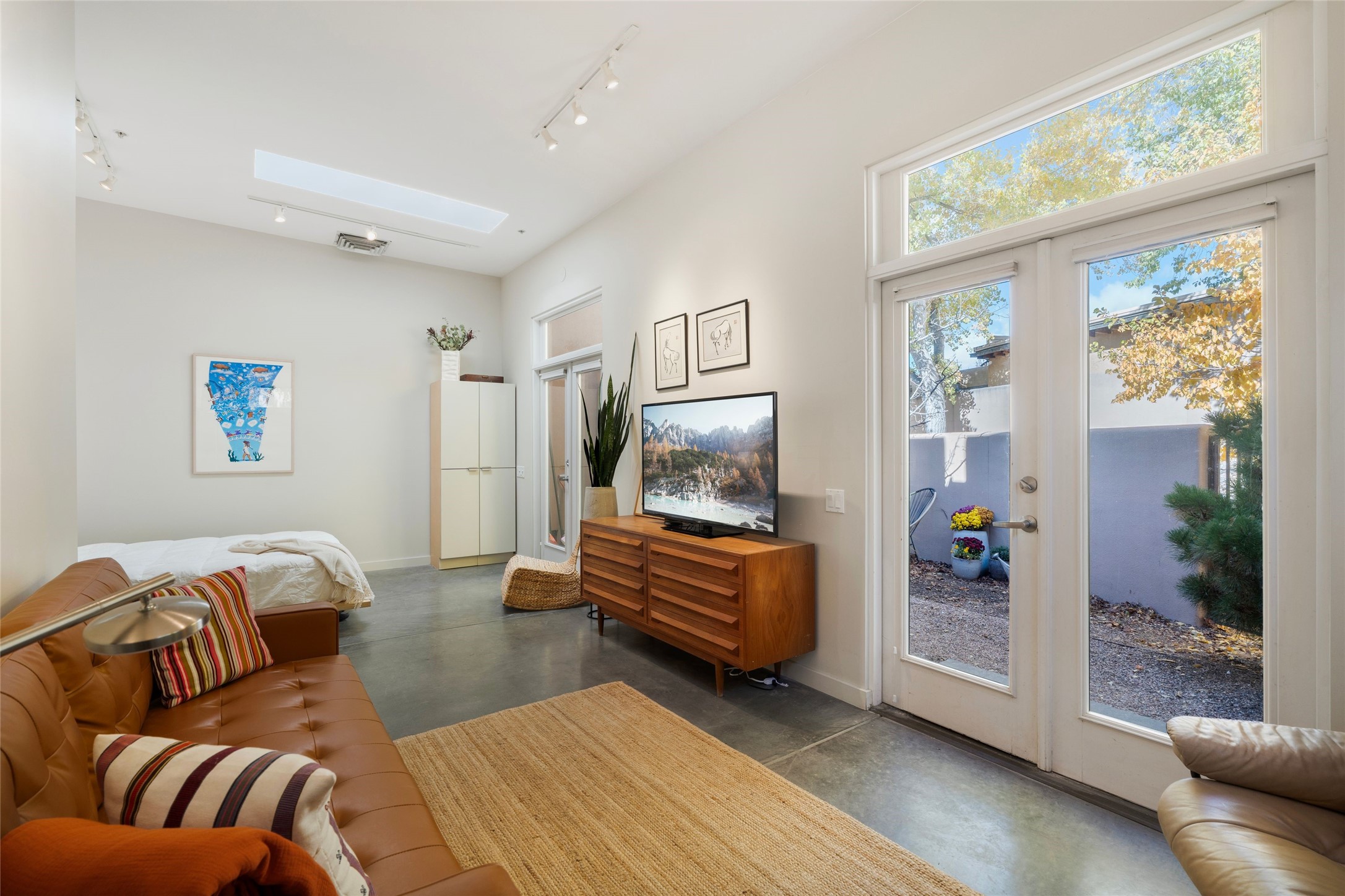Set within the tranquil, landscaped interior of the Marquez Lofts complex, this bright, stylish condo--with no unit above it--has a desirable ground-floor entrance and rare, private back courtyard. The kitchen is creatively divided into two areas. Sink and storage are tucked tidily into a Butler's Pantry wing while a refrigerator and induction stove run along the wall behind the gorgeous, live edge, cherry and sapele wood dining counter by Boxcar Woody. A gentle flight of steps, with under-stair storage, leads to the sleeping loft. Downstairs, the spacious main bedroom has an ensuite, bath. Two double doors access the walled courtyard, perfect for pets or as an intimate retreat. Alternatively, with its back gate entry, this space could serve clients, leaving the main section for personal use. Graced with character, convenience and contemporary charm, this live-work dwelling favors the needs of creatives, entrepreneurs, and anyone seeking a residential refuge in a prime location by the Railyard, restaurants and shopping.
