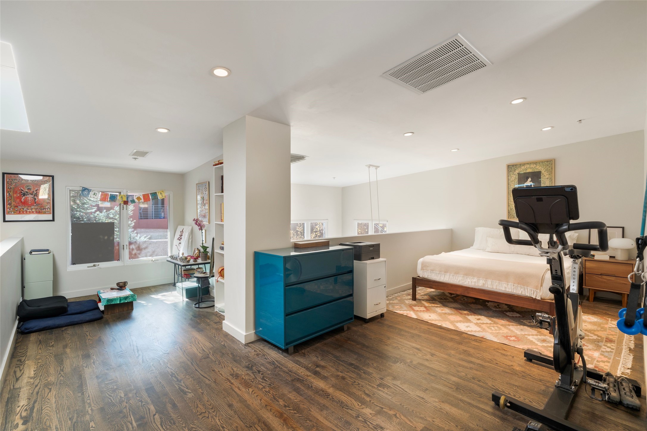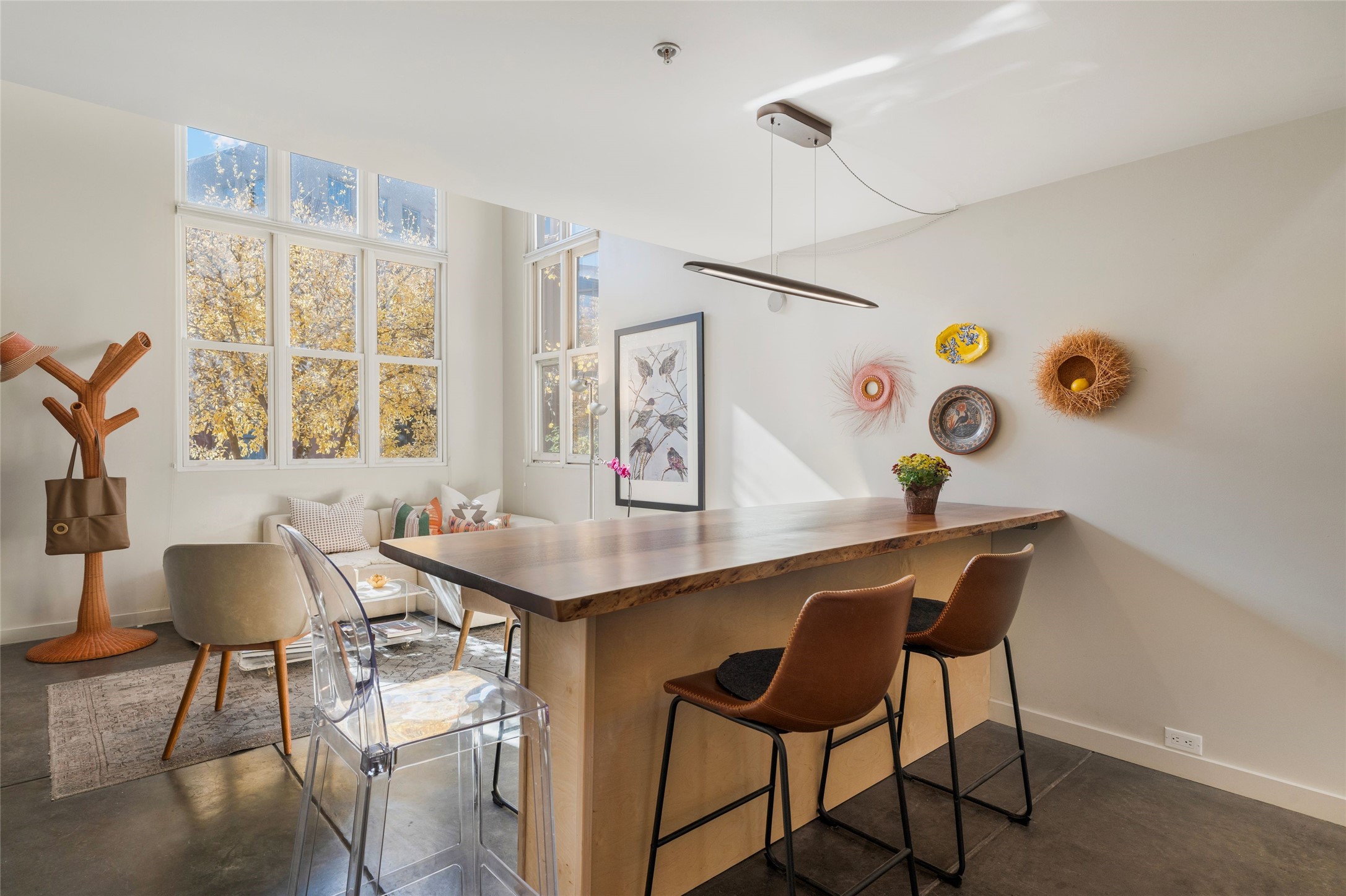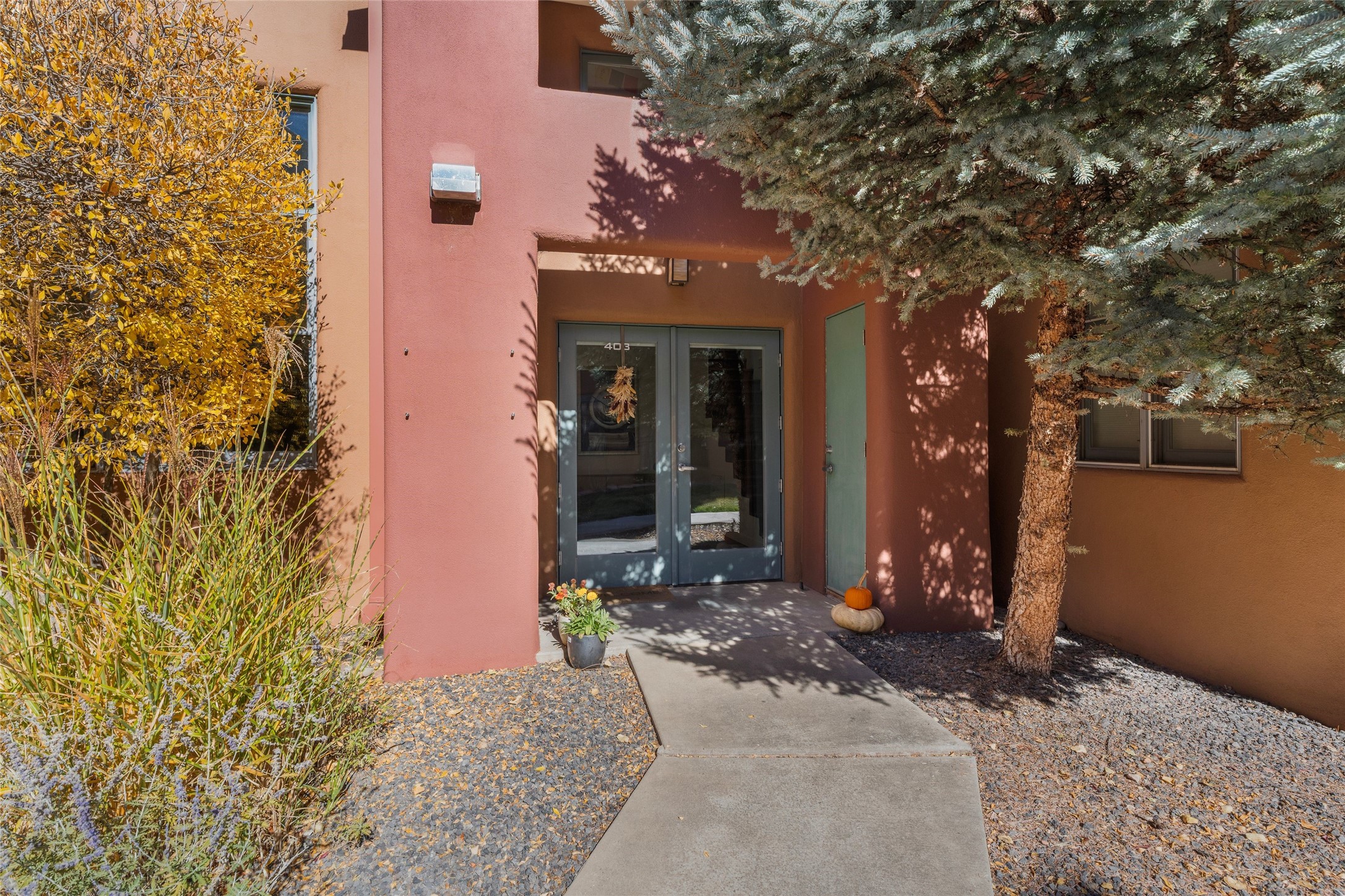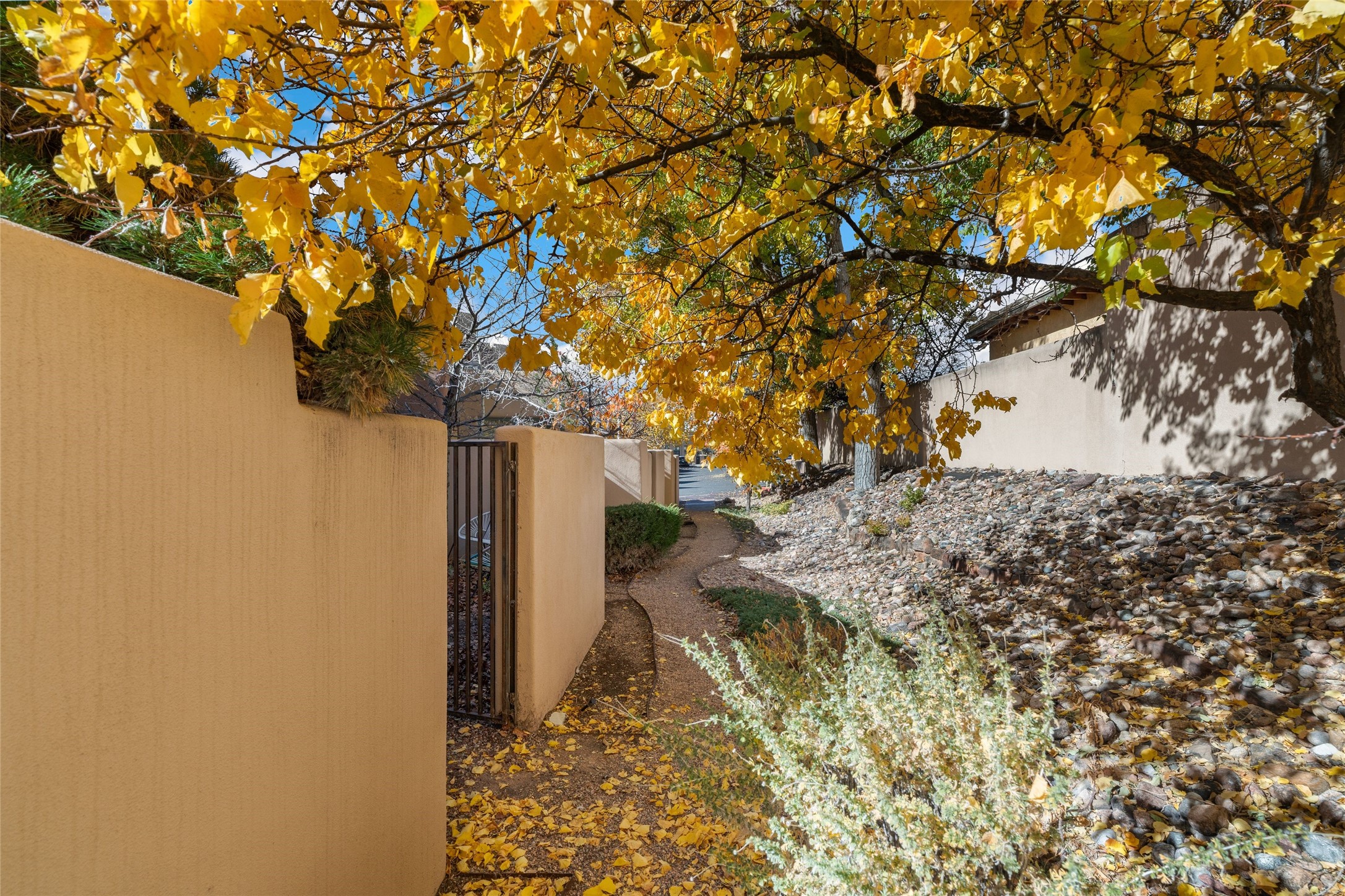 Set within the tranquil, landscaped interior of the Marquez Lofts complex, this bright, stylish condo--with no unit above it--has a desirable ground-floor entrance and rare, private back courtyard. The kitchen is creatively divided into two areas. Sink and storage are tucked tidily into a Butler's Pantry wing while a refrigerator and induction stove run along the wall behind the gorgeous, live edge, cherry and sapele wood dining counter by Boxcar Woody. A gentle flight of steps, with under-stair storage, leads to the sleeping loft. Downstairs, the spacious main bedroom has an ensuite, bath. Two double doors access the walled courtyard, perfect for pets or as an intimate retreat. Alternatively, with its back gate entry, this space could serve clients, leaving the main section for personal use. Graced with character, convenience and contemporary charm, this live-work dwelling favors the needs of creatives, entrepreneurs, and anyone seeking a residential refuge in a prime location by the Railyard, restaurants and shopping.