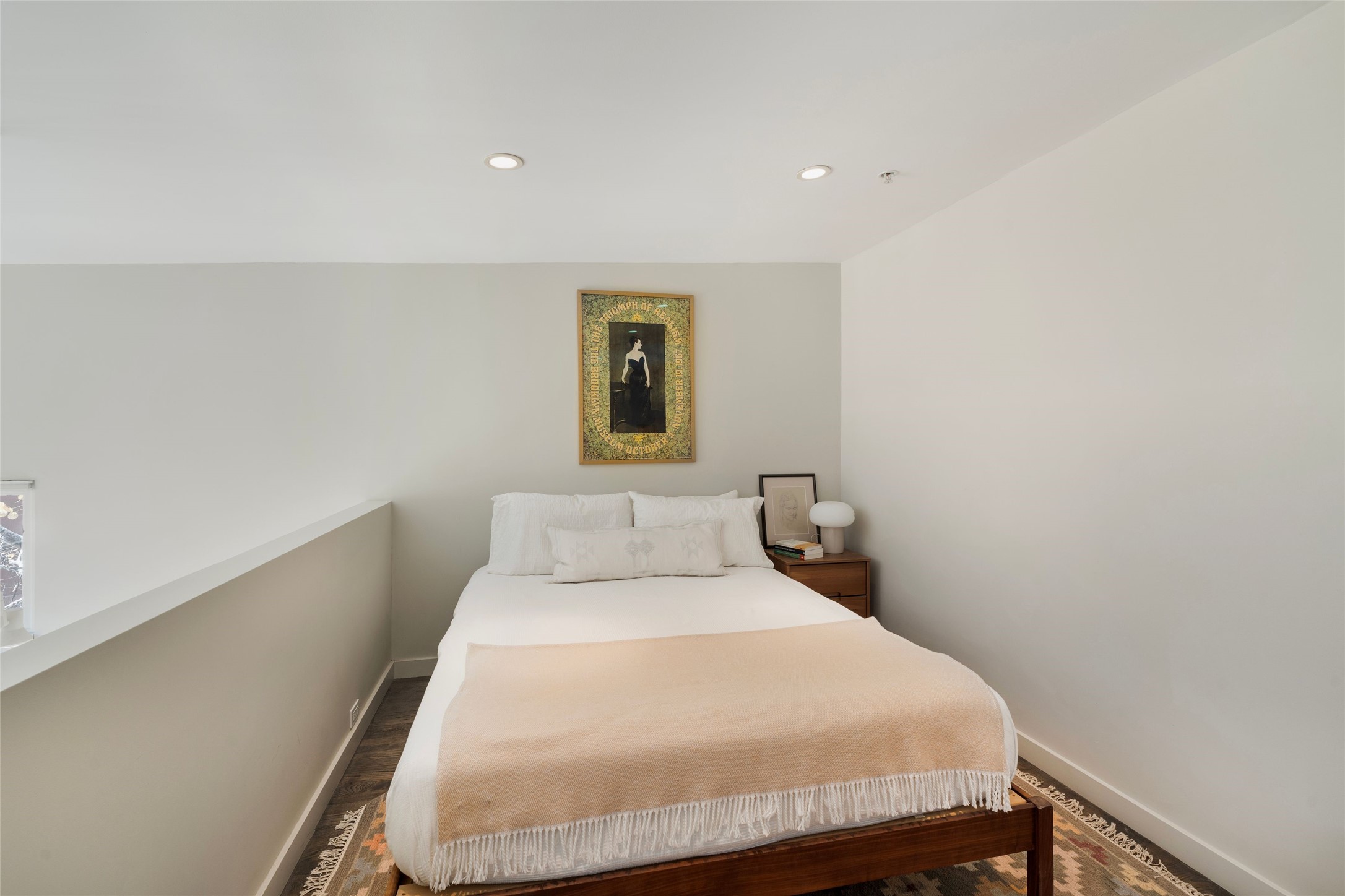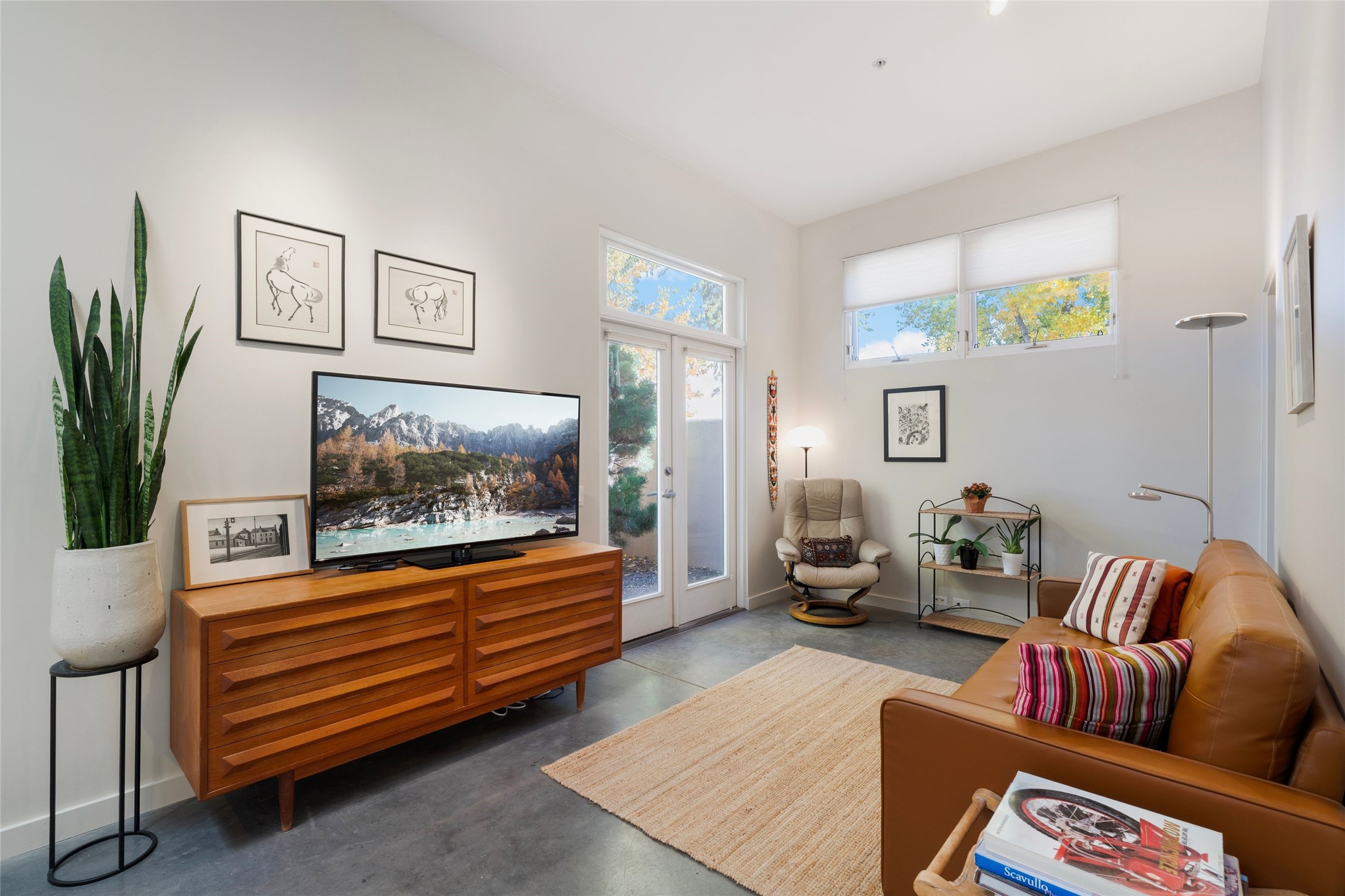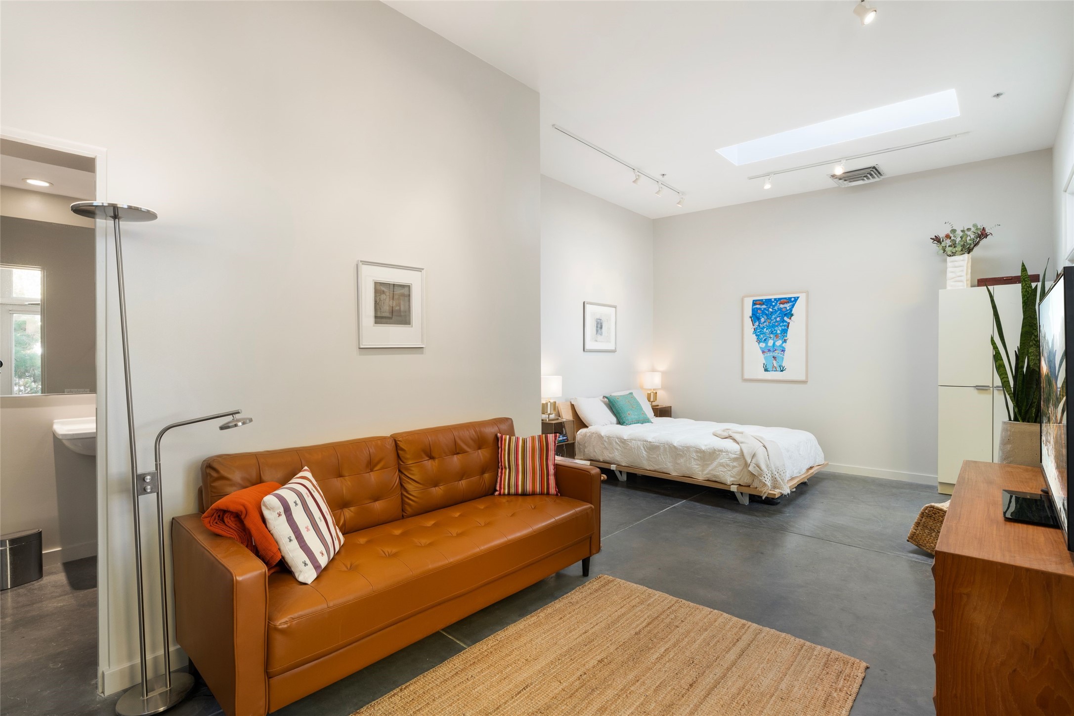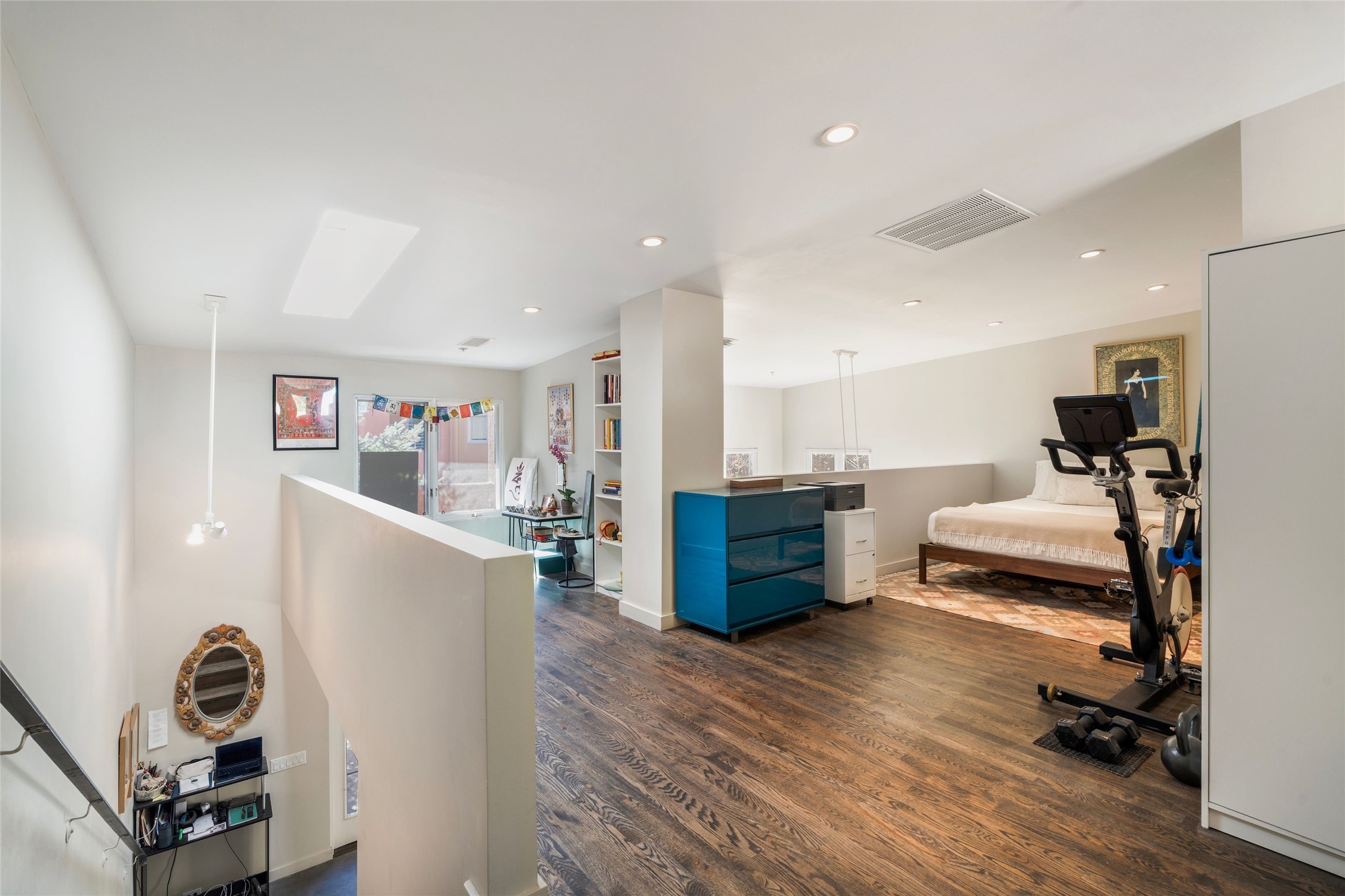 Set within the tranquil, landscaped interior of the Marquez Lofts complex, this bright, stylish condo--with no unit above it--has a desirable ground-floor entrance and rare, private back courtyard. The kitchen is creatively divided into two areas. Sink and storage are tucked tidily into a Butler's Pantry wing while a refrigerator and induction stove run along the wall behind the gorgeous, live edge, cherry and sapele wood dining counter by Boxcar Woody. A gentle flight of steps, with under-stair storage, leads to the sleeping loft. Downstairs, the spacious main bedroom has an ensuite, bath. Two double doors access the walled courtyard, perfect for pets or as an intimate retreat. Alternatively, with its back gate entry, this space could serve clients, leaving the main section for personal use. Graced with character, convenience and contemporary charm, this live-work dwelling favors the needs of creatives, entrepreneurs, and anyone seeking a residential refuge in a prime location by the Railyard, restaurants and shopping.