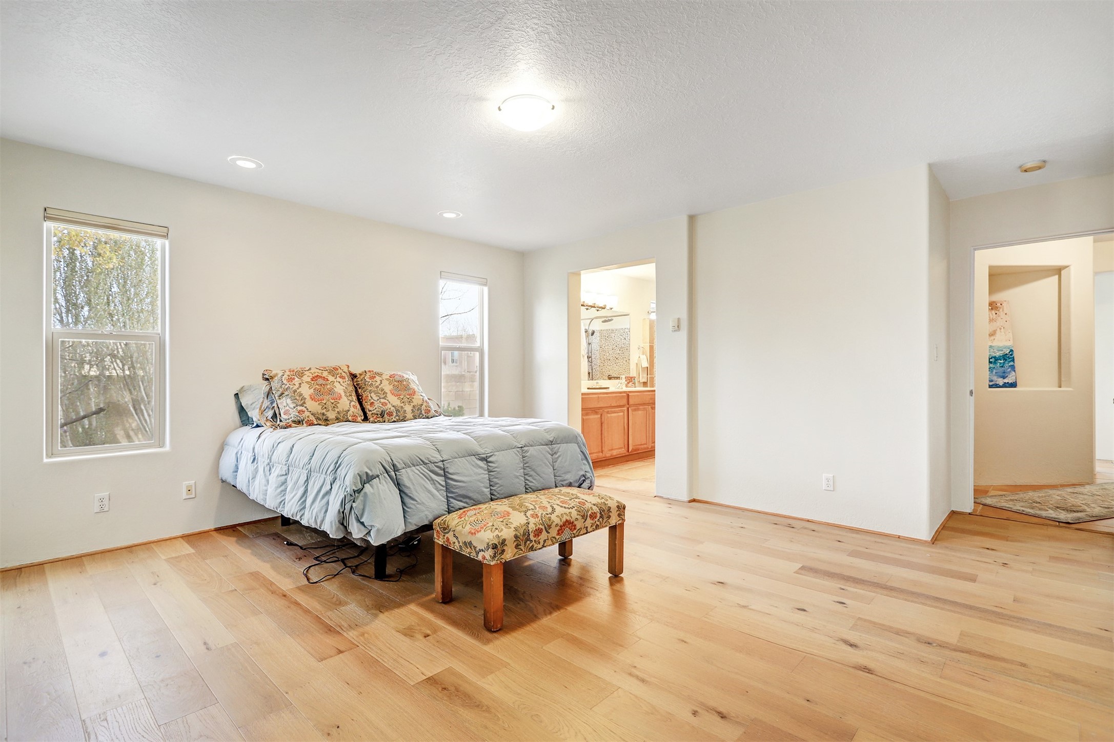Marvelous Open Flowing One-Level Floorplan with Abundant Natural Light! Spacious Great Room with Kiva-style Gas FP Welcomes you Home! Fabulous Sunny Kitchen for the Chef! Tile Counters & Backsplash! SS Appliances-Gas Range/DW/Refrigerator! Double Door Large Pantry closet! Freestanding Butcher Block Island! Glass Patio Doors flow into the Spacious Yard with a Covered Portal for Dining Al Fresco! View is of a small grassy park! The Dining Room was designed as a Flexible Space. Would you prefer an Artist Studio? Or a 4th Bedroom? Or possibly a Home Office? Great Space to create whatever you desire! The Owner's Suite has plenty of room, measuring 15'7" X 14 7" and boasts a 2024 remodeled bath, complete with an oversized Custom Tile Shower with a Pebble floor and Raindrop Shower Head! Large Walk-In Closet!Tens of thousands $$$$$ in Recent Upgrades and Updates! 2024 Gorgeous Engineered Hardwood Flooring in All Bedrooms + Flex Space!Fresh Decorator Paint! Brand New Designer Lighting! Fabulous Remodeled Owners Bath! Water Heater replaced 2024! No carpet! Tile Flooring in the Kitchen and Baths! This Fantastic Home Lives Larger than the actual footage! The Home was built on A PREMIUM LOT, adjacent to a Small Park, offering a green, open space view and a sense of Privacy! A larger park with a playground is nearby! 2 Car Garage, accessed at the rear of the home. The In-Floor Radiant Heat Boiler was replaced in 2019, as indicated by the Approved Tag on the boiler! 3 or 4 Bedroom with Flexible Design! Rancho Viejo is a Master Planned Community with numerous Parks and Miles of Trails to enjoy the NM Sunshine! Ideally located at the South End of Santa Fe with easy access to the Santa Fe Community College, Schools, and Restaurants! Presbyterian Hospital and Shopping are also nearby! 18 Minutes to the Conde Nast Award Winning Destination Spa-Ojo Santa Fe! Only 22 Minutes to the Santa Fe Plaza! A truly special place to call HOME!