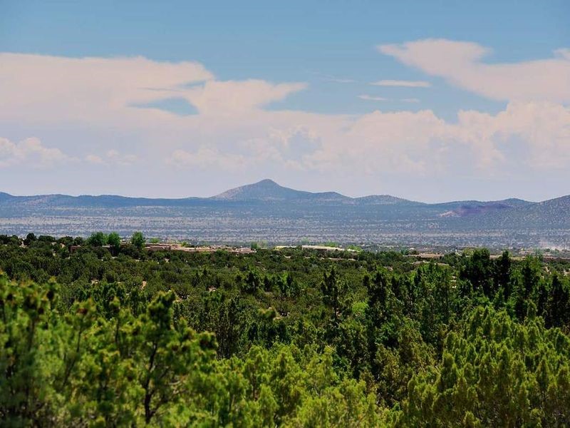 One of the most iconic homes in all of Santa Fe, this Robert Ritter-built house and guest house, exemplifies the ultimate Santa Fe and Las Campanas lifestyle with spectacular lush landscape and fountains, Jemez Mountain, Sangre de Cristo Mountain and sunset views, all within minutes to the Plaza and The Club as Las Campanas. Sited on a private, 1.8-acre lot, this distinctive home excites with a flexible floor plan which superbly incorporates a seamless indoor and outdoor living experience, while also providing excellent separation of space, featuring a 650 square foot detached guest house and an attached studio, ideal as an artist studio, home theater or large office. The main house design features include an incredible floor plan, ideal for entertaining and guests, with a stunning formal living room complete with views, a grand fireplace, portal access and a modern chandelier. The updated island kitchen impresses with leathered granite counters, Wolf and Sub-Zero appliances, a walk-in pantry and a built-in Miele coffee maker. Located directly off the kitchen is a breakfast area with a fireplace and a formal dining room, with a curved wall of windows with views of the front courtyard gardens. The spacious primary suite delights with a seating area, a fireplace, courtyard access, and a luxurious spa-like bath with access to the outdoor spa and lounging area. Additional main house features include a secondary primary suite with an ensuite bath, 2 additional guest bedrooms in the main house plus an office, and one of the finest portals in Santa Fe with a 24' wrap around outdoor living area, complete with a built-in Viking BBQ and an outdoor fireplace. The well appointed one bedroom guest house offers a separate entrance, living room, barista area, 3/4 bath and views. Exceptional features include a large 3 car garage, primarily adobe construction, a newly bricked driveway, creamy plaster walls, soft natural light and superior craftsmanship throughout.
