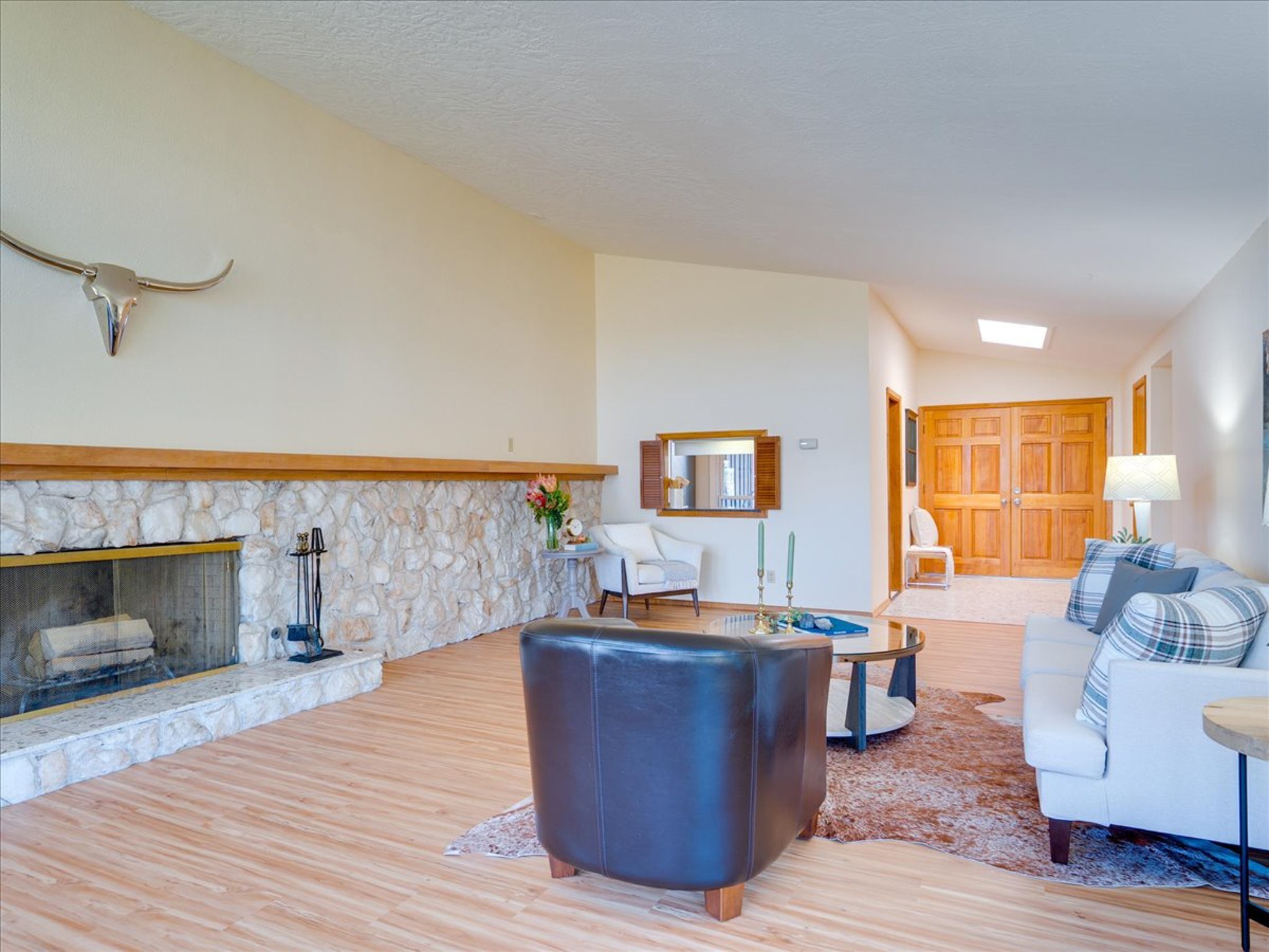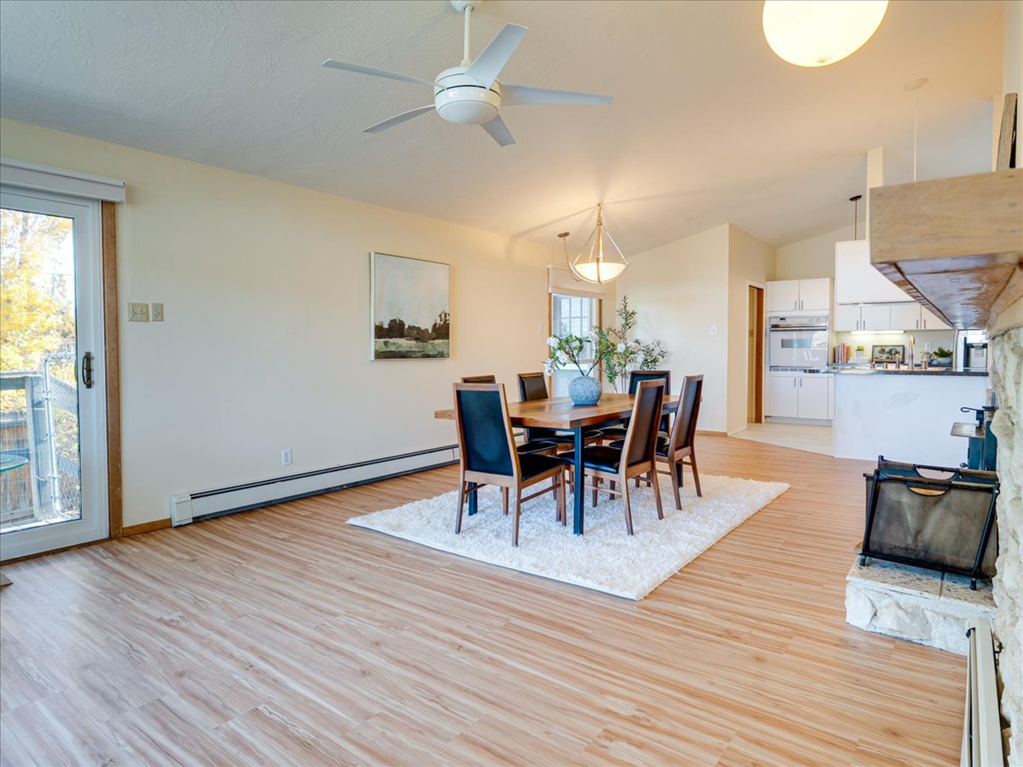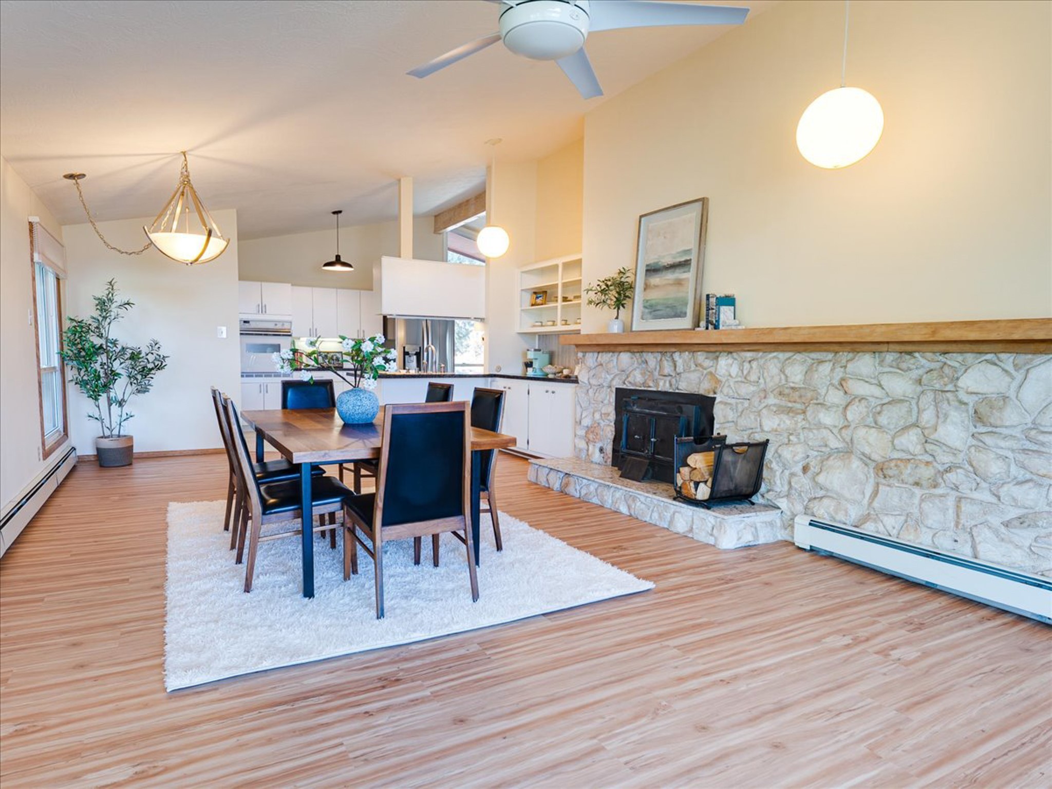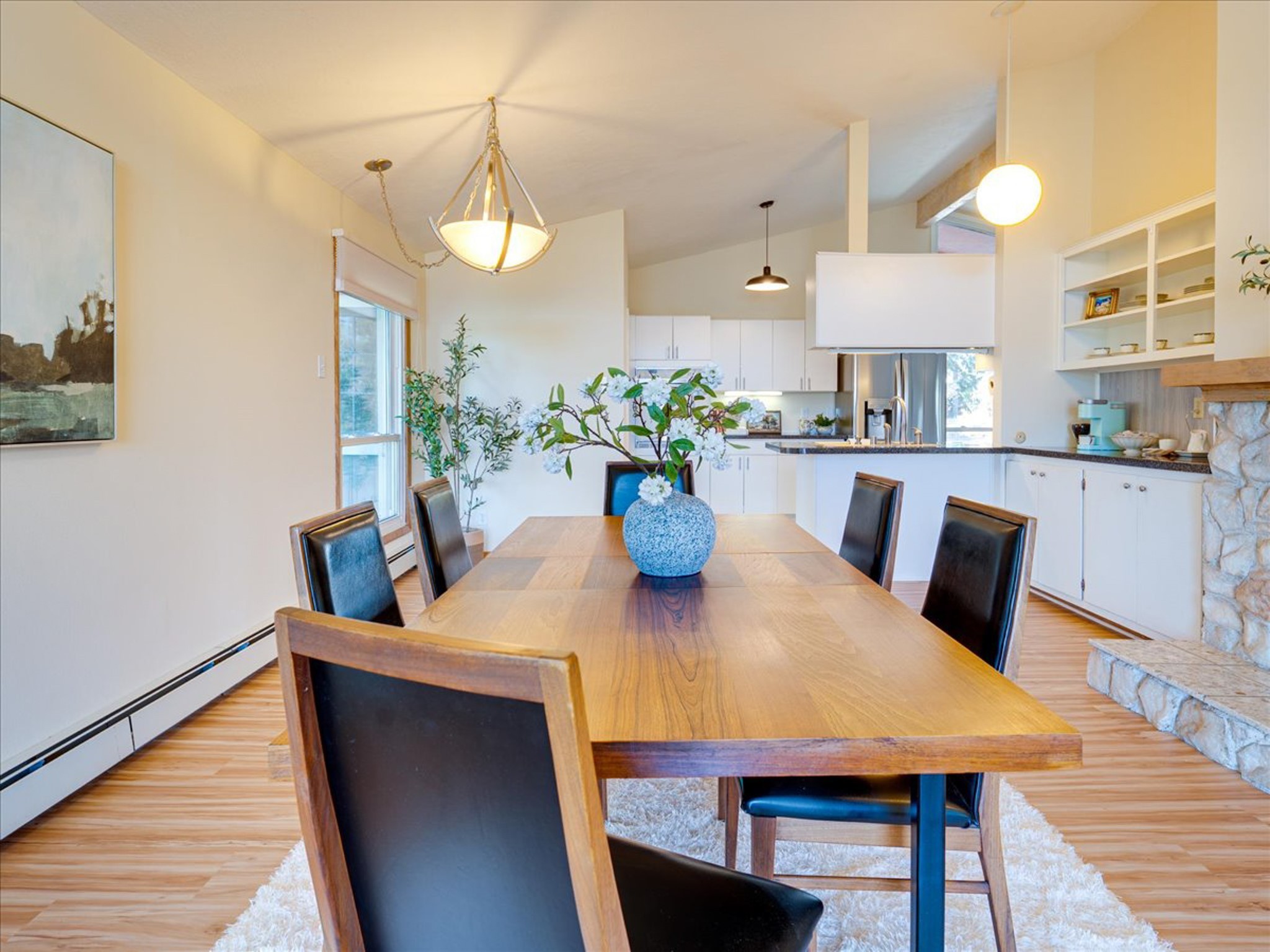 Stunning Barranca Mesa home overlooking Rendija Canyon. Perched on a generous 0.335-acre canyon lot, this property offers the best of both worlds - expansive outdoor space paired with sweeping canyon views. Mature pine trees provide natural beauty, shade, and privacy. Inside, a spacious living room features floor-to-ceiling picture windows and a striking raw-edge quartz fireplace with a wraparound mantle that flows into the dining room, which is large enough to serve as a second living area. The bright white kitchen offers ample room for an eat-in nook, pantry, and the adjacent laundry room provides direct garage access, functioning perfectly as a mudroom or drop zone. The primary suite includes a built-in vanity, a walk-in closet, and large windows facing the canyon. Three additional bedrooms and a guest bath complete the floor plan. From the dining room, step out onto a lovely balcony overlooking the canyon, ideal for morning coffee or evening sunsets. You'll also find a fenced dog run with low-maintenance artificial turf, perfect for pets. Recent updates include a new roof (2024), a new heating system (2025), new flooring (2025), a refrigerator (2025), interior paint (2025), new blinds in the living room, family room, kitchen, and a bedroom (2025), and newer double-pane windows (2005). This is a rare opportunity to own a beautiful home with unmatched canyon views on Barranca Mesa. This one is not to be missed! Schedule a private showing today. Disclosure: Owner Broker