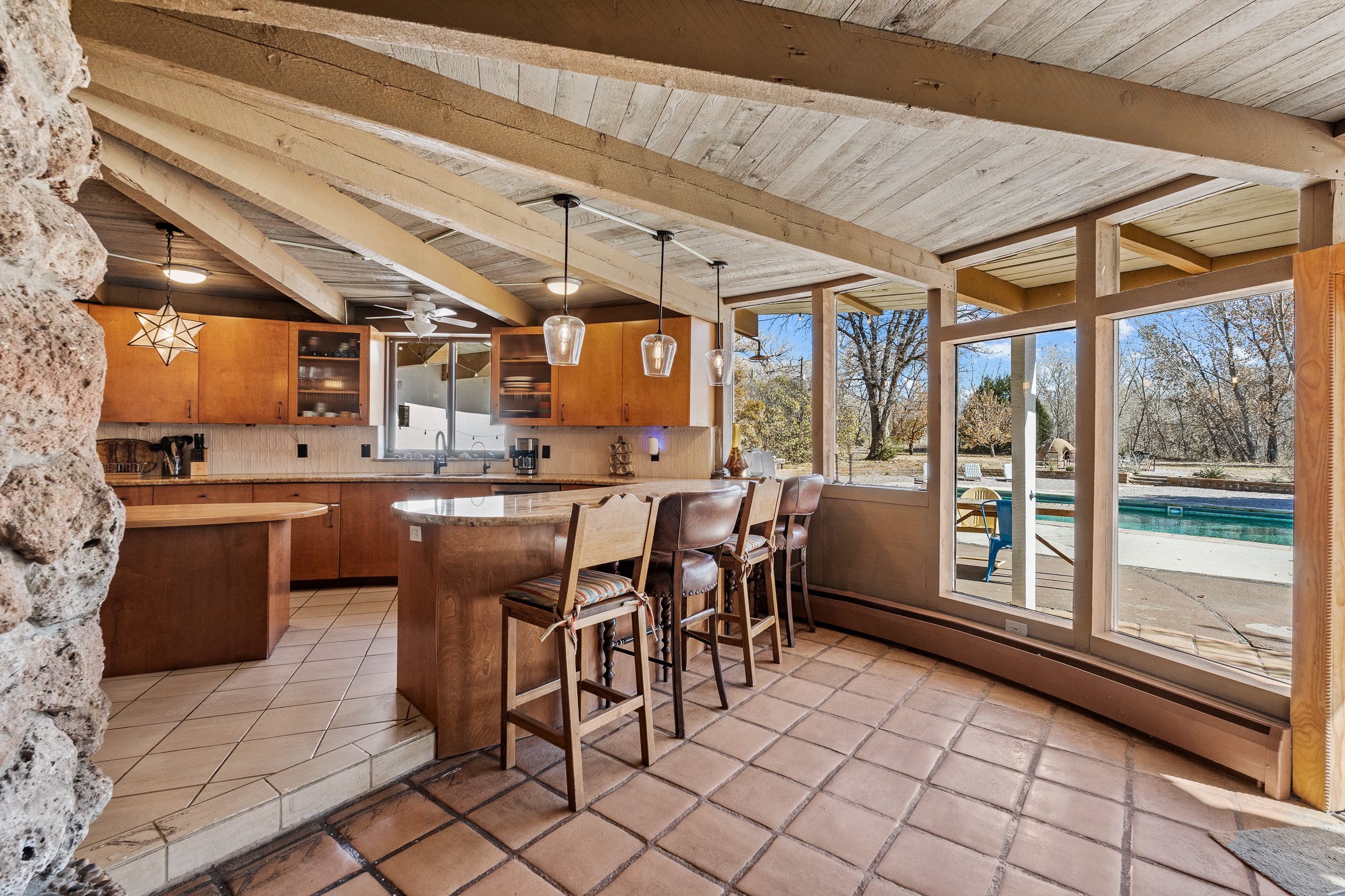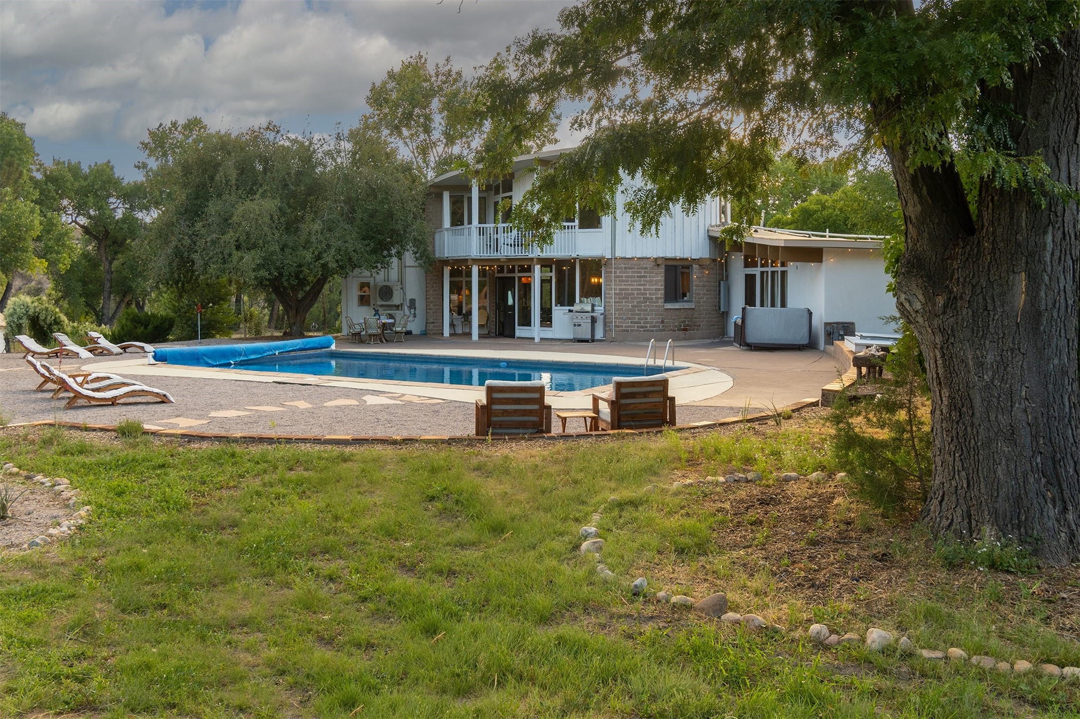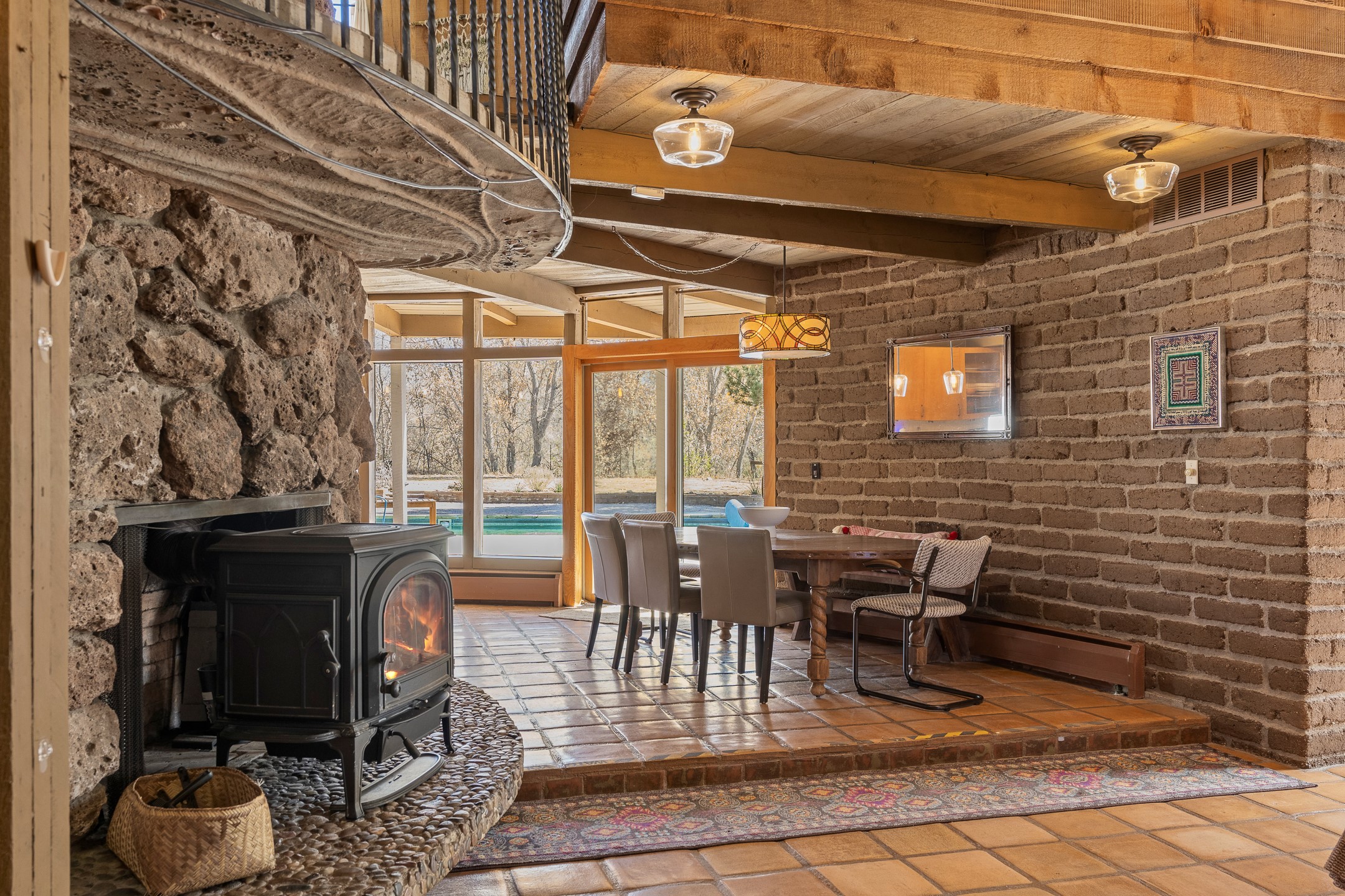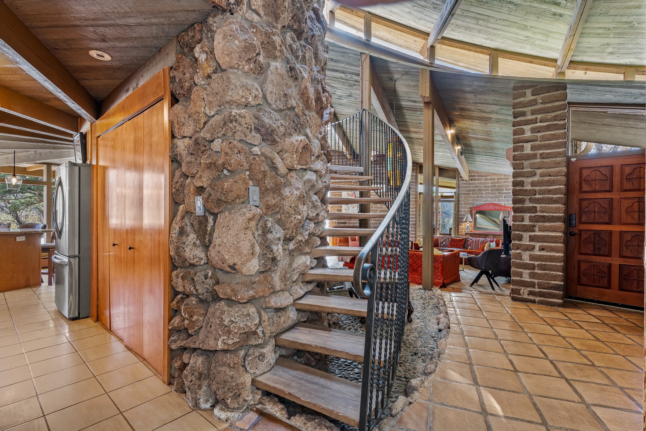 El Caracol Court | 34 State Road 503 is a truly distinctive riverfront property located along the Rio Nambe in the lush Nambe Valley. Designed by renowned local architect Allen L. McNown, a University of Oregon trained architect who settled in Pojoaque in the 1950s and became known for his contemporary adobe work with undulating forms and tinted-light interiors, including the modern church at Namb Pueblo. The home combines artistic design, functionality, and nature in an extraordinary way. Its form is inspired by the spiral geometry of a nautilus shell, a motif McNown used in other celebrated "snail" houses in the valley, and this architectural concept defines a flowing interior that celebrates light, water, and organic space. Set on approximately 2.10 acres, the property is fully fenced and offers both privacy and usability. It benefits from surface water rights off the Rio Nambe as well as a shared well, providing flexibility for landscaping and irrigation. The grounds include mature trees, gardens, a swimming pool, storage shed, and a separate workshop--a combination rarely found in this corridor.The residence itself measures roughly 4,000 square feet with three bedrooms and three bathrooms. Key design features include adobe and frame construction, dramatic curving walls, exposed wood beams, a lava-rock fireplace, and a sweeping staircase that centers the home's open plan. Additional amenities include: 40' Private swimming pool with adjacent lounge area, covered portal, sunroom with glass enclosure, solar improvements, mechanical system updates, maintained roof and gutters, radon mitigation system, updated appliances, and enhanced irrigation infrastructure. Exceptional maintenance and stewardship, upgrades over recent years that have modernized systems while preserving the artistic integrity of the home. The property has also been operated as a short-term rental, generating consistent income and showing strong demand as a retreat or vacation destination.