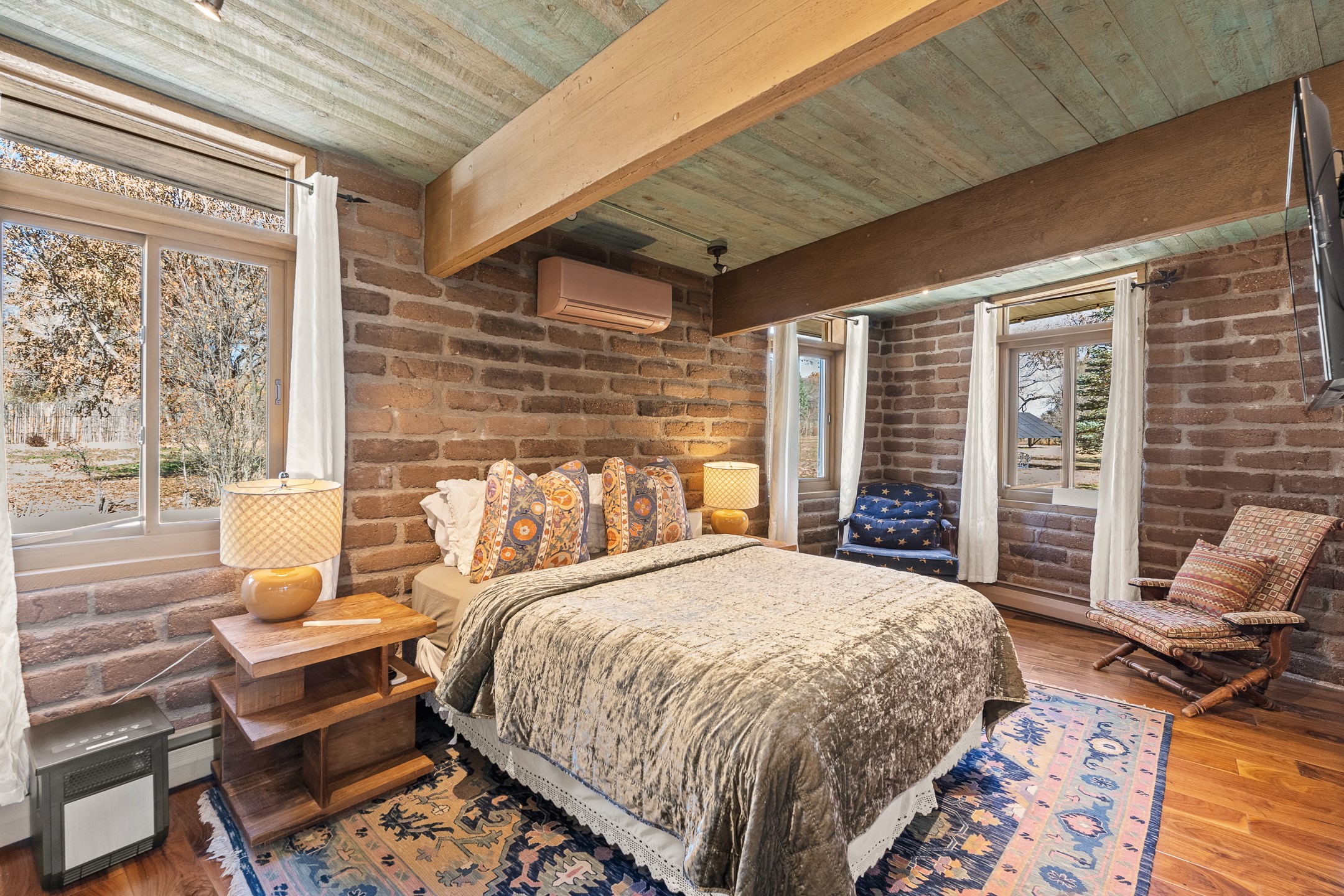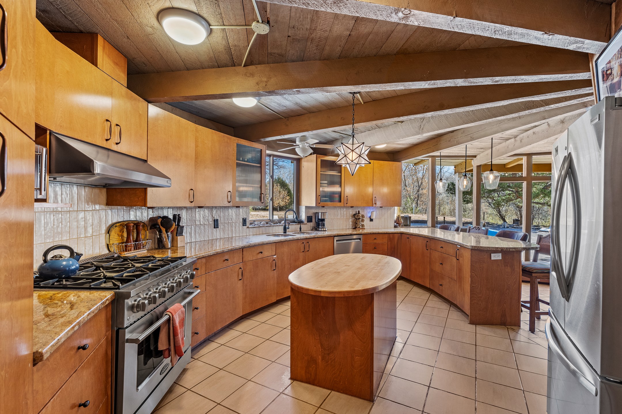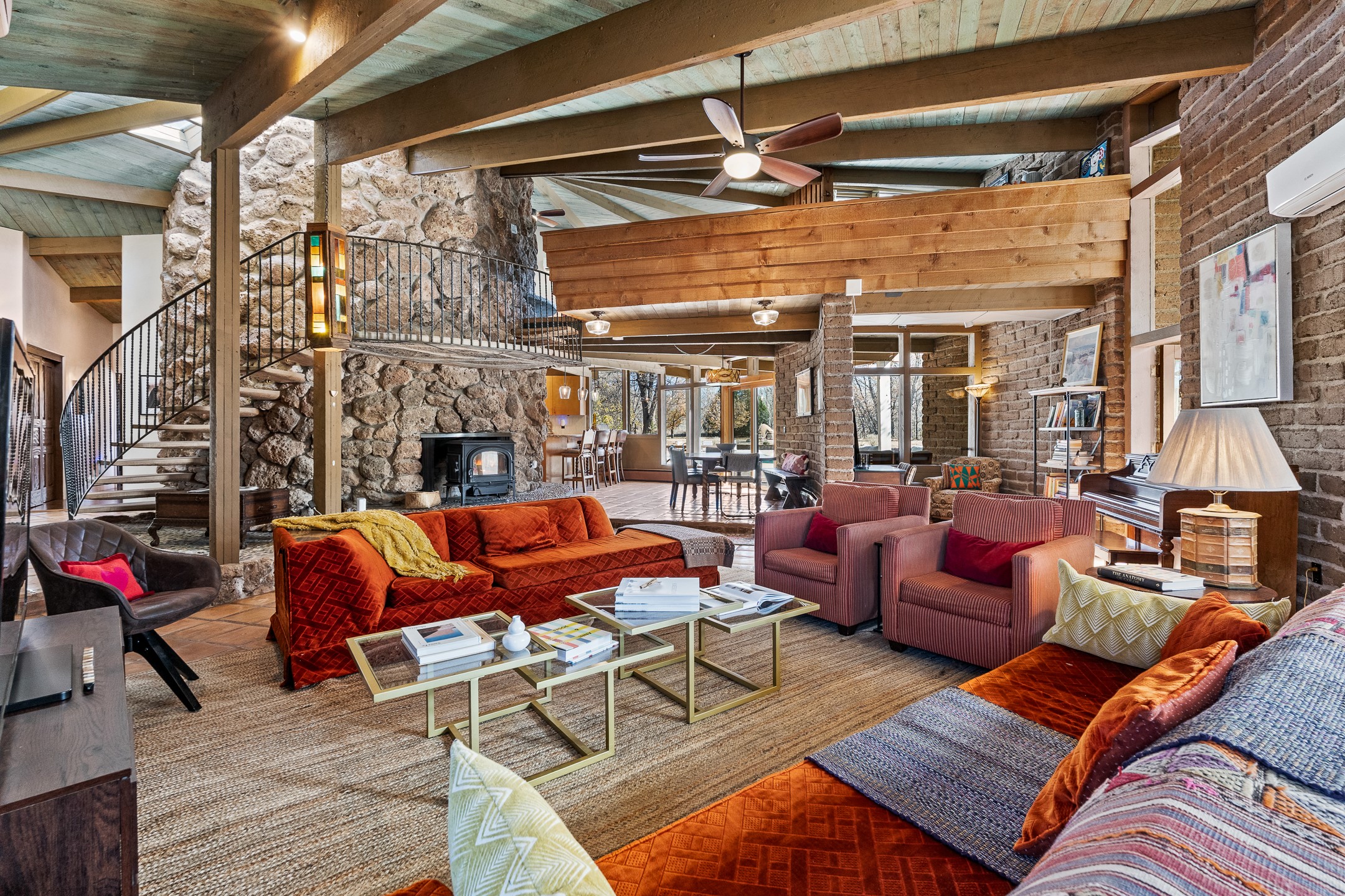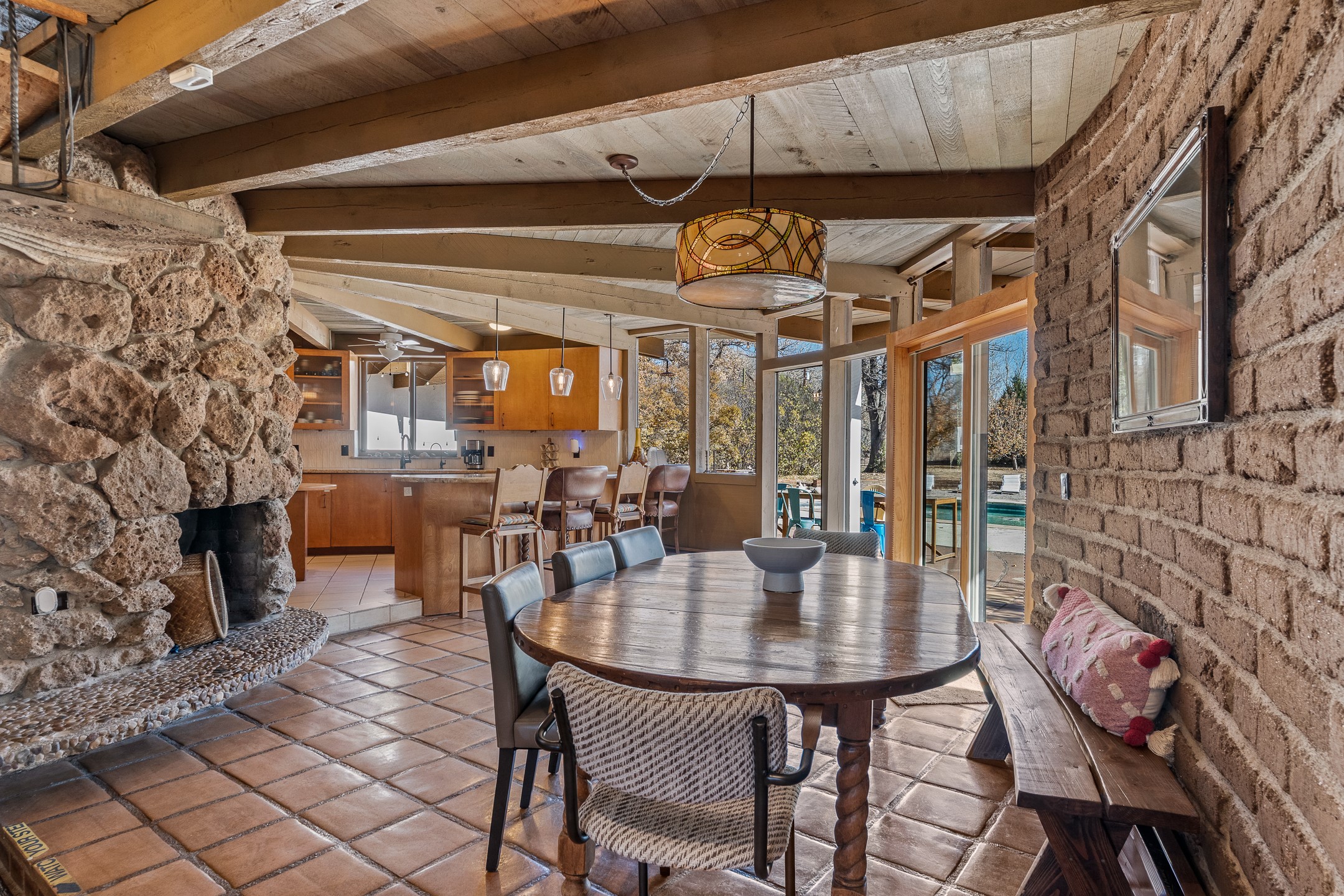 El Caracol Court | 34 State Road 503 is a truly distinctive riverfront property located along the Rio Nambe in the lush Nambe Valley. Designed by renowned local architect Allen L. McNown, a University of Oregon trained architect who settled in Pojoaque in the 1950s and became known for his contemporary adobe work with undulating forms and tinted-light interiors, including the modern church at Namb Pueblo. The home combines artistic design, functionality, and nature in an extraordinary way. Its form is inspired by the spiral geometry of a nautilus shell, a motif McNown used in other celebrated "snail" houses in the valley, and this architectural concept defines a flowing interior that celebrates light, water, and organic space. Set on approximately 2.10 acres, the property is fully fenced and offers both privacy and usability. It benefits from surface water rights off the Rio Nambe as well as a shared well, providing flexibility for landscaping and irrigation. The grounds include mature trees, gardens, a swimming pool, storage shed, and a separate workshop--a combination rarely found in this corridor.The residence itself measures roughly 4,000 square feet with three bedrooms and three bathrooms. Key design features include adobe and frame construction, dramatic curving walls, exposed wood beams, a lava-rock fireplace, and a sweeping staircase that centers the home's open plan. Additional amenities include: 40' Private swimming pool with adjacent lounge area, covered portal, sunroom with glass enclosure, solar improvements, mechanical system updates, maintained roof and gutters, radon mitigation system, updated appliances, and enhanced irrigation infrastructure. Exceptional maintenance and stewardship, upgrades over recent years that have modernized systems while preserving the artistic integrity of the home. The property has also been operated as a short-term rental, generating consistent income and showing strong demand as a retreat or vacation destination.