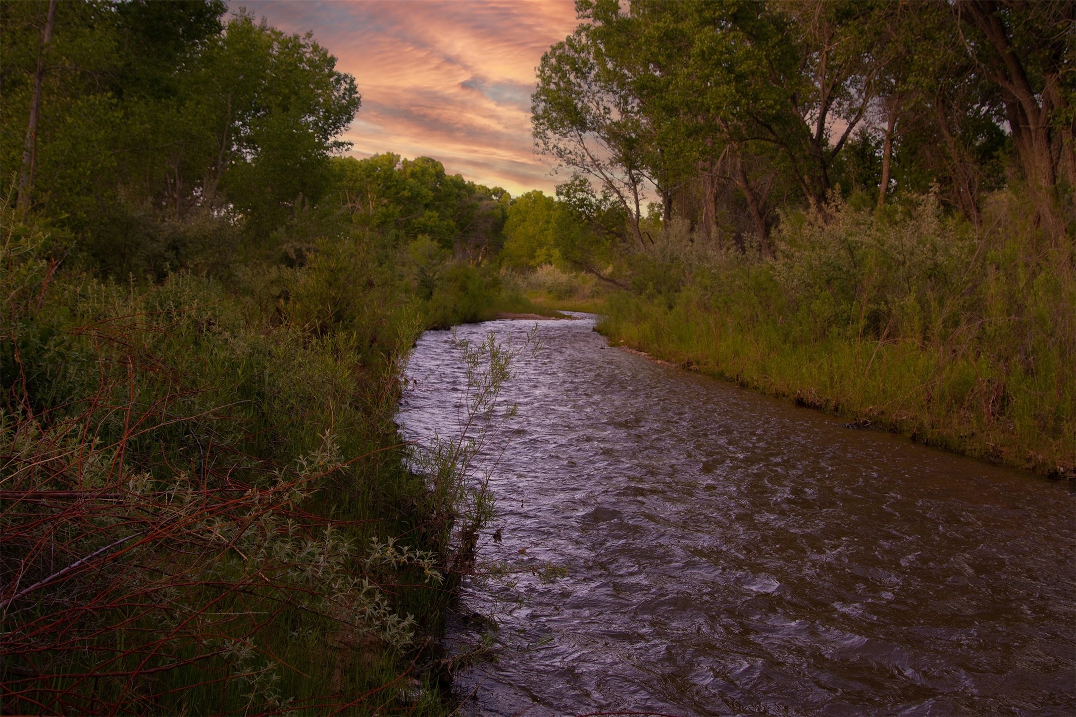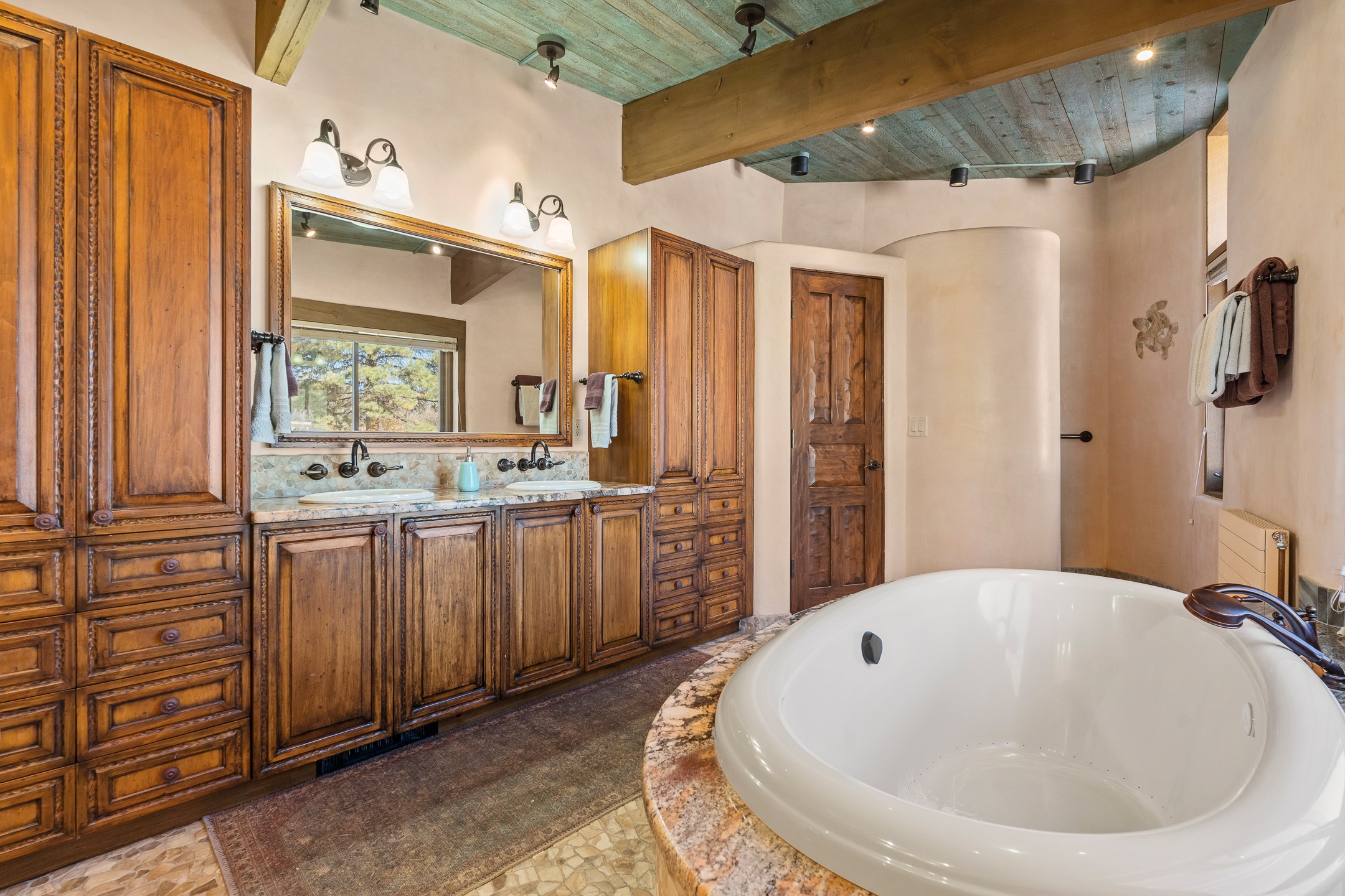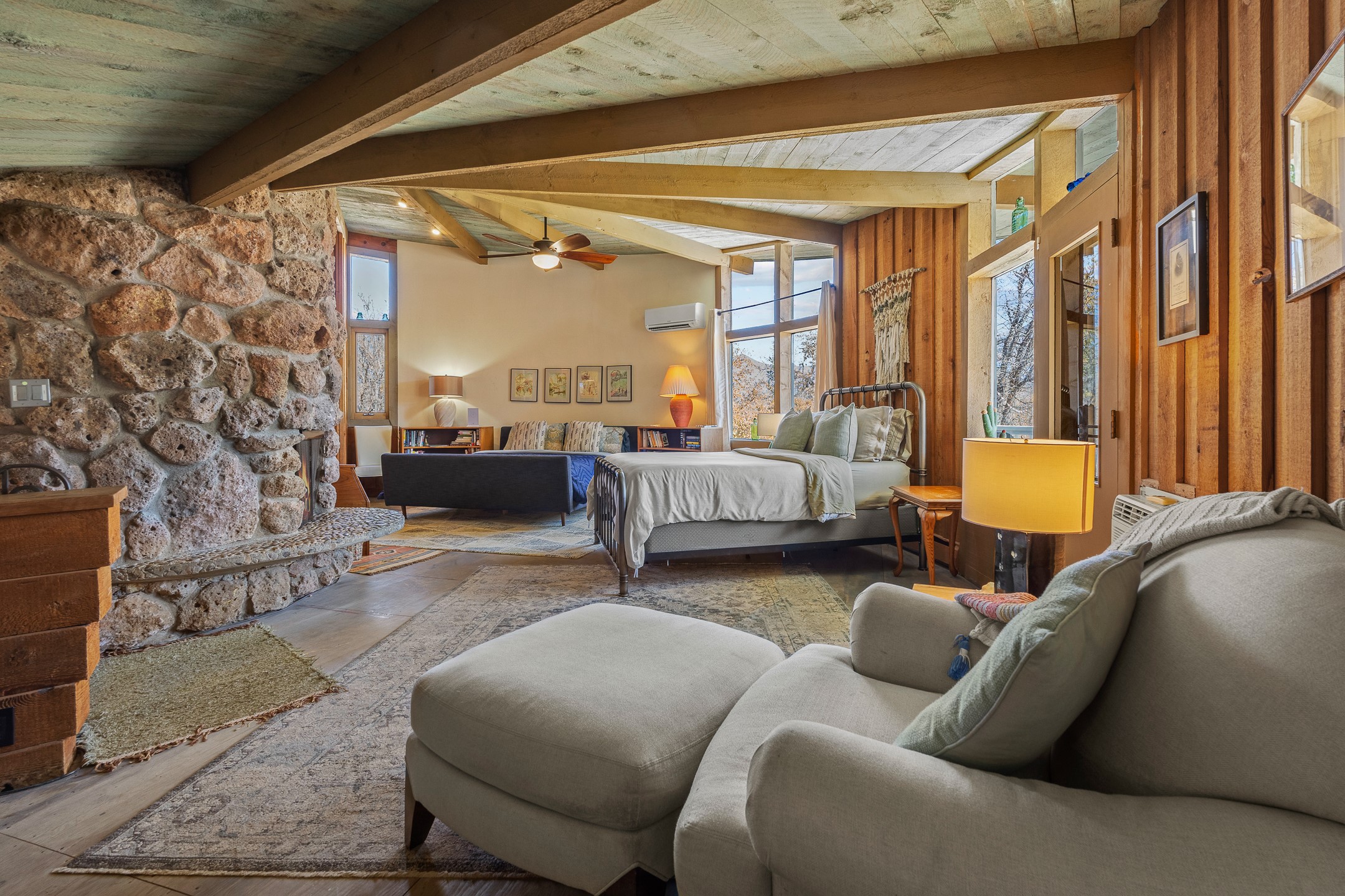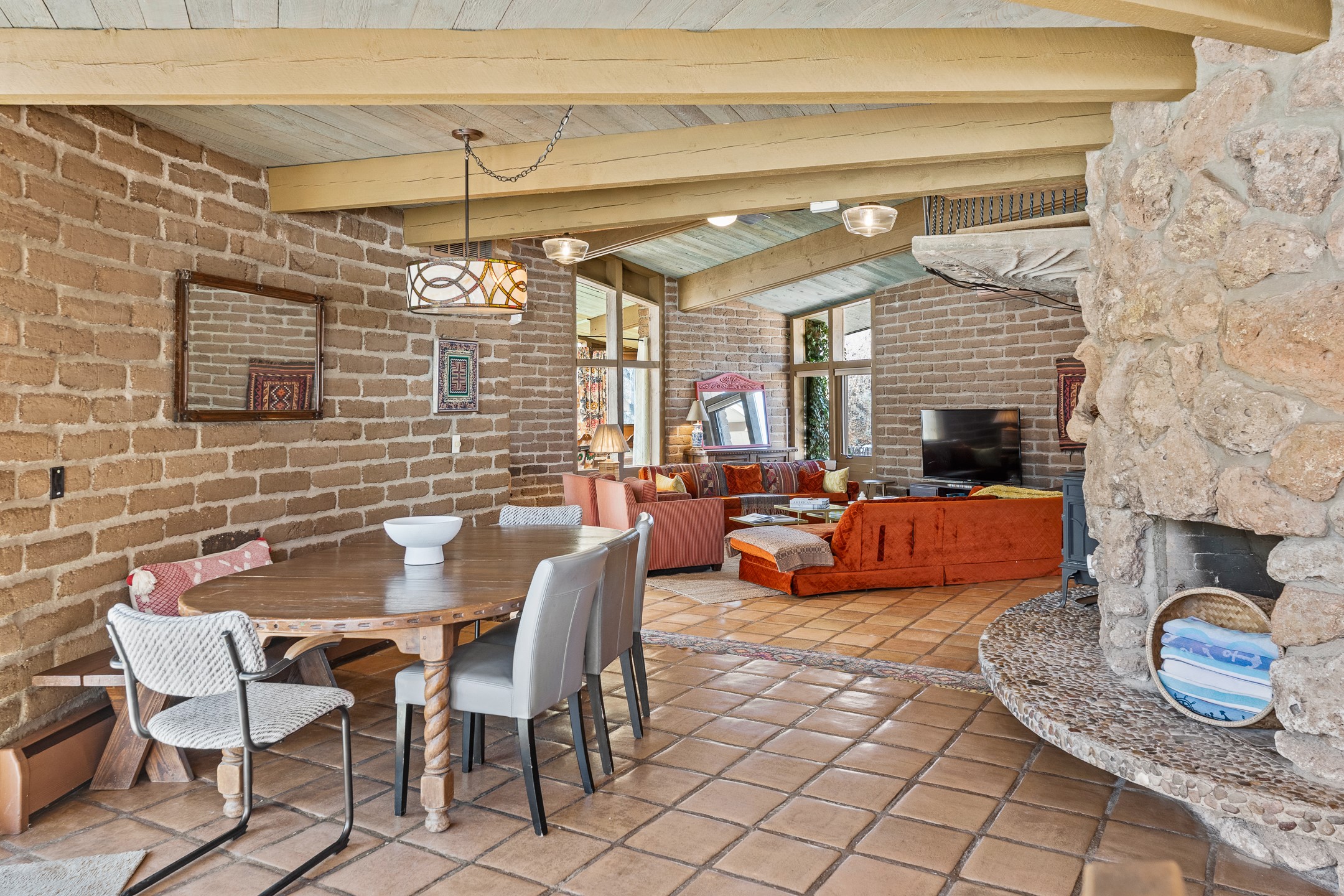 El Caracol Court | 34 State Road 503 is a truly distinctive riverfront property located along the Rio Nambe in the lush Nambe Valley. Designed by renowned local architect Allen L. McNown, a University of Oregon trained architect who settled in Pojoaque in the 1950s and became known for his contemporary adobe work with undulating forms and tinted-light interiors, including the modern church at Namb Pueblo. The home combines artistic design, functionality, and nature in an extraordinary way. Its form is inspired by the spiral geometry of a nautilus shell, a motif McNown used in other celebrated "snail" houses in the valley, and this architectural concept defines a flowing interior that celebrates light, water, and organic space. Set on approximately 2.10 acres, the property is fully fenced and offers both privacy and usability. It benefits from surface water rights off the Rio Nambe as well as a shared well, providing flexibility for landscaping and irrigation. The grounds include mature trees, gardens, a swimming pool, storage shed, and a separate workshop--a combination rarely found in this corridor.The residence itself measures roughly 4,000 square feet with three bedrooms and three bathrooms. Key design features include adobe and frame construction, dramatic curving walls, exposed wood beams, a lava-rock fireplace, and a sweeping staircase that centers the home's open plan. Additional amenities include: 40' Private swimming pool with adjacent lounge area, covered portal, sunroom with glass enclosure, solar improvements, mechanical system updates, maintained roof and gutters, radon mitigation system, updated appliances, and enhanced irrigation infrastructure. Exceptional maintenance and stewardship, upgrades over recent years that have modernized systems while preserving the artistic integrity of the home. The property has also been operated as a short-term rental, generating consistent income and showing strong demand as a retreat or vacation destination.