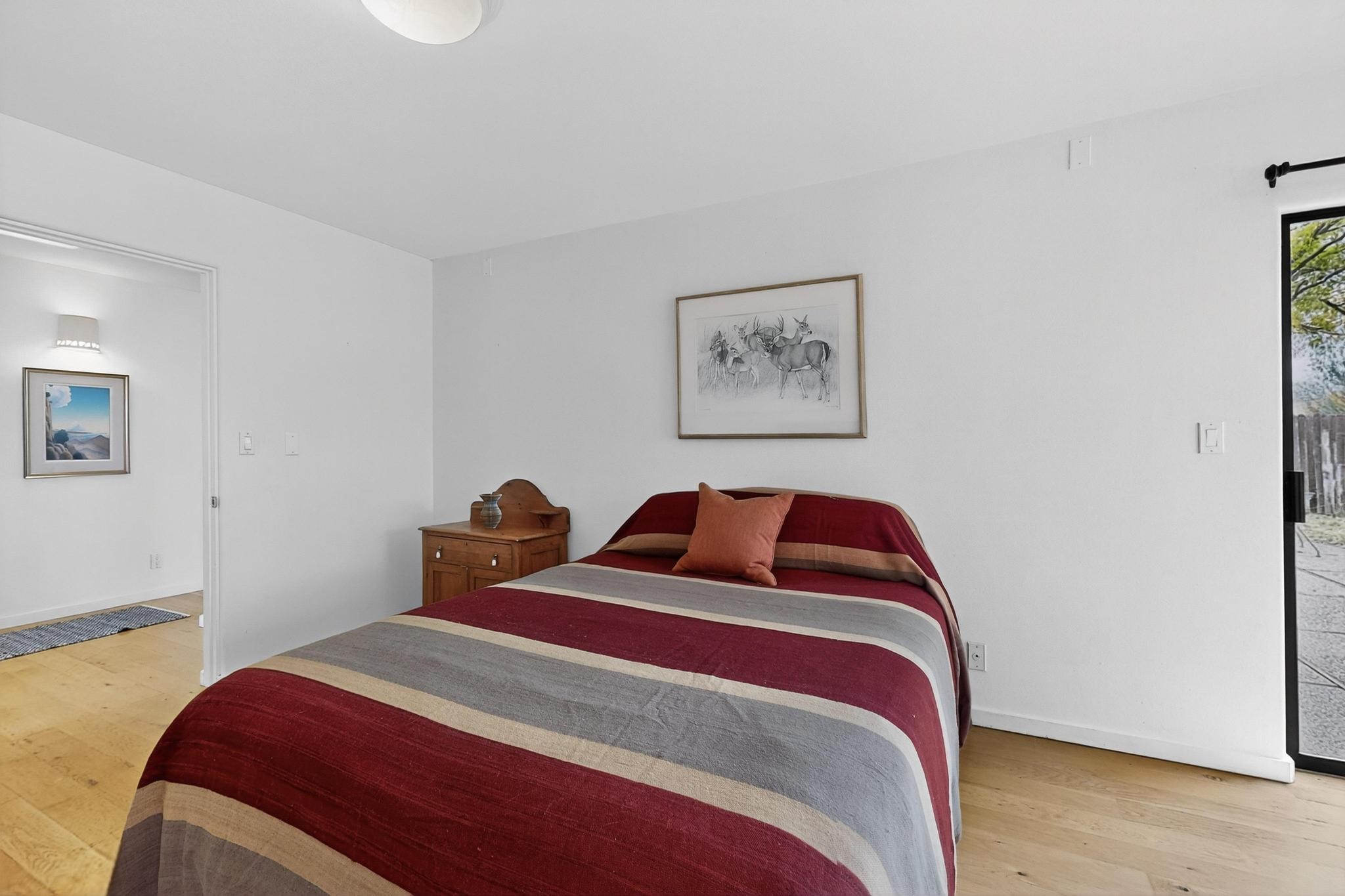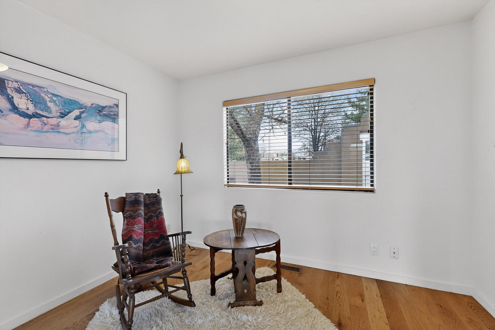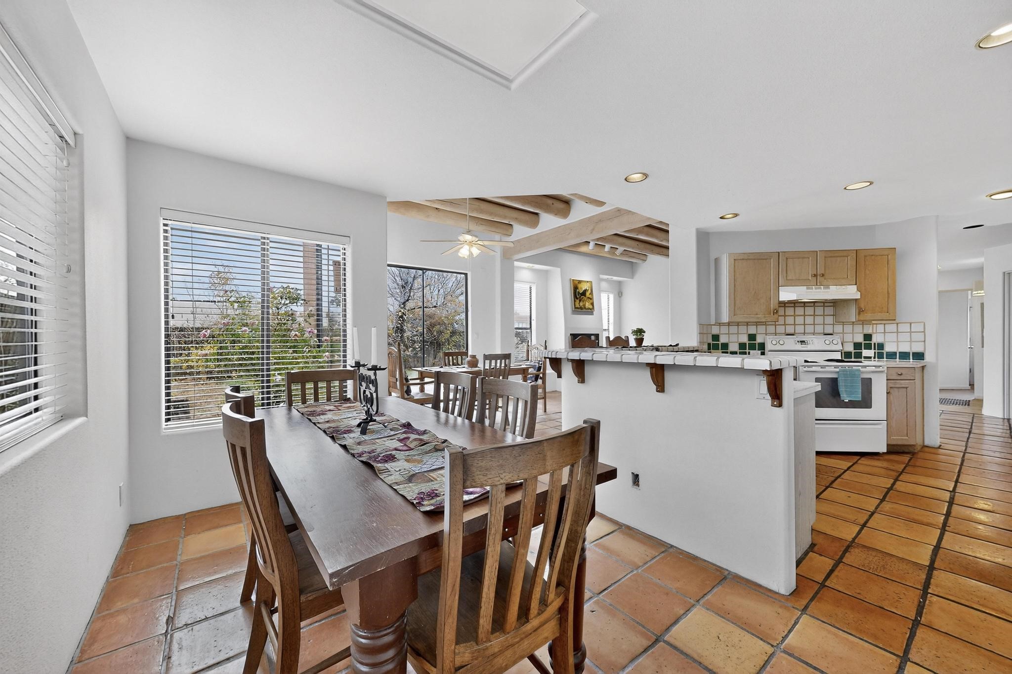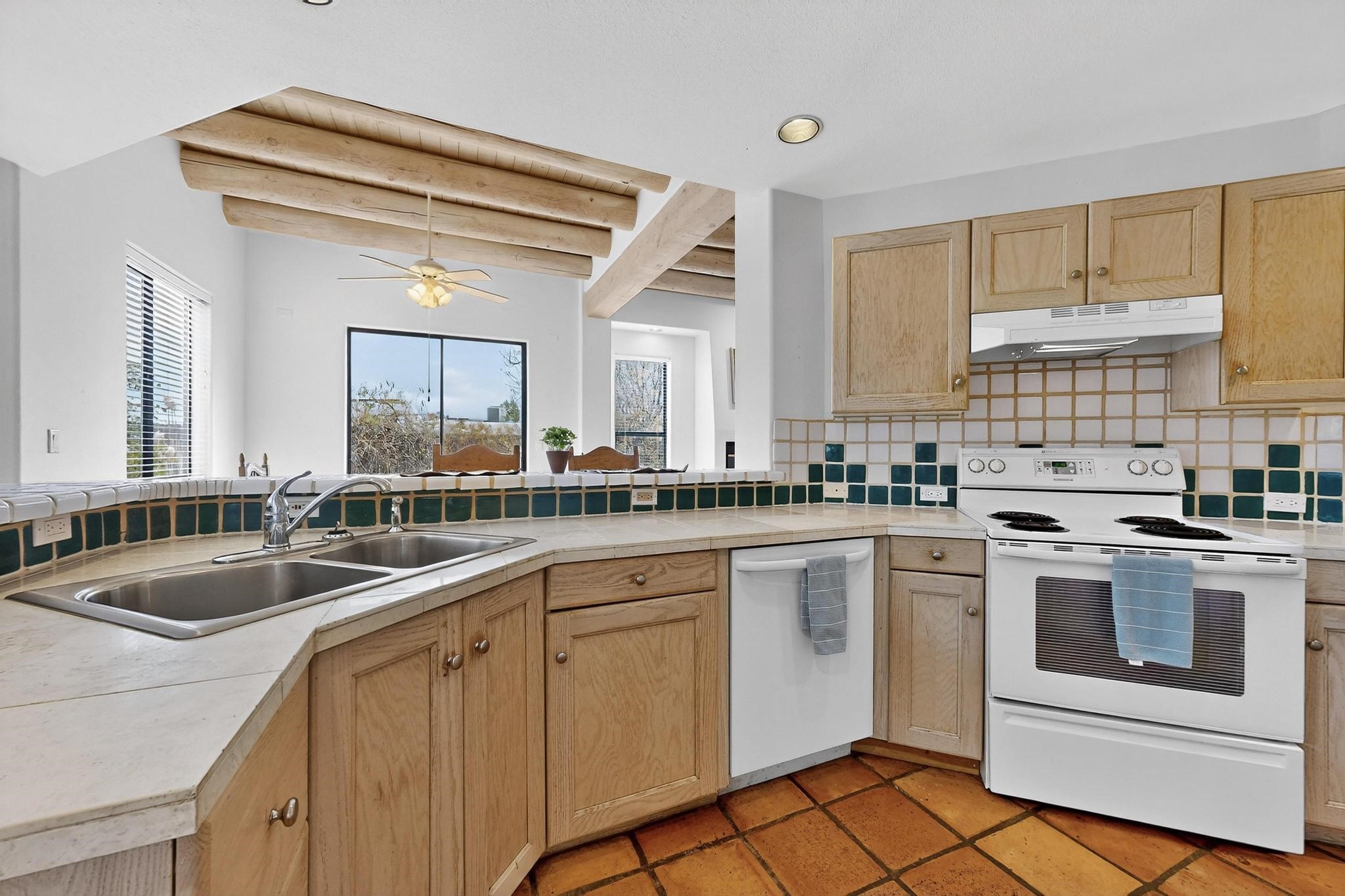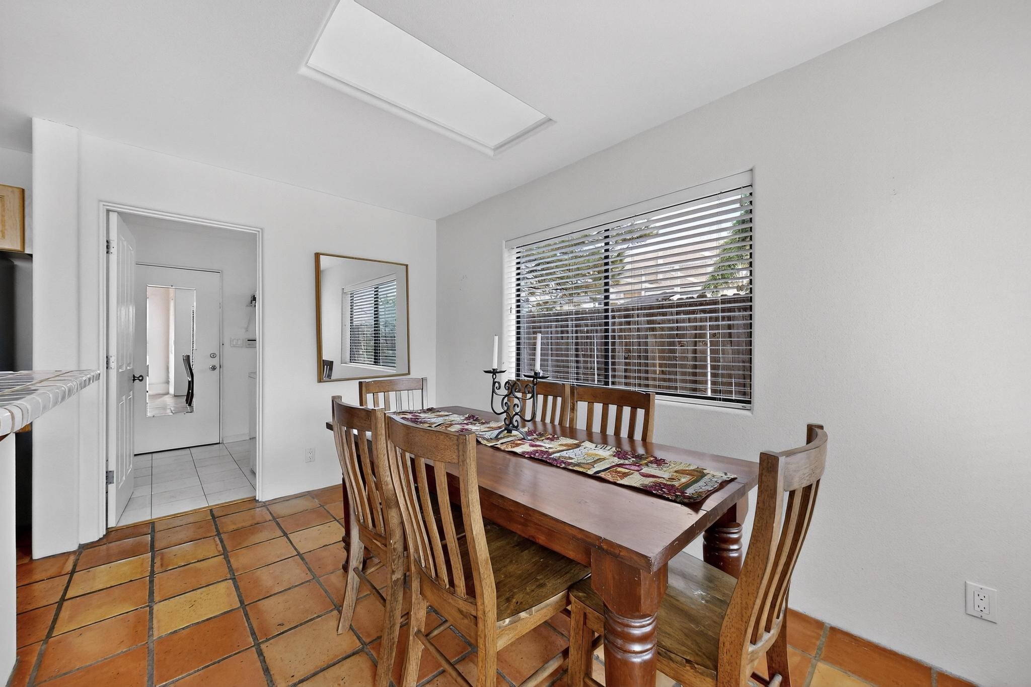 Discover this beautiful single-level home filled with natural light and nestled in the serene Plaza Del Castillo neighborhood. Enter through a walled private courtyard into a space rich with Santa Fe character, featuring high tongue-and-groove ceilings with vigas, a cozy wood-burning fireplace, and a blend of Saltillo tile and wood flooring.Skylights brighten the home, which also offers two full bathrooms, two dining areas, and a spacious primary suite with its own seating area--ideal for a reading nook or quiet retreat.Warm, inviting, and full of Southwestern charm, this home is ready to be enjoyed!