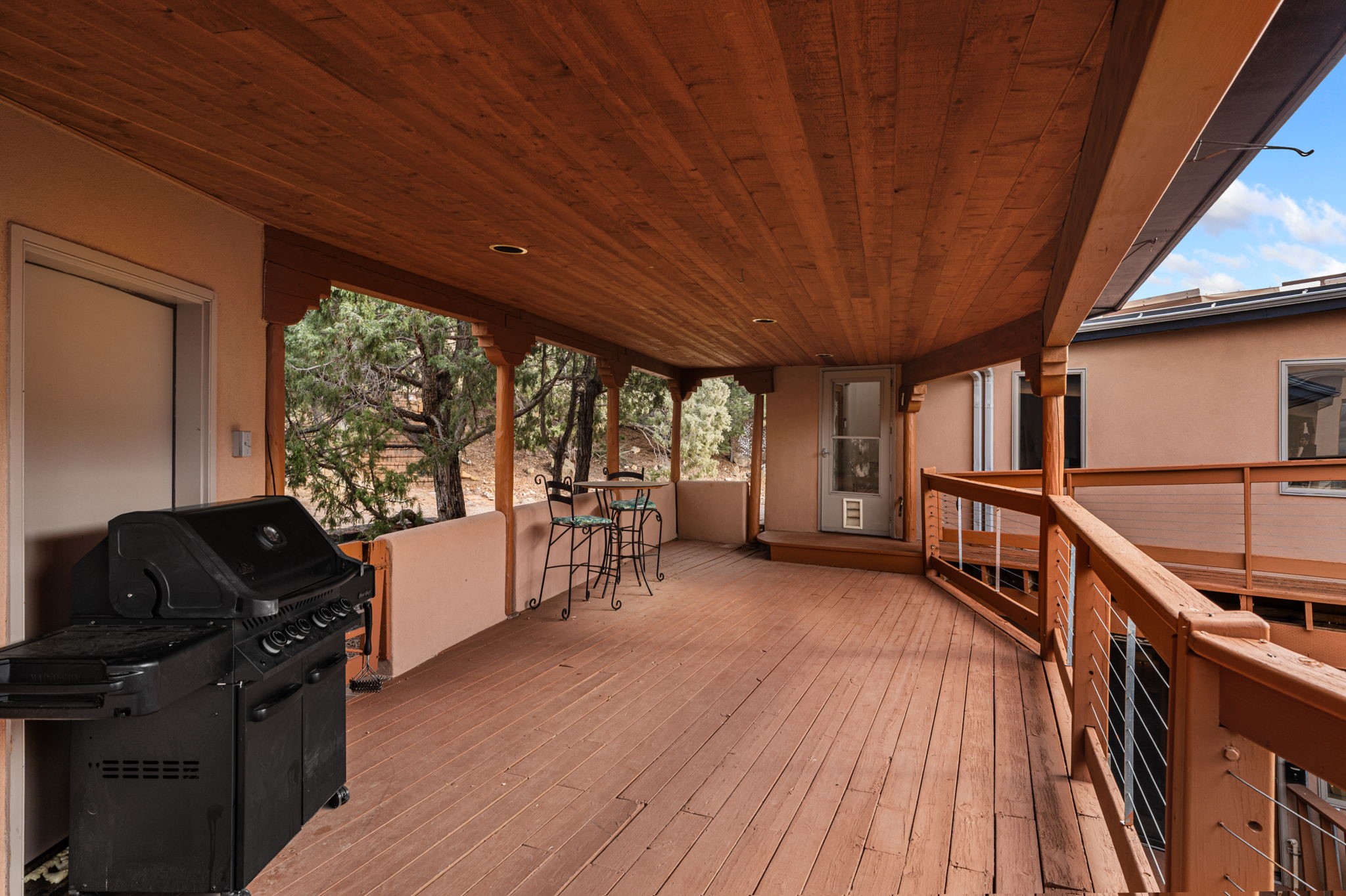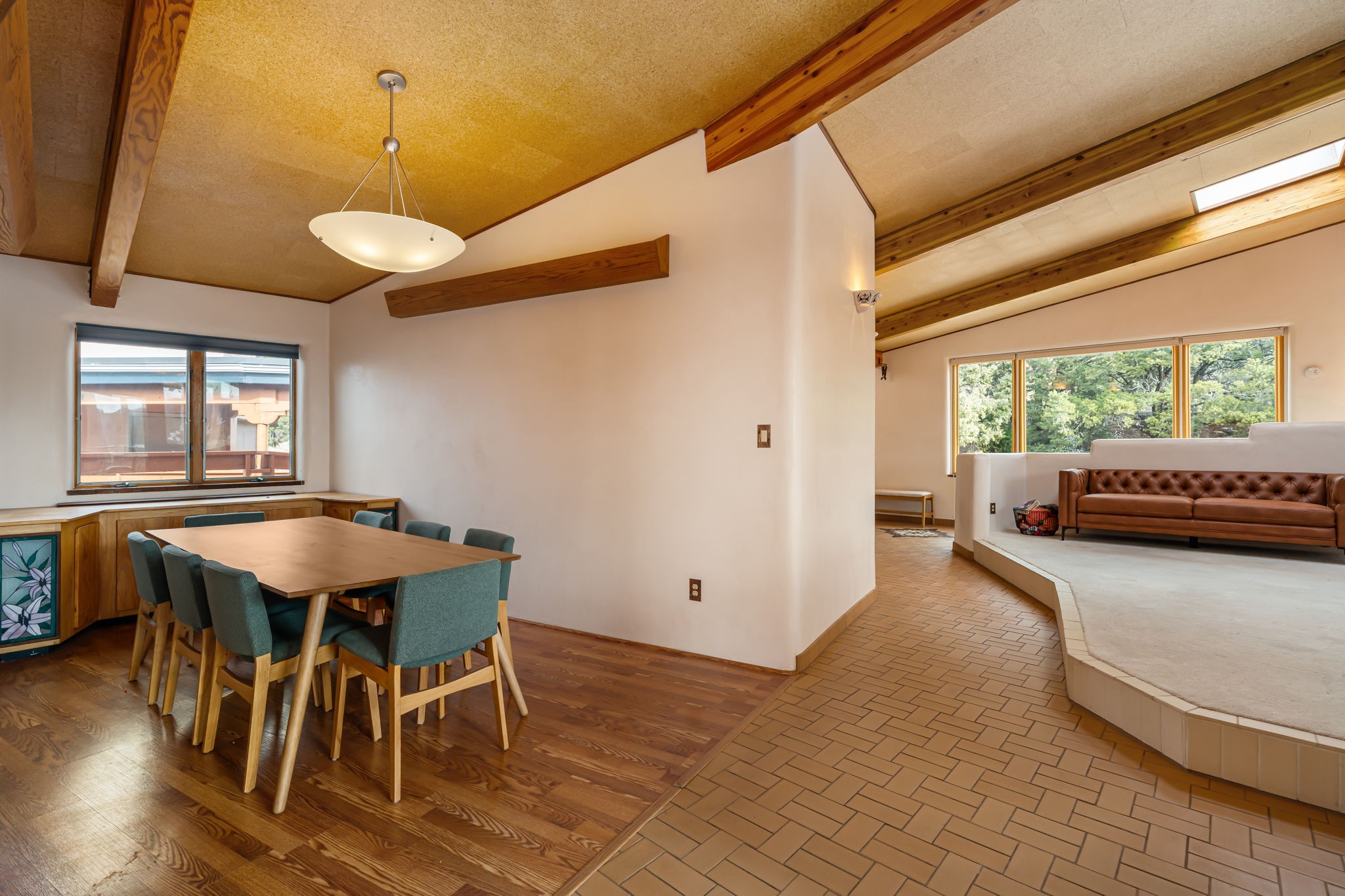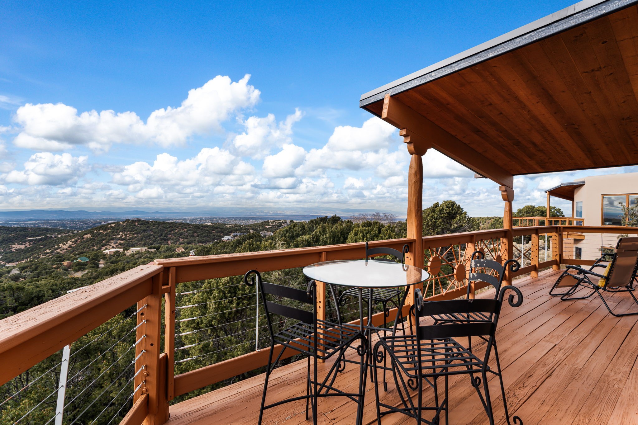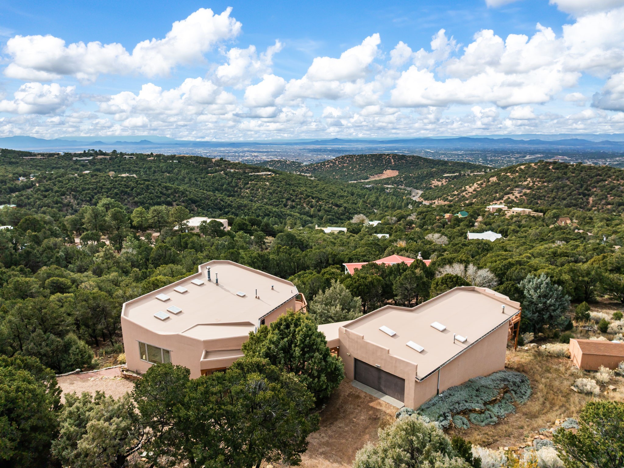 Imagine a stunning retreat atop the world, where the enchanting views of Santa Fe and the renowned New Mexico skies stretch out before you. Elevated at 8,000 feet, this home offers unforgettable western views with sunsets that paint the sky with vibrant colors. Inside, you'll find a blend of artistry and craftsmanship with diamond plaster walls, wooden beams, etched glass and cozy cork ceilings, all framed by a newer roof and stylish stucco that add to its charm. Every corner of this home exudes creativity from the original owners, from the beautifully situated kitchen and living room that bathe in westward light to an inviting pottery/art studio that doubles as a sun room or plant sanctuary. The thoughtful design embraces passive solar elements and solar panels, making it energy efficient. The versatile and separate studio is not just an area to create--it's a dream come true for writers, artists, designers or jewelry makers looking to bring their creativity to life. And with abundant storage throughout, you'll have room for all your inspirations. Located just moments away from the serene Santa Fe National Forest, thrilling slopes at the Santa Fe Ski Basin, and the scenic hiking/biking trails of Dale Ball, this home isn't just a place to live; it's a canvas for your life's next masterpiece.