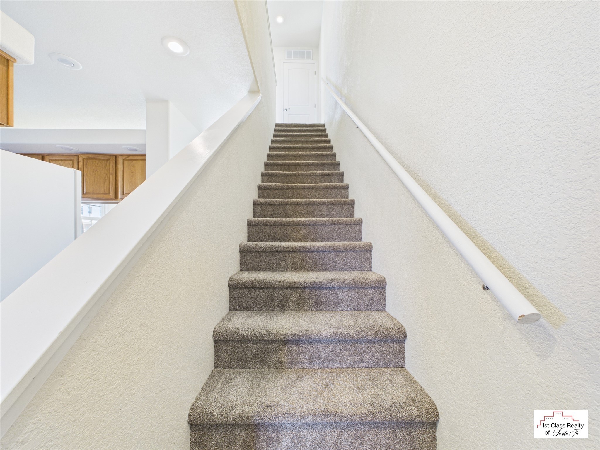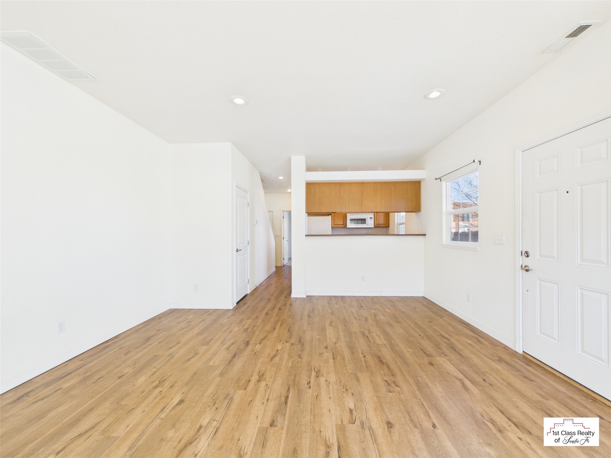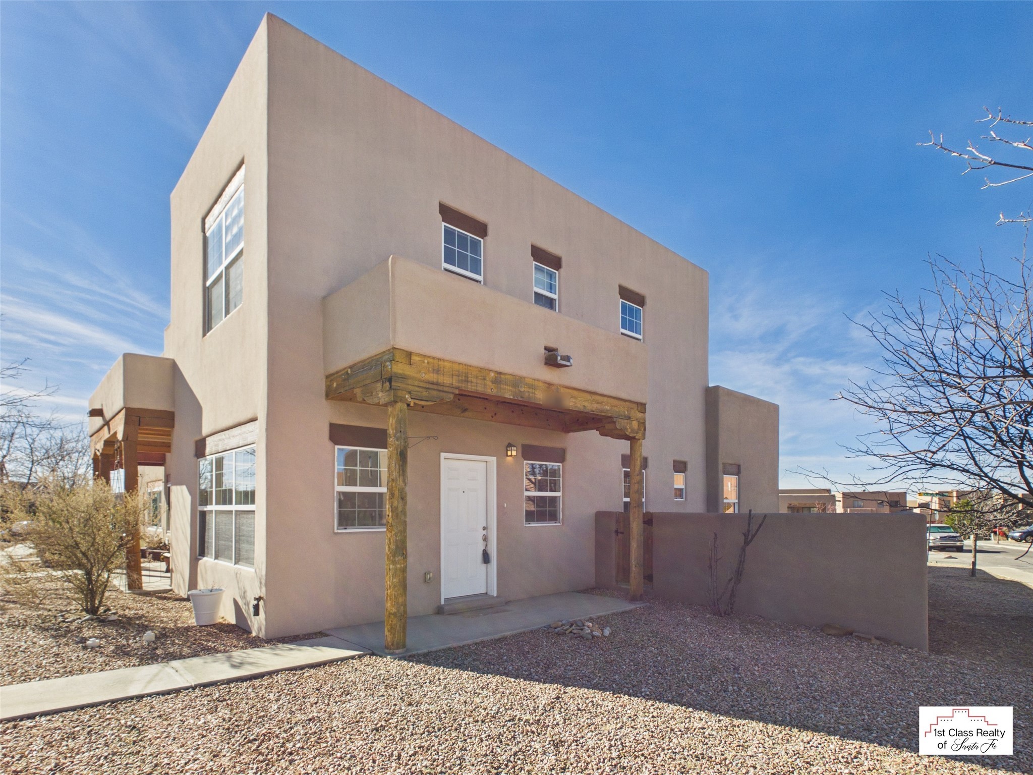 Welcome home to this contemporary pueblo-style end-unit on a corner lot in the desirable El Nido community. Light-filled interior with an open main-level living area, kitchen, and a flexible bedroom/office plus a bath. Two additional bedrooms and a full bath are located upstairs. Enjoy a private walled courtyard ideal for outdoor dining, gardening, or pets, as well as an upper deck offering expansive mountain views, sunset backdrops, and star-filled night skies. Additional features include off-street parking for two vehicles and abundant natural light throughout. Convenient south side location just minutes to SWAN Park, the Santa Fe Country Club, shopping, dining, entertainment, and the Presbyterian Medical Center. Quick access to I-25 and Hwy 599 for easy commuting to ABQ or Los Alamos. A well-kept home in a convenient area.