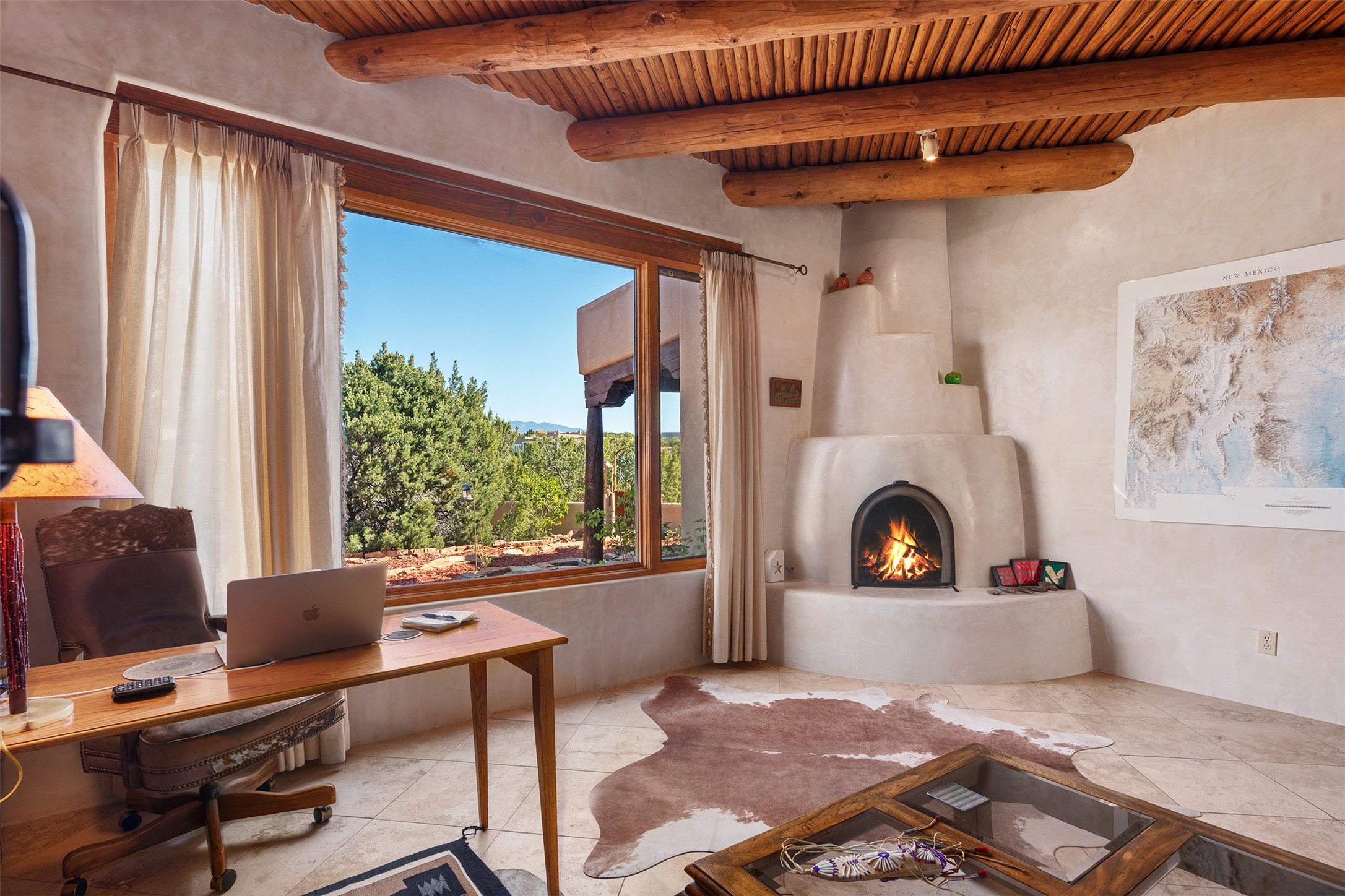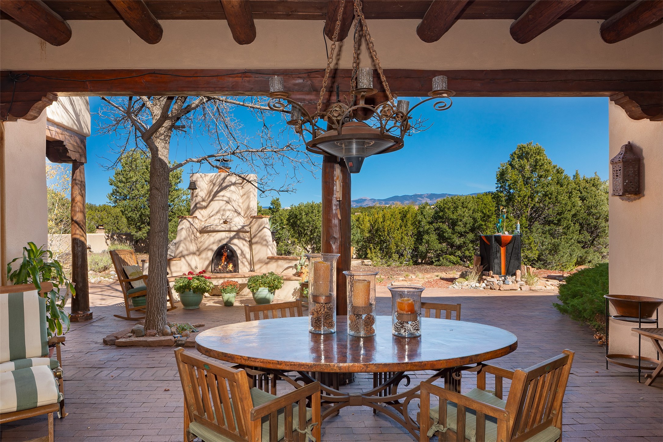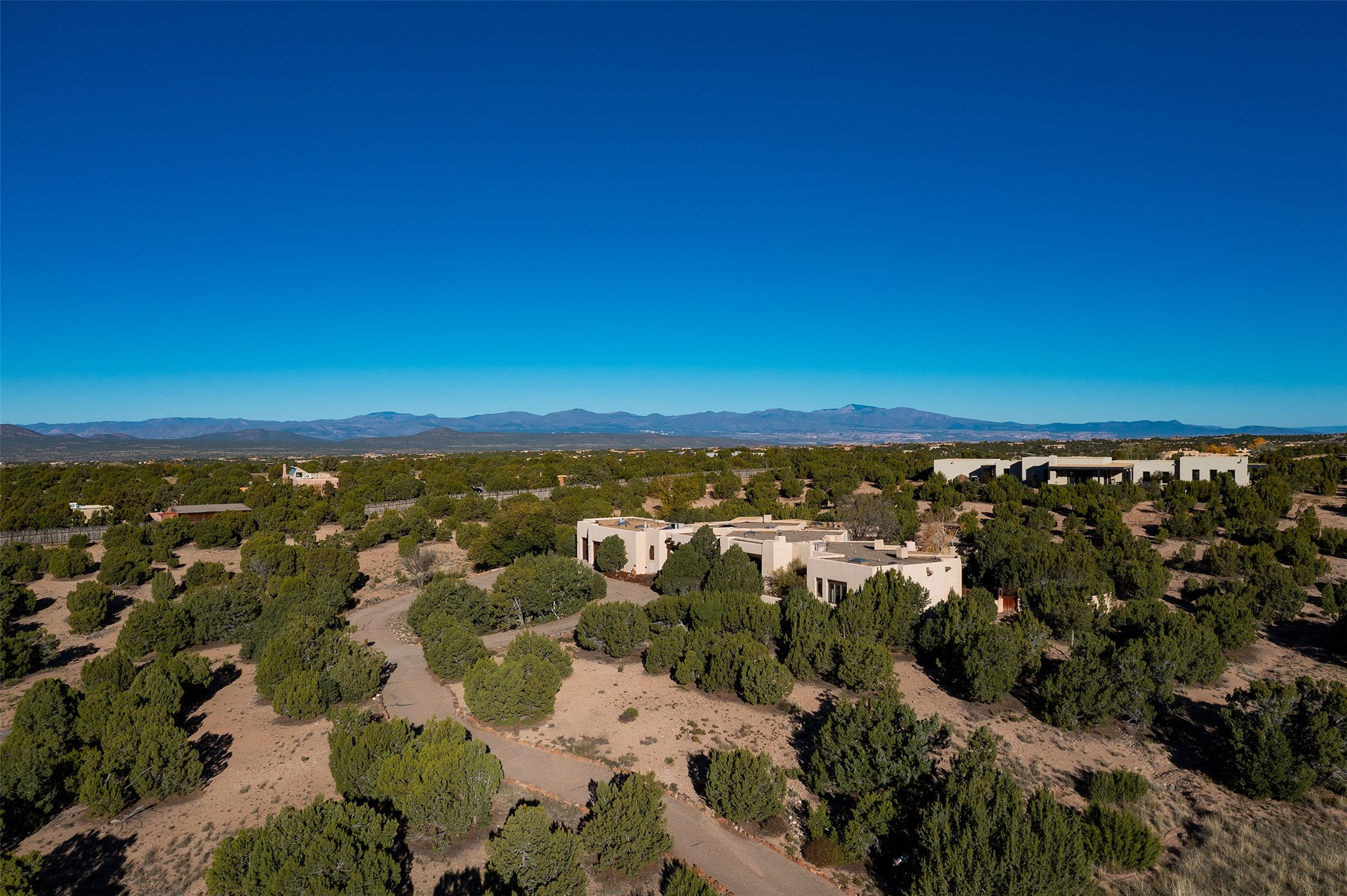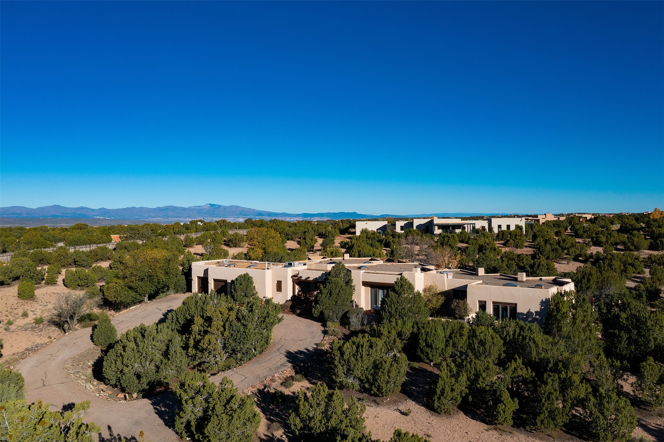 Las Campanas- Beautiful Classic Santa Fe Style on an elevated homesite with Sangre de Cristo & Sandia mountain views! Plenty of room in the developable area to add a casita with easy access from the circle driveway. Approximately 4235 sq ft & an oversized 3 car garage w/ a lot of extra storage. Throughout the home find beautiful hard plastered walls, traditional treatments with vigas, latillas, & coved ceilings, wood & travertine stone floors. Primary suite with an exquisite bath w/ timeless Talivera Tile, 2 water closets, 2 vanities, a large tub and separate shower and 2 walk-in closets. Guest bedrooms are spacious, en-suite, all with doors to the outside courtyards. Handsome office with Kiva FP & built-in bookshelves. Expansive Great Room with a large fireplace and dining area, awash in natural light, flowing to the inviting kitchen w/ bar area & connected family room w/ FP & French doors opening to the back portal-sure to become one of your favorite spots-with Sangre mountain views & outdoor fireplace. Radiant in-floor heat & central forced air AC. This home has a prime location in Estate 2- close to the Santa Fe Plaza & shopping. Membership to the Club at Las Campanas is optional, it is an additional investment, by invitation, & handled through The Club. Amenities are numerous & World Class. Come see this blend of privacy, grace, and beauty! 24hr security & paramedics. Look at video!