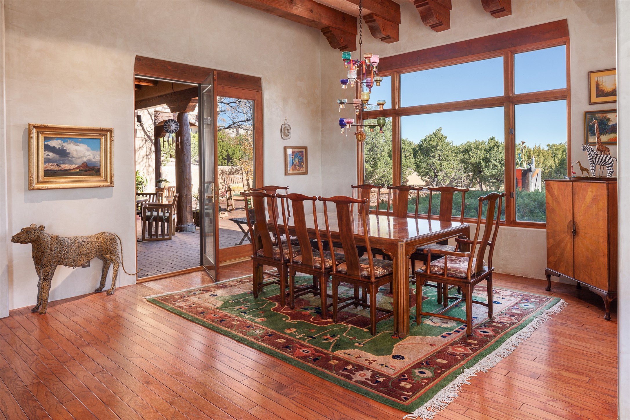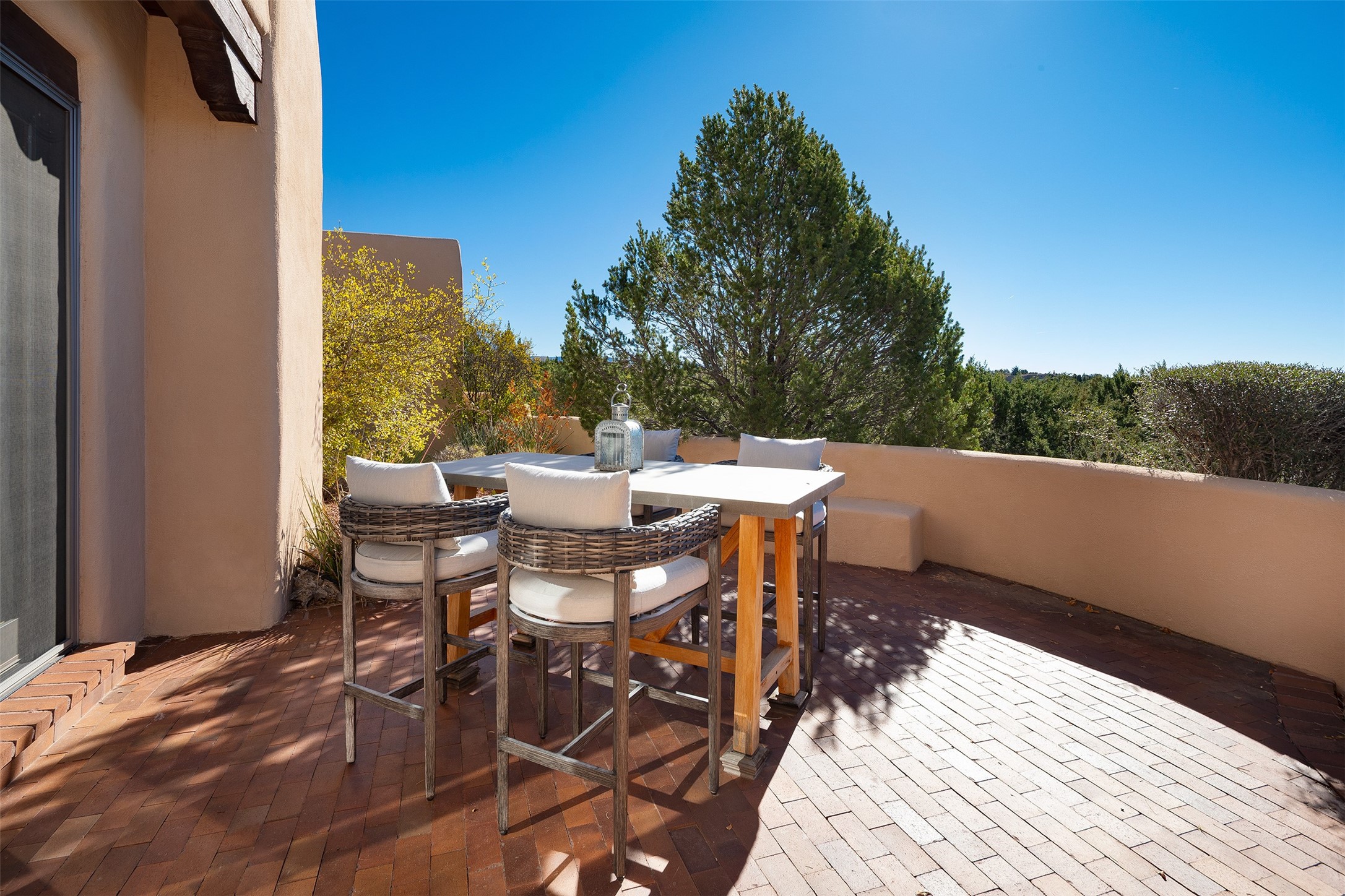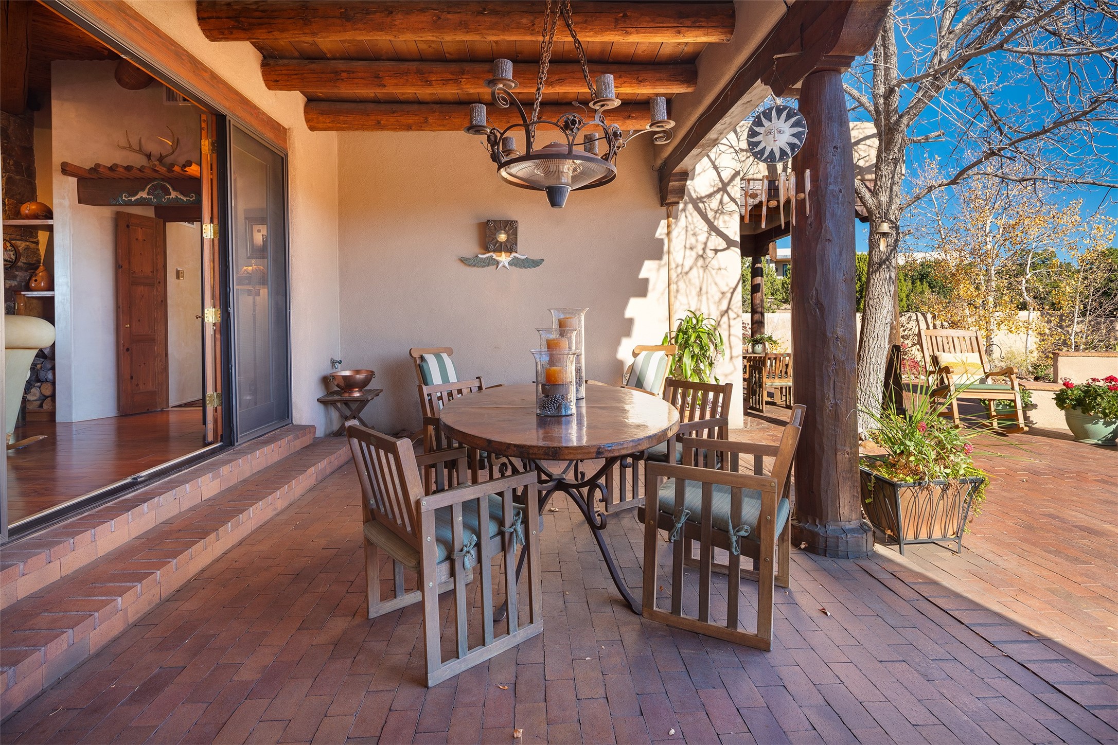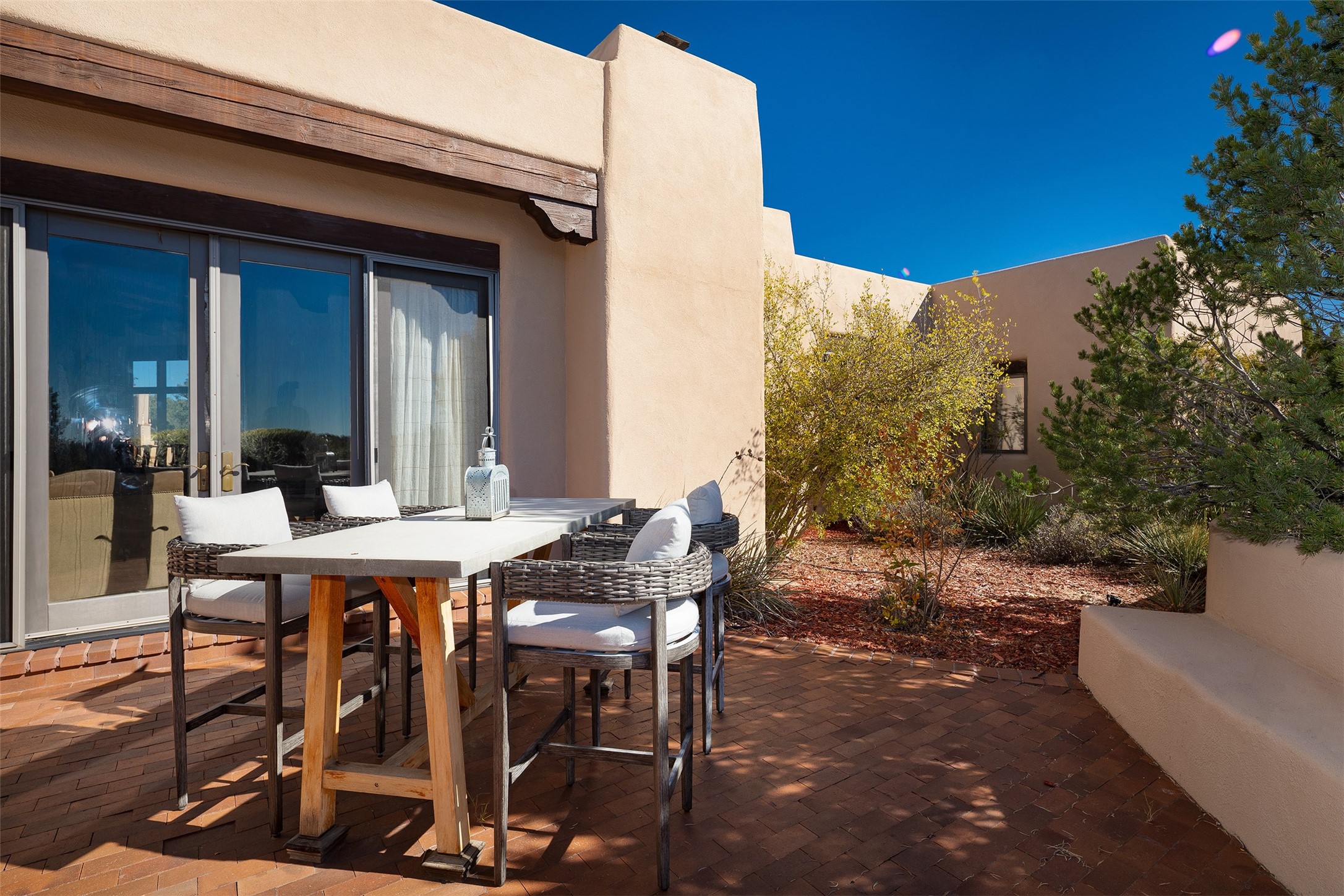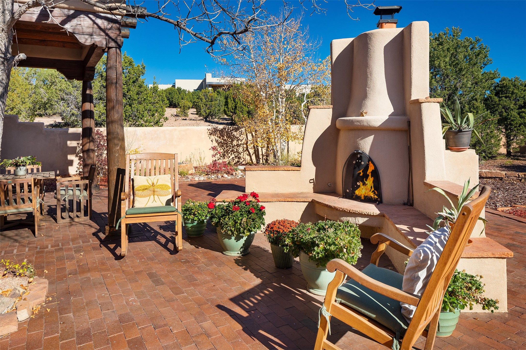 Las Campanas- Beautiful Classic Santa Fe Style on an elevated homesite with Sangre de Cristo & Sandia mountain views! Plenty of room in the developable area to add a casita with easy access from the circle driveway. Approximately 4235 sq ft & an oversized 3 car garage w/ a lot of extra storage. Throughout the home find beautiful hard plastered walls, traditional treatments with vigas, latillas, & coved ceilings, wood & travertine stone floors. Primary suite with an exquisite bath w/ timeless Talivera Tile, 2 water closets, 2 vanities, a large tub and separate shower and 2 walk-in closets. Guest bedrooms are spacious, en-suite, all with doors to the outside courtyards. Handsome office with Kiva FP & built-in bookshelves. Expansive Great Room with a large fireplace and dining area, awash in natural light, flowing to the inviting kitchen w/ bar area & connected family room w/ FP & French doors opening to the back portal-sure to become one of your favorite spots-with Sangre mountain views & outdoor fireplace. Radiant in-floor heat & central forced air AC. This home has a prime location in Estate 2- close to the Santa Fe Plaza & shopping. Membership to the Club at Las Campanas is optional, it is an additional investment, by invitation, & handled through The Club. Amenities are numerous & World Class. Come see this blend of privacy, grace, and beauty! 24hr security & paramedics. Look at video!
