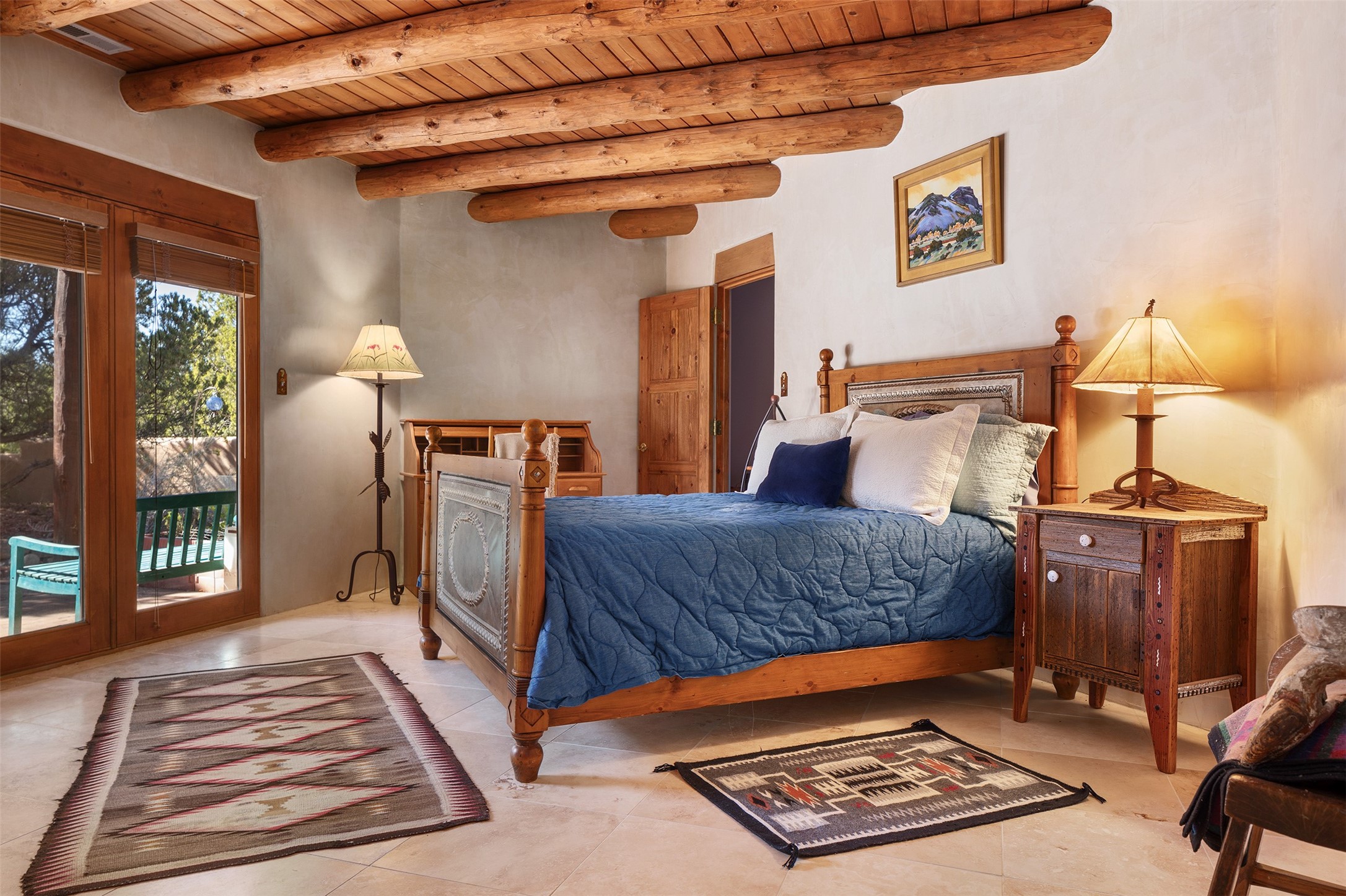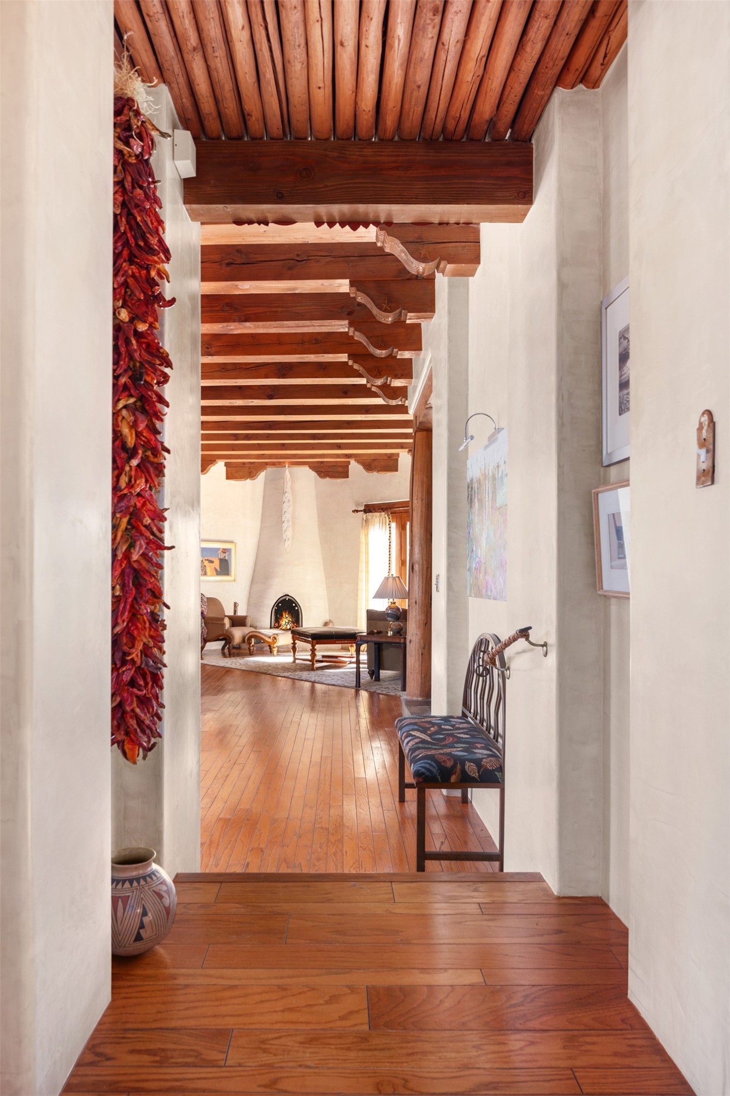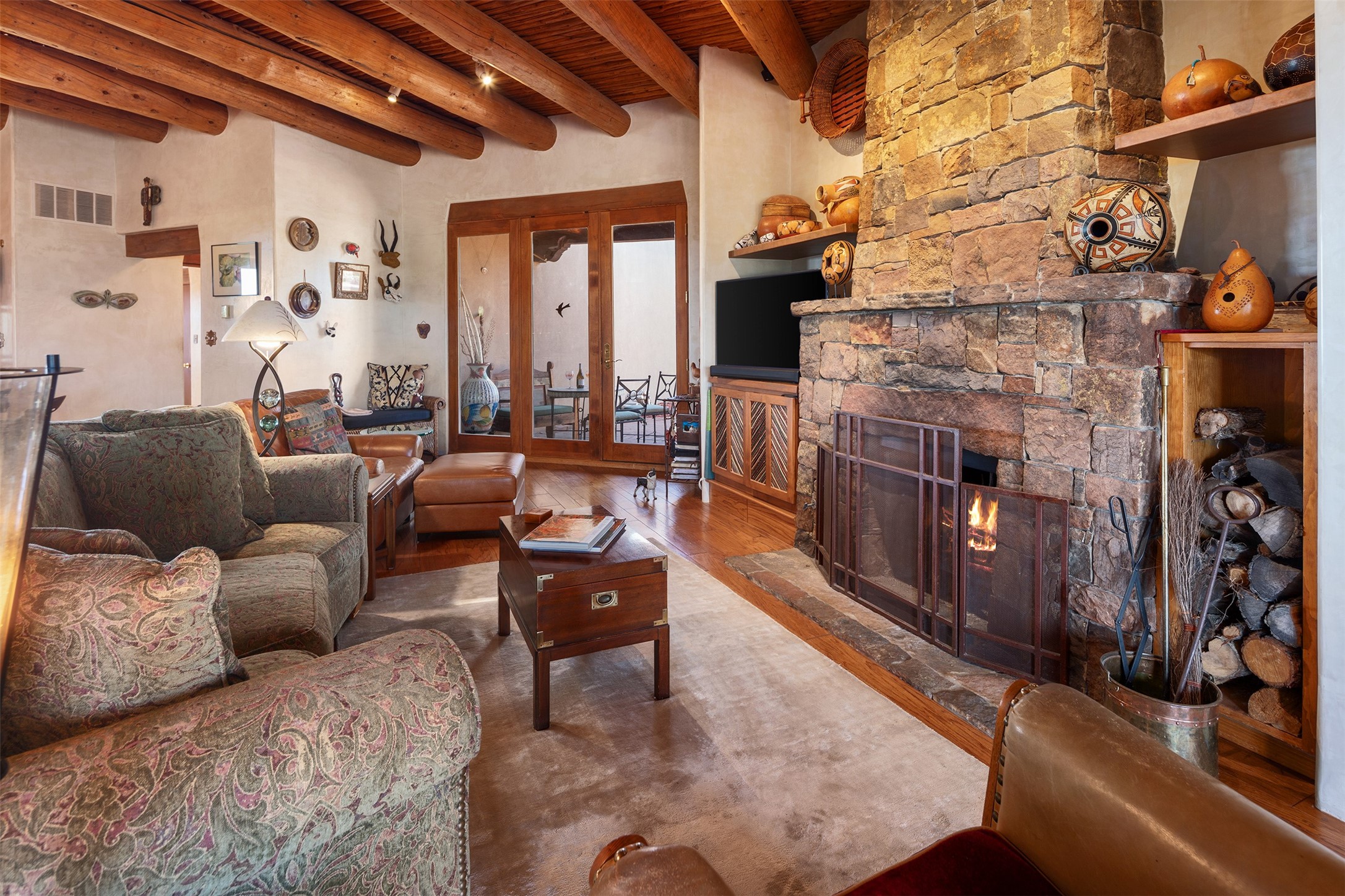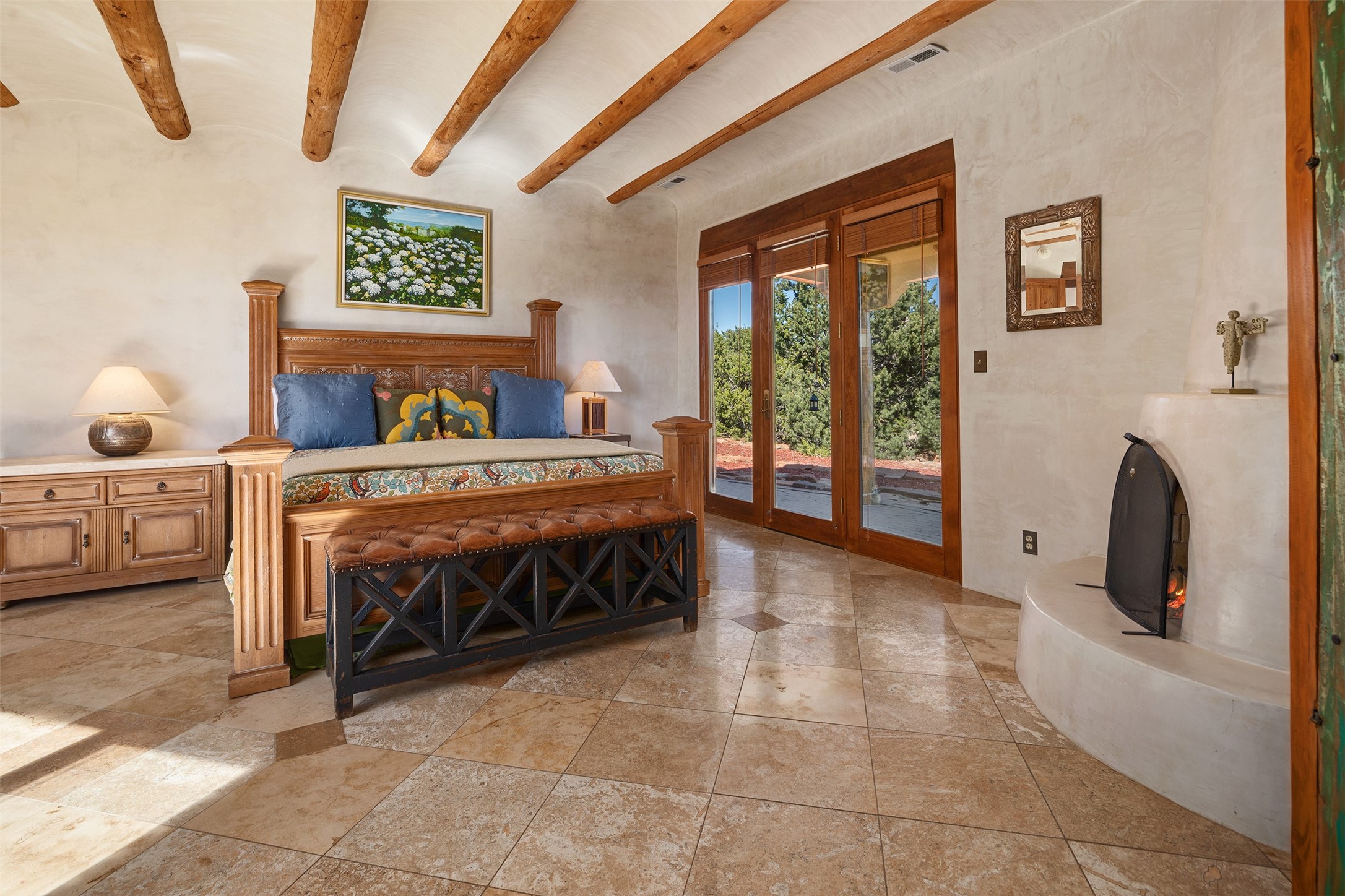 Las Campanas- Beautiful Classic Santa Fe Style on an elevated homesite with Sangre de Cristo & Sandia mountain views! Plenty of room in the developable area to add a casita with easy access from the circle driveway. Approximately 4235 sq ft & an oversized 3 car garage w/ a lot of extra storage. Throughout the home find beautiful hard plastered walls, traditional treatments with vigas, latillas, & coved ceilings, wood & travertine stone floors. Primary suite with an exquisite bath w/ timeless Talivera Tile, 2 water closets, 2 vanities, a large tub and separate shower and 2 walk-in closets. Guest bedrooms are spacious, en-suite, all with doors to the outside courtyards. Handsome office with Kiva FP & built-in bookshelves. Expansive Great Room with a large fireplace and dining area, awash in natural light, flowing to the inviting kitchen w/ bar area & connected family room w/ FP & French doors opening to the back portal-sure to become one of your favorite spots-with Sangre mountain views & outdoor fireplace. Radiant in-floor heat & central forced air AC. This home has a prime location in Estate 2- close to the Santa Fe Plaza & shopping. Membership to the Club at Las Campanas is optional, it is an additional investment, by invitation, & handled through The Club. Amenities are numerous & World Class. Come see this blend of privacy, grace, and beauty! 24hr security & paramedics. Look at video!