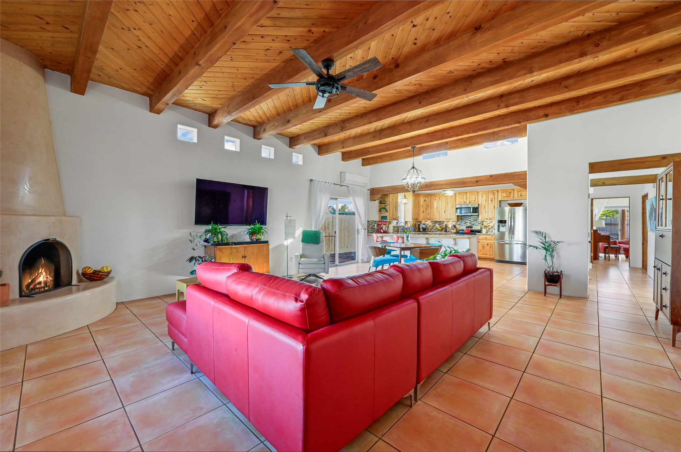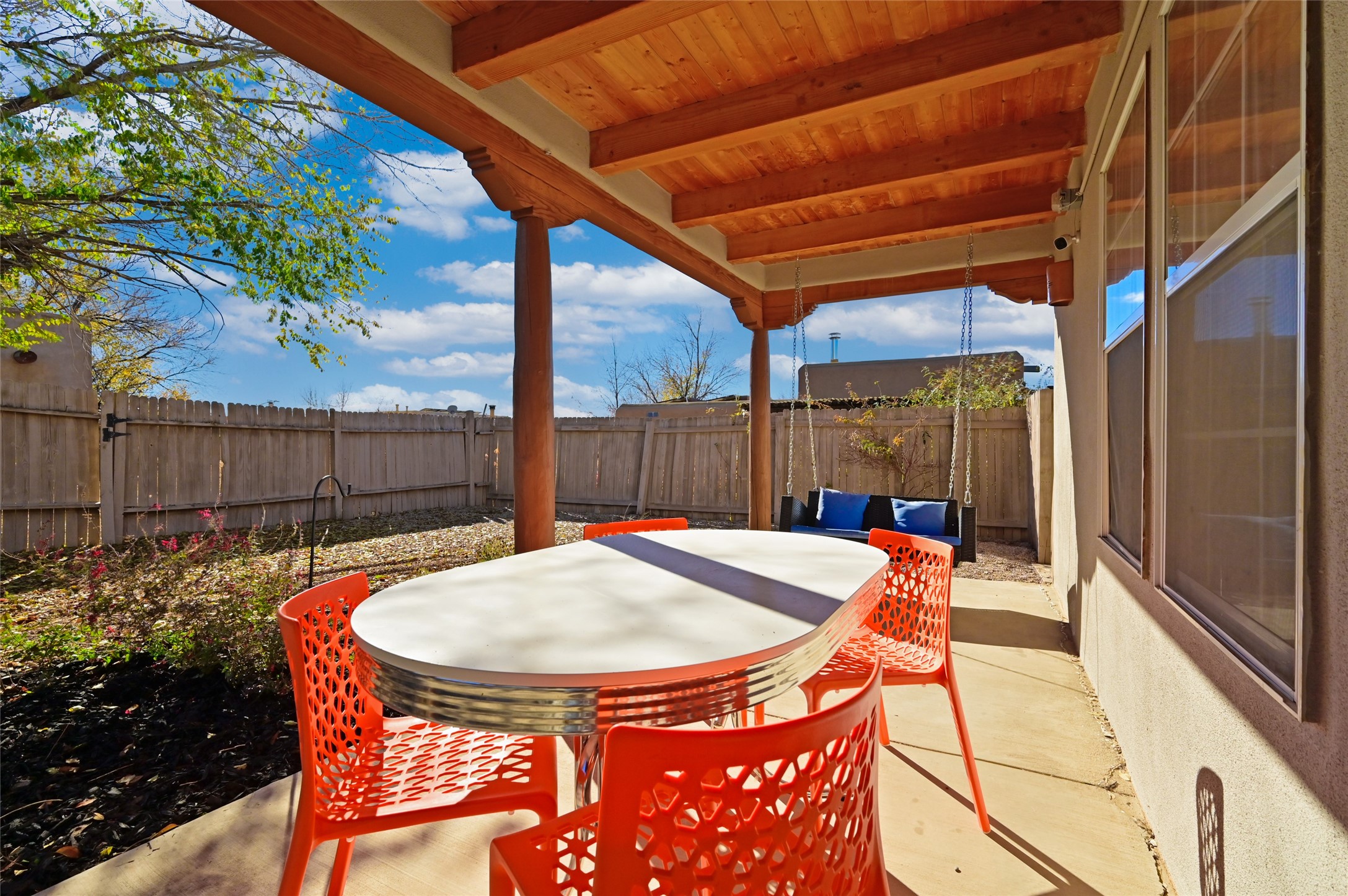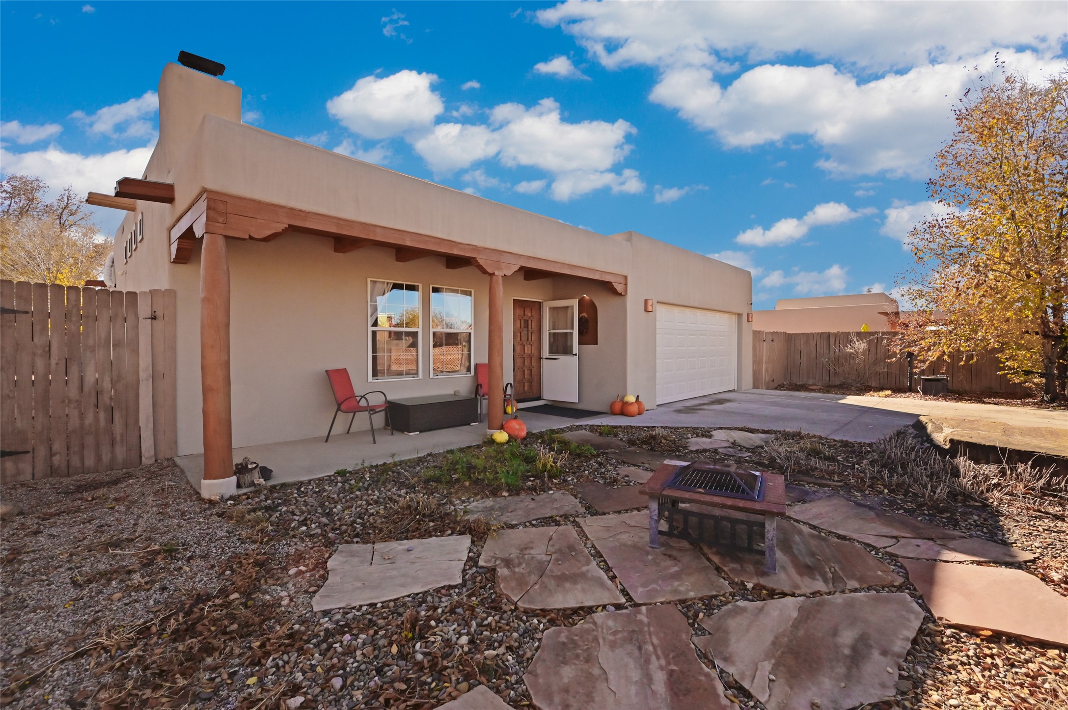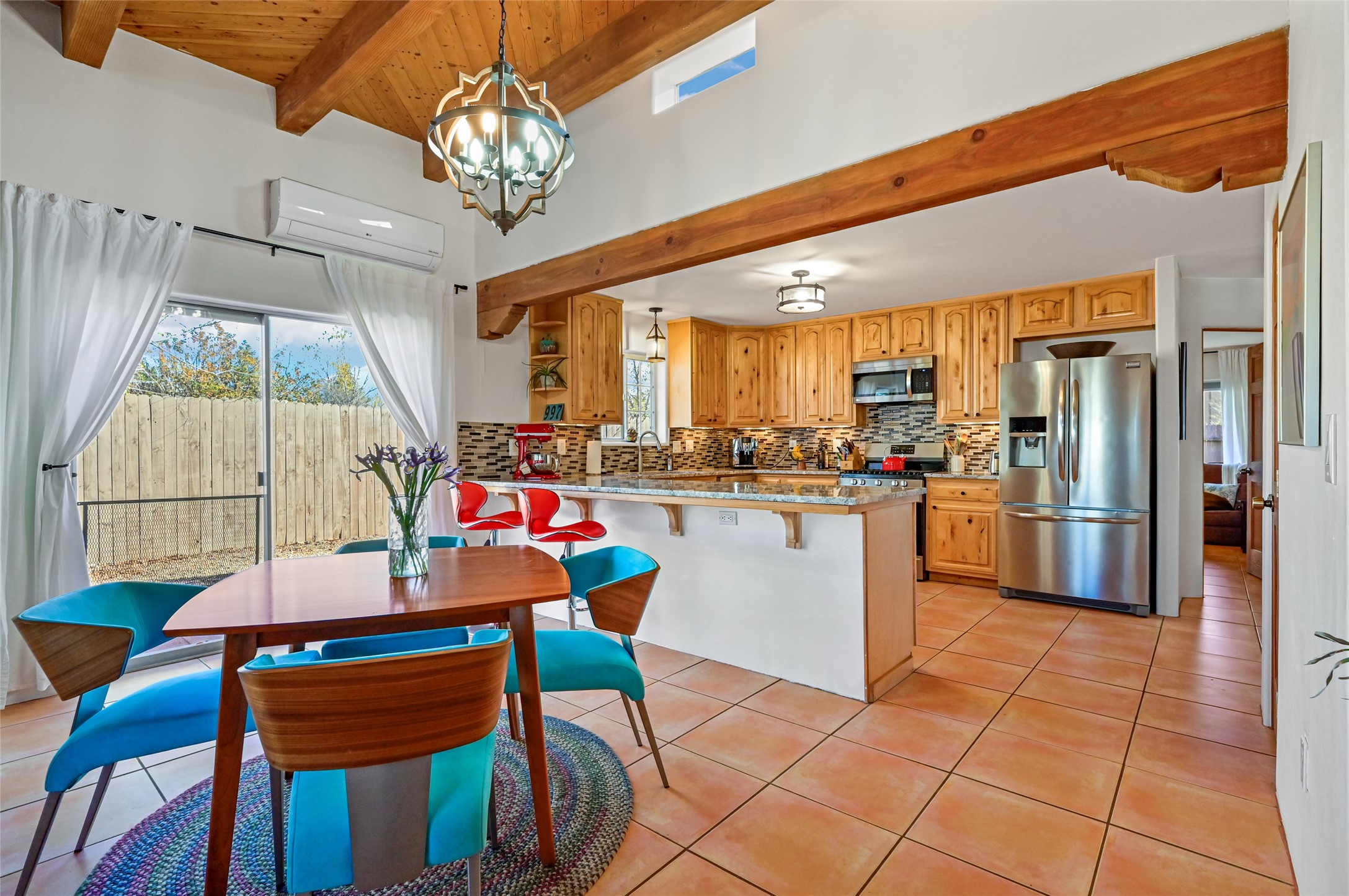 You will be delighted the minute you walk into this move in ready gem. Loaded with Santa Fe style, yet with all the modern touches, tile floors, mini-splits, granite counters, SS appliances. The open flow from living area to dining room and kitchen is perfect for gatherings with family and friends. The Owner's suite and oversized second bedroom are situated allowing for access to enjoy the backyard covered patio. The location is central to trails, shopping, the plaza, and fine dining, and located just down the street you can enjoy the neighborhood park. Once you see this home, I think you will agree it has a lot to offer.