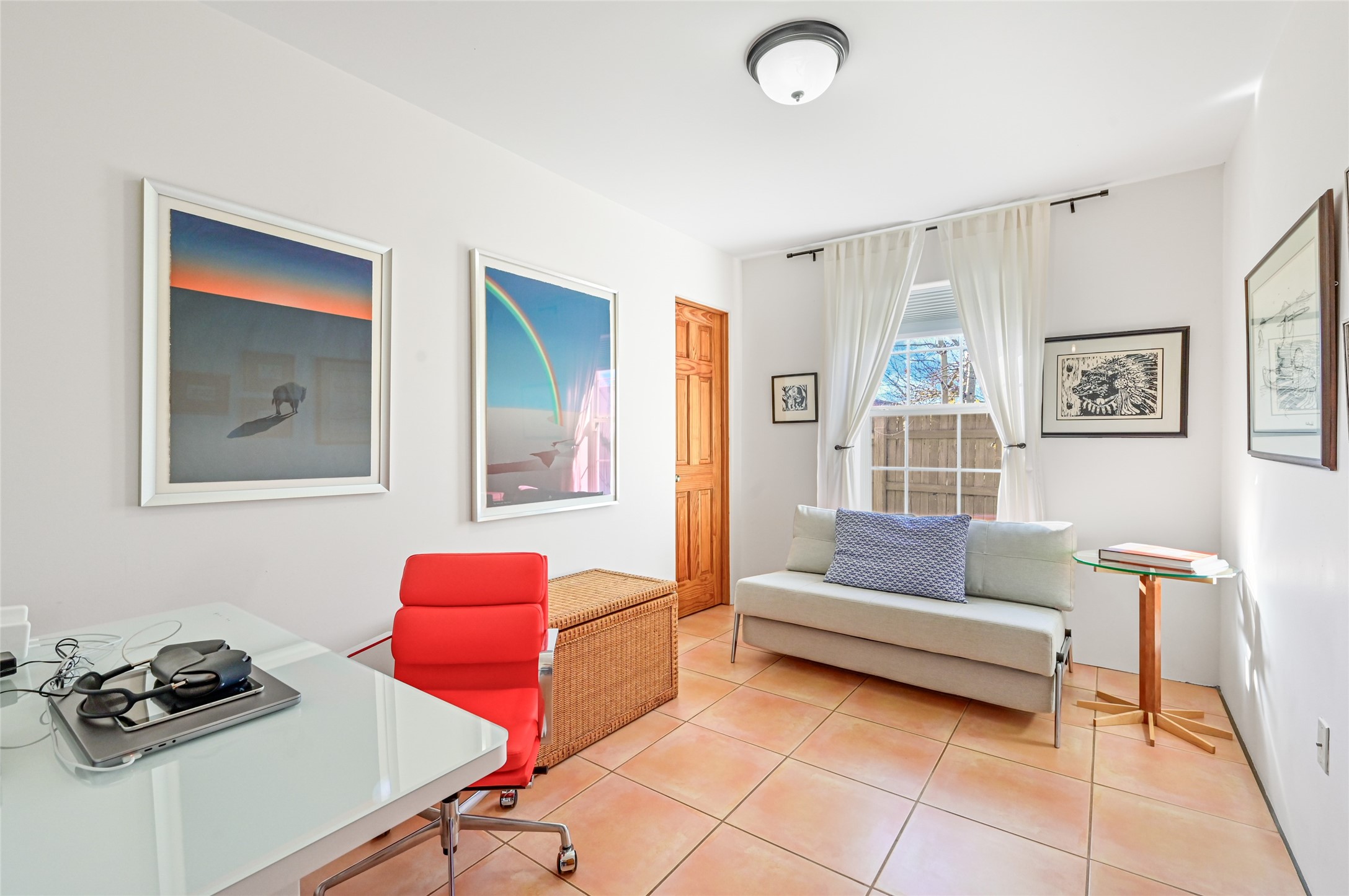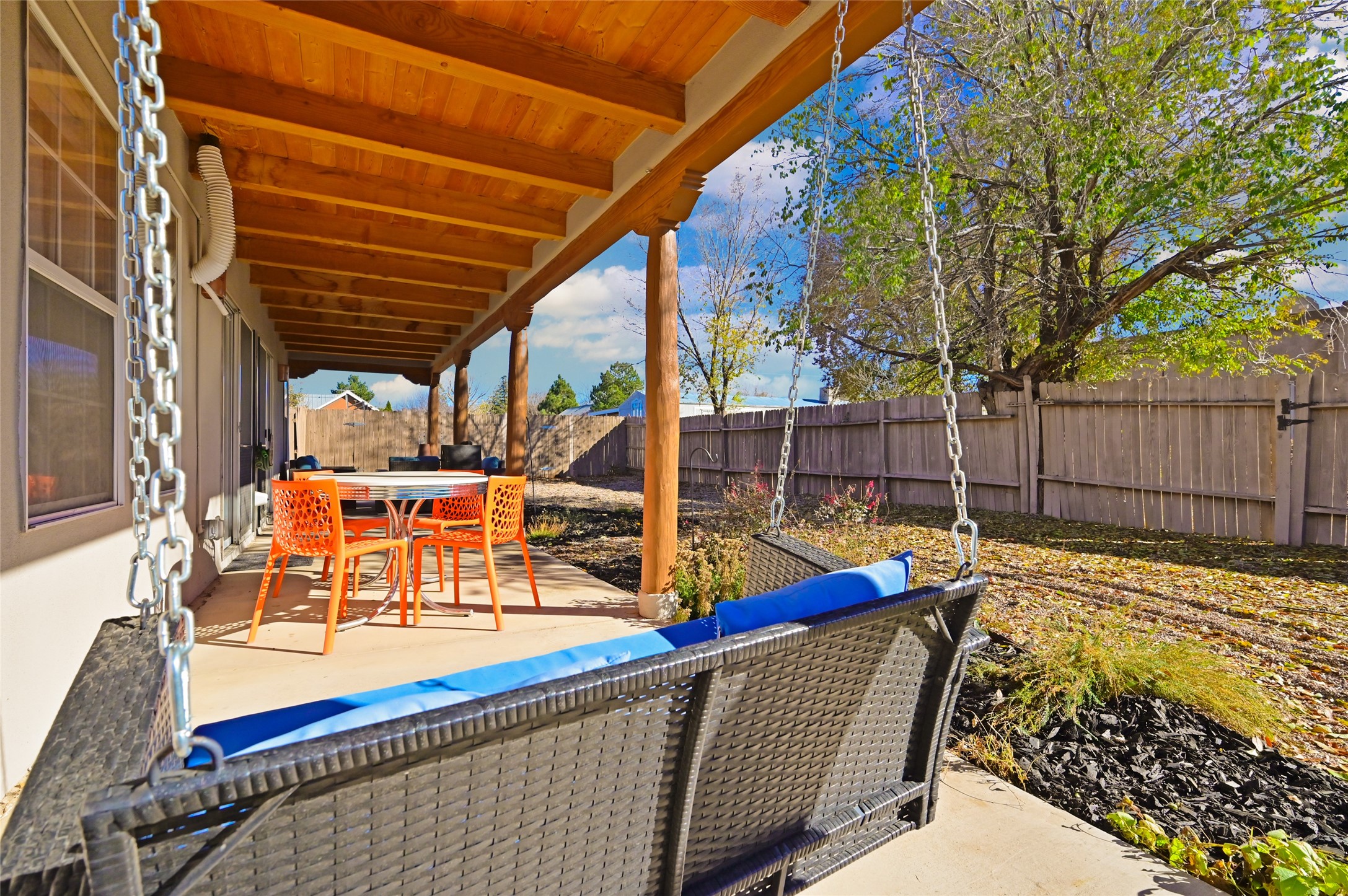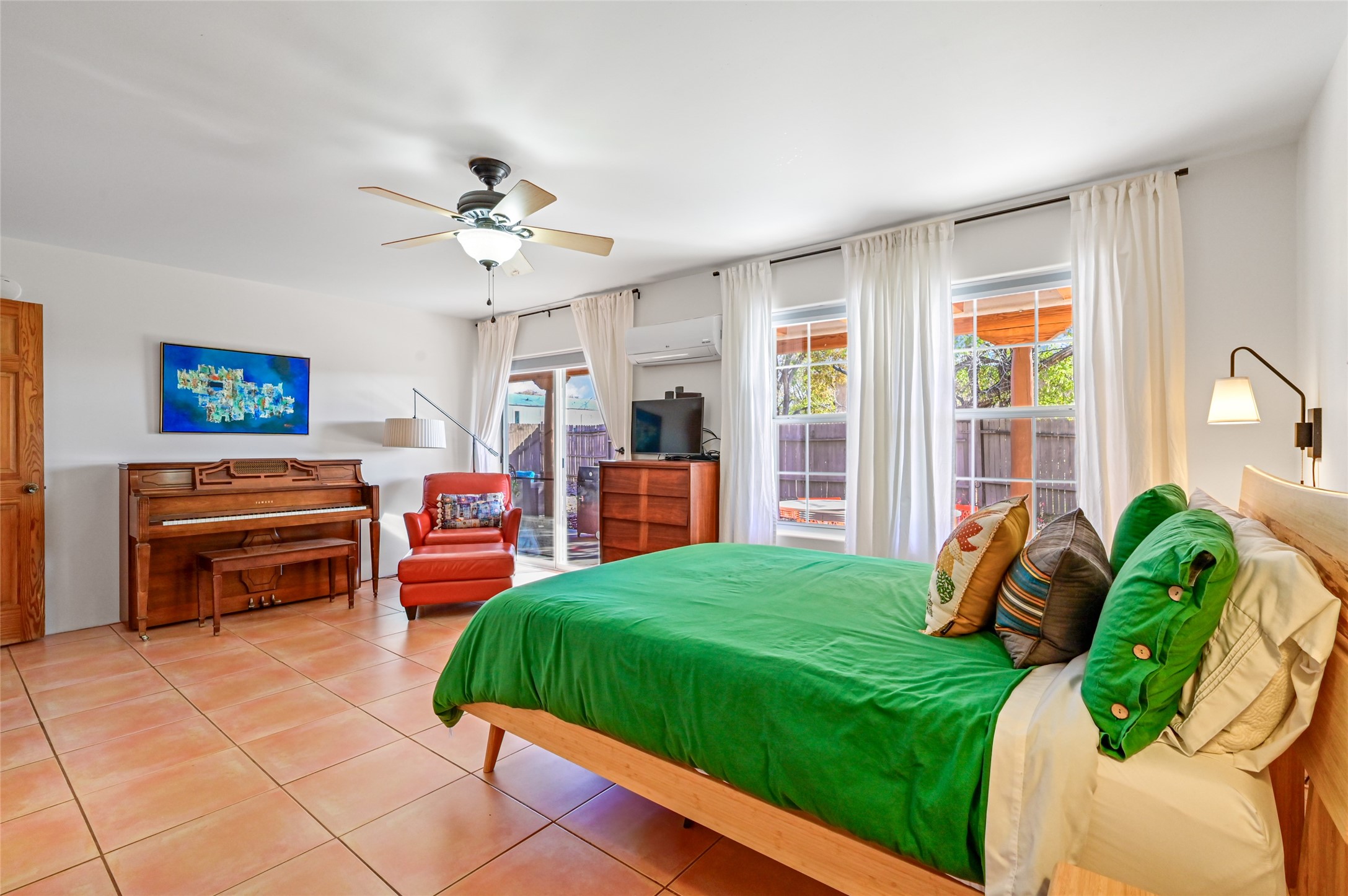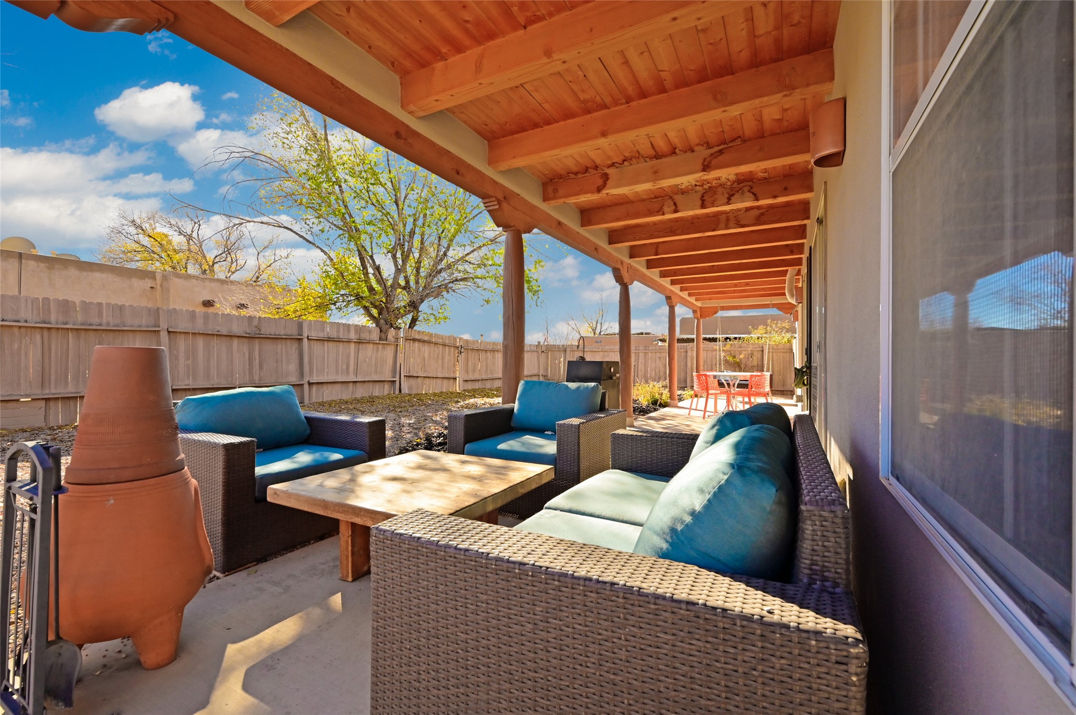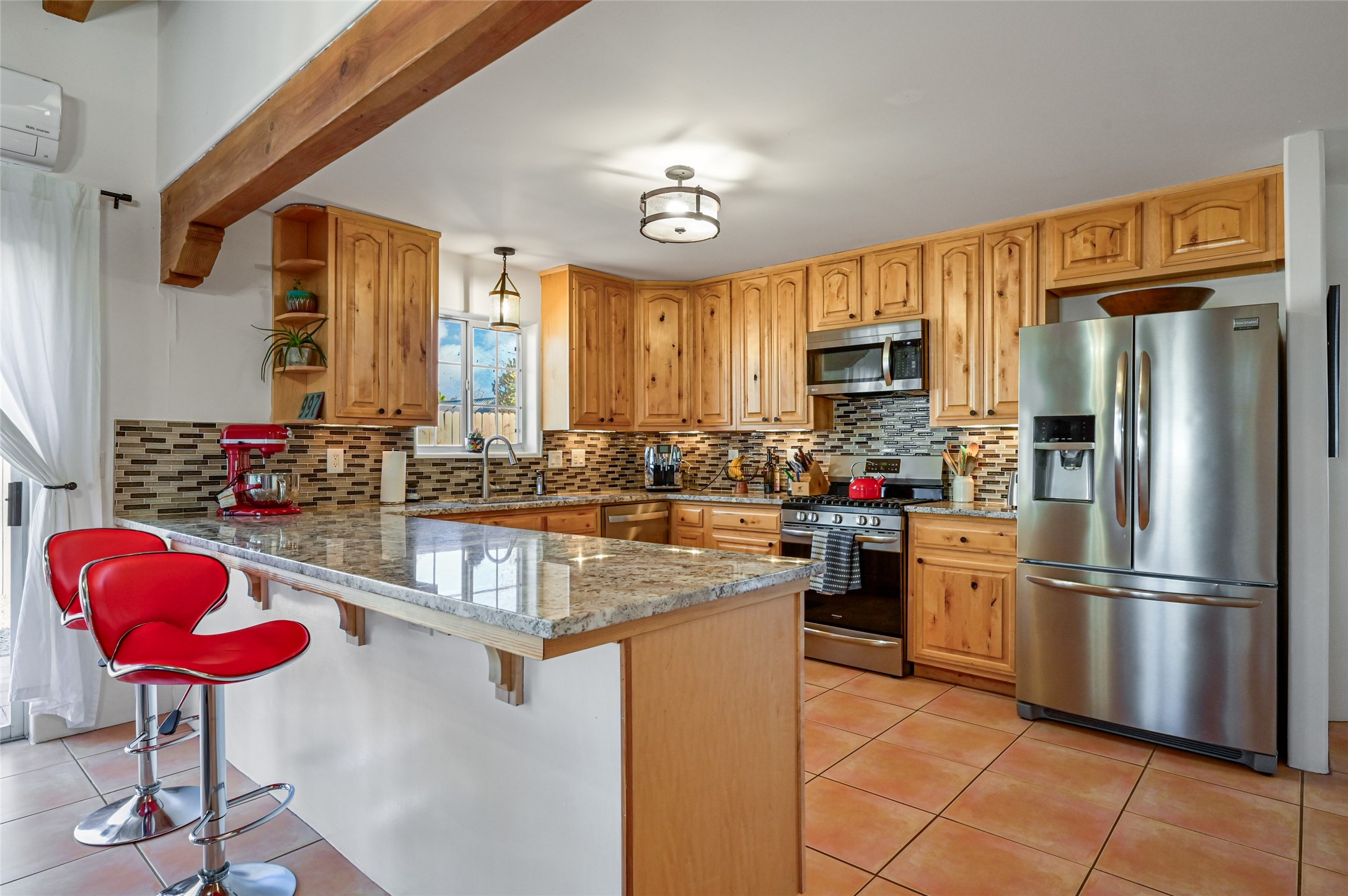You will be delighted the minute you walk into this move in ready gem. Loaded with Santa Fe style, yet with all the modern touches, tile floors, mini-splits, granite counters, SS appliances. The open flow from living area to dining room and kitchen is perfect for gatherings with family and friends. The Owner's suite and oversized second bedroom are situated allowing for access to enjoy the backyard covered patio. The location is central to trails, shopping, the plaza, and fine dining, and located just down the street you can enjoy the neighborhood park. Once you see this home, I think you will agree it has a lot to offer.