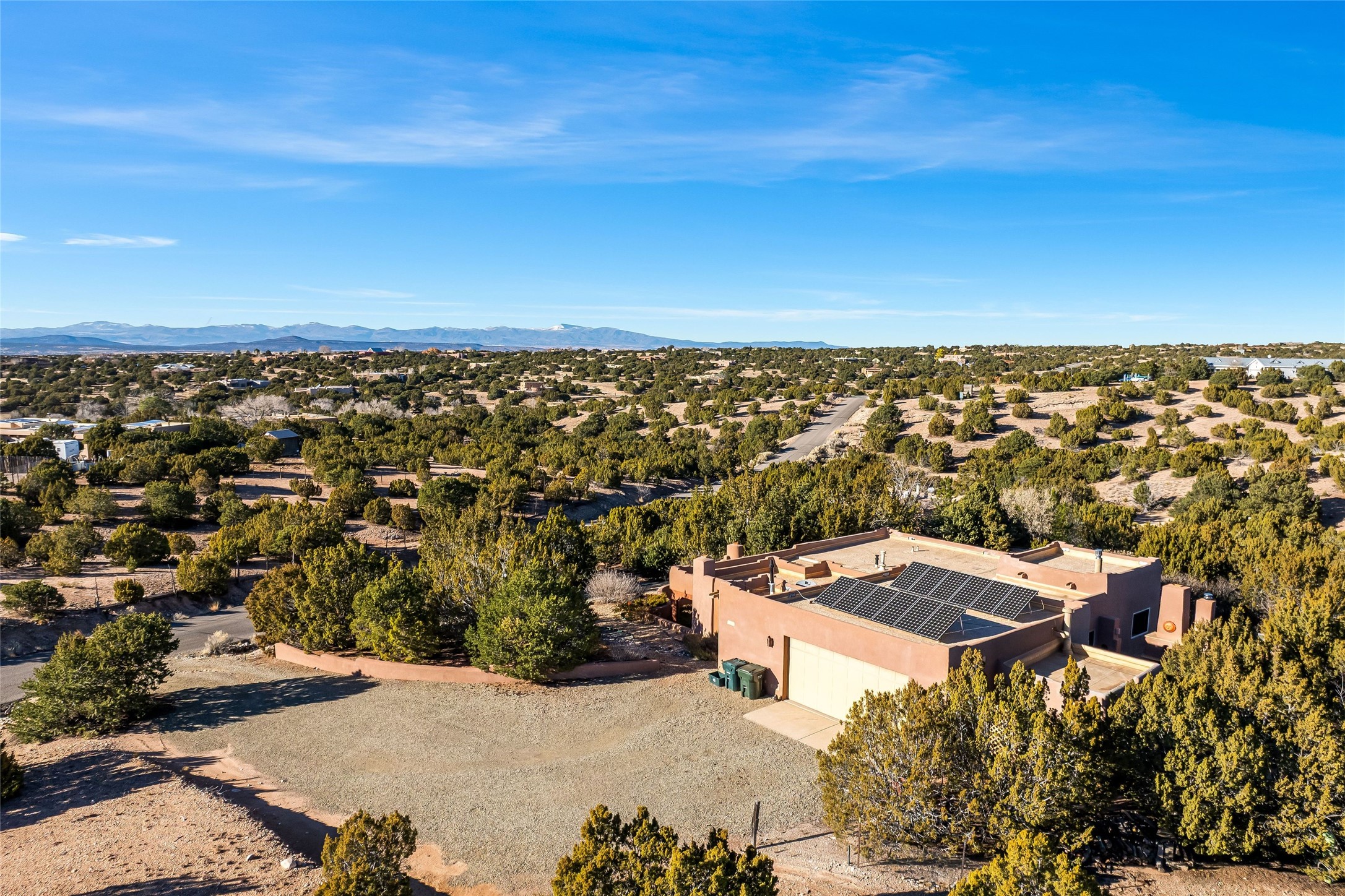 Sited within the serene landscapes of Santa Fe, this 3-bedroom 3 bath home offers a blend of comfort, style, and sustainability. This 2.5-acre property, surrounded by the natural beauty of Tres Arroyos, is within easy access to the vibrant energy of Santa Fe Plaza, allowing you to enjoy both tranquility and the lively culture of the city. The open living and dining area features exquisite Saltillo tile floors, wood beams, and a cozy wood-burning fireplace, creating a warm and inviting atmosphere. The kitchen is equipped with a center island and breakfast bar, double sink, and ample storage space. Retreat to the primary bedroom, which features beautiful wood floors, a kiva fireplace, direct access to the back portal and ensuite bath. A standout feature of this property is the small, attached studio, complete with a propane gas fireplace. This space can serve as an art studio, or home office, providing flexibility to suit your needs. The exterior of the home features two outdoor fireplaces and a pizza oven--perfect for hosting gatherings under the stars. Embrace eco-friendly living with green features that include solar panels, an instant hot water heater, and a drip irrigation system. Two-car garage. Easy access to NM-599, Santa Fe Regional Airport, restaurants, shopping, and medical.
