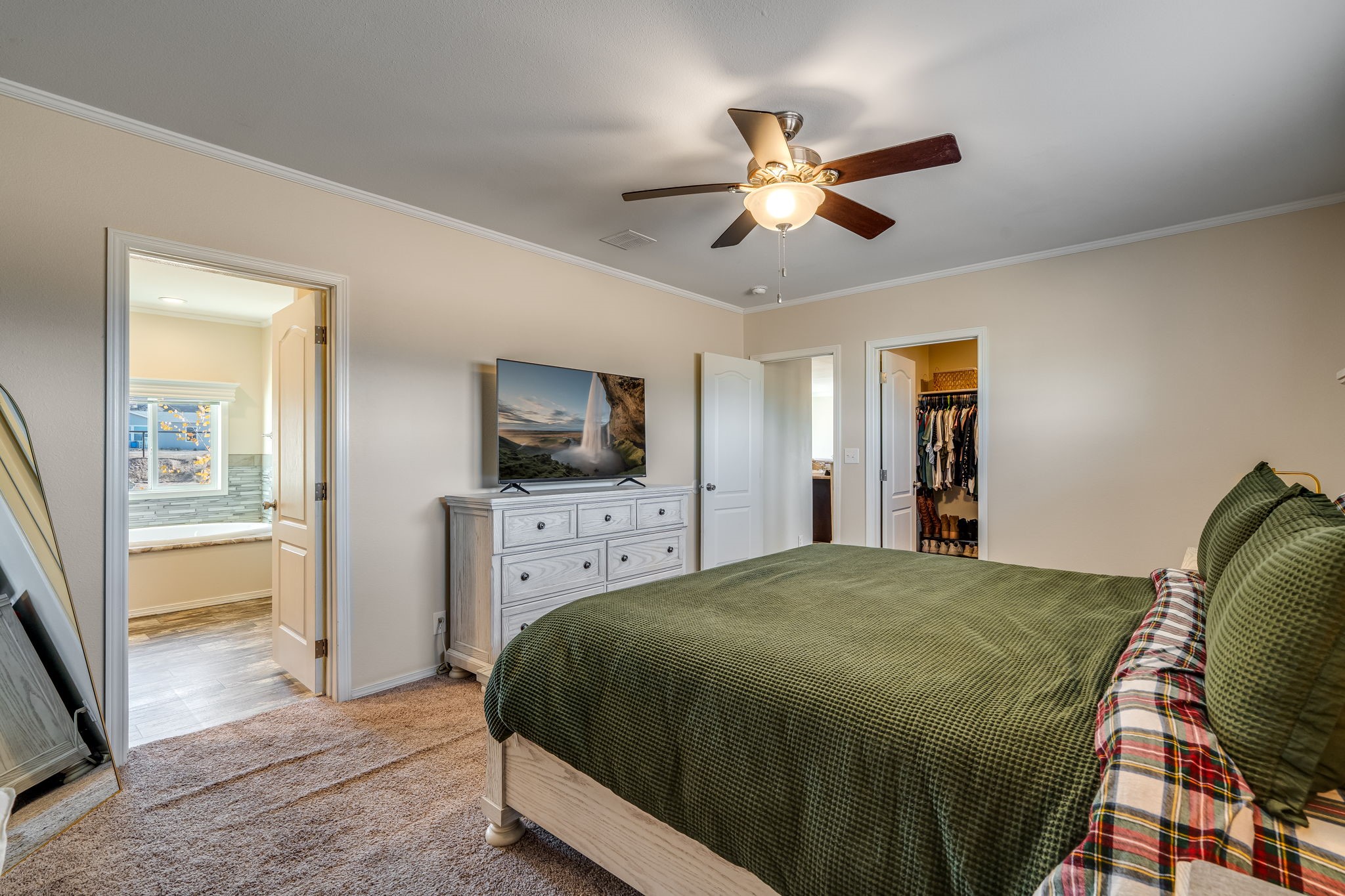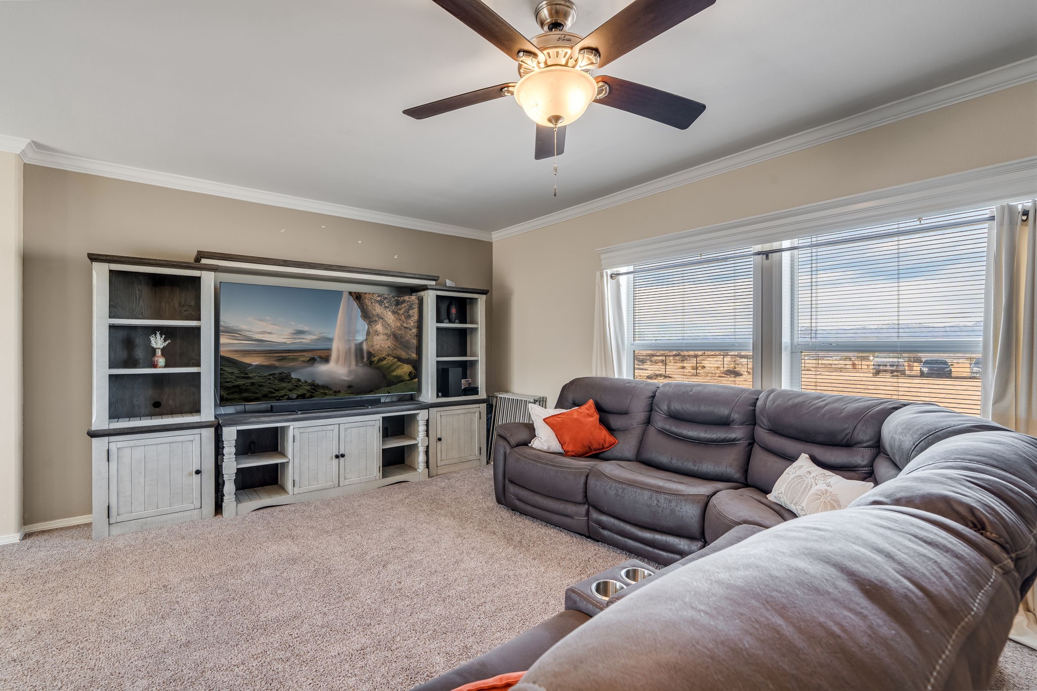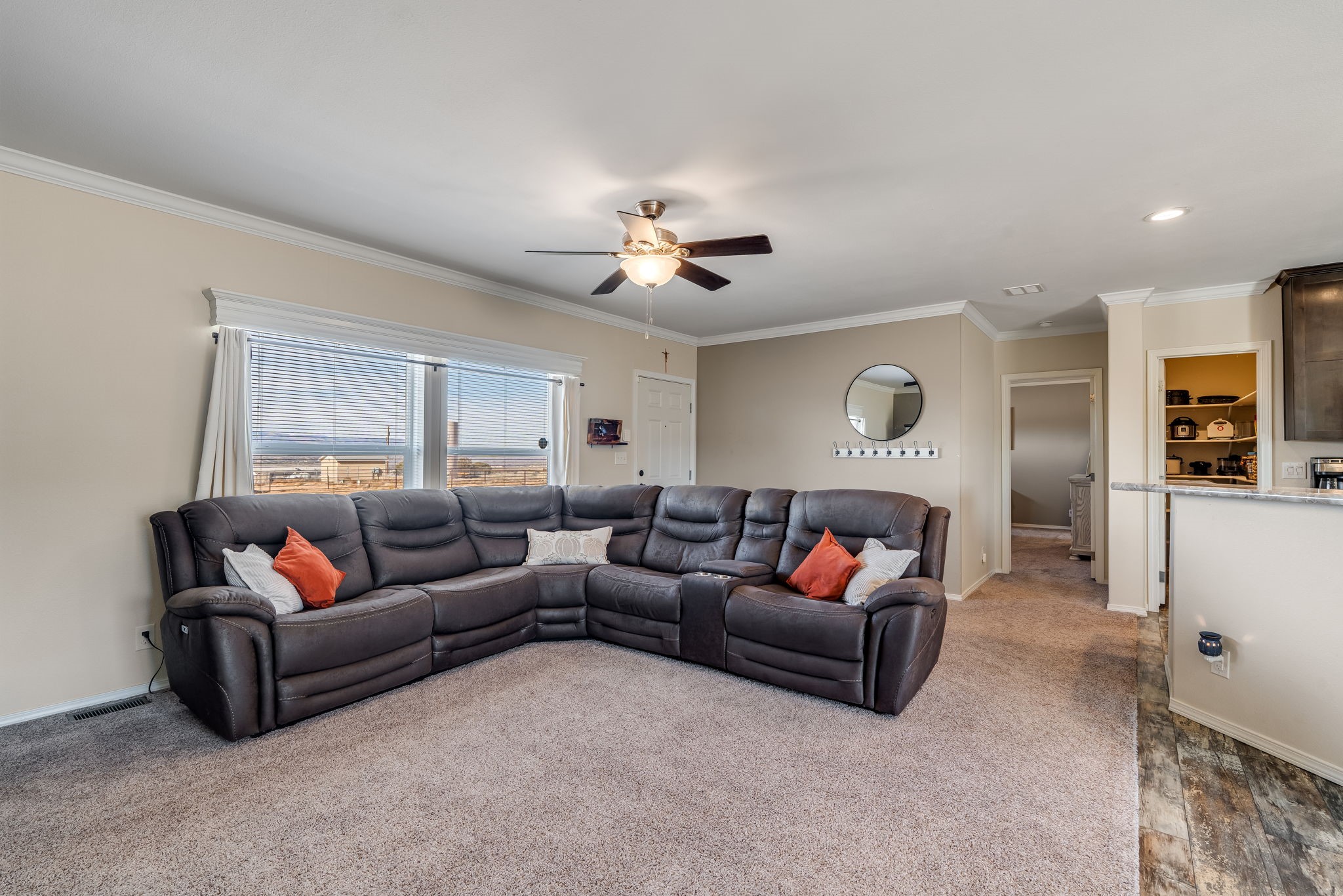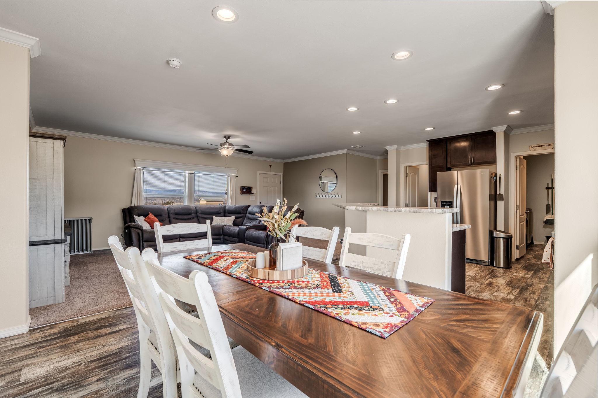 Enjoy wide open views of the Espaola Valley from this elevated .93-acre property. This 2020 modular home offers a comfortable layout with an open living, dining, and kitchen area designed for everyday living and entertaining. The kitchen features abundant cabinet space, an oversized pantry, and like-new appliances. A separate utility room provides additional storage and access to the backyard.The primary suite includes a walk-in closet and full bath with double sinks and a large soaking tub. Two additional bedrooms are located on the opposite side of the home for added privacy, each with its own walk-in closet. Refrigerated air keeps the home cool in the summer, and crown molding, recessed lighting, and modern finishes add a polished touch.The fully fenced property includes a metal pipe fence surrounding the entire lot and offers both sunrise and sunset views, along with nearby access to local trails. Convenient commute to Los Alamos and serviced by Santa Fe County water.