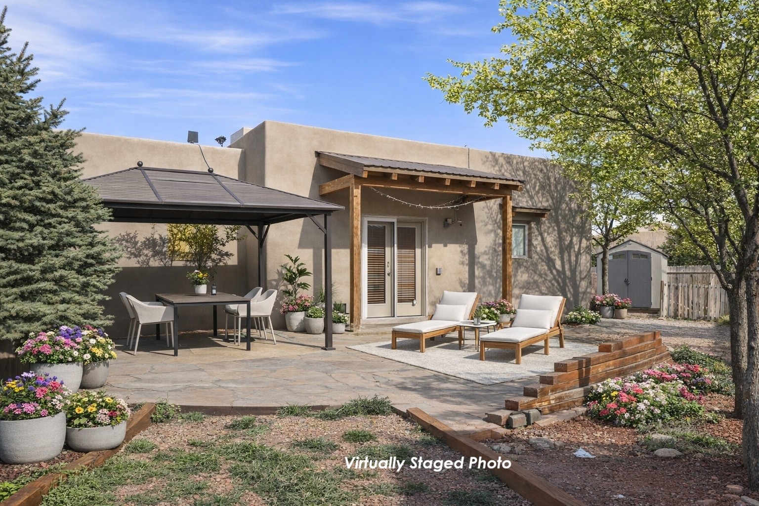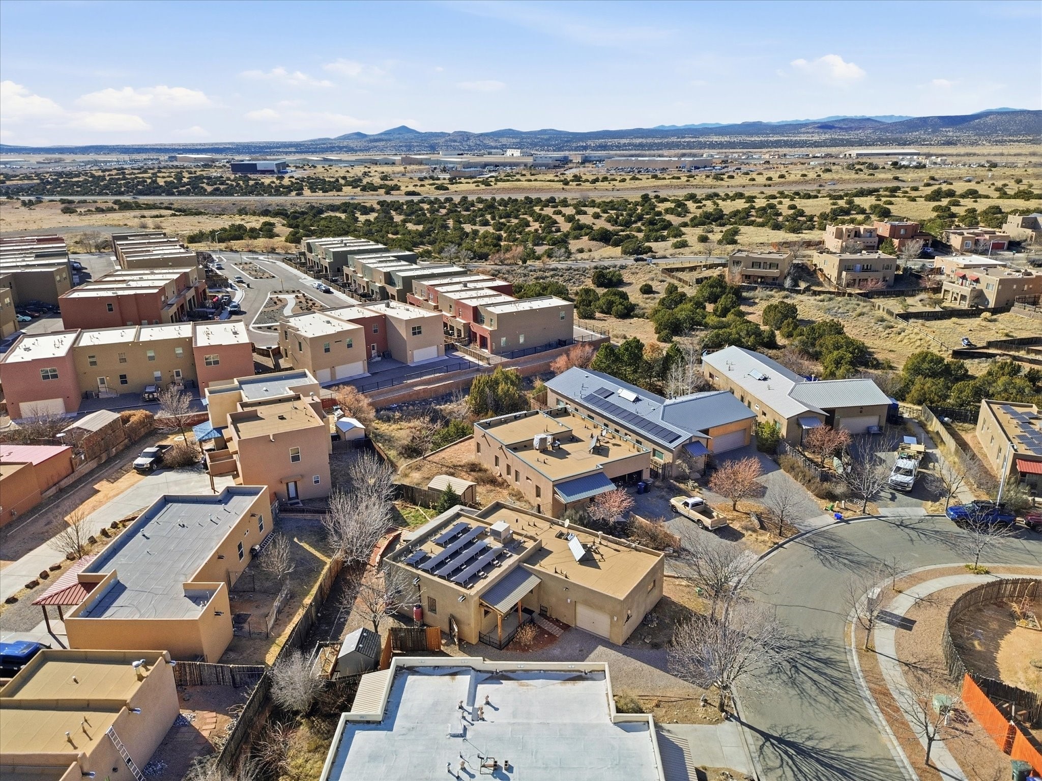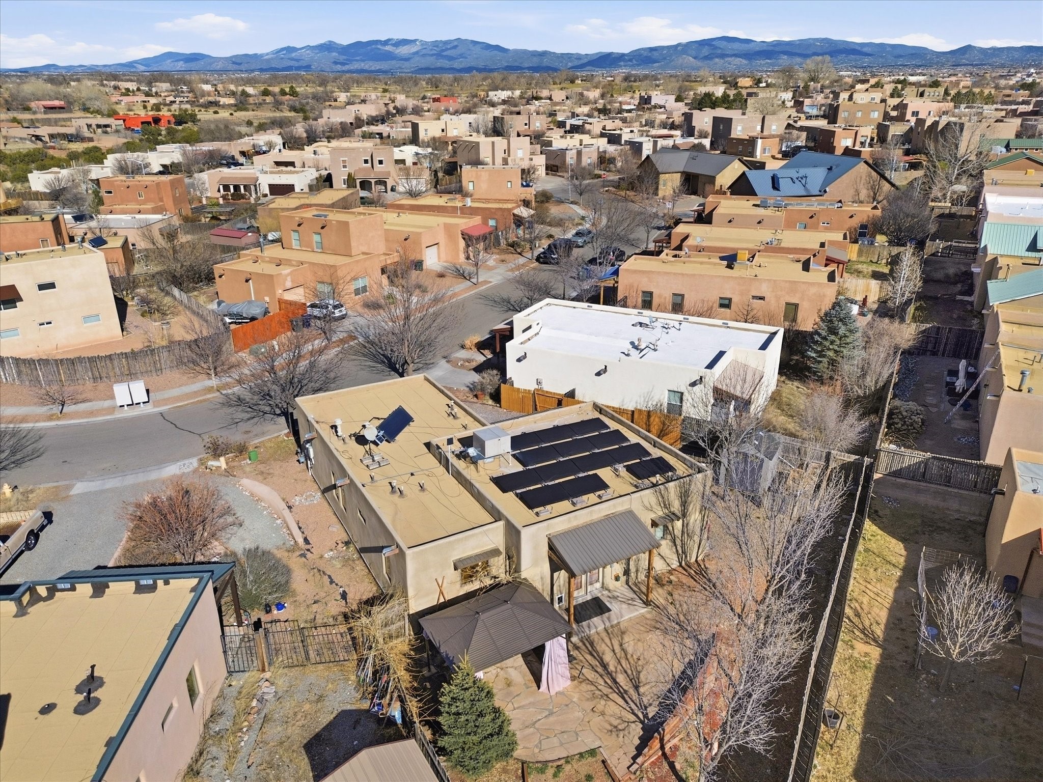 Not far from Santa Fe Country Club, this home offers a blend of comfort, style, renewable energy and Affordability. The practical open floor concept seamlessly connects the kitchen, living room, and dining area, allowing natural light to fill the space and creating a warm, inviting atmosphere.From the main entrance, you're greeted with thoughtful flow--to your right, a private kitchen area featuring ample cabinets for storage, a dishwasher, gas stove, and fridge, and direct access to the laundry room, making daily chores effortless. From the kitchen, step straight into the living space, which opens through a small, covered portal to the backyard with a flagstone patio and pergola, ideal for outdoor gatherings or peaceful afternoons in the garden. The home's two wings provide privacy and functionality: Primary suite: A serene retreat with an attached bathroom and open walk-in closet, offering comfort and style in equal measure. Second wing: A hallway leading to two additional bedrooms and a full bathroom with direct access from the second bedroom, perfect for family or guests. Additional highlights include radiant heating to keep you cozy during chilly winters, tile flooring to keep feet cool in summer, and an attached garage accessible via the kitchen through the pantry/washroom for easy grocery unloading. Located close to Highway 599 for convenient commuting to Santa Fe downtown, Los Alamos, Albuquerque and airport access, this home is a true Santa Fe gem, combining indoor-outdoor living, natural light, and thoughtful design in a tranquil neighborhood setting.