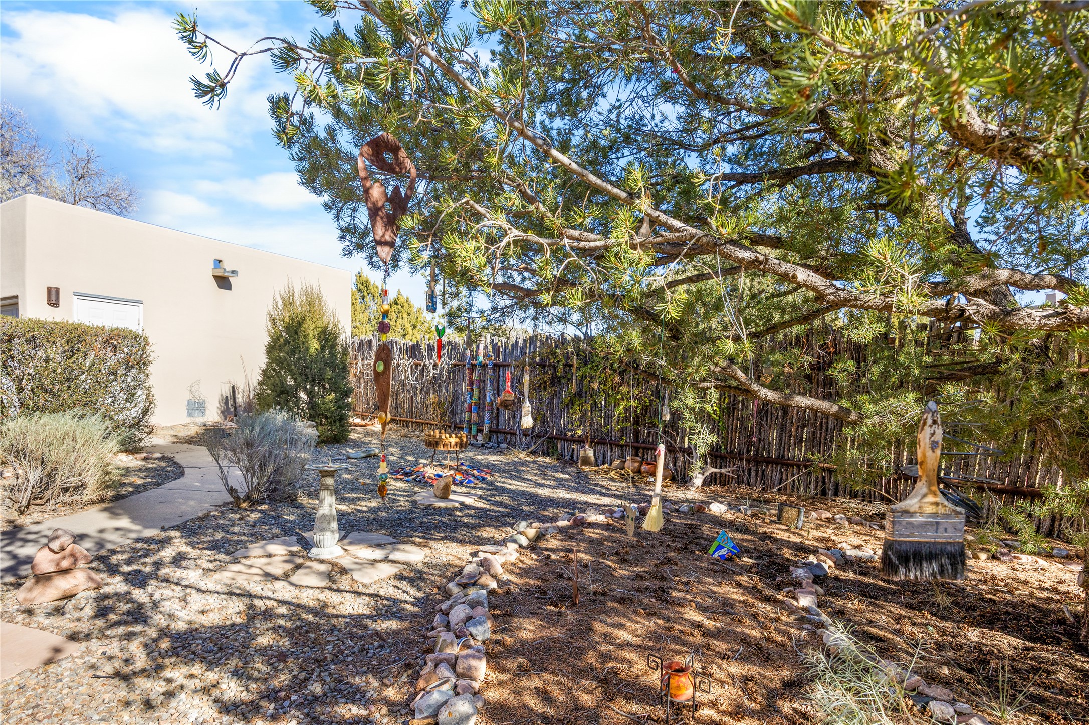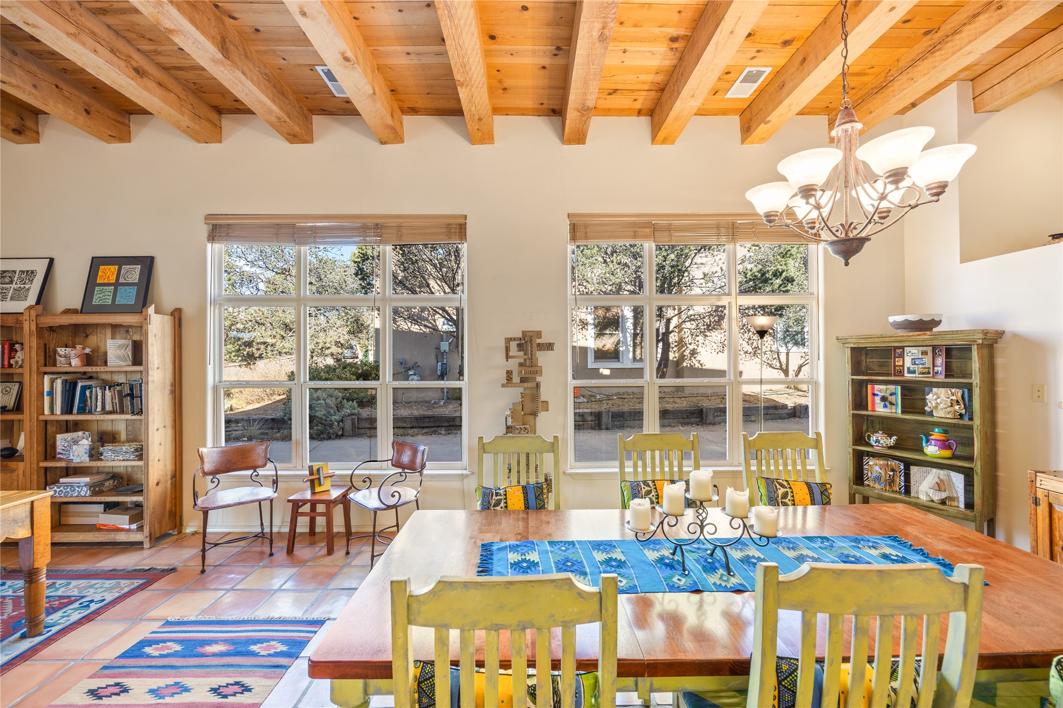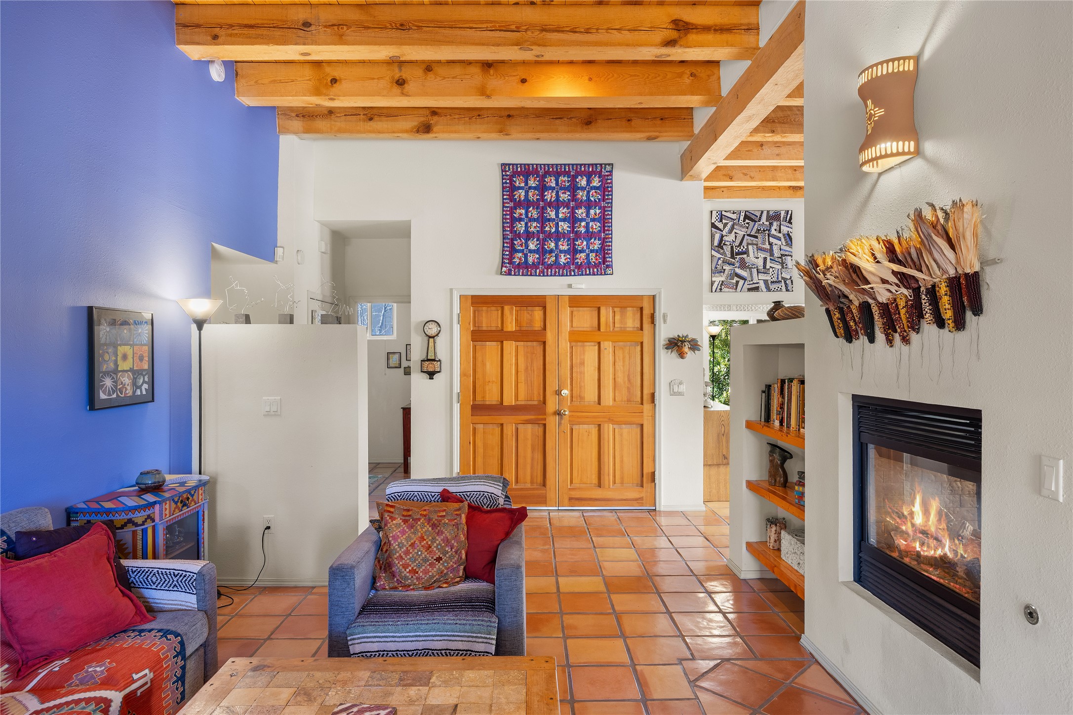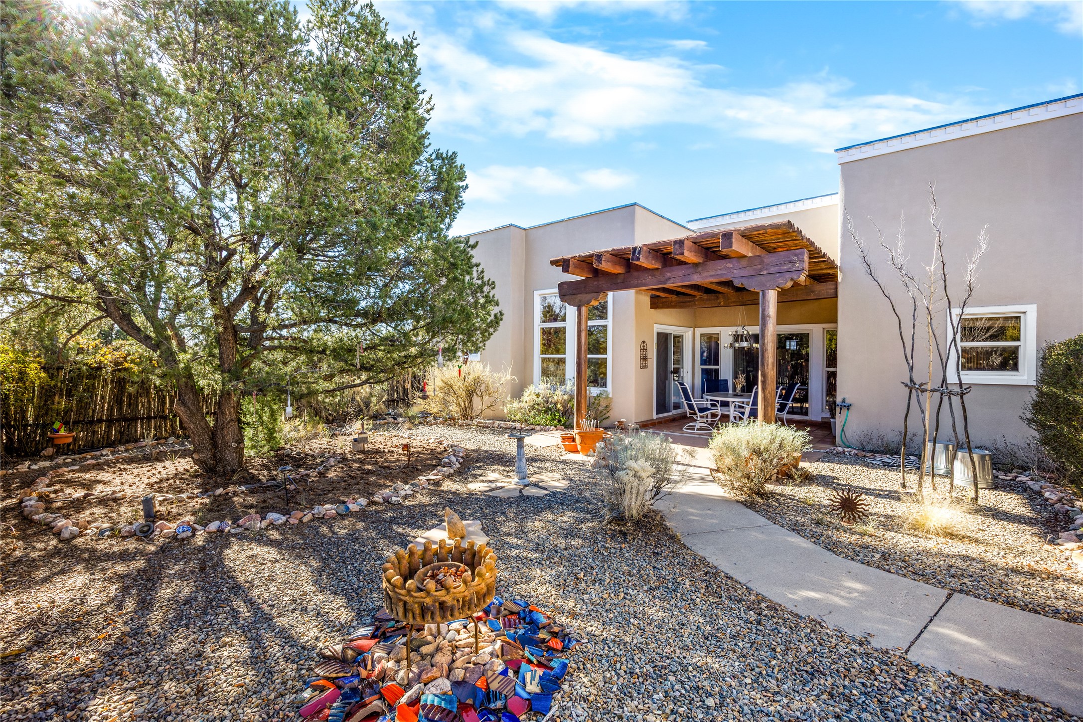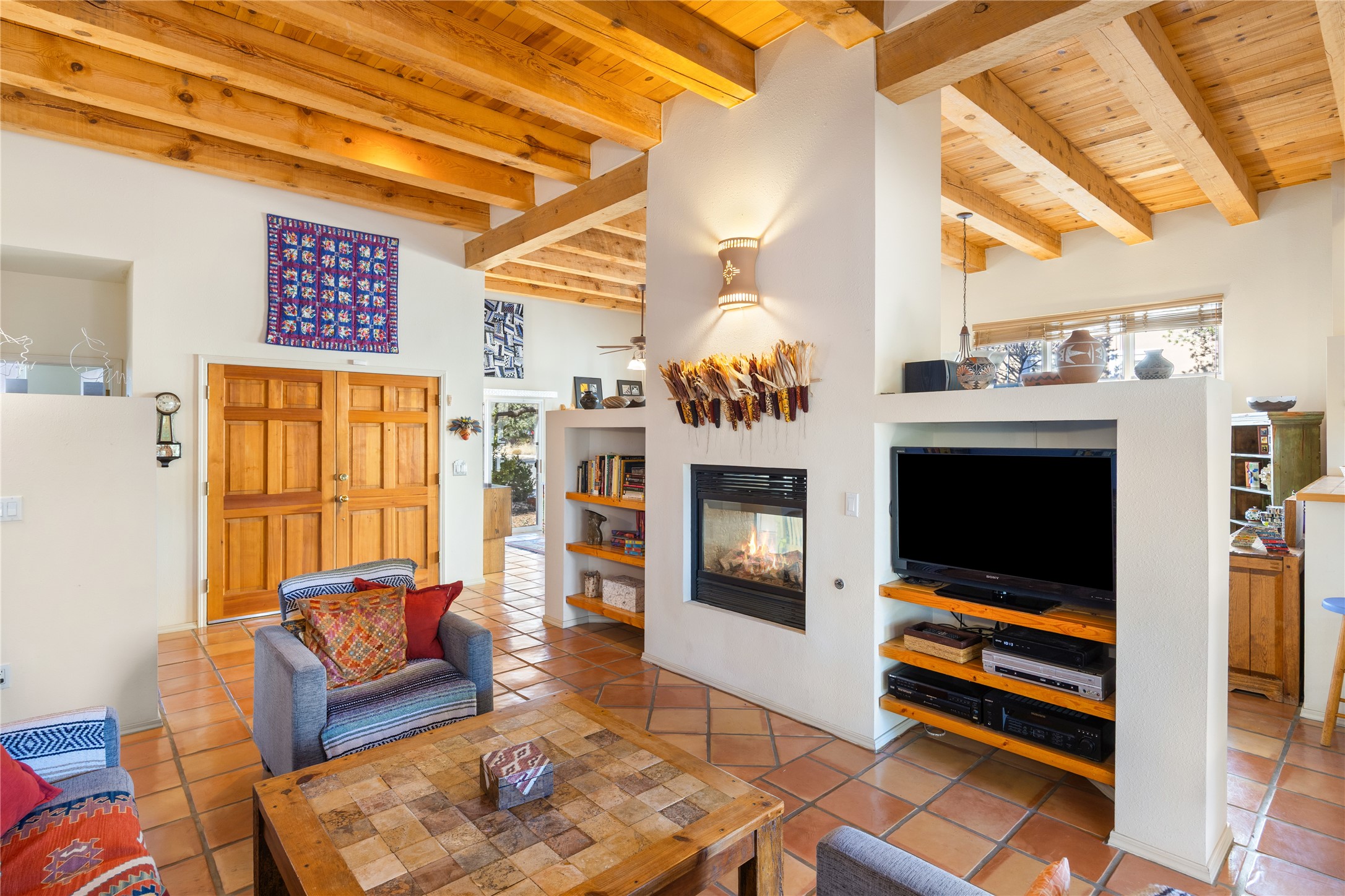 Get ready for this lovely, well cared for single level home in Nava Ade! Sited on a sizeable lot bordered on two sides by green space and adjacent to the walking path, this property features all the interior and exterior comforts that allow for authentic Santa Fe living. Enter its spacious Living Room through a sweet portal. Enjoy high ceilings adorned with wood beams. A decorative wall, which sports a two-sided gas fireplace, separates the Living Room from the oversized open concept Dining Room/Sitting Room. A wall of tall windows with wooden blinds graces this area. Beautiful Saltillo tile flooring adds to the warmth and Southwestern vibe of these rooms. Exit the Living Room through sliders that lead to a charming portal, ideal for outdoor entertaining. The whimsical rear yard provides a delightful retreat year-round! Custom shelving in all bedroom closets, and owner-made tin accents for the home's vertical blinds are thoughtful and creative touches. In addition to miles of walking paths, enjoy the community clubhouse, pool and gym. This much loved, special home will enchant its next lucky owner.
