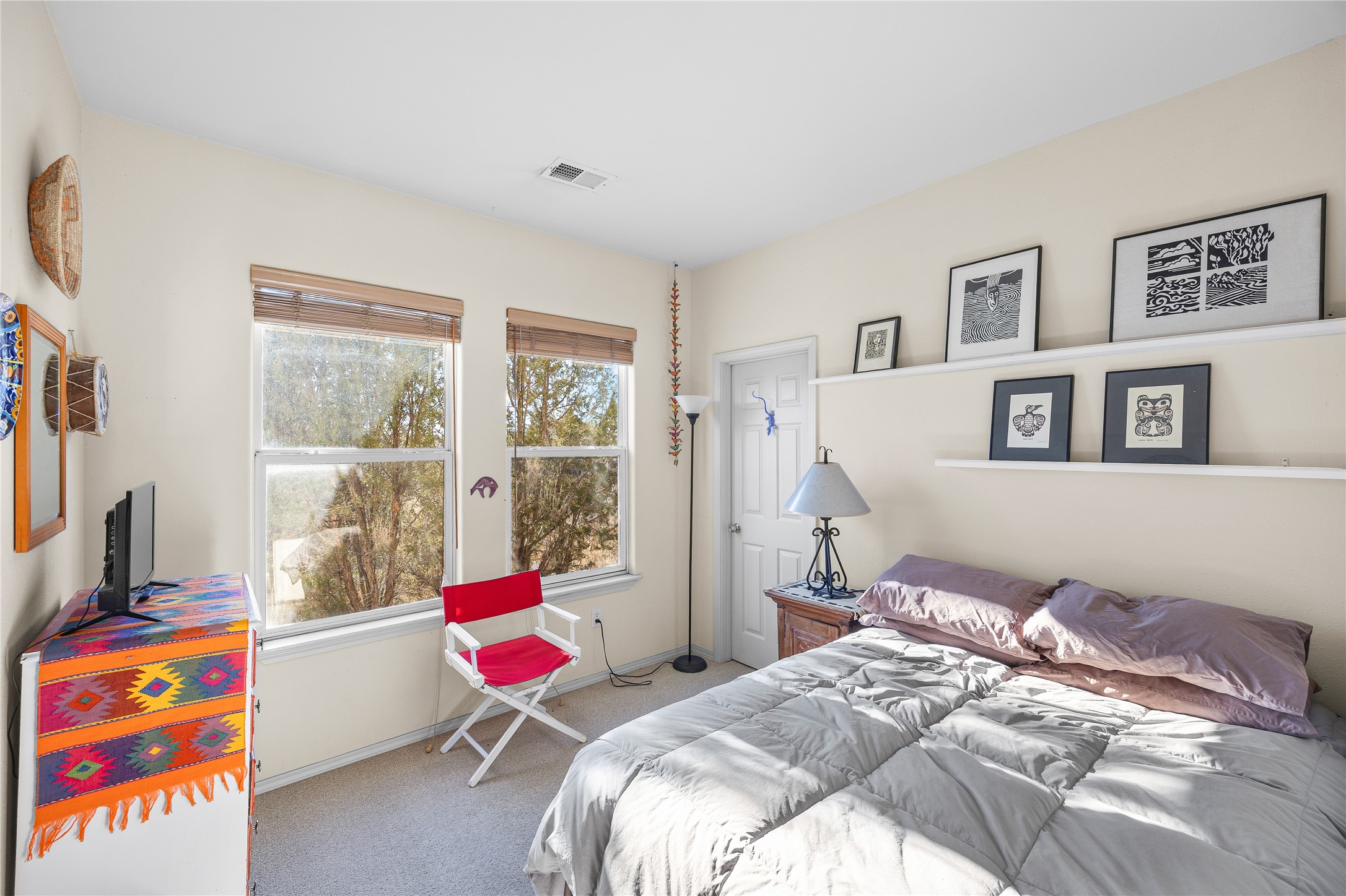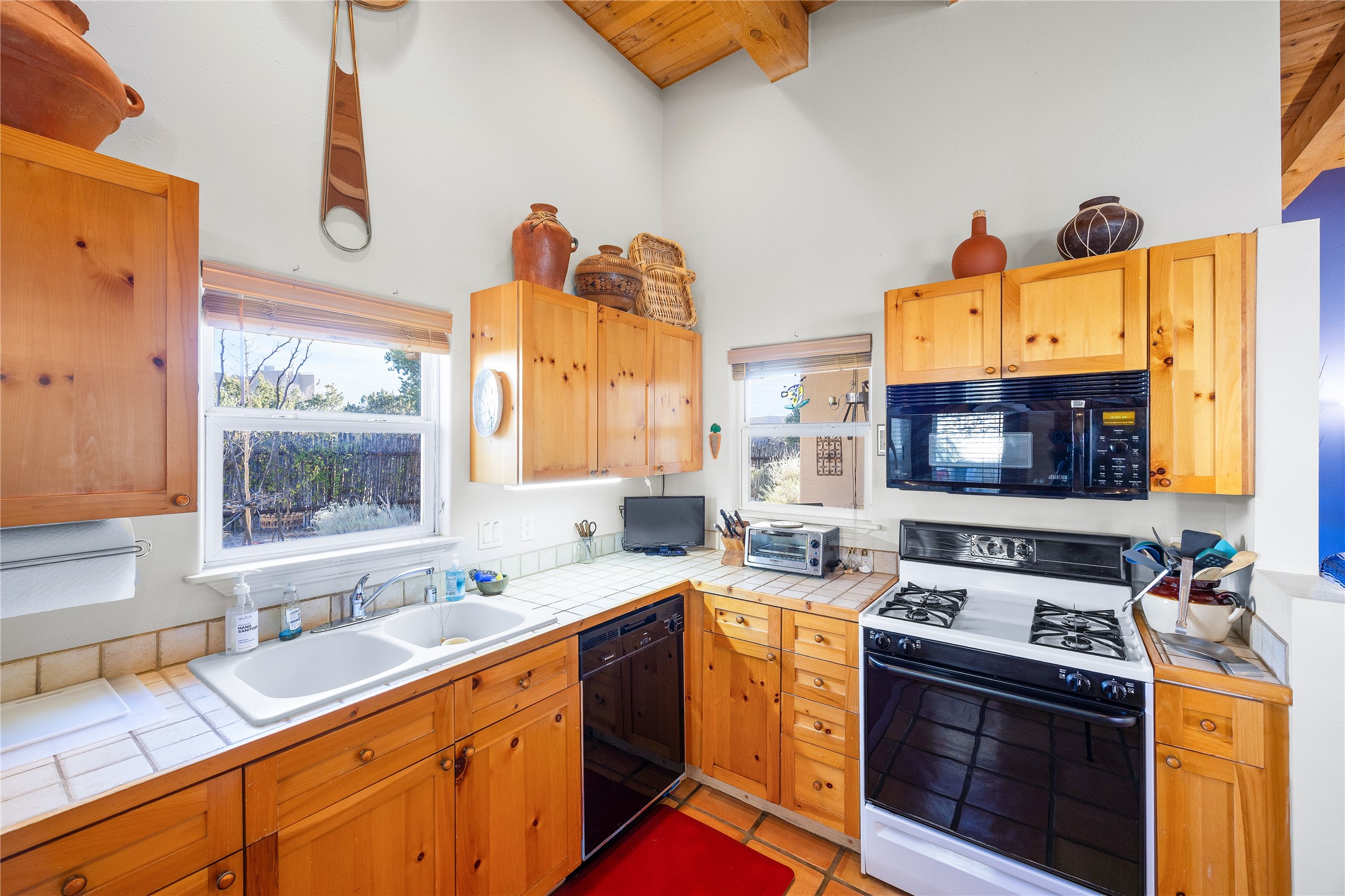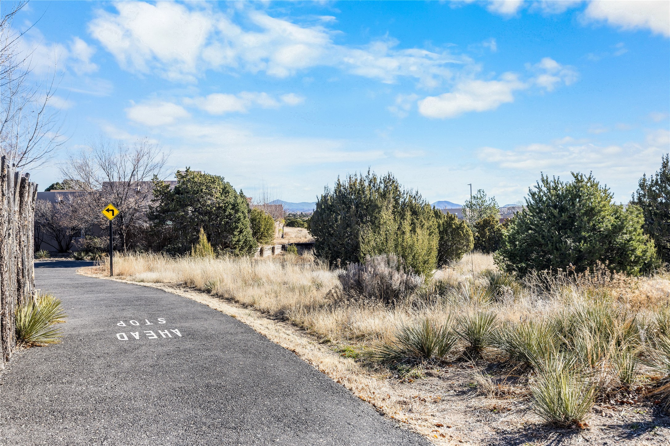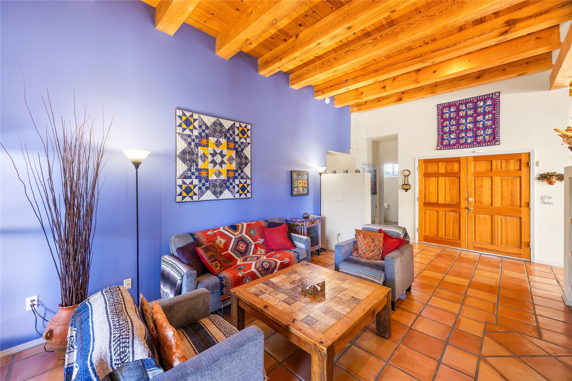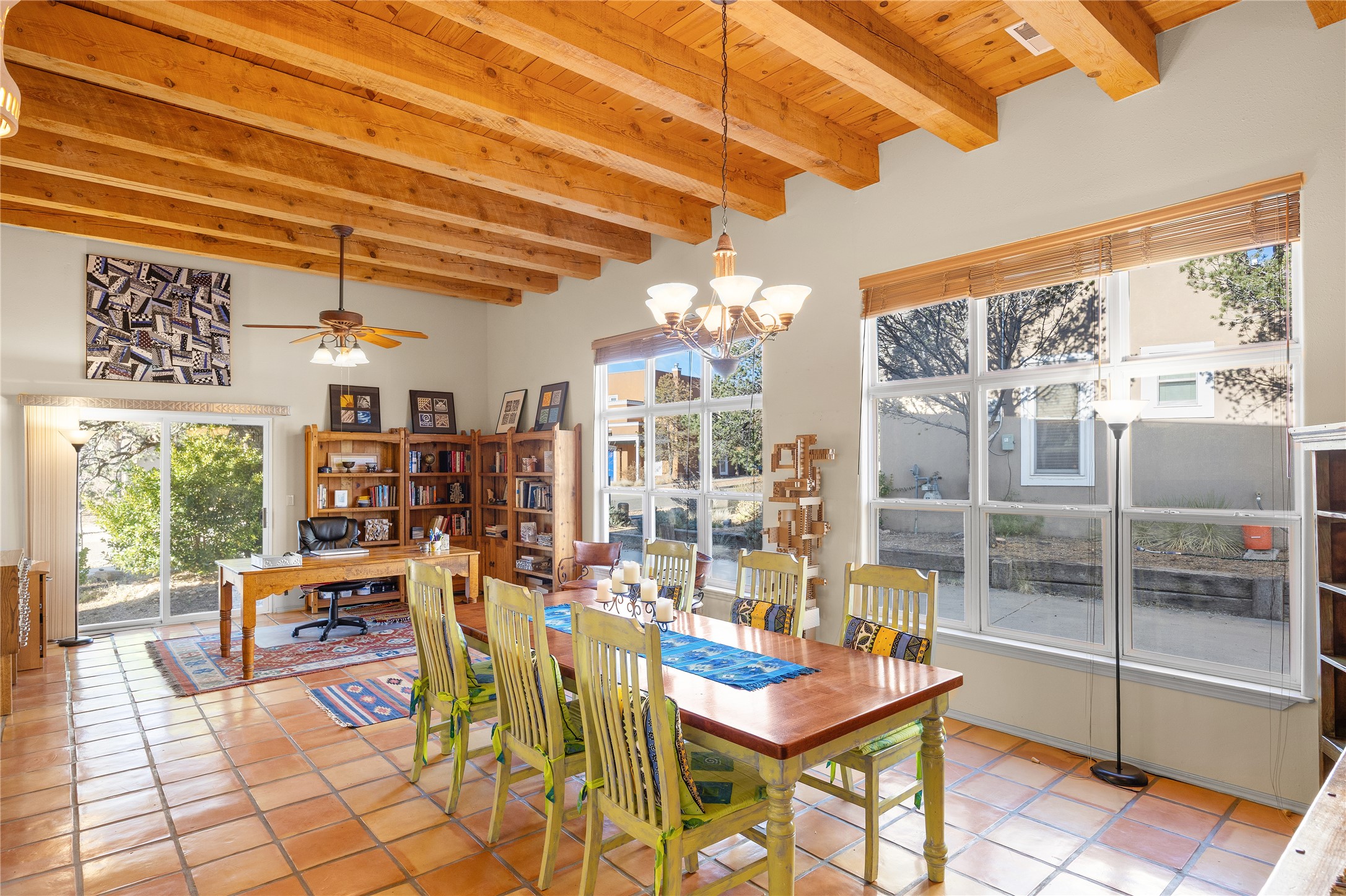 Get ready for this lovely, well cared for single level home in Nava Ade! Sited on a sizeable lot bordered on two sides by green space and adjacent to the walking path, this property features all the interior and exterior comforts that allow for authentic Santa Fe living. Enter its spacious Living Room through a sweet portal. Enjoy high ceilings adorned with wood beams. A decorative wall, which sports a two-sided gas fireplace, separates the Living Room from the oversized open concept Dining Room/Sitting Room. A wall of tall windows with wooden blinds graces this area. Beautiful Saltillo tile flooring adds to the warmth and Southwestern vibe of these rooms. Exit the Living Room through sliders that lead to a charming portal, ideal for outdoor entertaining. The whimsical rear yard provides a delightful retreat year-round! Custom shelving in all bedroom closets, and owner-made tin accents for the home's vertical blinds are thoughtful and creative touches. In addition to miles of walking paths, enjoy the community clubhouse, pool and gym. This much loved, special home will enchant its next lucky owner.
